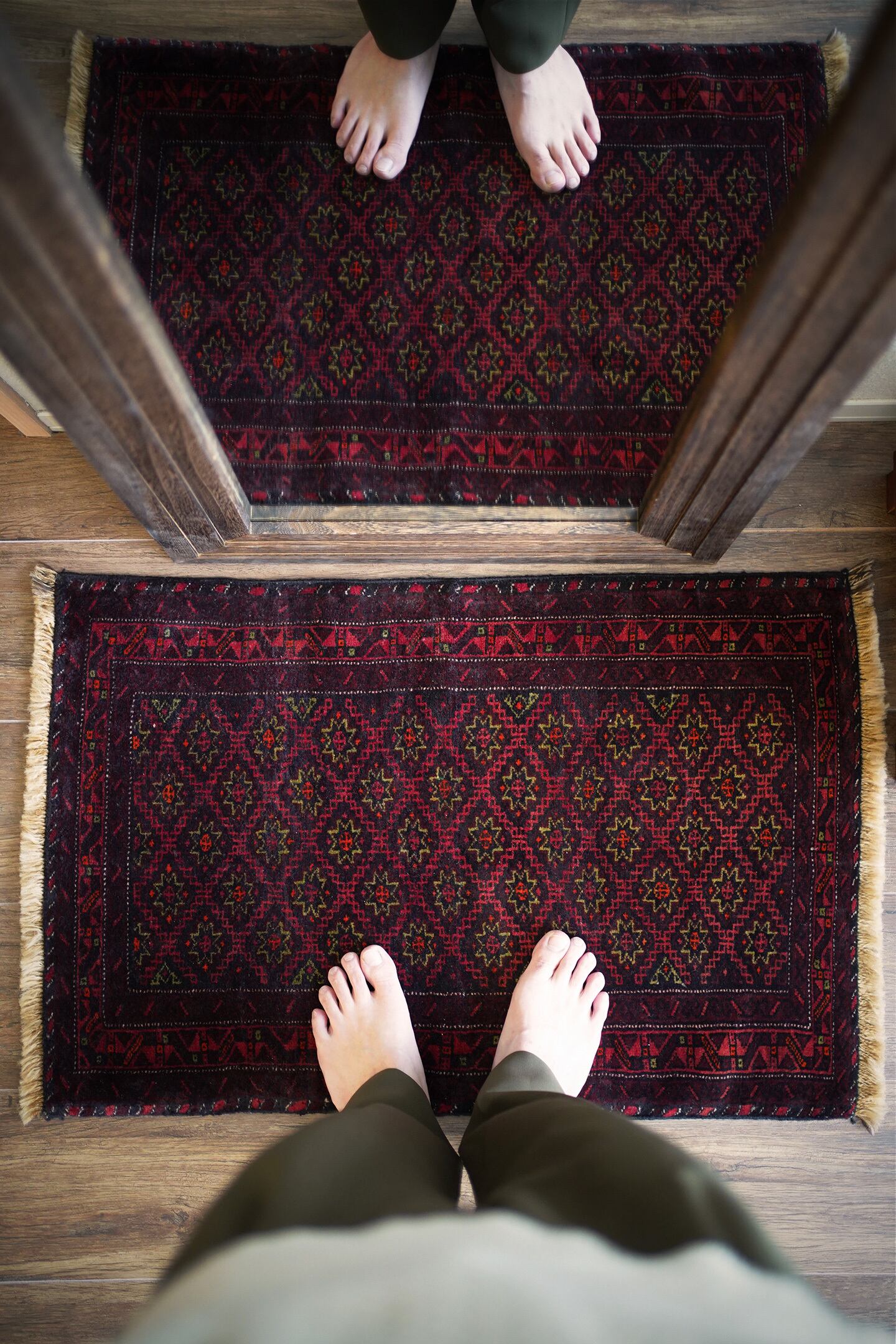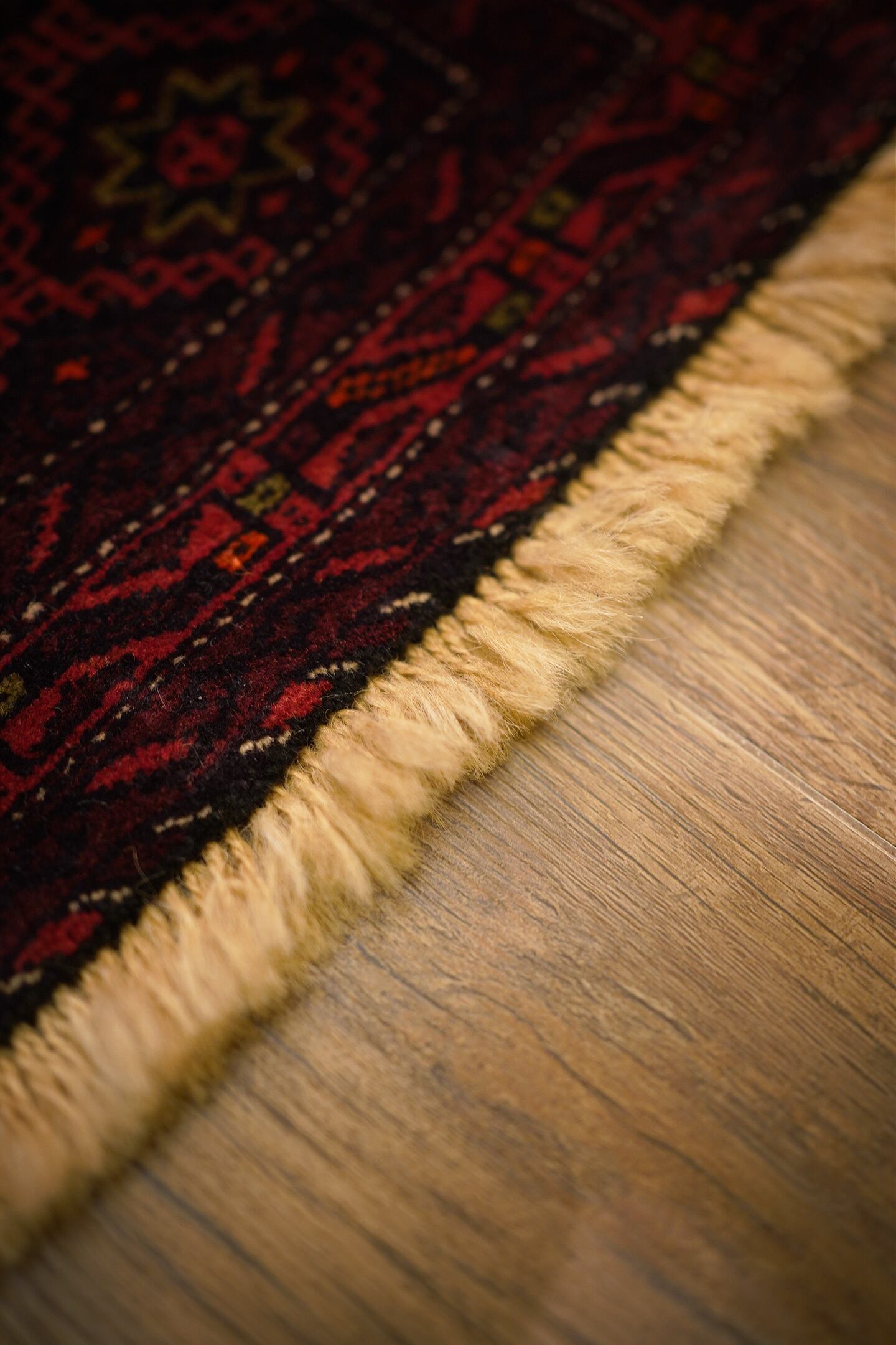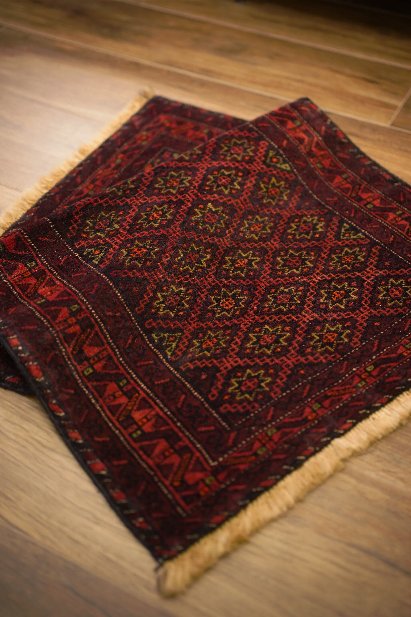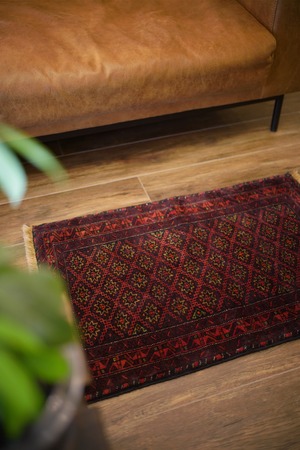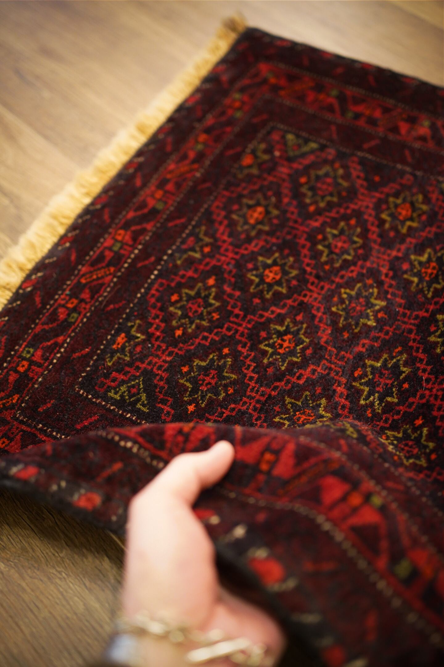 深い真紅の色味が魅力的なバルーチラグ。フィールドには"ユルドゥズ"と呼ばれる幸運の象徴である八角星が一面に織り込まれています。表面のパイルはソフトウールで柔らかく、ふわもちっとした滑らかな肌触りで、大変気持ちの良い質感です。厚みは5mm程度。大変良好なコンディション。玄関や全身鏡の前、ちょっとしたスペースにどうぞ♪