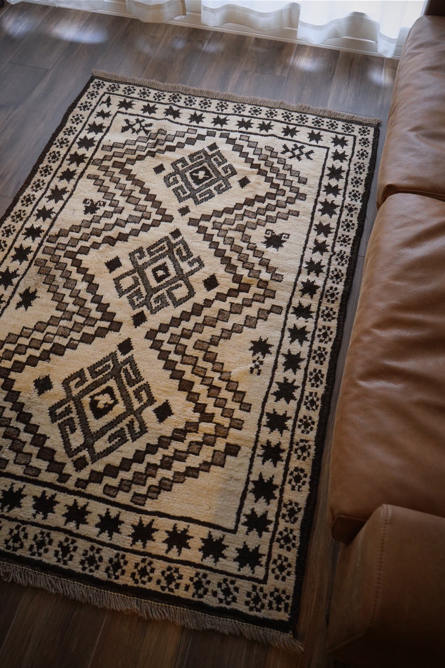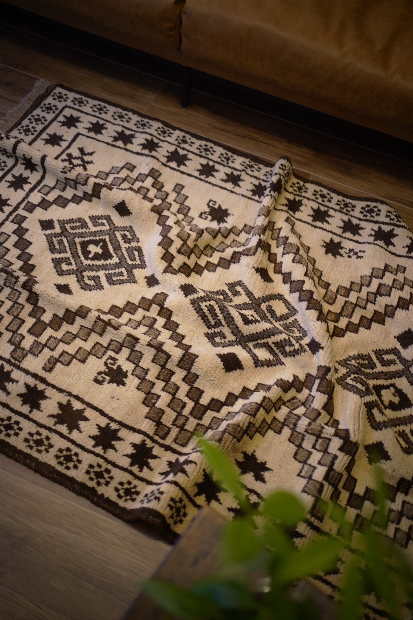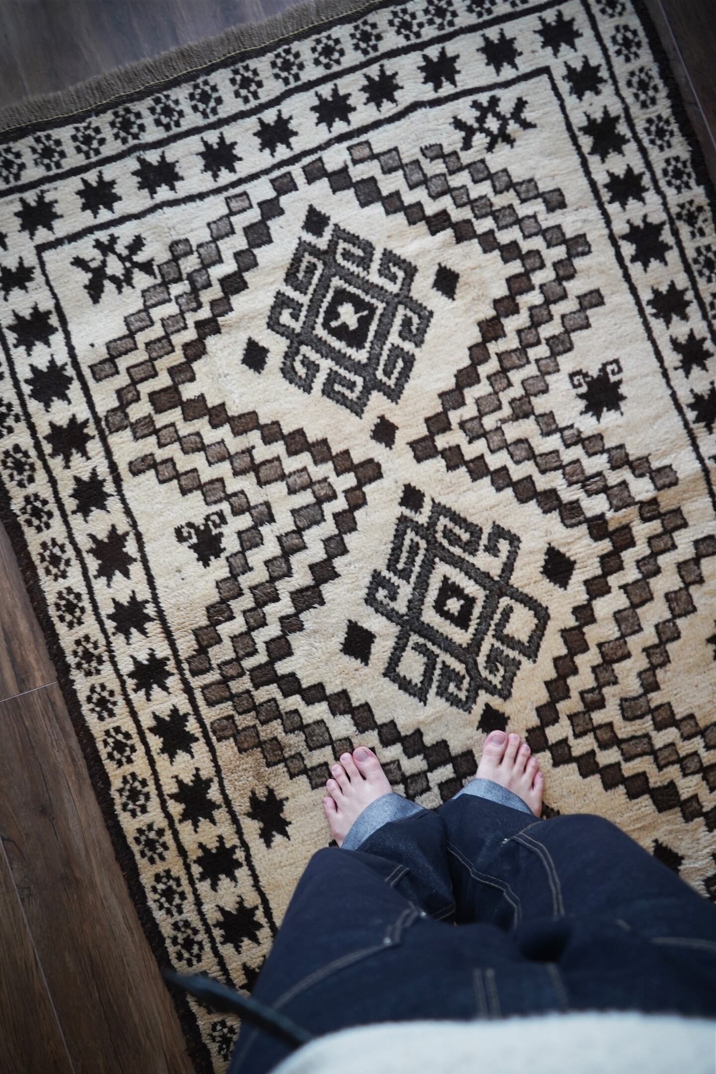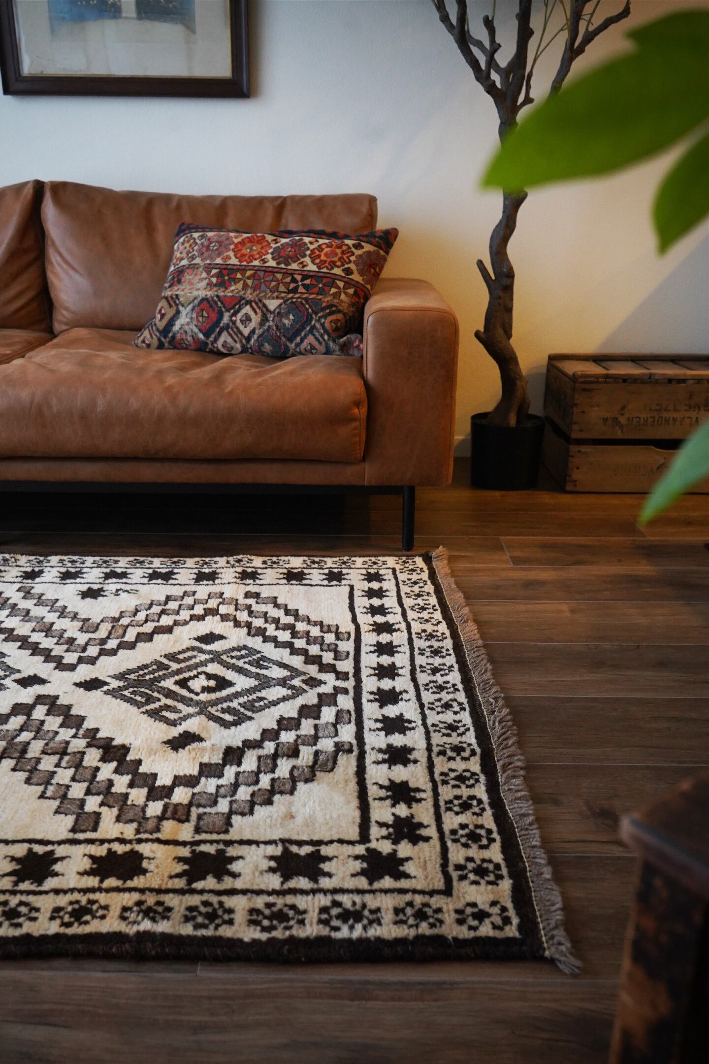 約30年前にアフガニスタン北西部に居住するタイマニ族によって織られたヴィンテージラグ。染色されていない原毛のナチュラルな色味が魅力的で、クリーム色をベースに、焦茶、ベージュ、グレーなどの優しい配色の一枚。タイマニラグではあまり見かけないデザインに惹かれて仕入れを決めました。表面はふかっとバスタオルのような柔らかさで、気持ちの良い肌触り。毛足は長めで、厚みは1cmほど。上に座ったり、寝っ転がったりと寛ぐのにも最適な質感です。目立ったダメージや補修跡もなく、状態も大変良好な一枚。リビングのソファ前や寝室などお好みの場所にどうぞ。