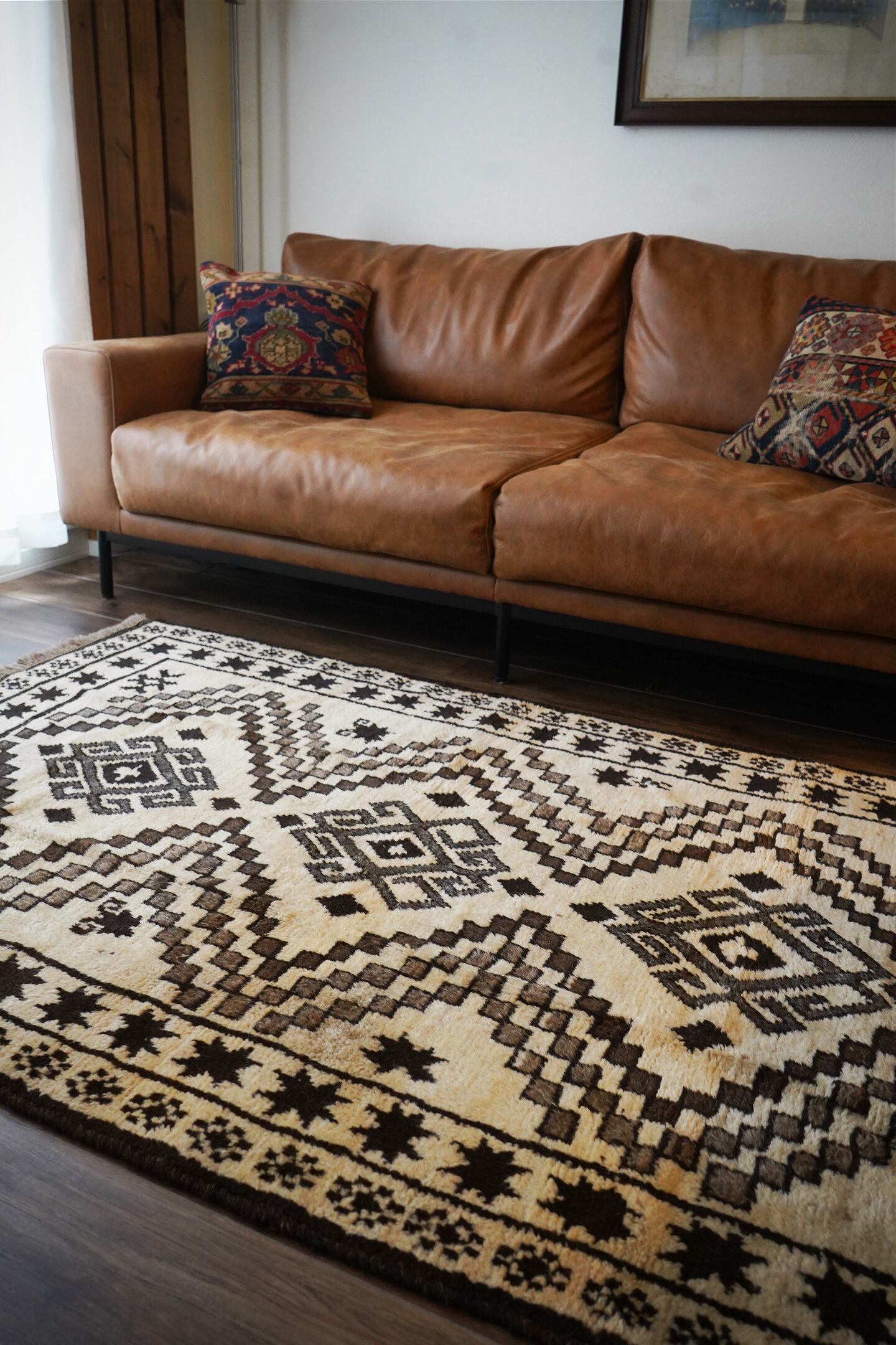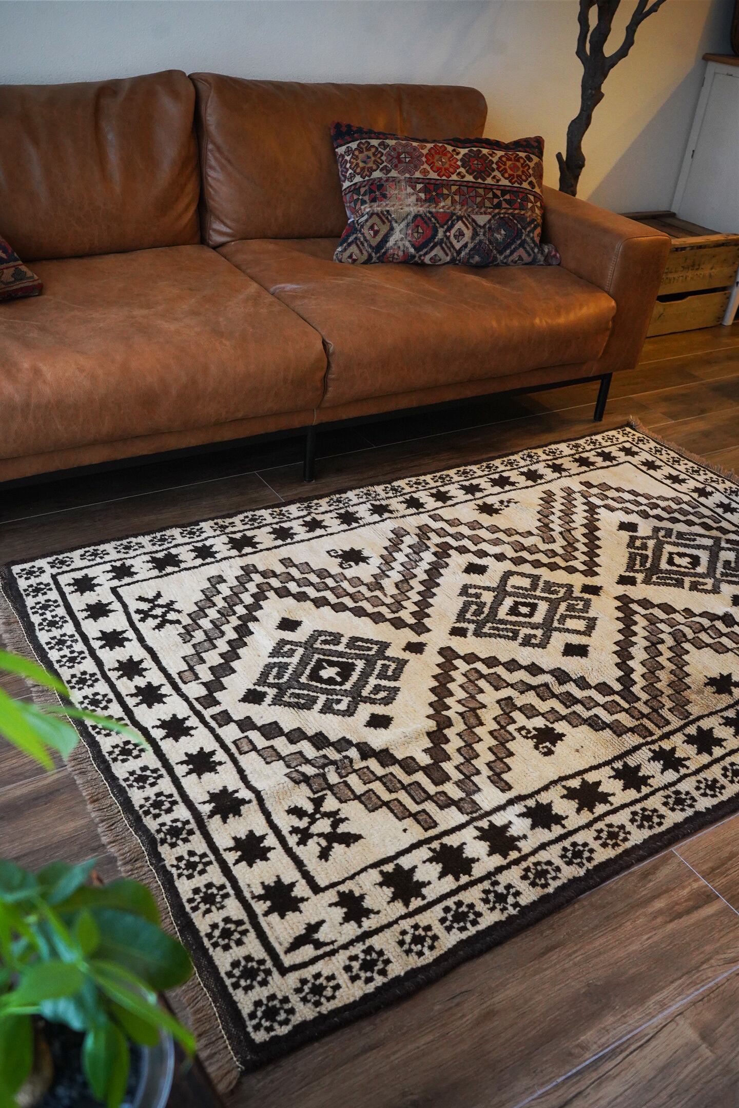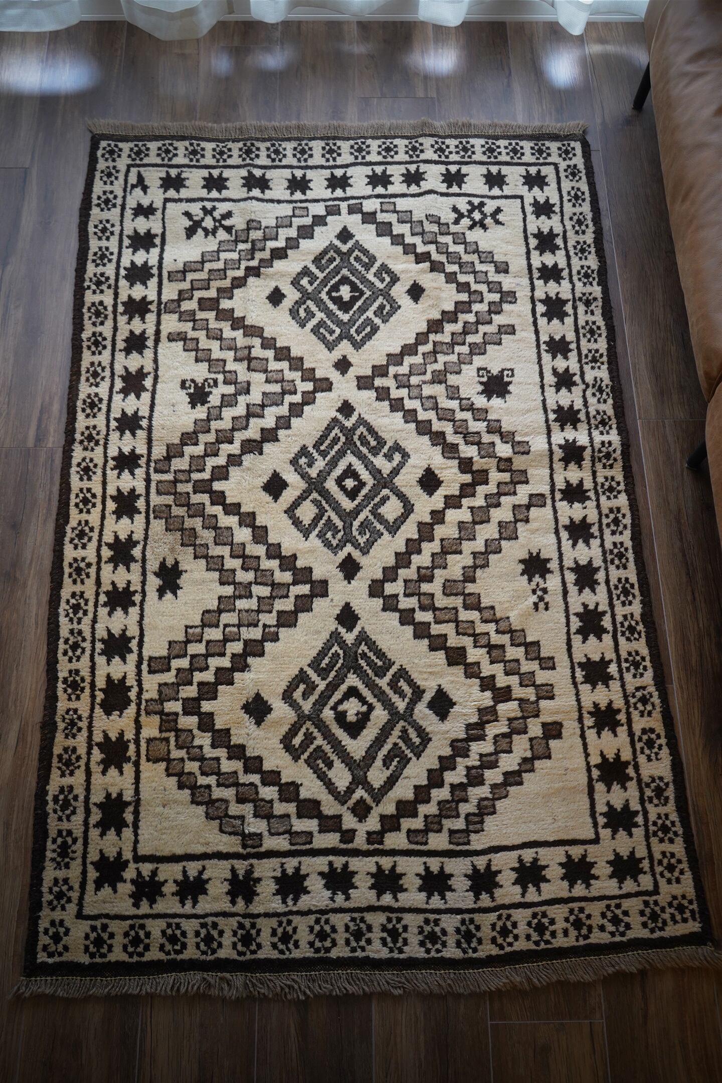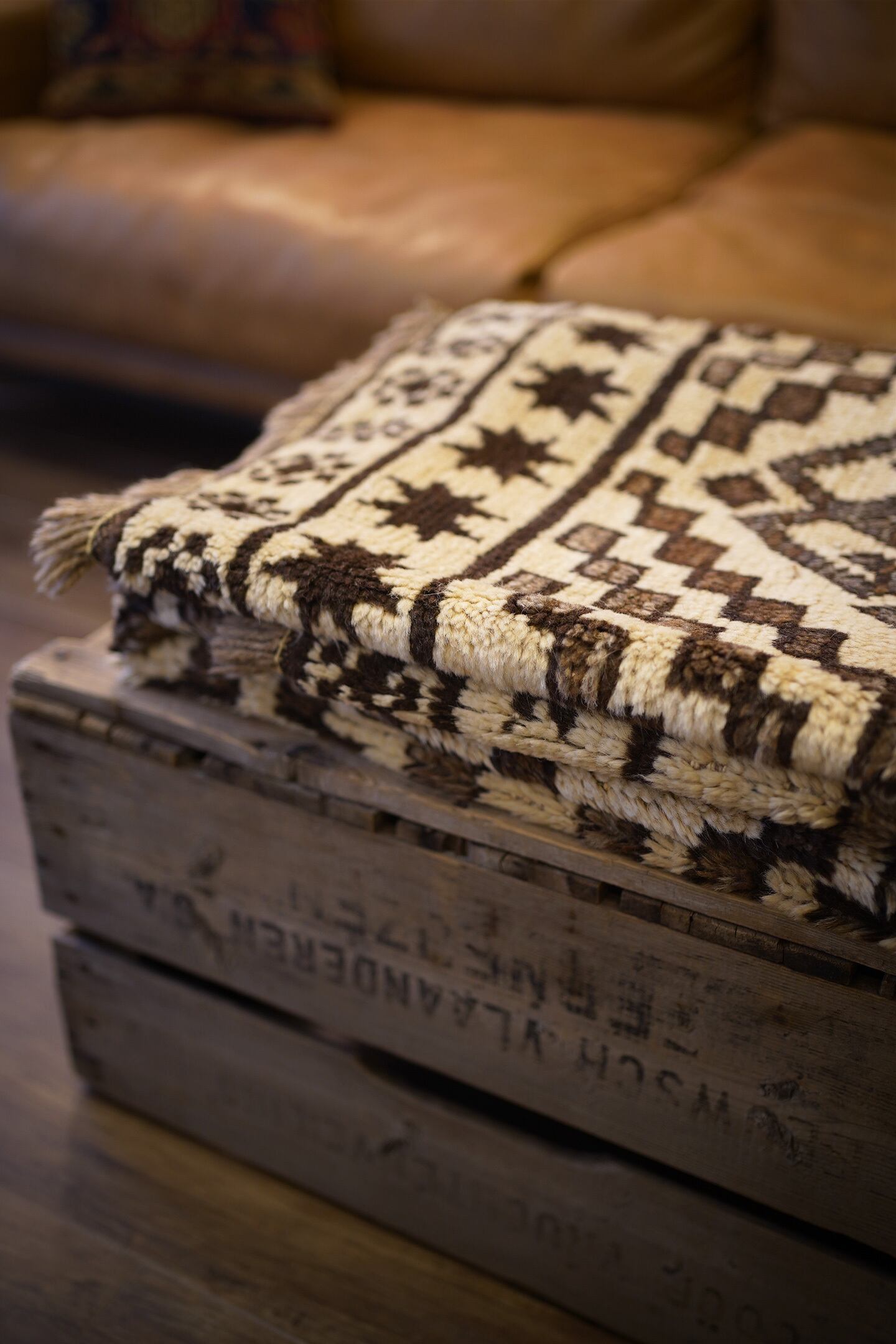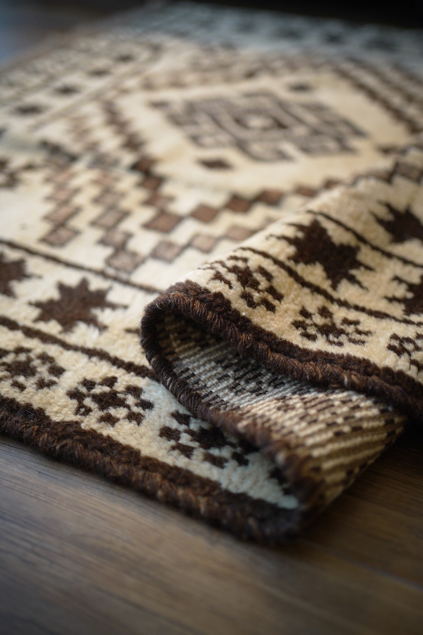 約30年前にアフガニスタン北西部に居住するタイマニ族によって織られたヴィンテージラグ。染色されていない原毛のナチュラルな色味が魅力的で、クリーム色をベースに、焦茶、ベージュ、グレーなどの優しい配色の一枚。タイマニラグではあまり見かけないデザインに惹かれて仕入れを決めました。表面はふかっとバスタオルのような柔らかさで、気持ちの良い肌触り。毛足は長めで、厚みは1cmほど。上に座ったり、寝っ転がったりと寛ぐのにも最適な質感です。目立ったダメージや補修跡もなく、状態も大変良好な一枚。リビングのソファ前や寝室などお好みの場所にどうぞ。