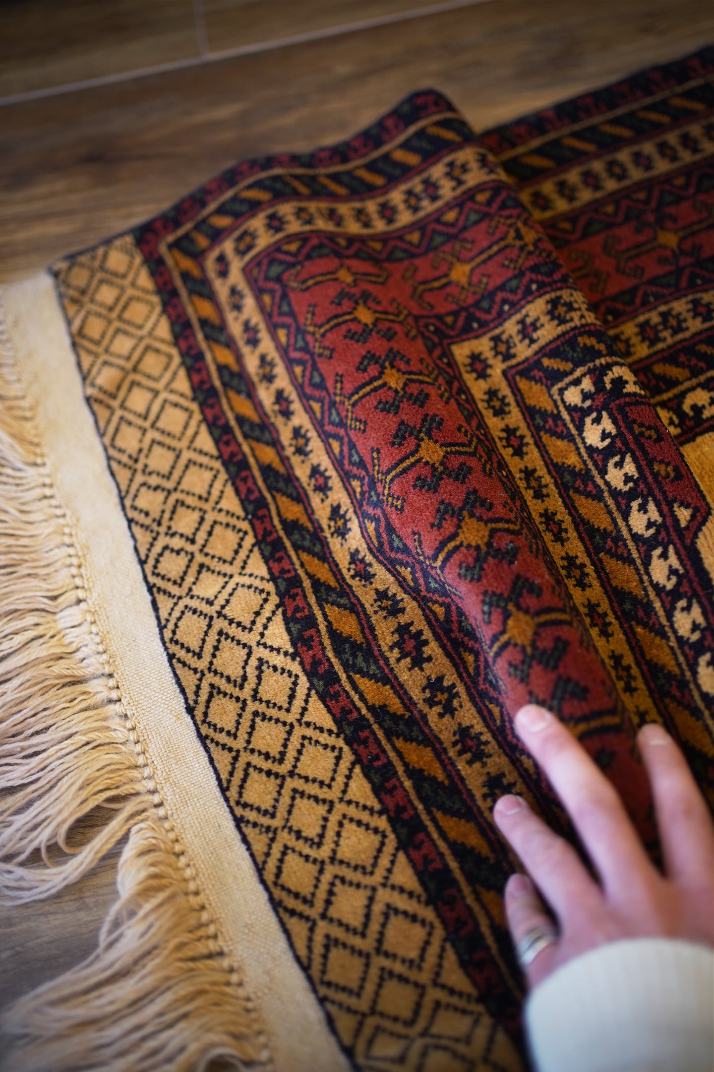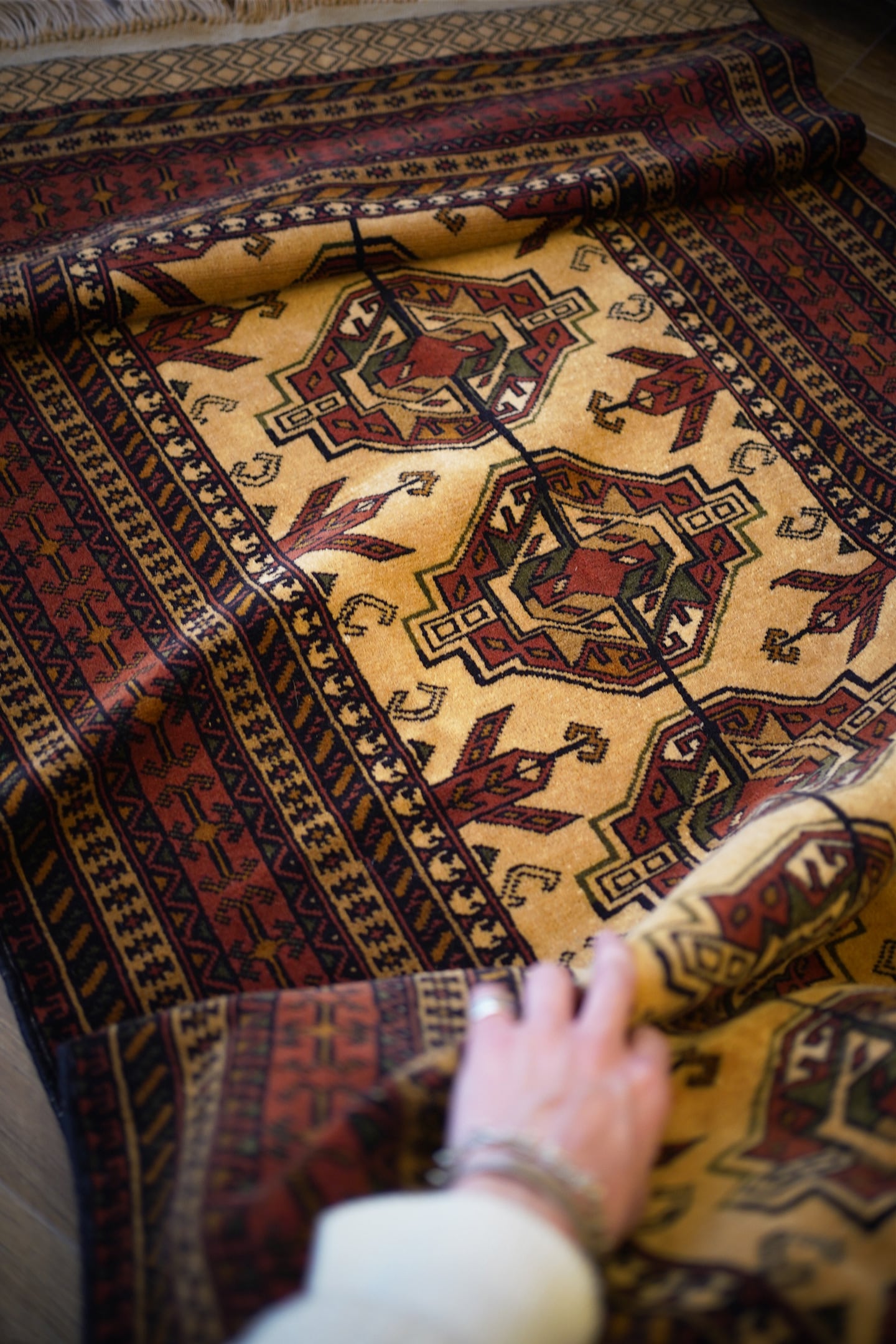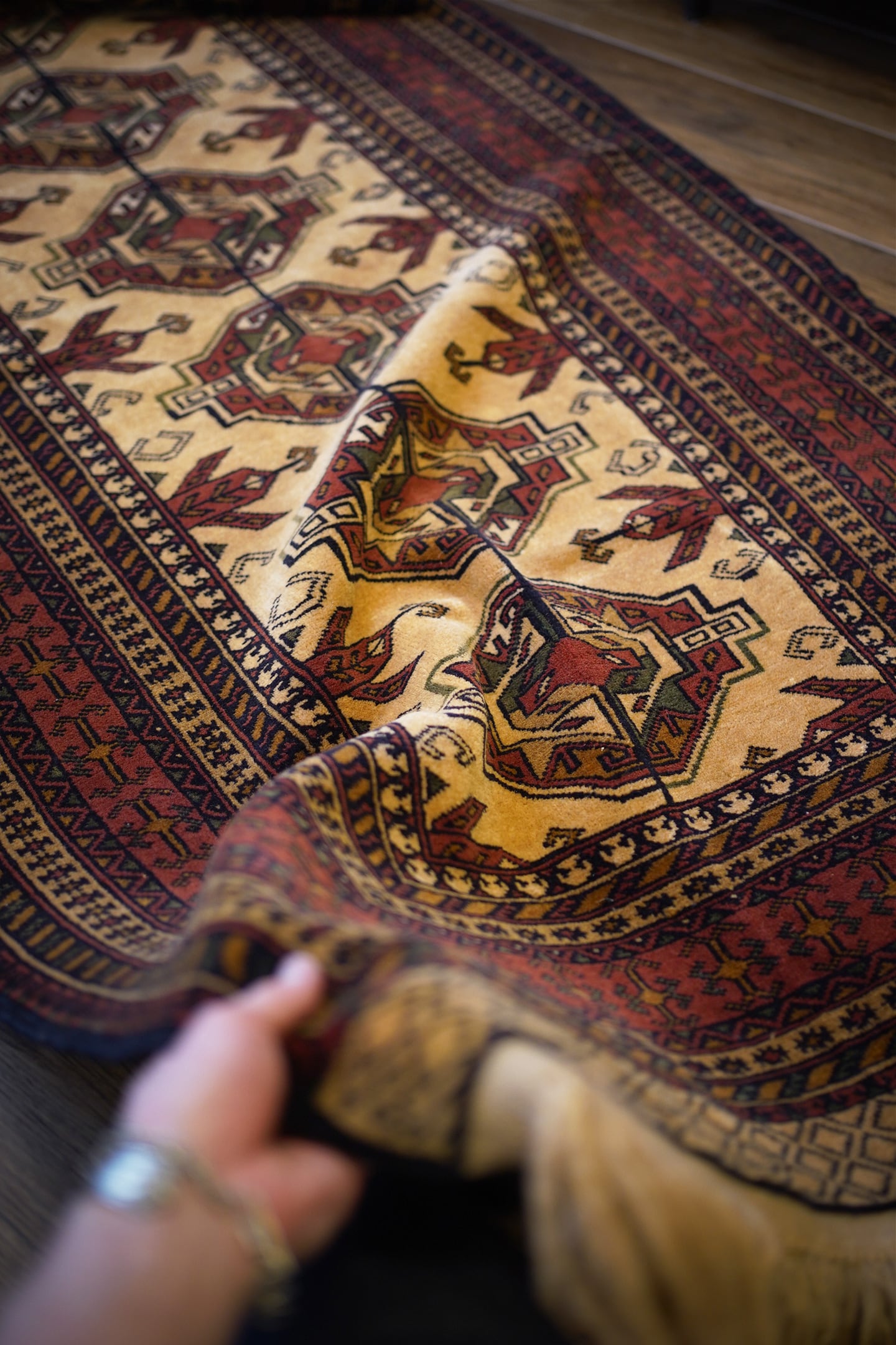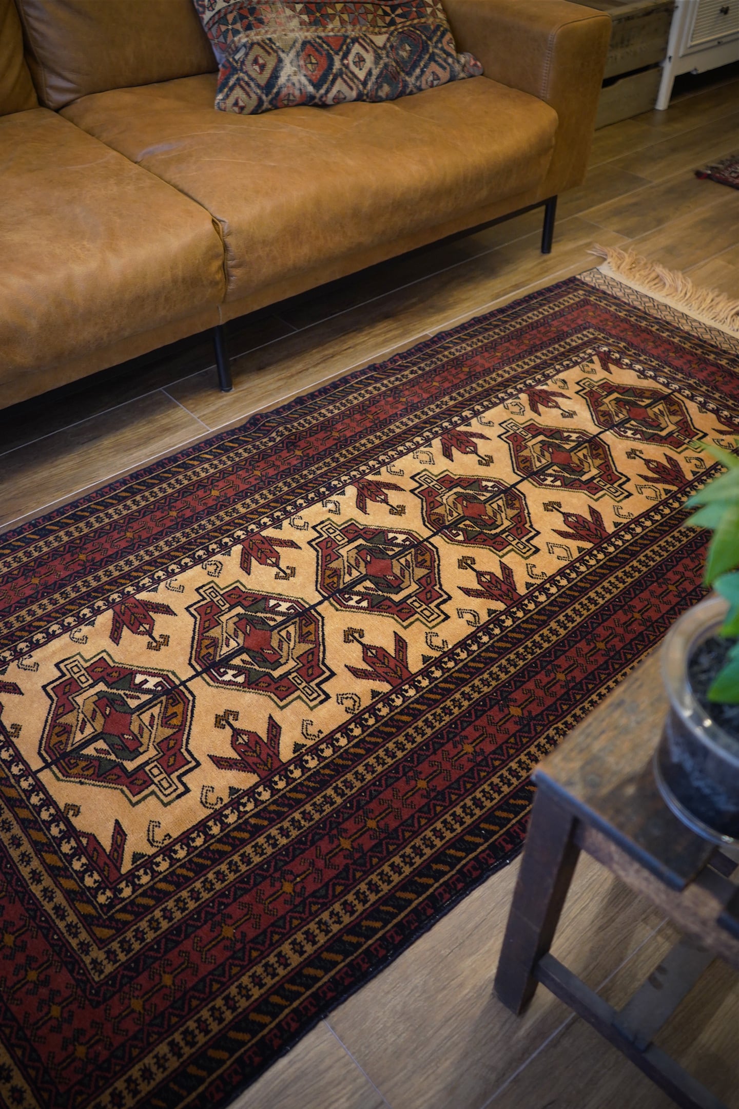 約30年前にアフガニスタン西部でバルーチ族によって織られたヴィンテージラグです。トルクメンのデザインを模した珍しいタイプのバルーチで、ランナーに近いサイズ感でフリンジが長めに作られています。配色はえんじ色とキャメルカラーをベースカラーに、アクセントにオリーブ色。落ち着いた色合いなので木製家具との相性も非常に良さそうな印象です。表面の毛足は短めながら、ソフトウールなのでふわっとしつつ、しっとり滑らかな気持ちの良い肌触り。通年で快適に敷ける質感です。厚みは6mm程度。全体的な状態も非常に良くパーフェクト。ベッドサイドやソファ前をはじめ、キッチンスペースなどにもオススメ♫
