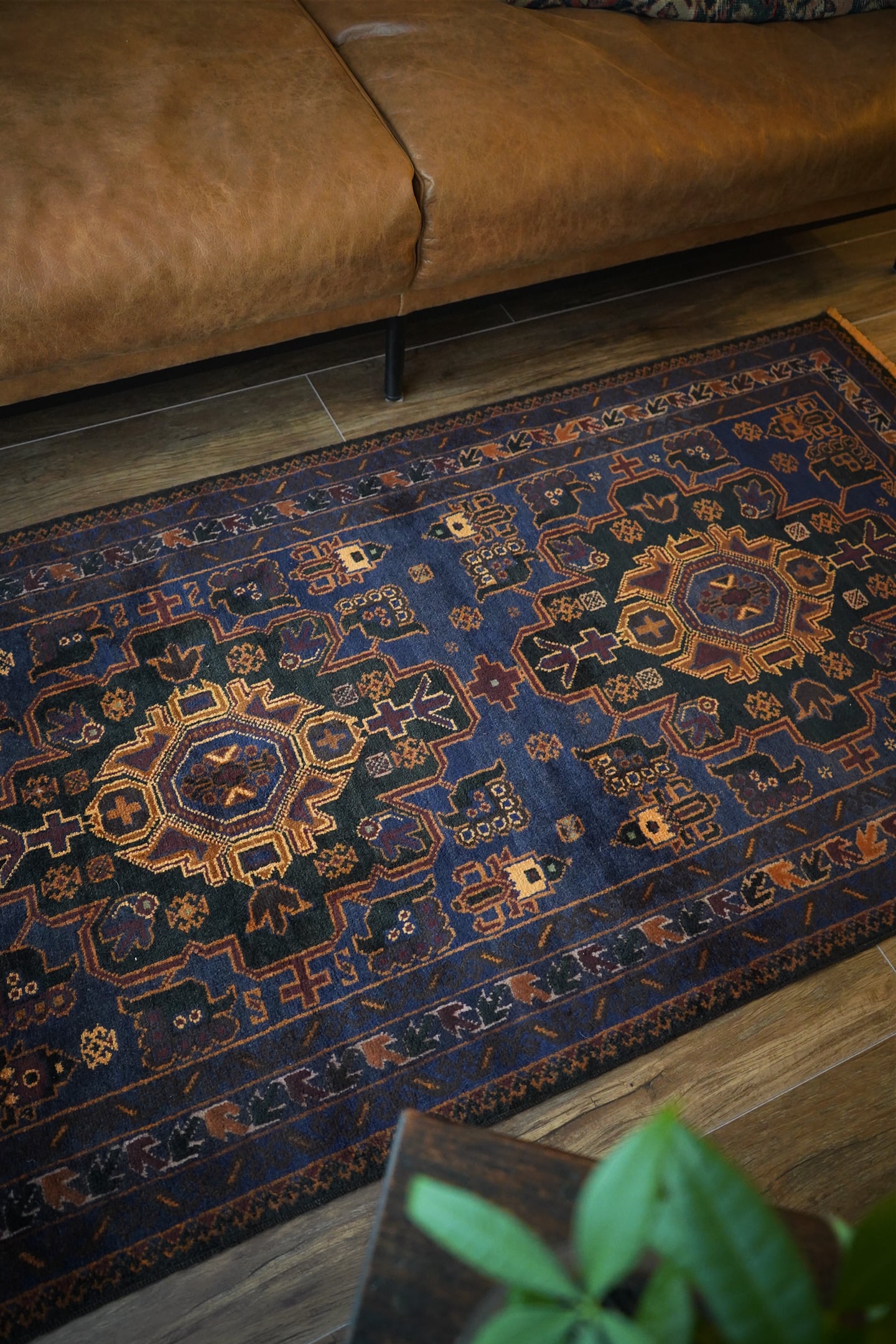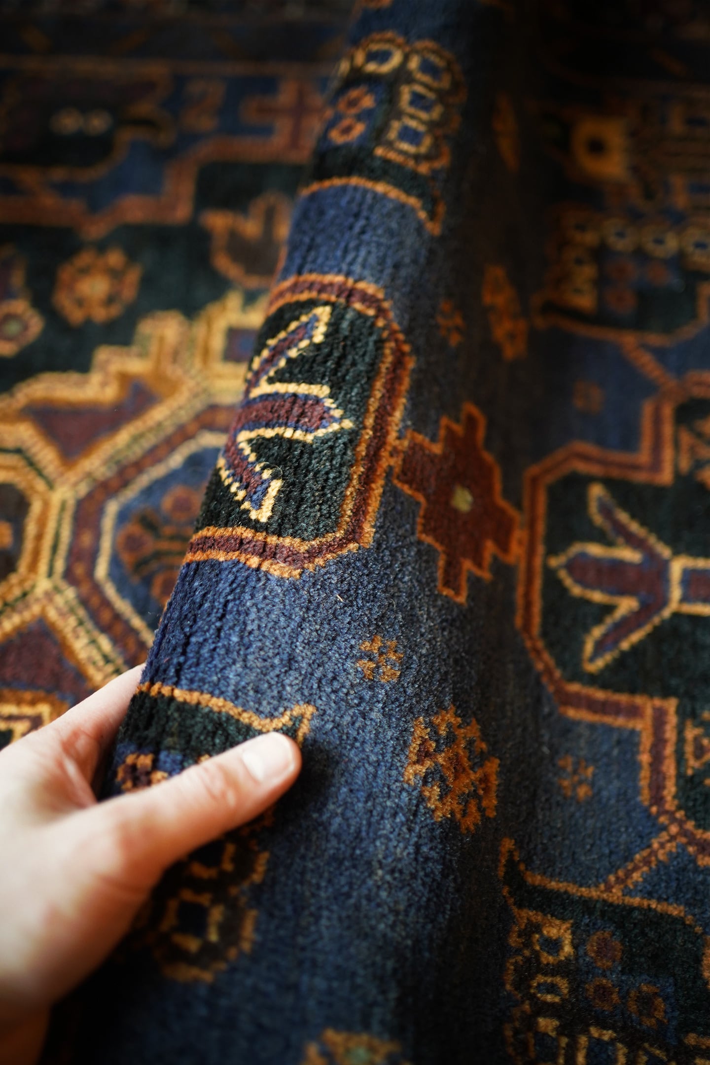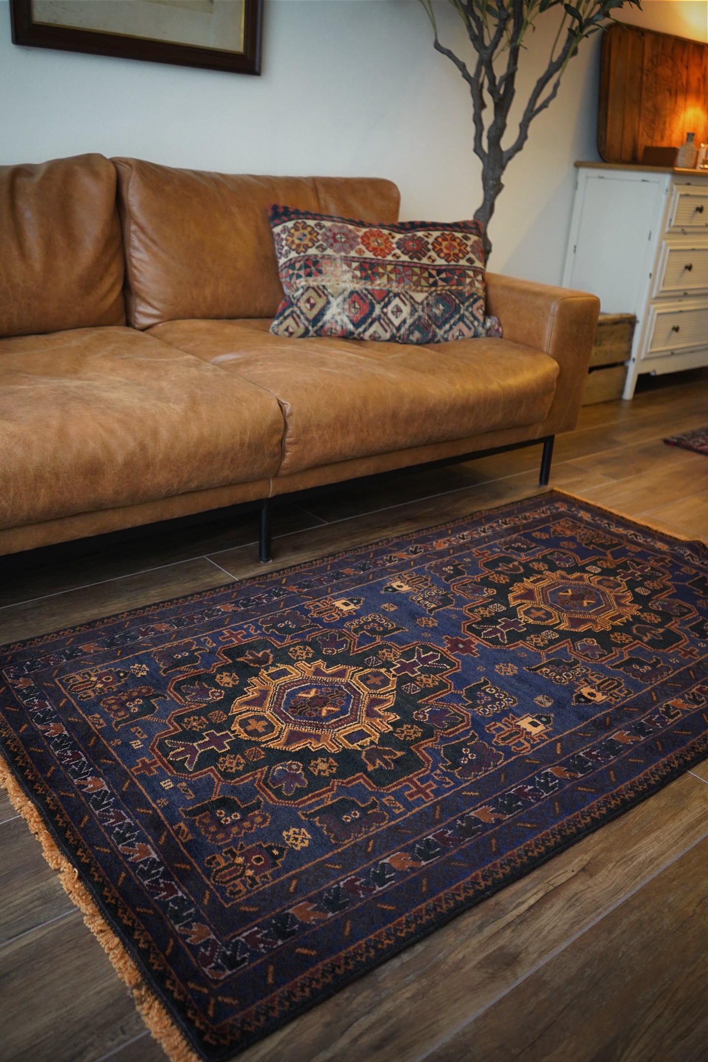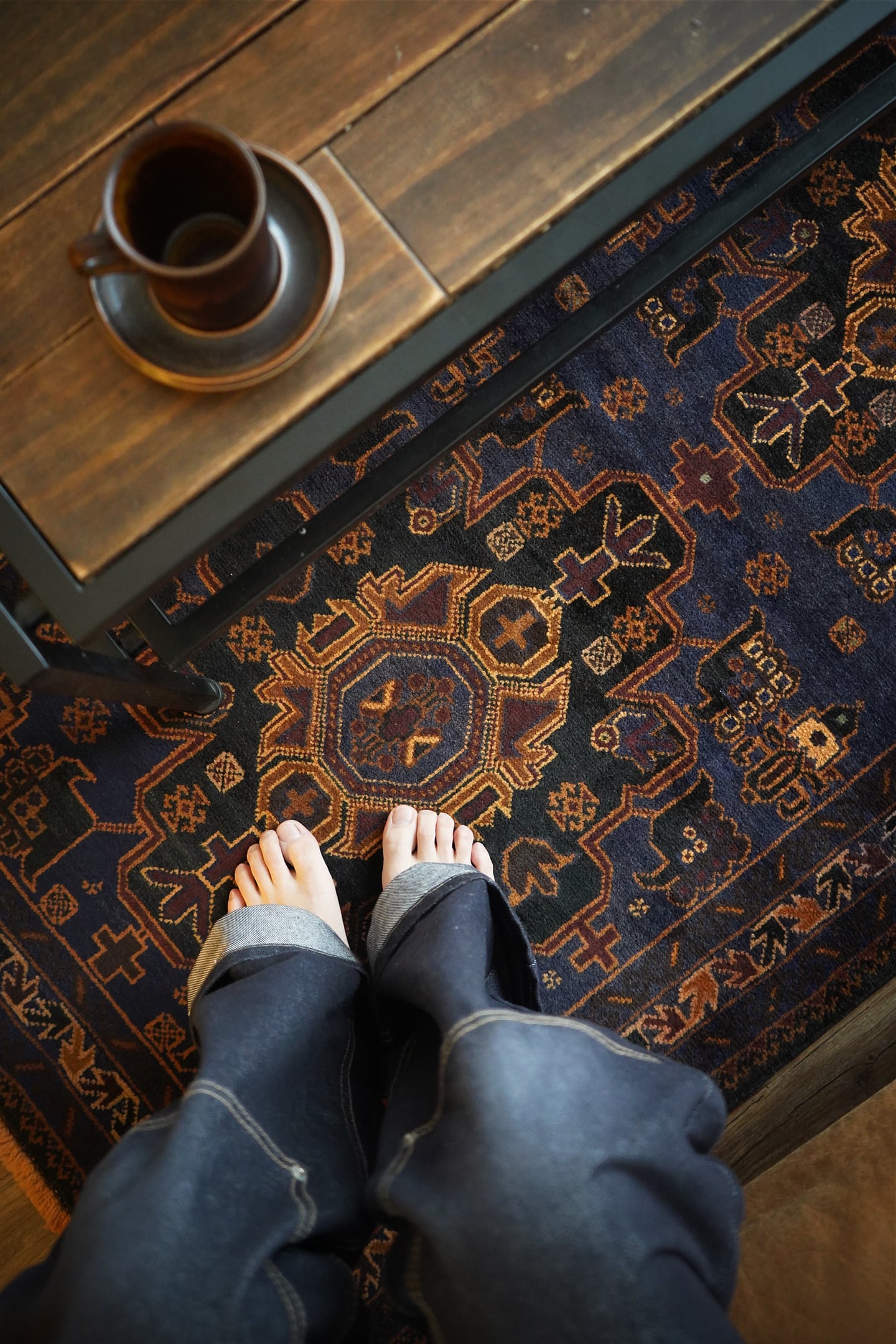 おおよそ30年前にバルーチ族によって織られたアフガニスタン産のバルーチラグ。大きな2つのメダリオンが印象的なデザインで、全体的に落ち着きのある配色ながらも存在感があります。色味は濃紺、ネイビー、キャメル、えんじ色の組み合わせ。表面のパイルはふわっと柔らかい弾力のある質感で、厚みは7mm程度。パイルに太陽光が差し込むと艶も見受けられ、美しい一枚です。コンディションも言うことなしのパーフェクト。リビングのソファ前やベッドサイドなどに一枚敷くだけでスペースを素敵に彩ってくれるかと思います。
