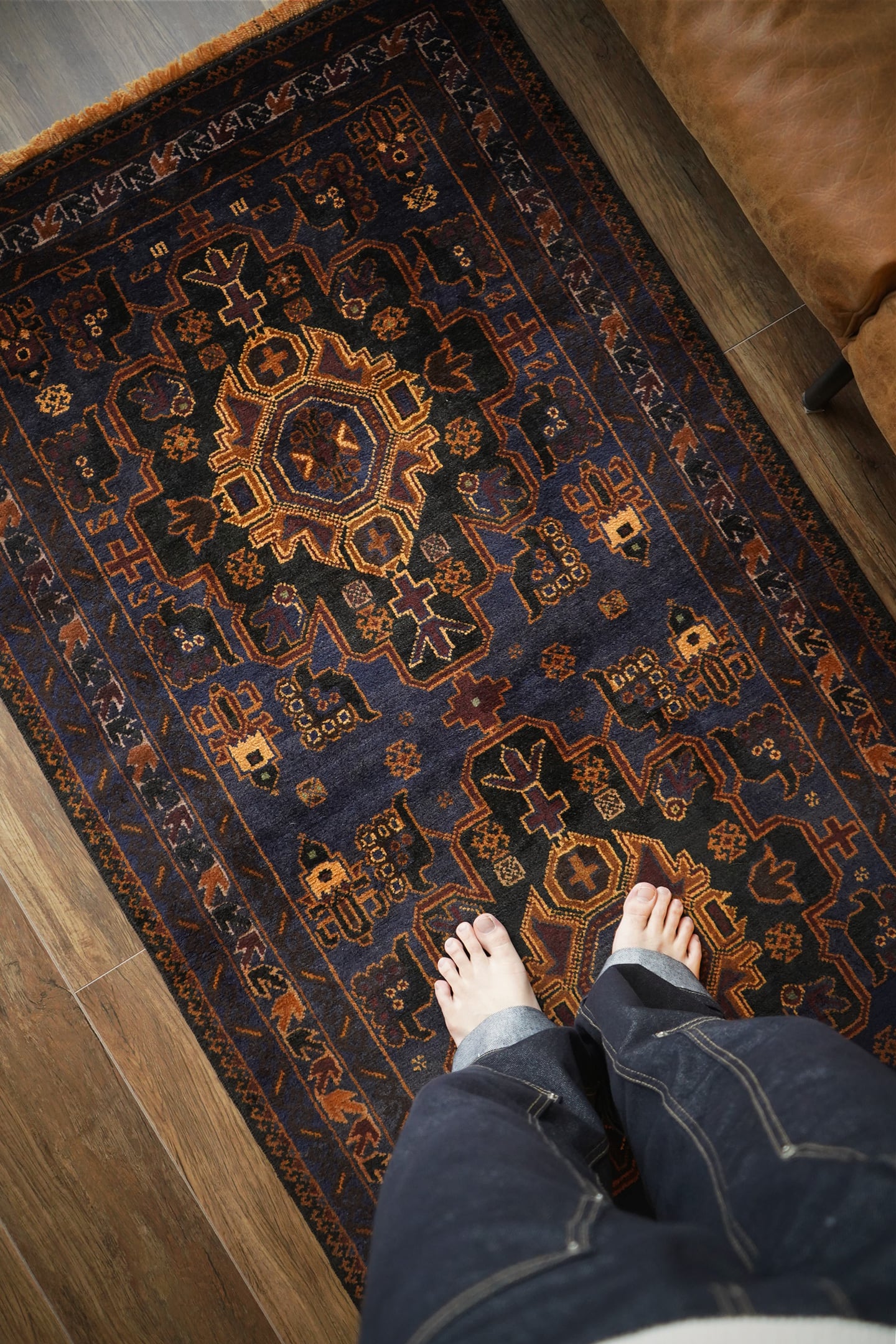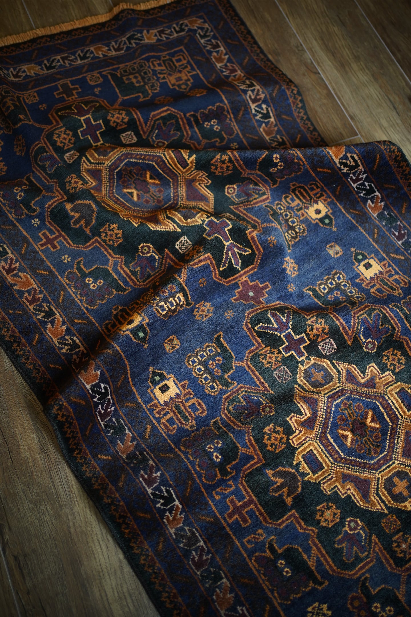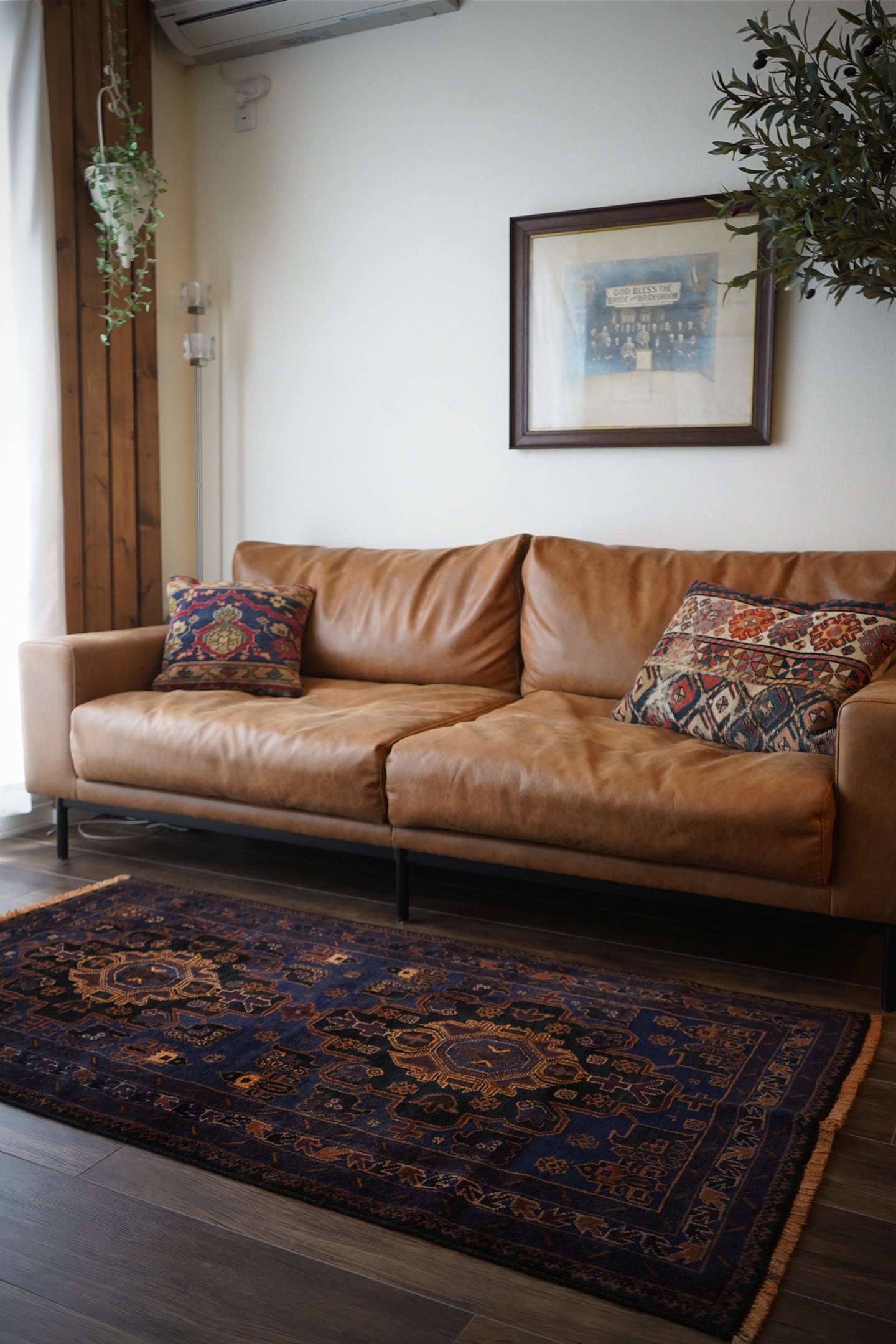 おおよそ30年前にバルーチ族によって織られたアフガニスタン産のバルーチラグ。大きな2つのメダリオンが印象的なデザインで、全体的に落ち着きのある配色ながらも存在感があります。色味は濃紺、ネイビー、キャメル、えんじ色の組み合わせ。表面のパイルはふわっと柔らかい弾力のある質感で、厚みは7mm程度。パイルに太陽光が差し込むと艶も見受けられ、美しい一枚です。コンディションも言うことなしのパーフェクト。リビングのソファ前やベッドサイドなどに一枚敷くだけでスペースを素敵に彩ってくれるかと思います。