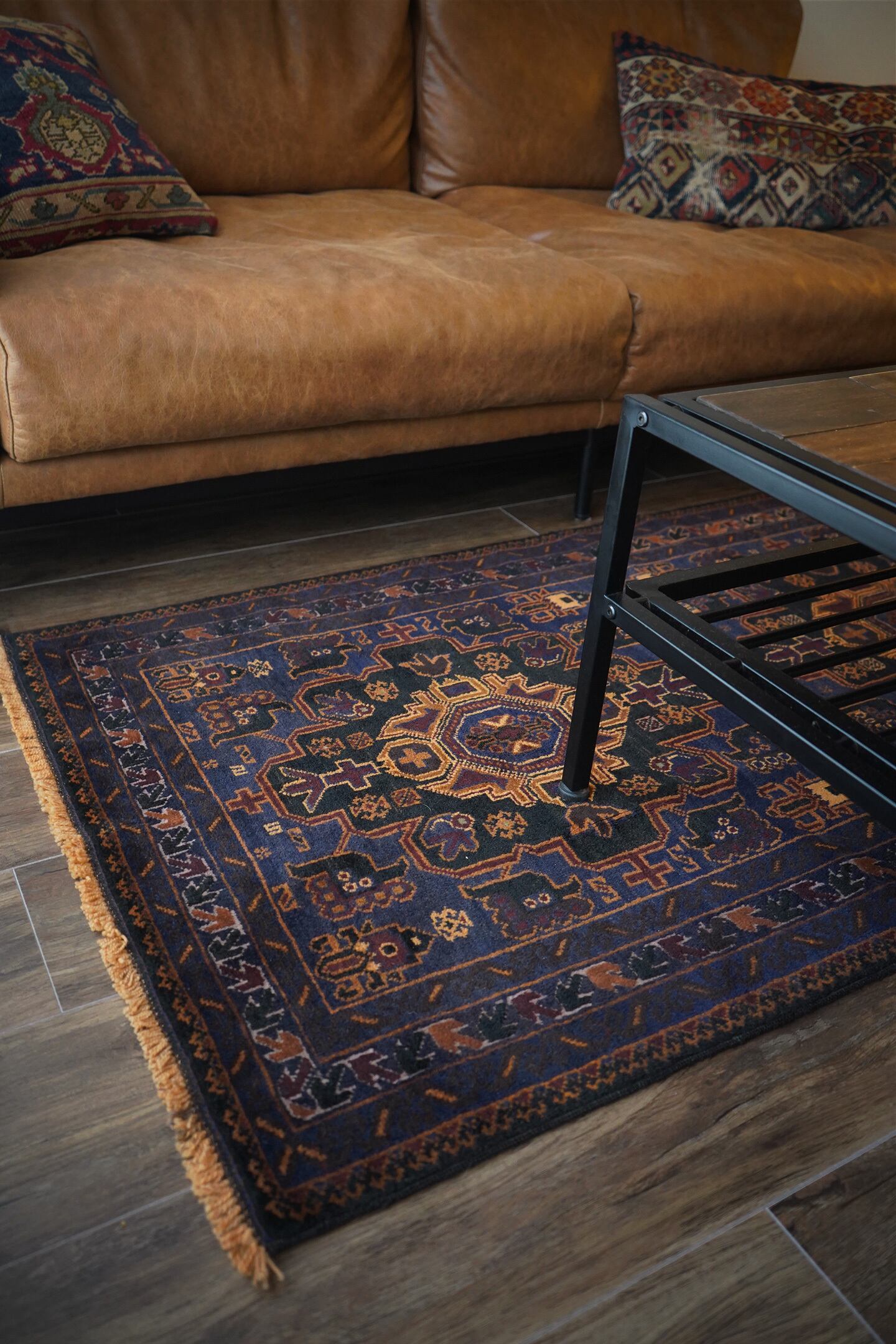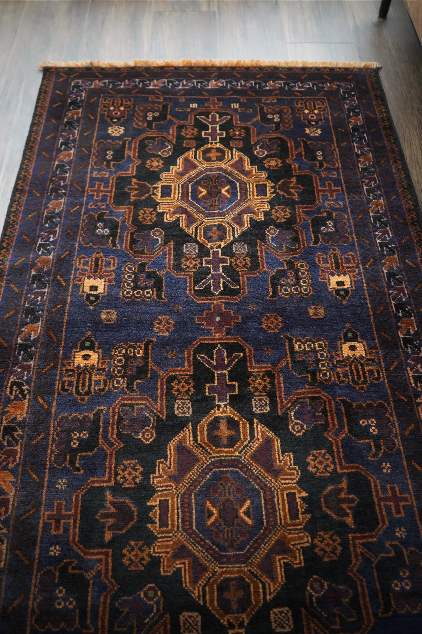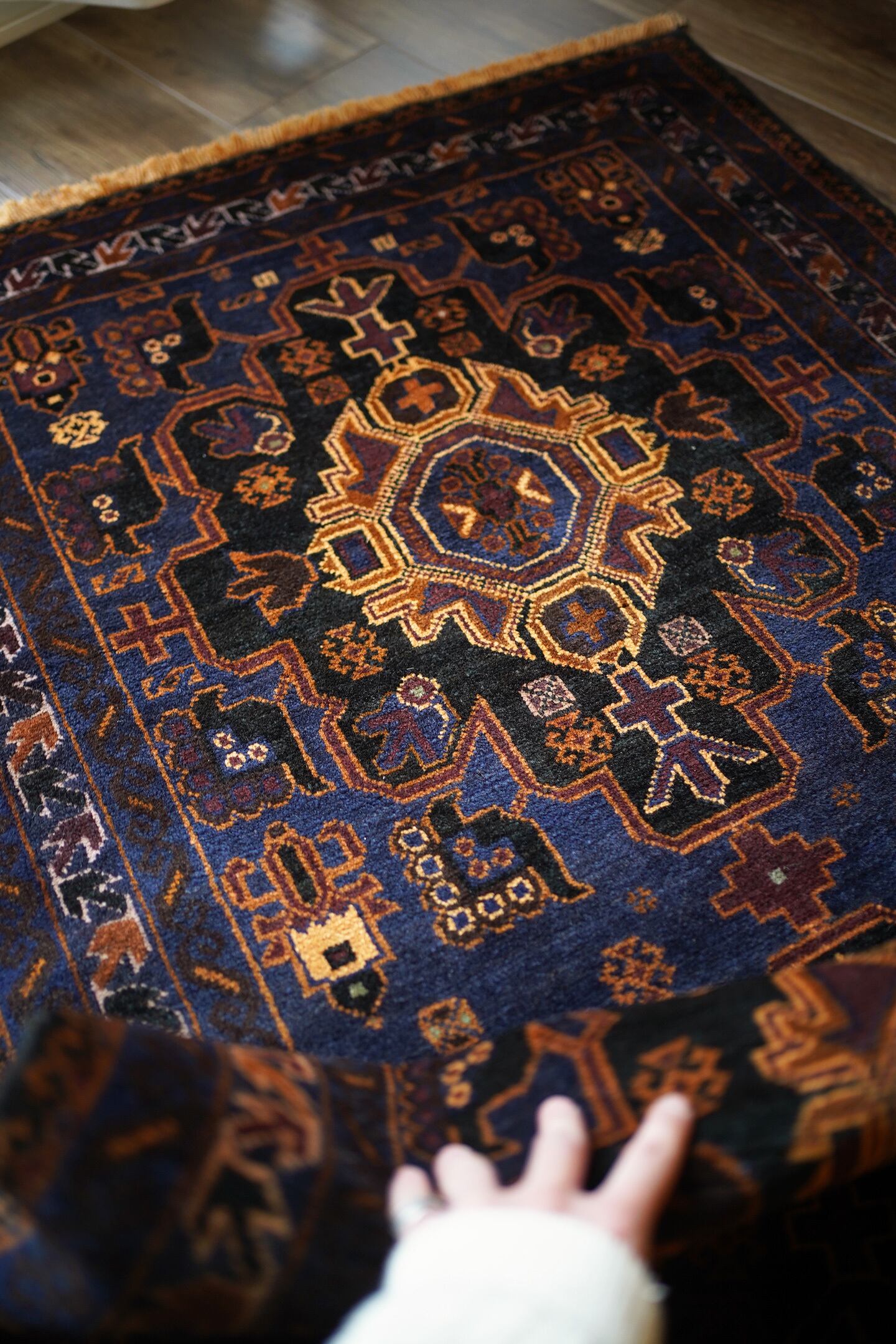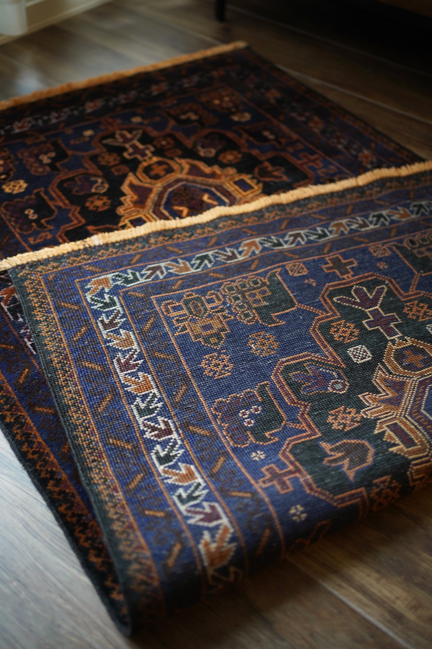 おおよそ30年前にバルーチ族によって織られたアフガニスタン産のバルーチラグ。大きな2つのメダリオンが印象的なデザインで、全体的に落ち着きのある配色ながらも存在感があります。色味は濃紺、ネイビー、キャメル、えんじ色の組み合わせ。表面のパイルはふわっと柔らかい弾力のある質感で、厚みは7mm程度。パイルに太陽光が差し込むと艶も見受けられ、美しい一枚です。コンディションも言うことなしのパーフェクト。リビングのソファ前やベッドサイドなどに一枚敷くだけでスペースを素敵に彩ってくれるかと思います。
