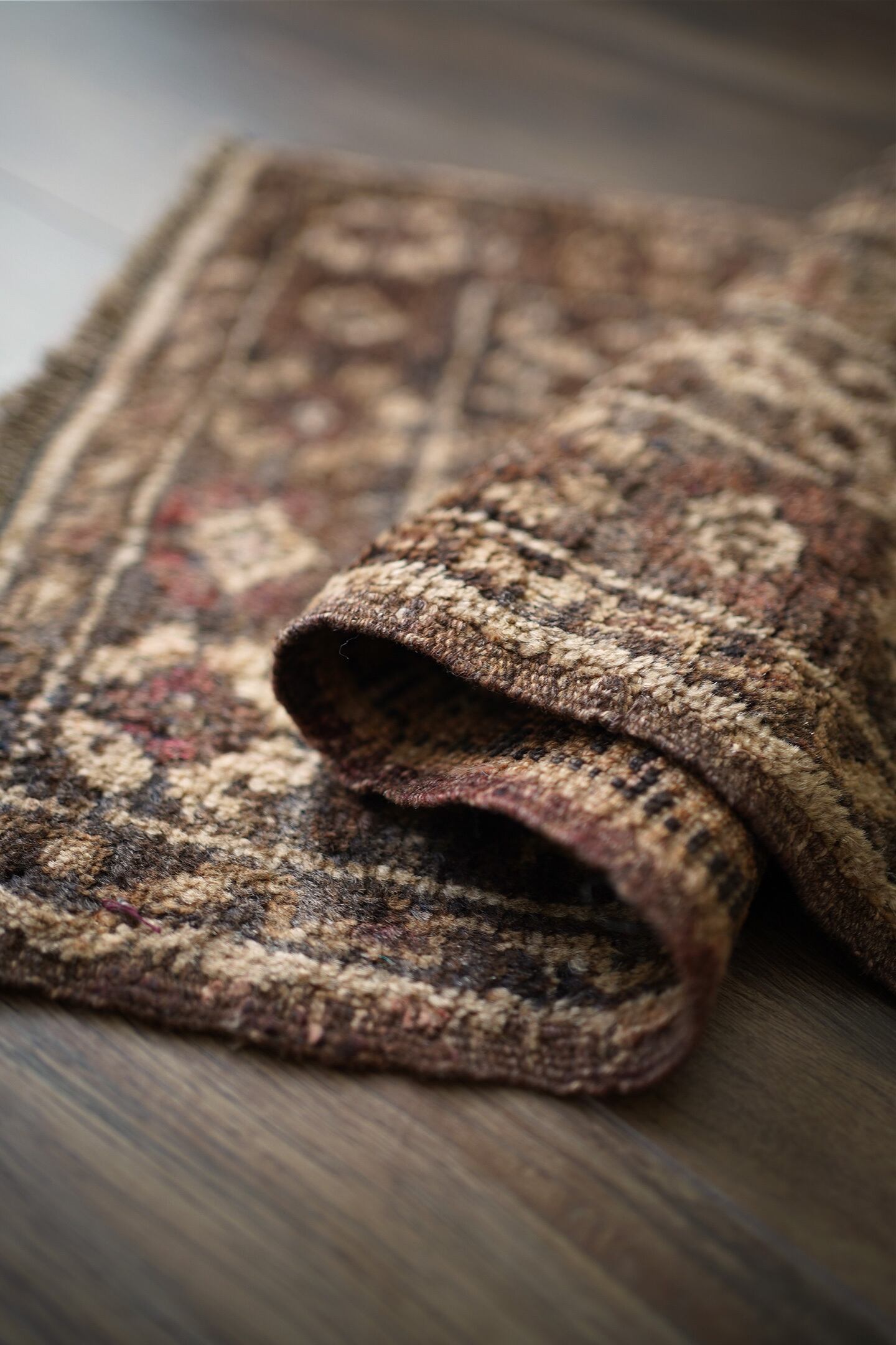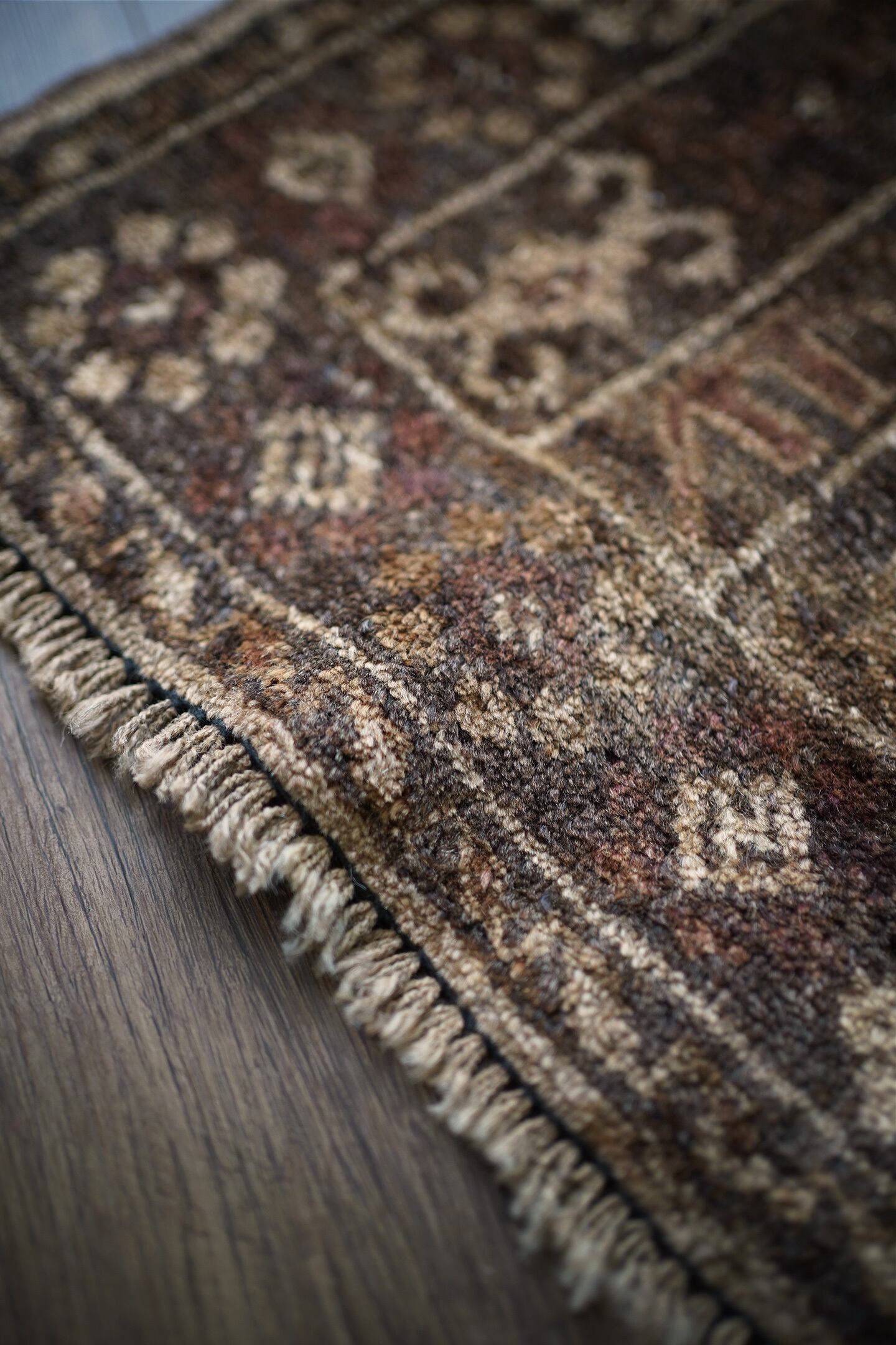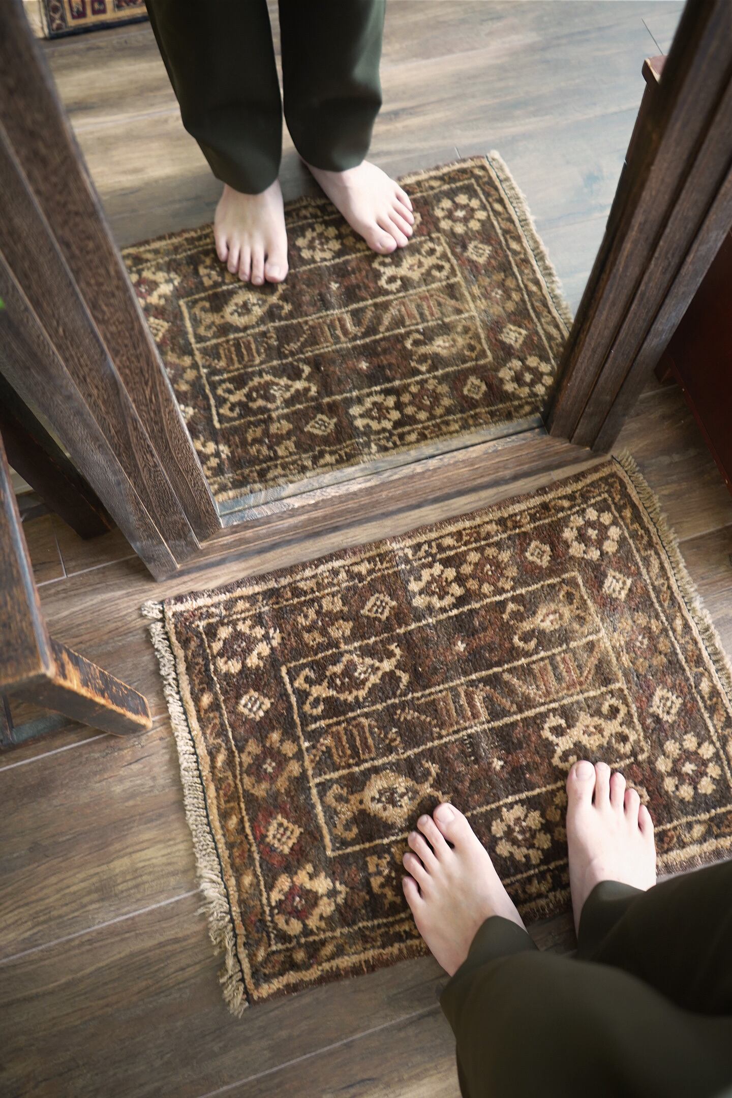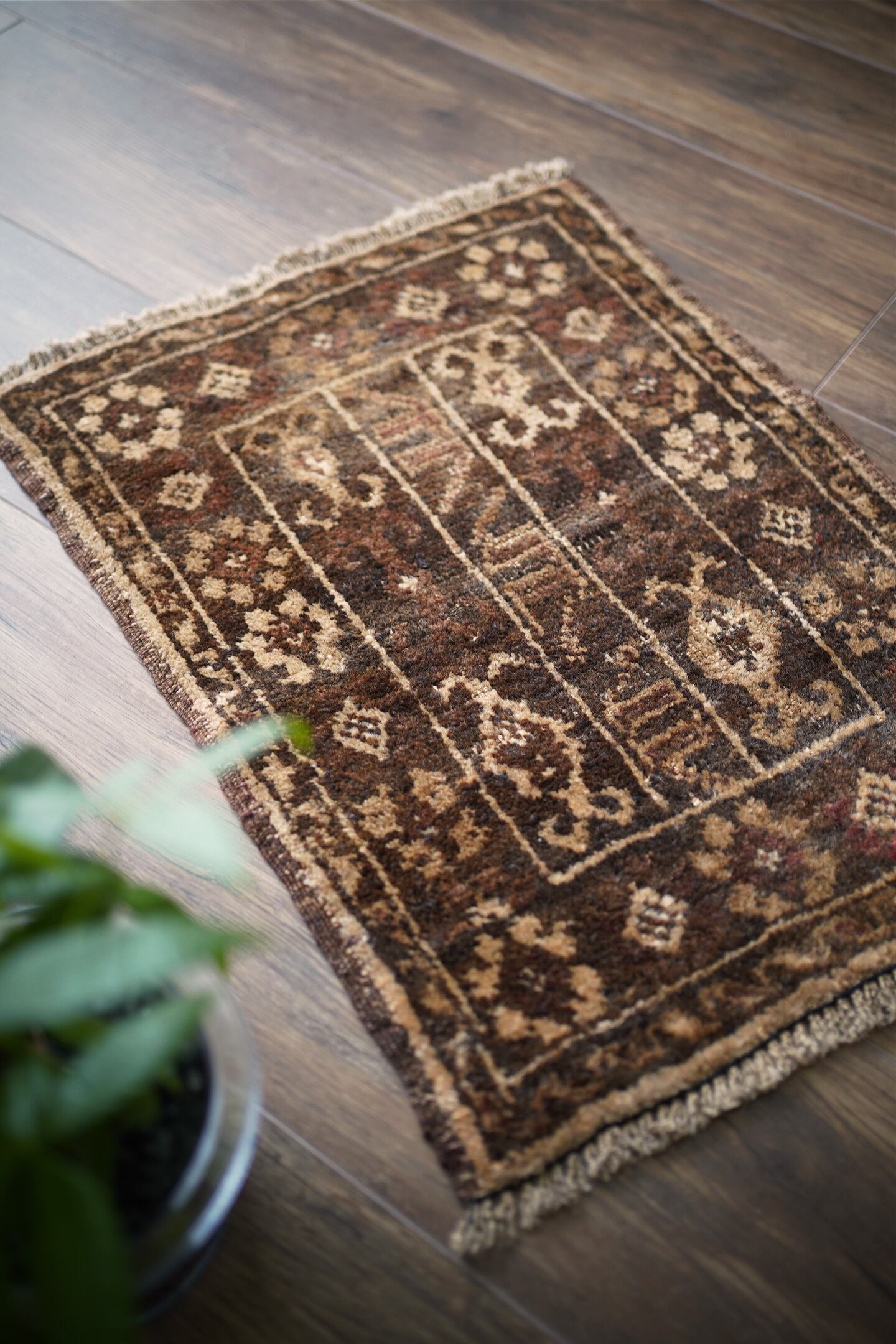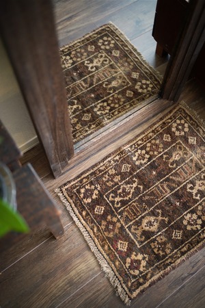 約40年〜50ほど前にトルクメン族によって織られたアリホジャラグ。アリホジャではあまり見かけない珍しいミニサイズで、焦茶ベースの渋い風合いの一枚。いくつかパイルが薄くなっている箇所がありますが、ヴィンテージを感じさせる風合いで全体的に素敵な雰囲気です。厚みは6mm程度で、表面はふわっと滑らかな肌触りをしています。観葉植物を上に置いたり、全身鏡の前などにオススメです。