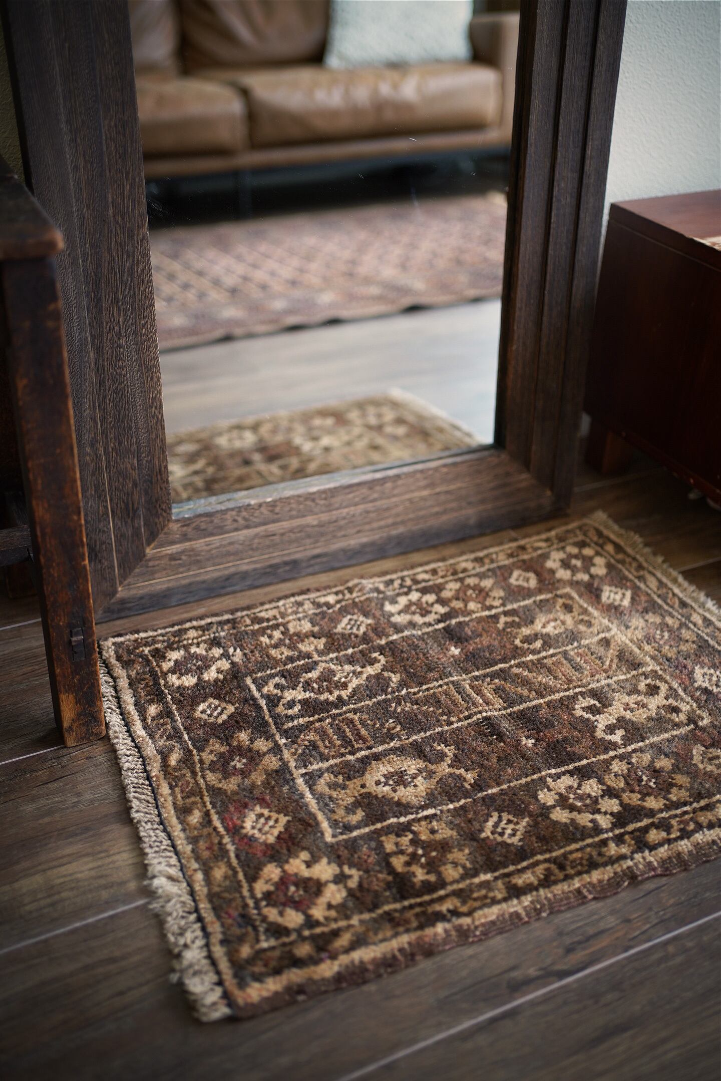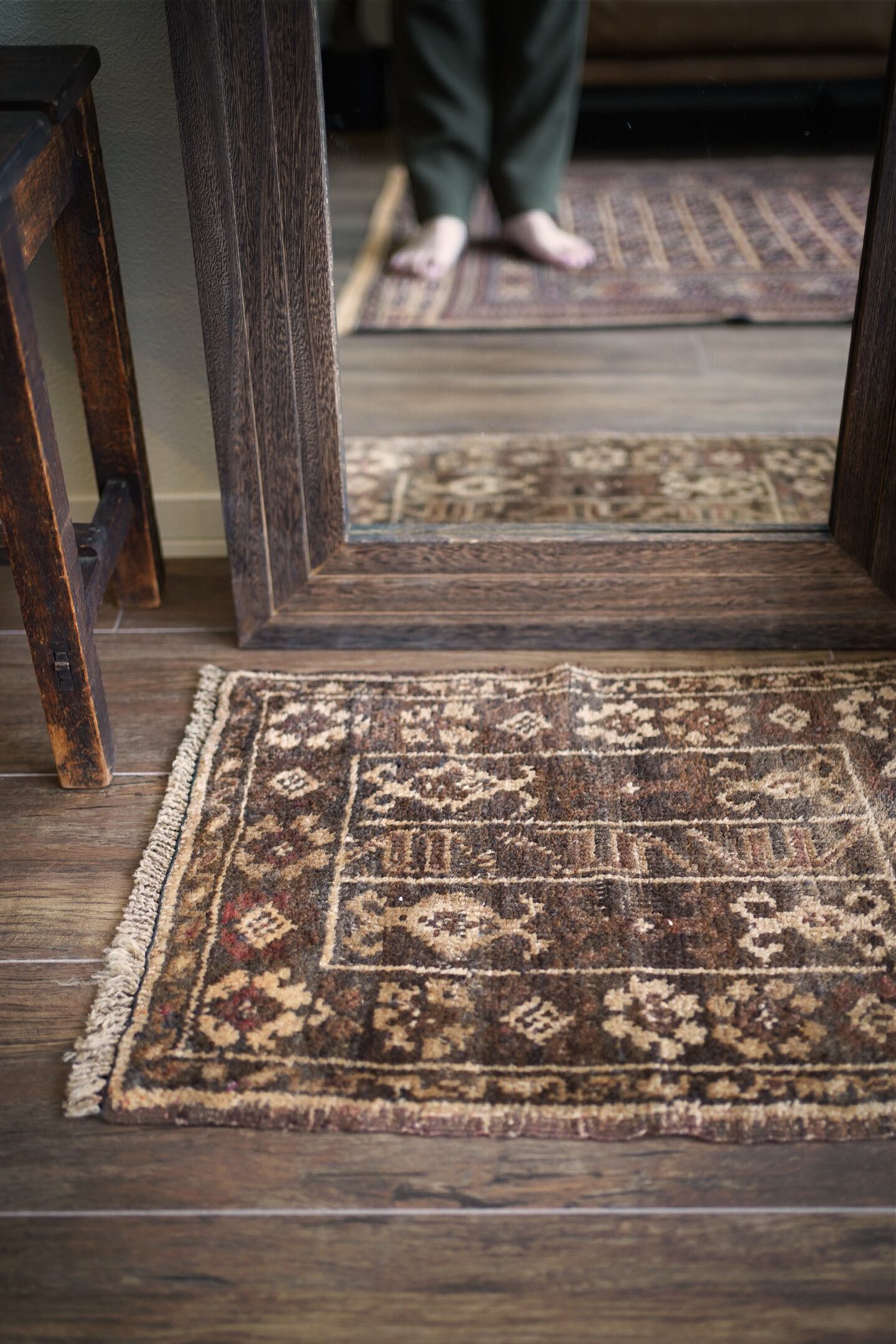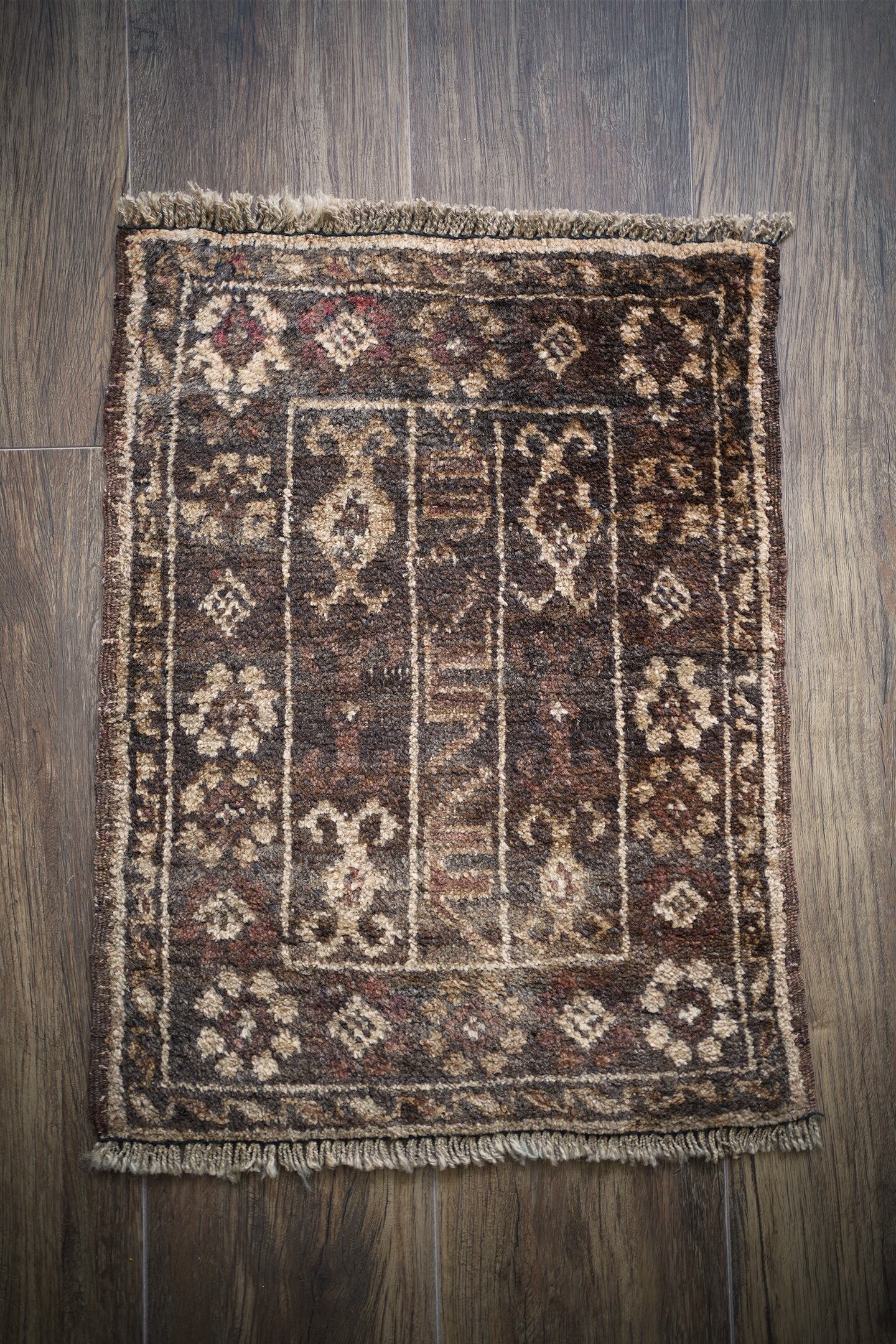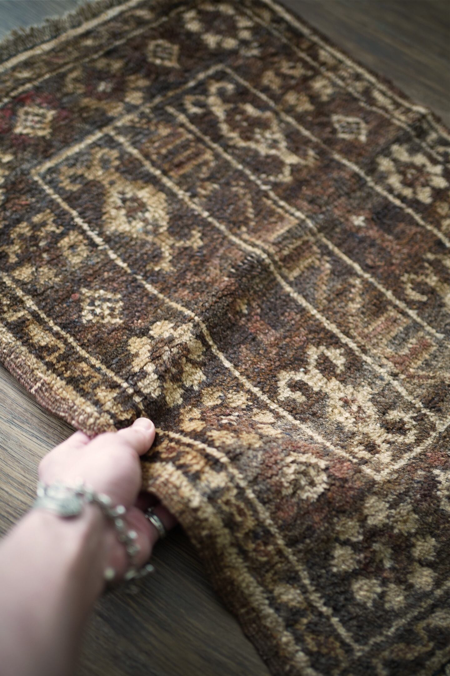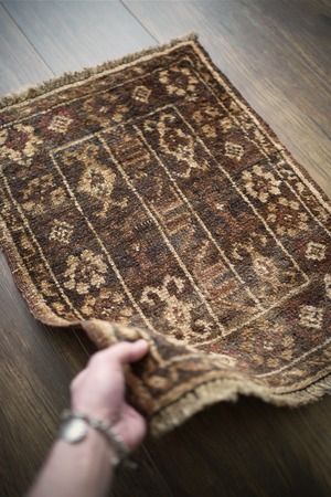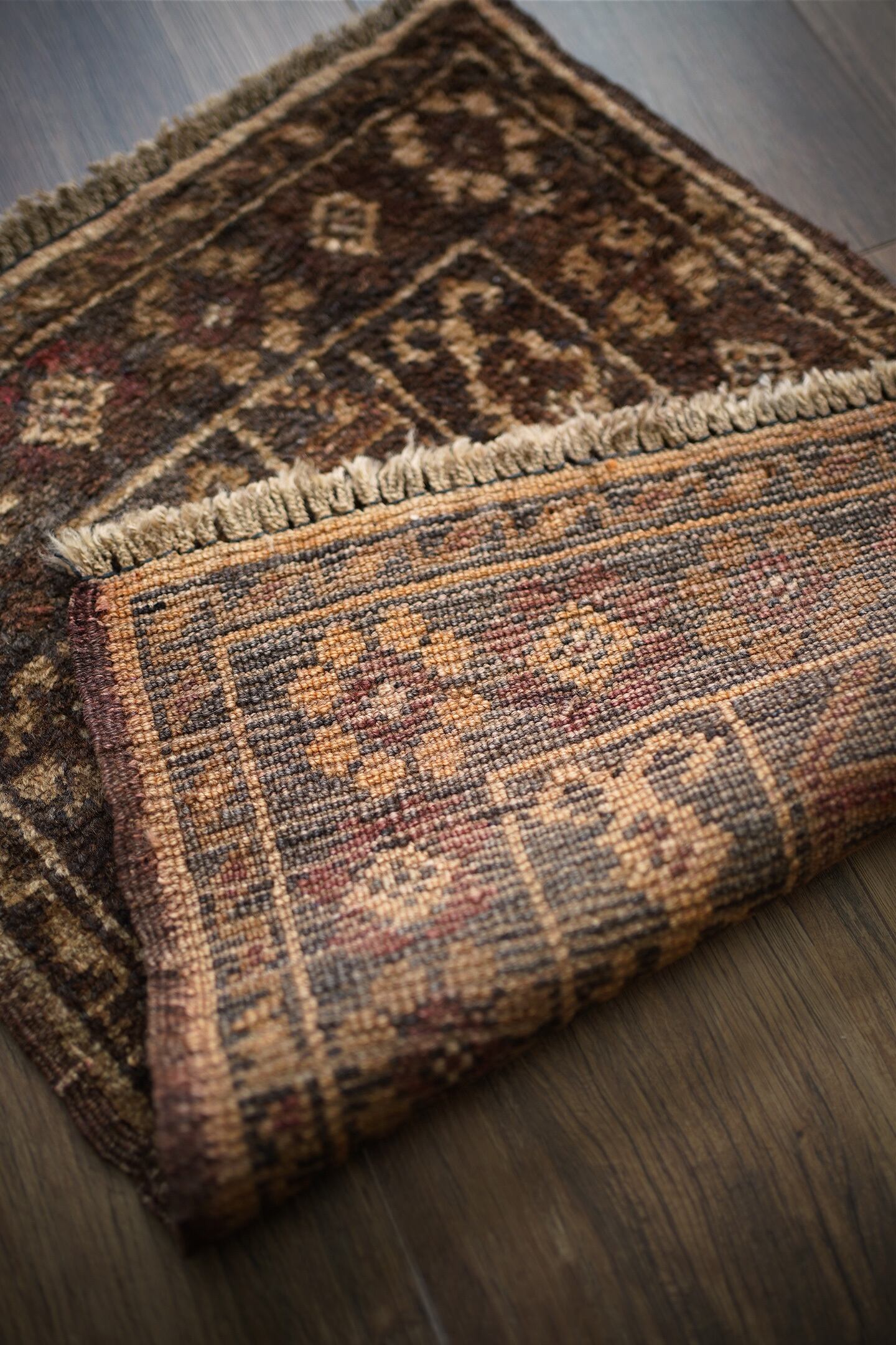 約40年〜50ほど前にトルクメン族によって織られたアリホジャラグ。アリホジャではあまり見かけない珍しいミニサイズで、焦茶ベースの渋い風合いの一枚。いくつかパイルが薄くなっている箇所がありますが、ヴィンテージを感じさせる風合いで全体的に素敵な雰囲気です。厚みは6mm程度で、表面はふわっと滑らかな肌触りをしています。観葉植物を上に置いたり、全身鏡の前などにオススメです。