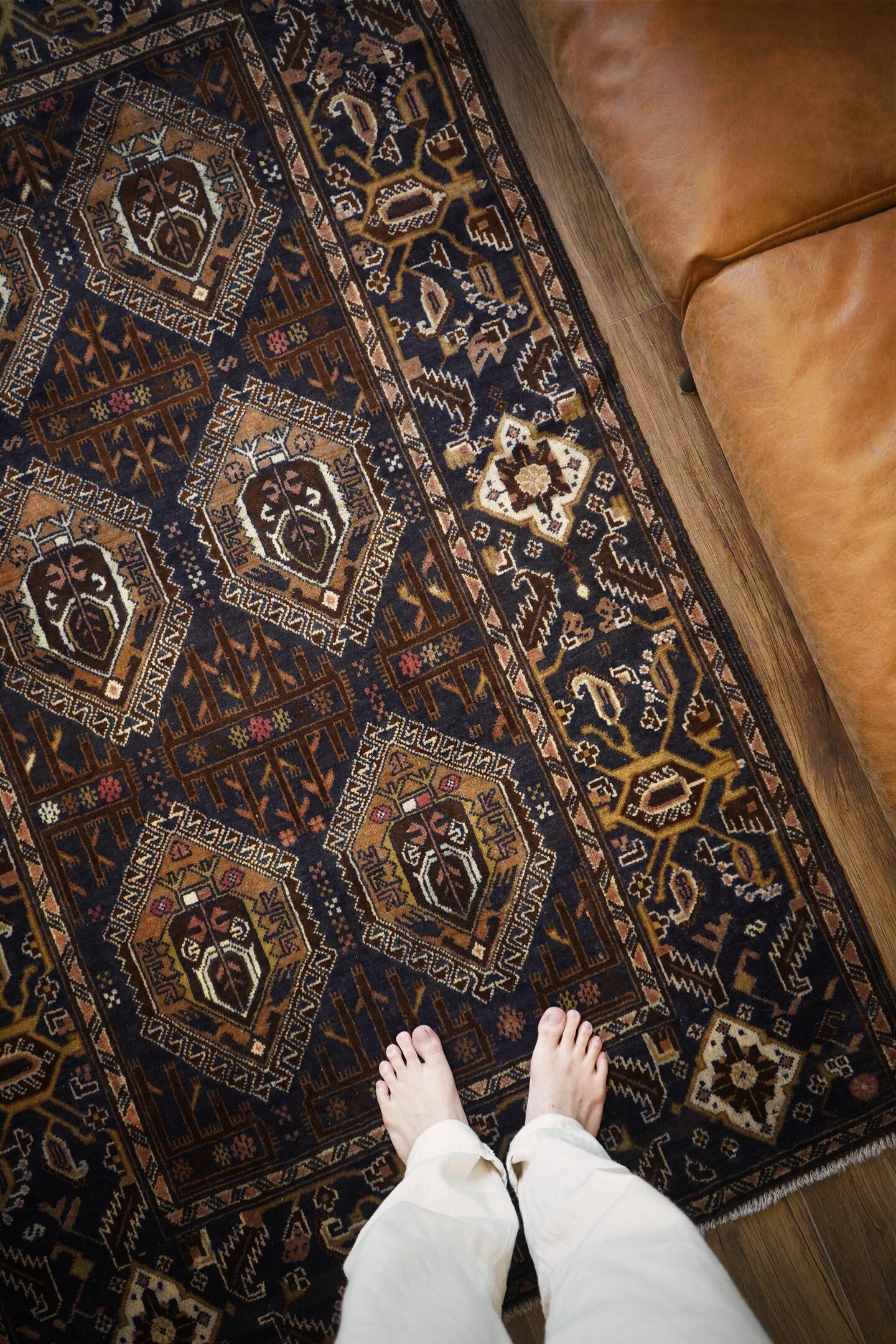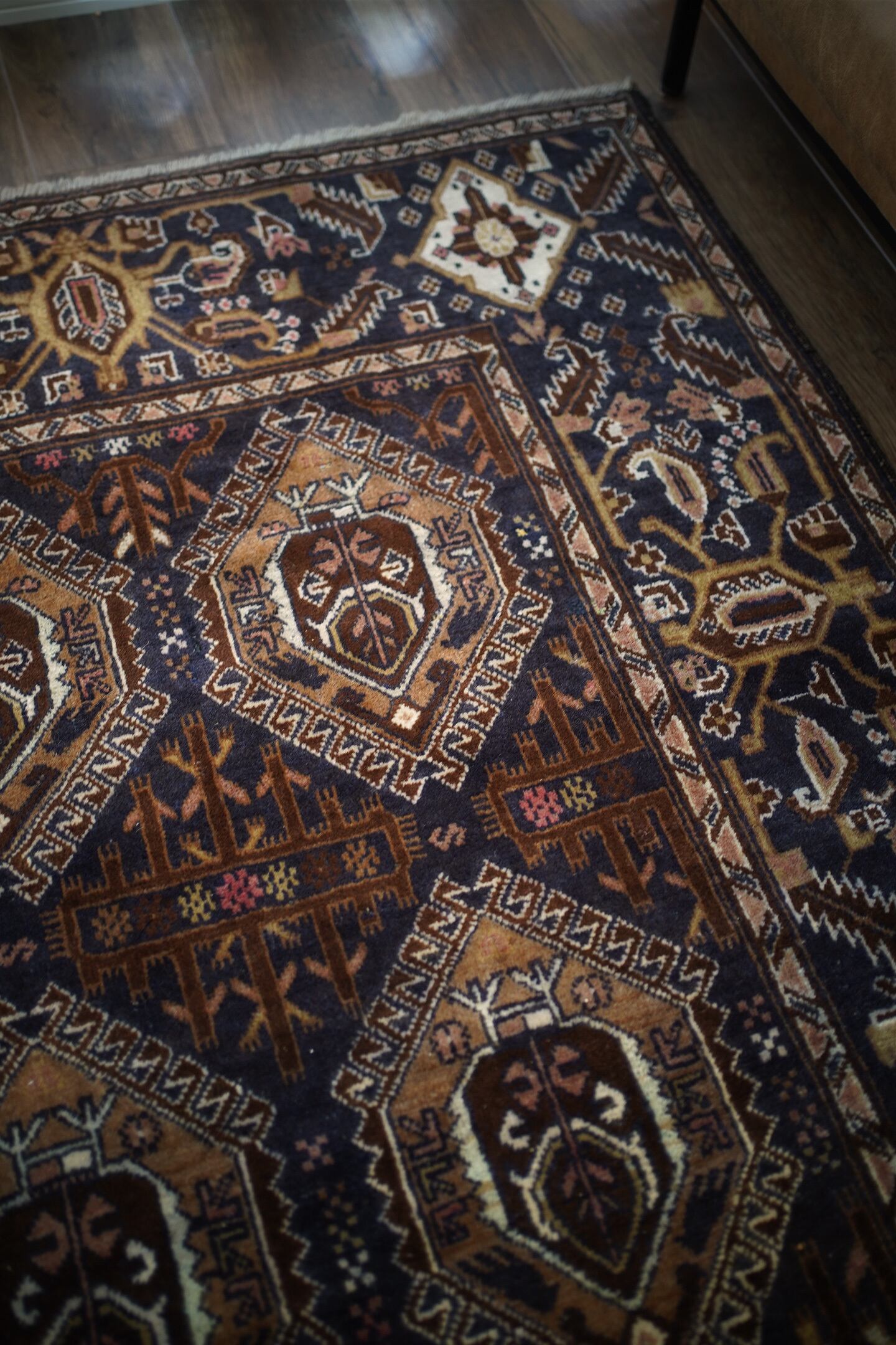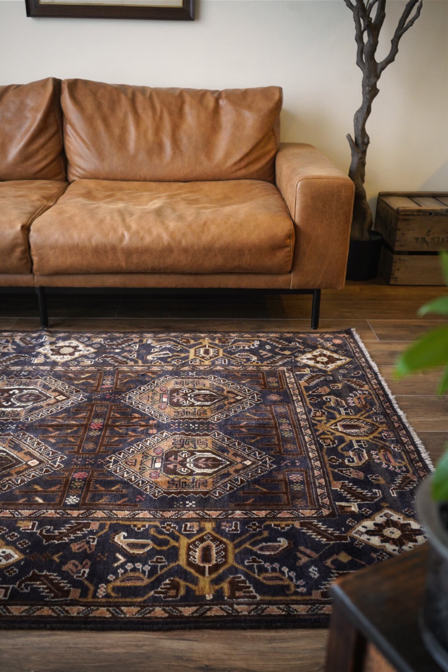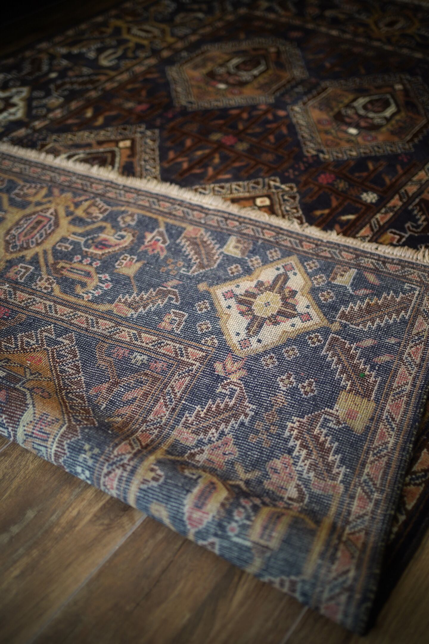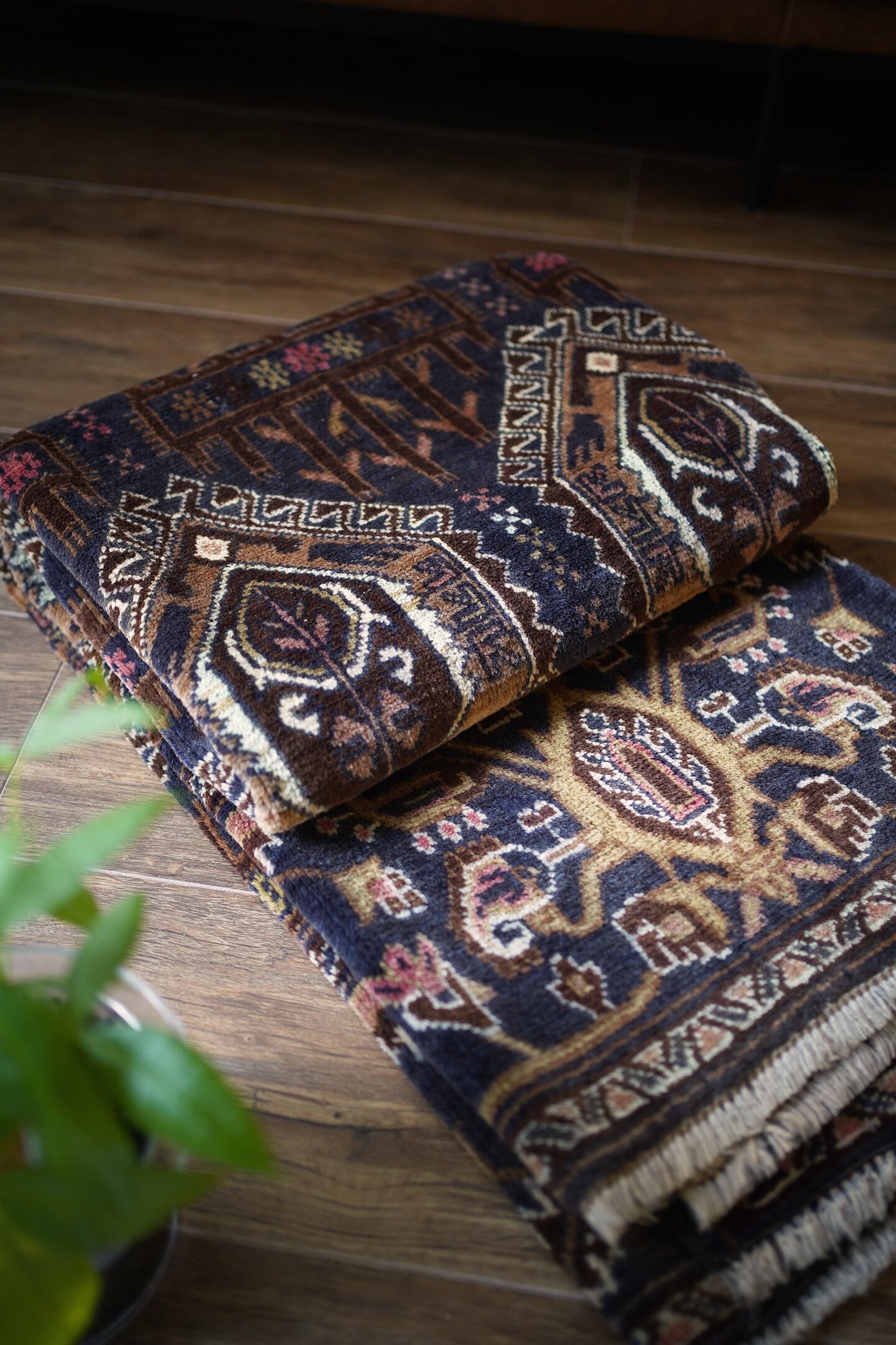 フック型の菱形紋様が6つ並んだインパクト強めなバルーチラグ。初見で見たときは全体的に少し柄の主張が強いかなと感じたのですが、実際にソファの前に敷いてみると驚くほどカッコよく馴染みました。色味は濃紺に少しグレーが混じったような色をベースに、ブラウンやベージュなど。アクセントに薄いピンクが使われているところもセンスが感じられます。表面はソフトウールでふわっとしつつ、しっとり滑らかで大変気持ちの良い肌触り。厚みは6mm〜7mm程度となります。目立ったダメージや補修跡もなく、コンディションも大変良好です。非常にスタイリッシュで、なかなか出会えないデザインですので、ピンと来た方はどうぞお見逃しなく♪