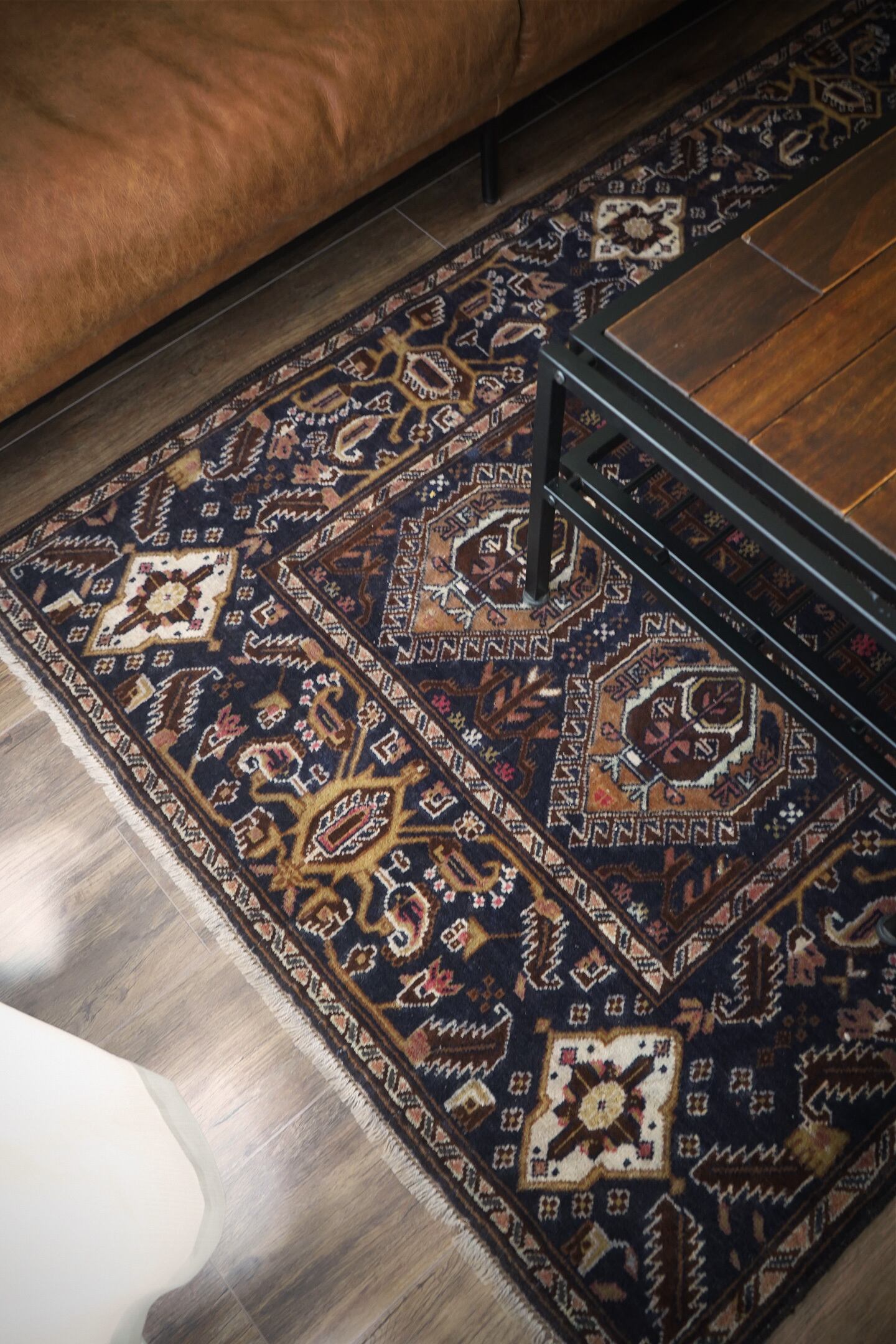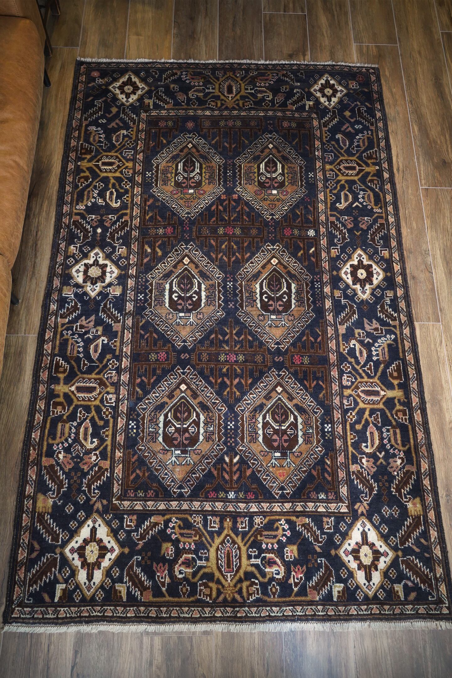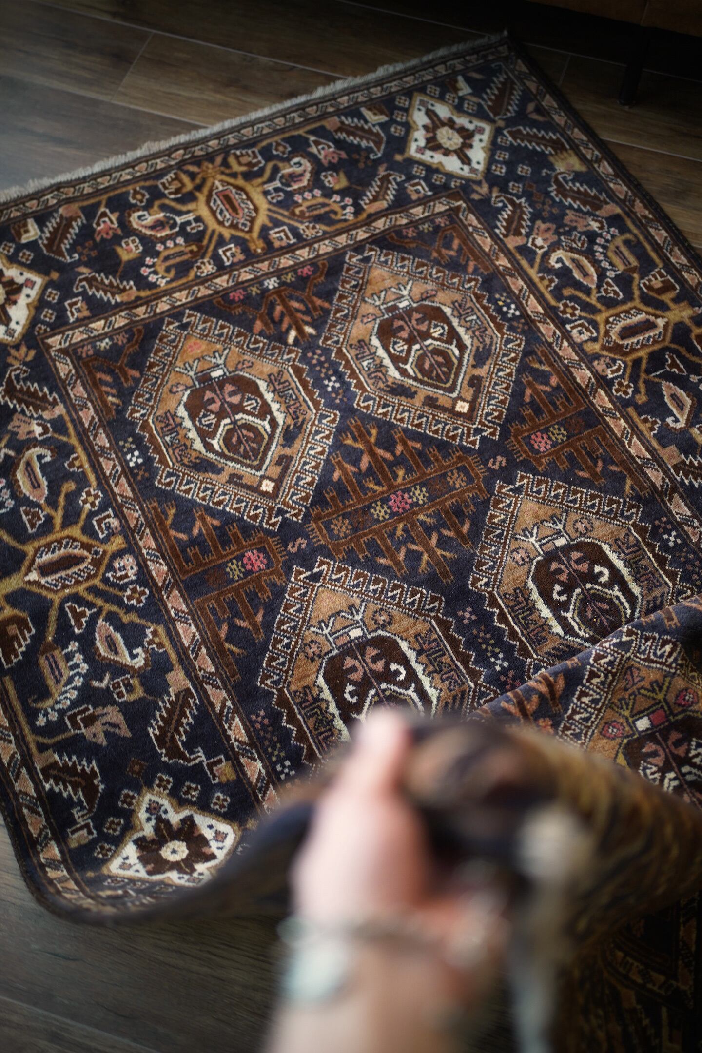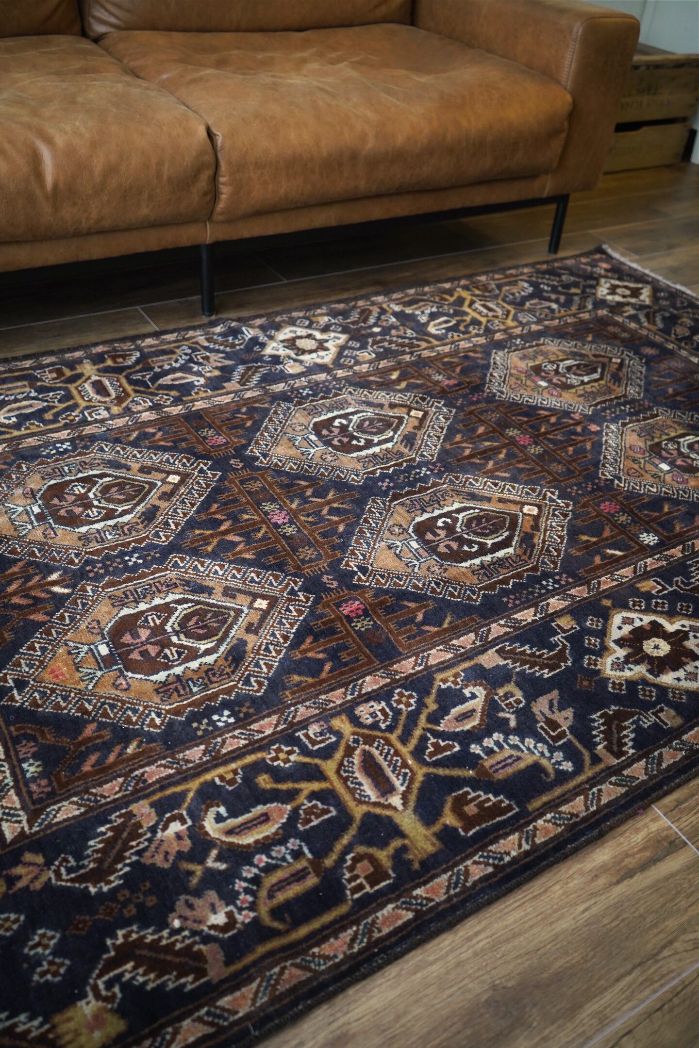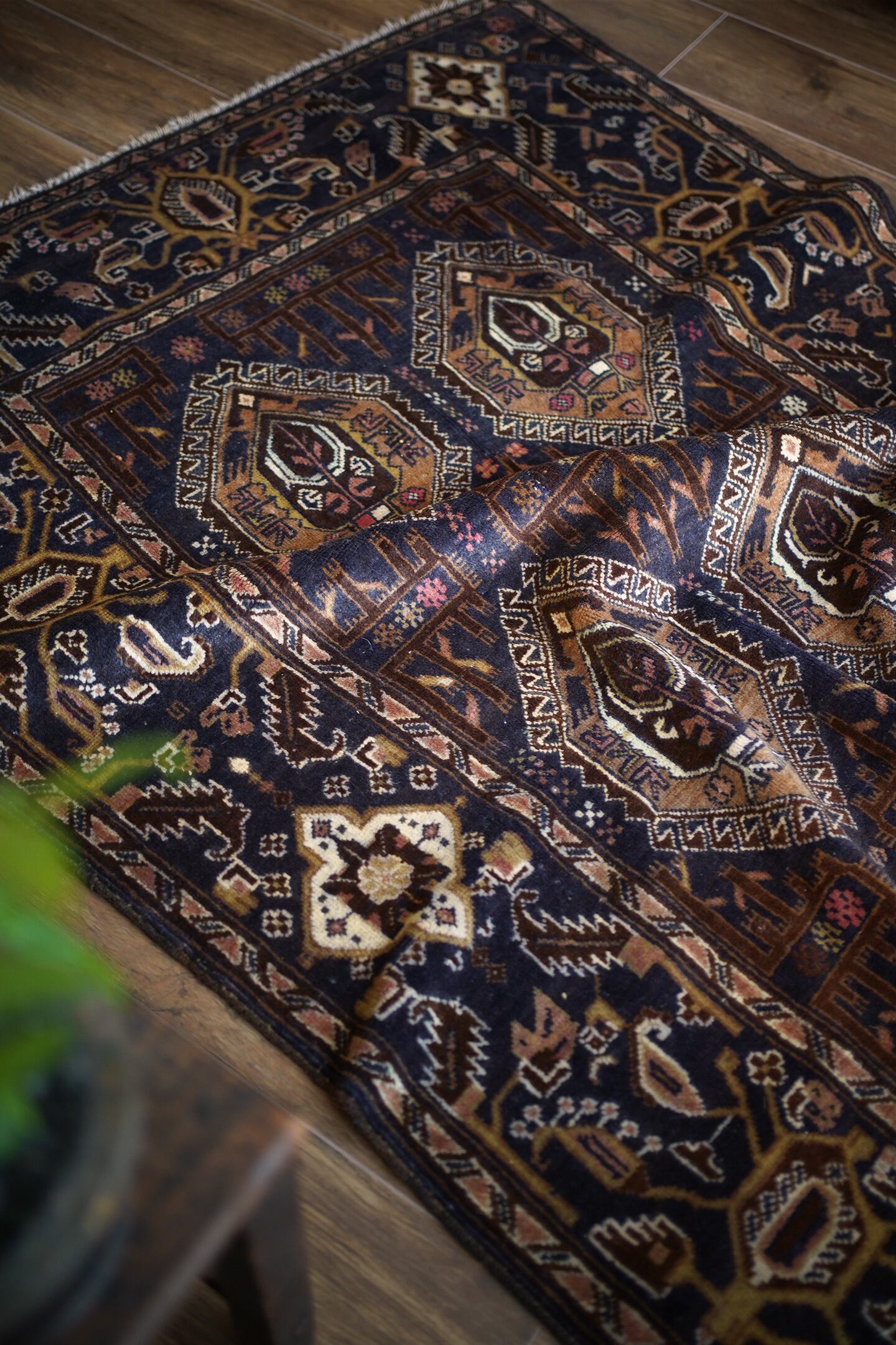 フック型の菱形紋様が6つ並んだインパクト強めなバルーチラグ。初見で見たときは全体的に少し柄の主張が強いかなと感じたのですが、実際にソファの前に敷いてみると驚くほどカッコよく馴染みました。色味は濃紺に少しグレーが混じったような色をベースに、ブラウンやベージュなど。アクセントに薄いピンクが使われているところもセンスが感じられます。表面はソフトウールでふわっとしつつ、しっとり滑らかで大変気持ちの良い肌触り。厚みは6mm〜7mm程度となります。目立ったダメージや補修跡もなく、コンディションも大変良好です。非常にスタイリッシュで、なかなか出会えないデザインですので、ピンと来た方はどうぞお見逃しなく♪