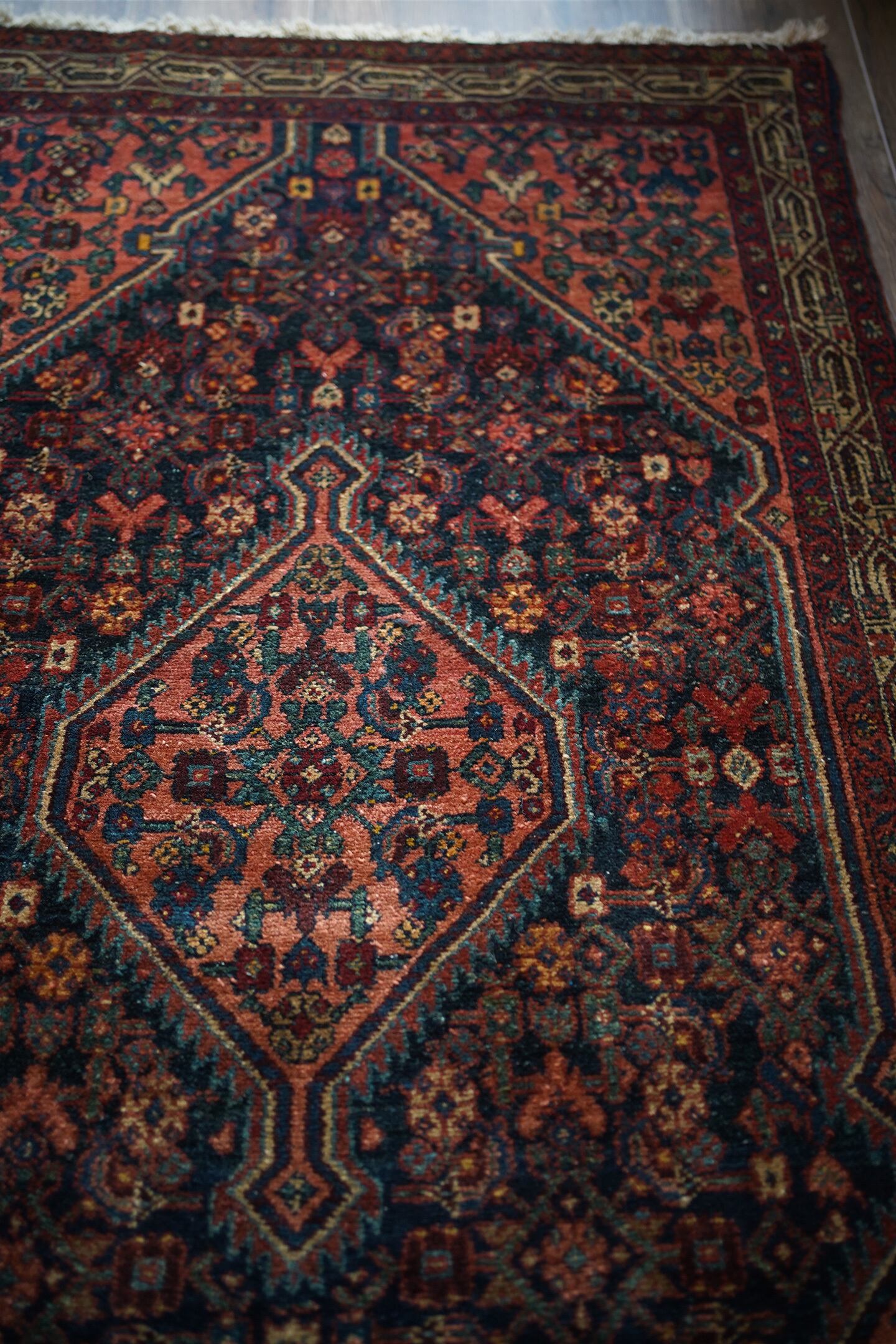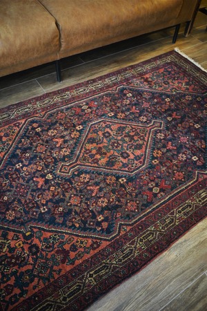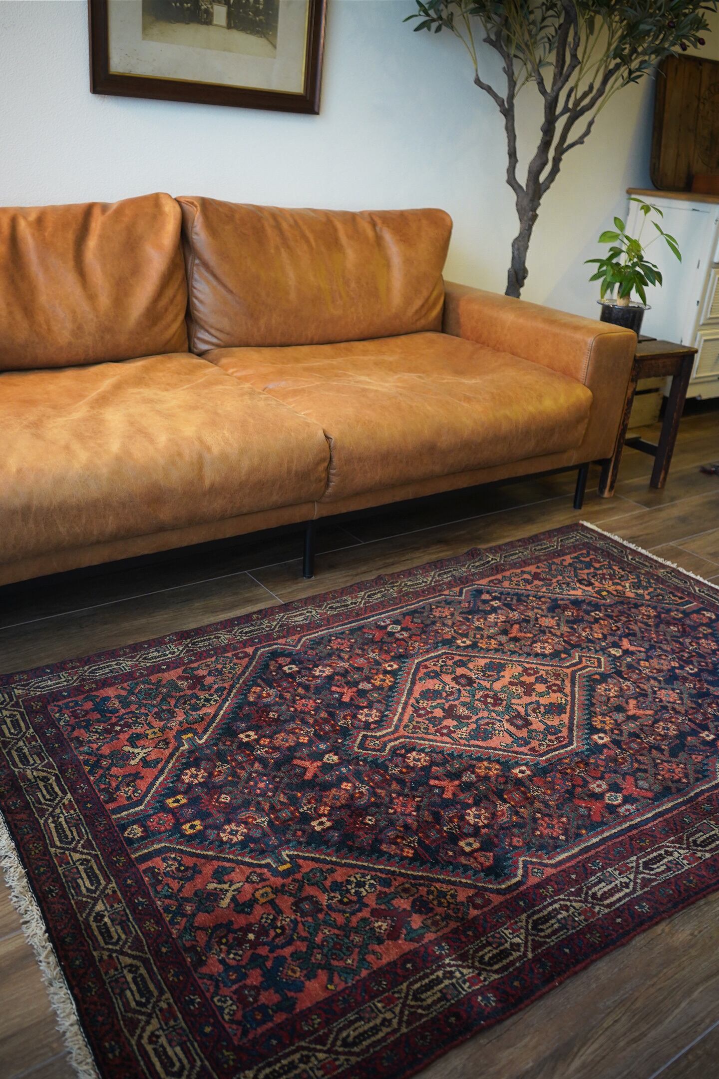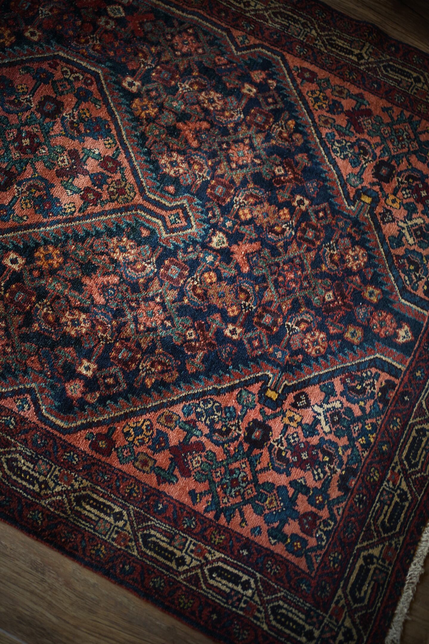 約60年ほど前に織られたイラン西部地域のマラーイェル産のヴィンテージラグ。サーモンピンクと濃紺のコントラストが美しく、"ヘラティ紋様"と呼ばれるアカンサス葉が菱形に組み合わさってできたモチーフが一面に織り込まれています。表面はサラふわっとしつつ、しっとりとした質感で、通年で敷ける万能タイプ。重量感もあり、ズレる心配もありません。厚みは8mm程度です。目立った補修跡やダメージもなくパーフェクトなコンディション。リビングや書斎、ベッドルームなどお好きな場所にどうぞ。