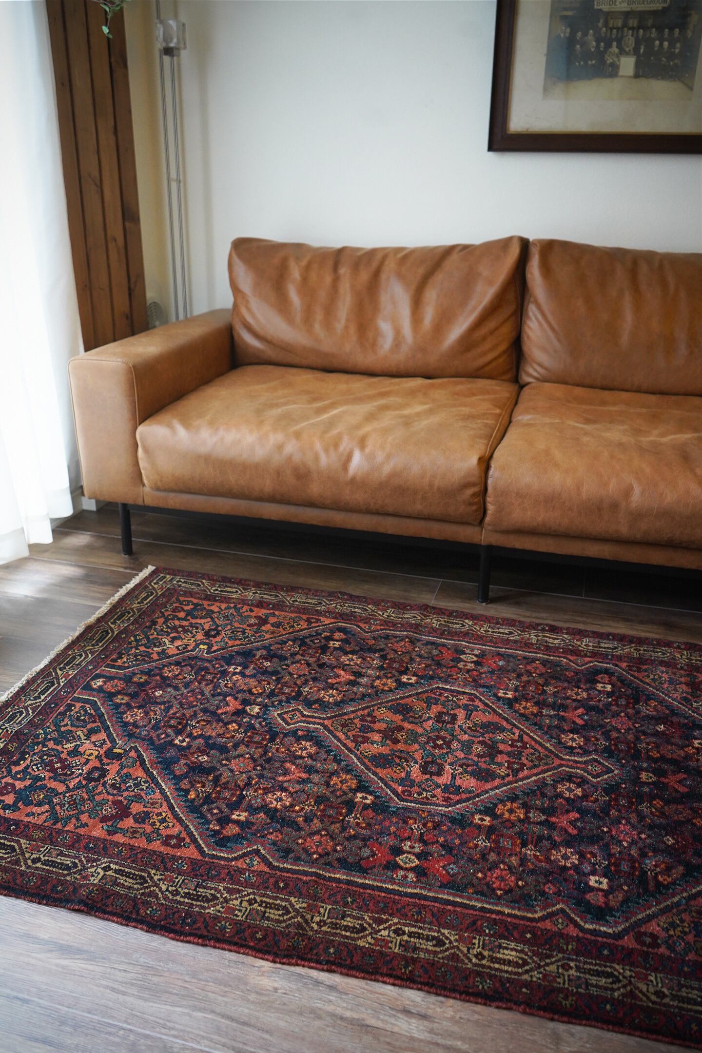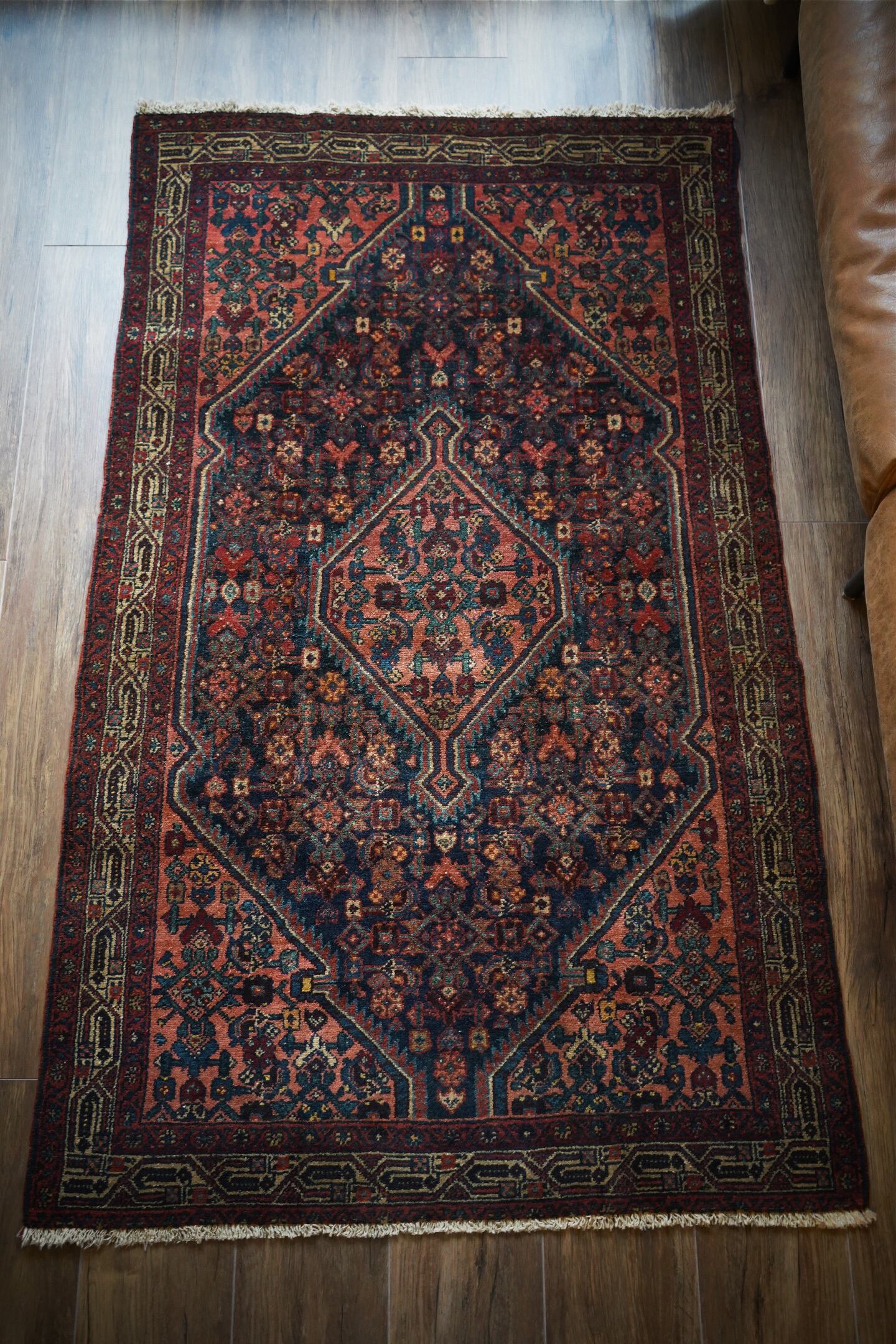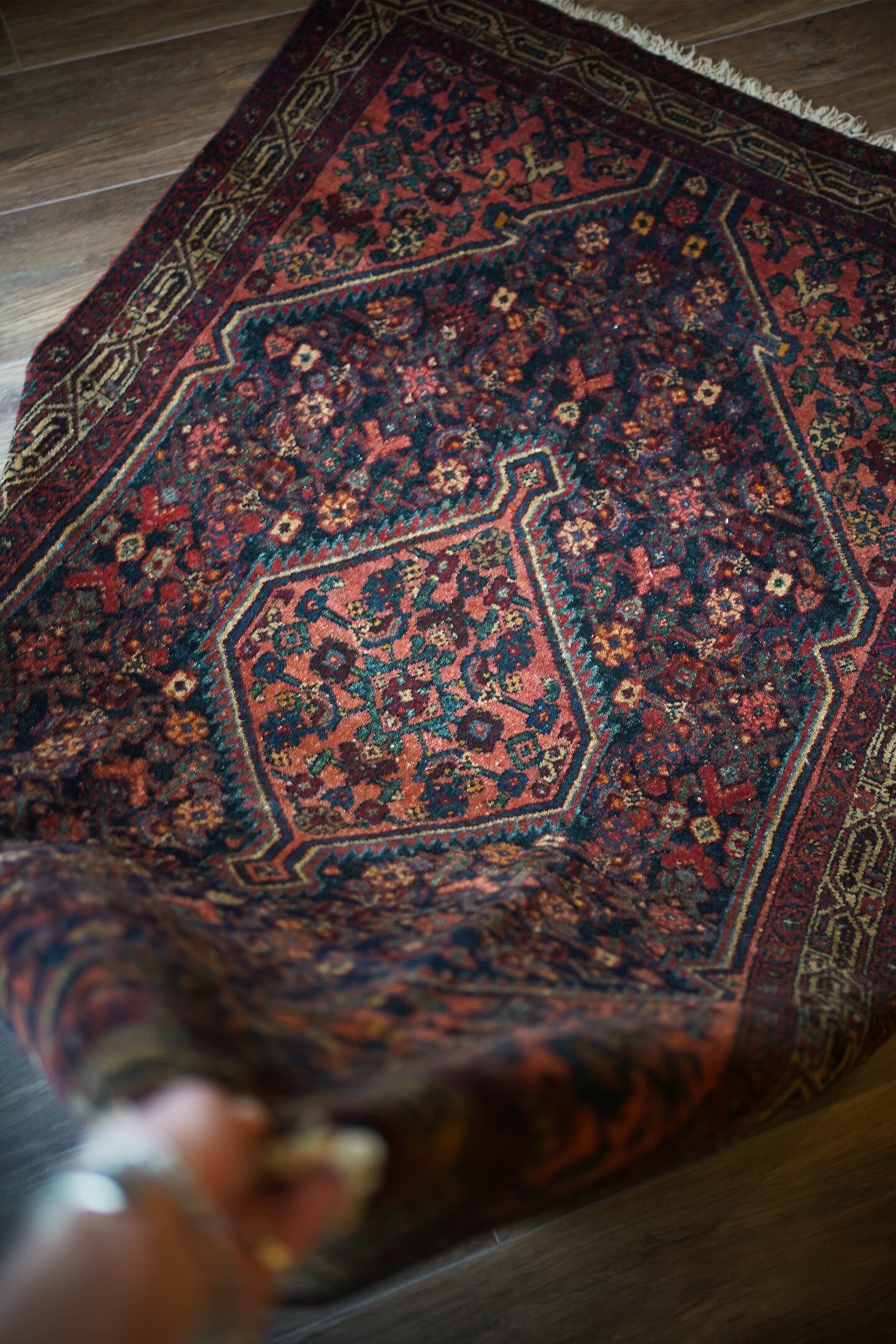 約60年ほど前に織られたイラン西部地域のマラーイェル産のヴィンテージラグ。サーモンピンクと濃紺のコントラストが美しく、"ヘラティ紋様"と呼ばれるアカンサス葉が菱形に組み合わさってできたモチーフが一面に織り込まれています。表面はサラふわっとしつつ、しっとりとした質感で、通年で敷ける万能タイプ。重量感もあり、ズレる心配もありません。厚みは8mm程度です。目立った補修跡やダメージもなくパーフェクトなコンディション。リビングや書斎、ベッドルームなどお好きな場所にどうぞ。