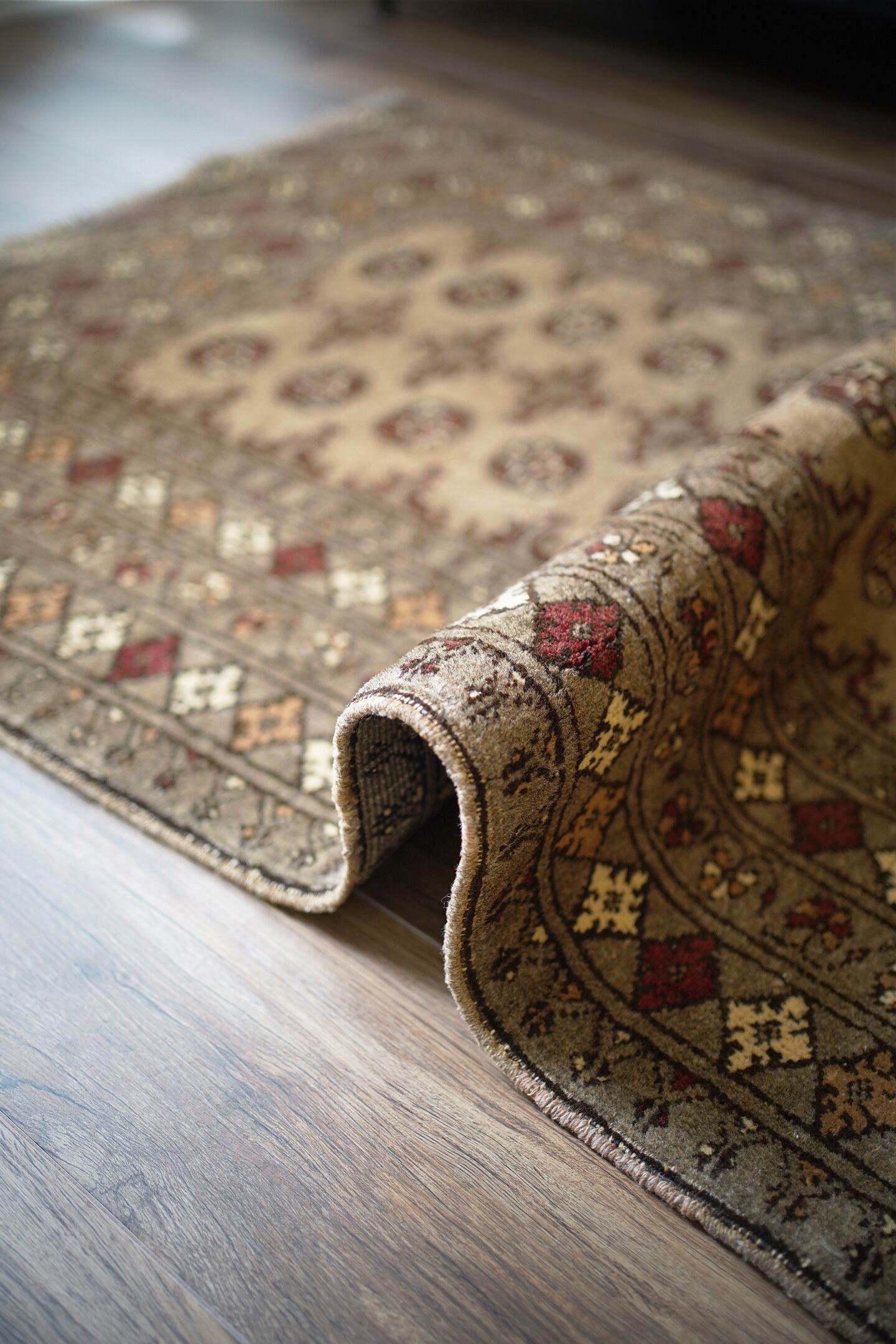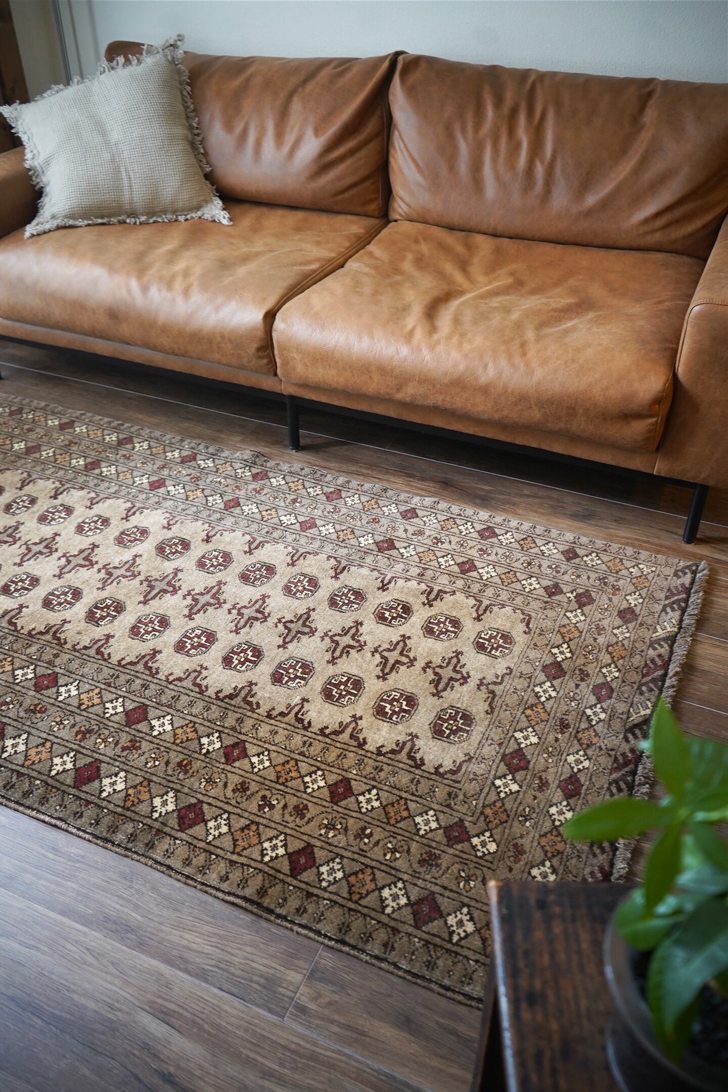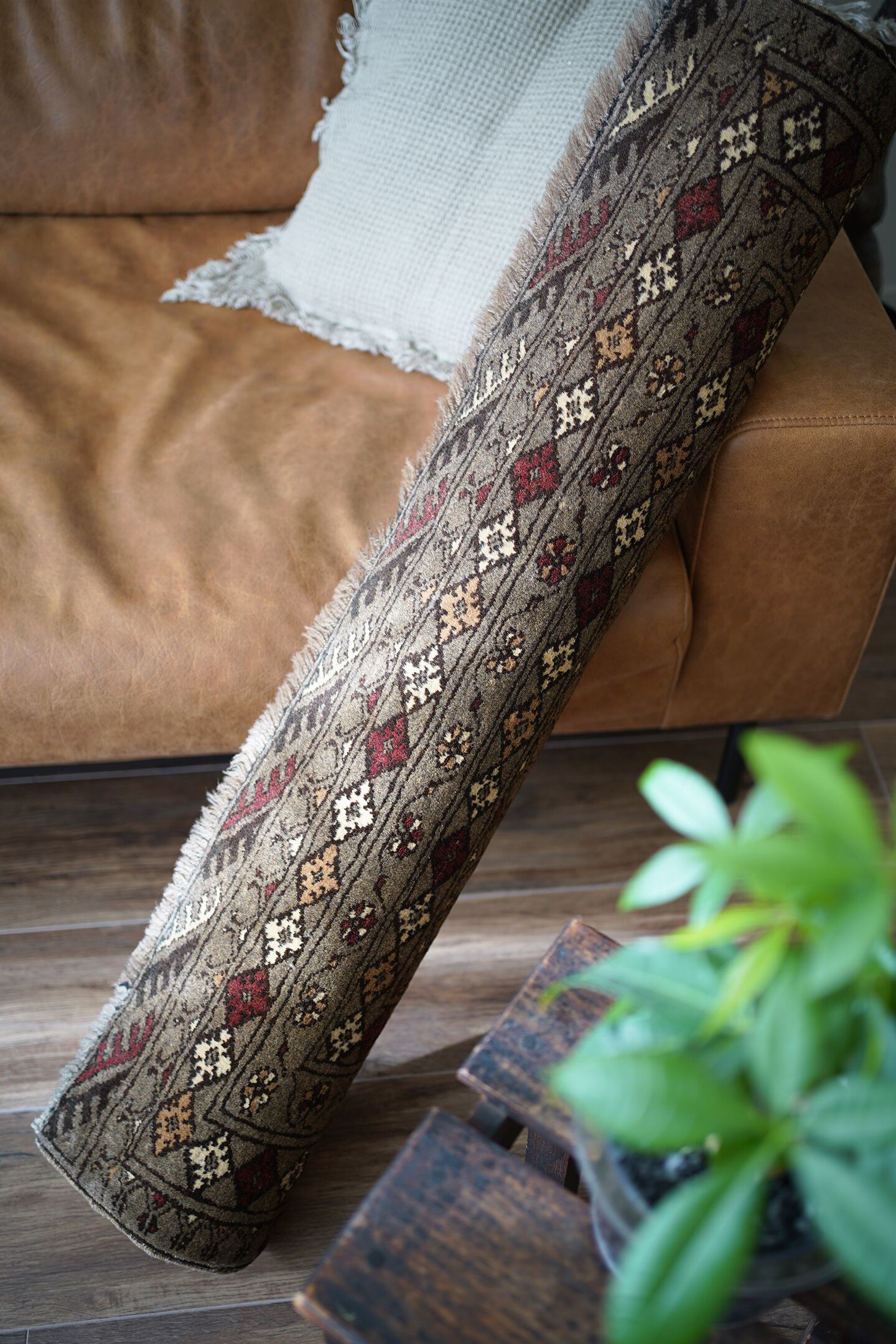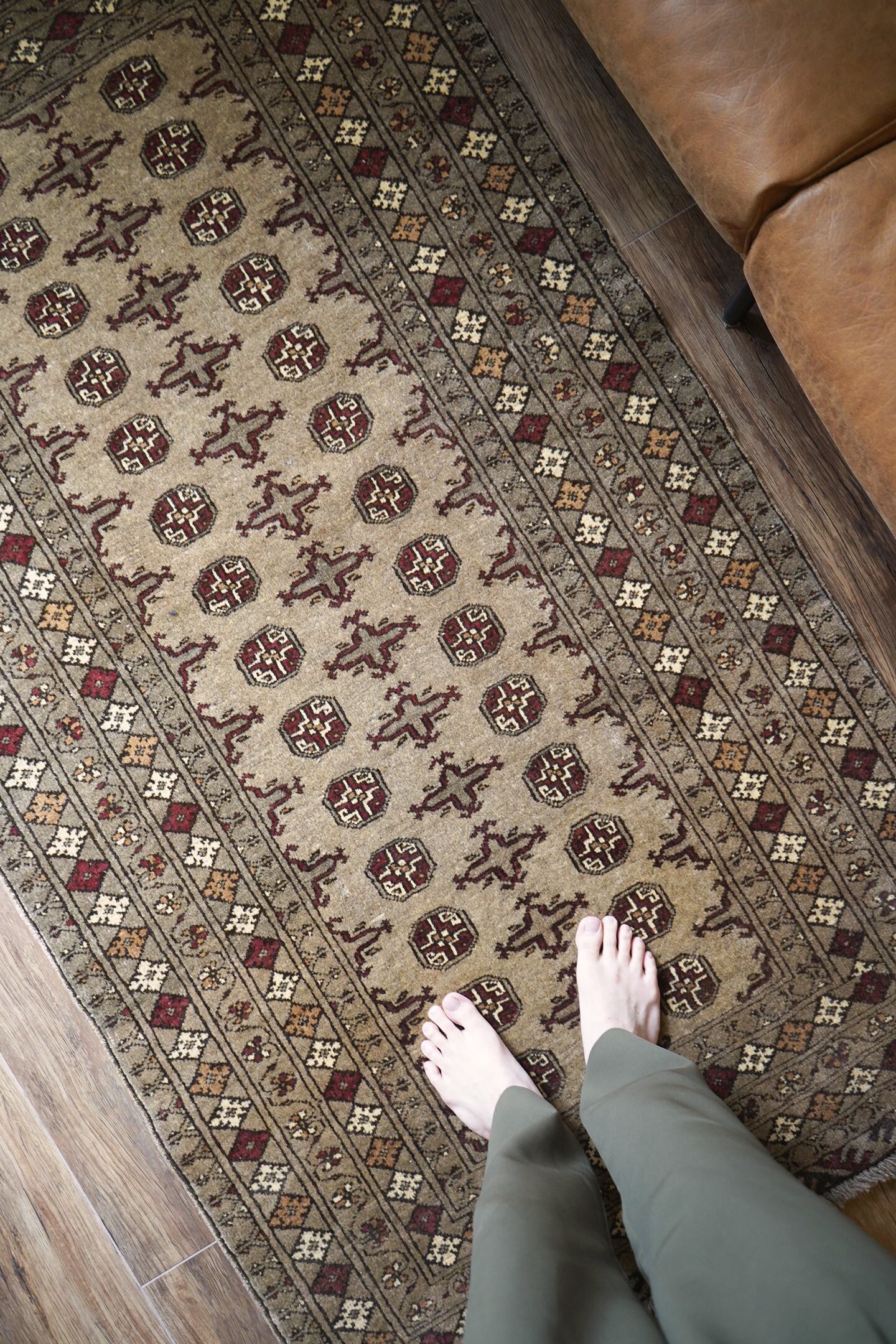 経年約60年〜70年のアフガニスタン産のトルクメンラグです。トルクメンといえば赤いラグが大半ですが、今回見つけたのはグレージュのような珍しいカラーリング。差し色にはオフホワイト、キャメル、えんじ色が使われており、癖のない色味でどんなお部屋にもスッと馴染んでくれそうな一枚です。表面はふわっとしっとり、滑らかな気持ちの良い肌触りをしており、厚みは8mmほど。トルクメン特有の目の詰まったパイルで、非常に重みもある堅牢な作りをしています。コンディションはパーフェクト。なかなか出会えないユニークな配色のトルクメン、ぜひお家のインテリアに取り入れてみてください。