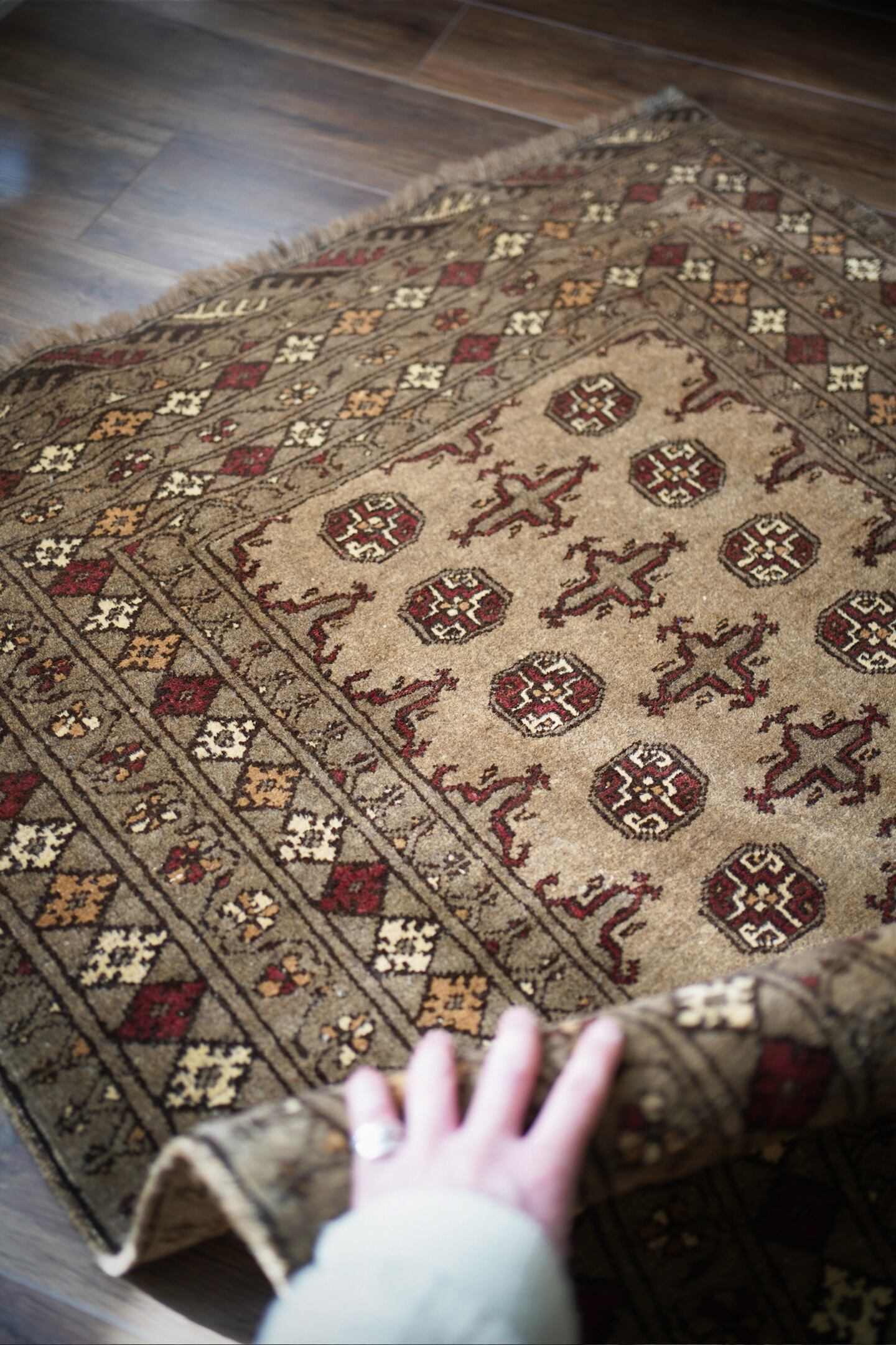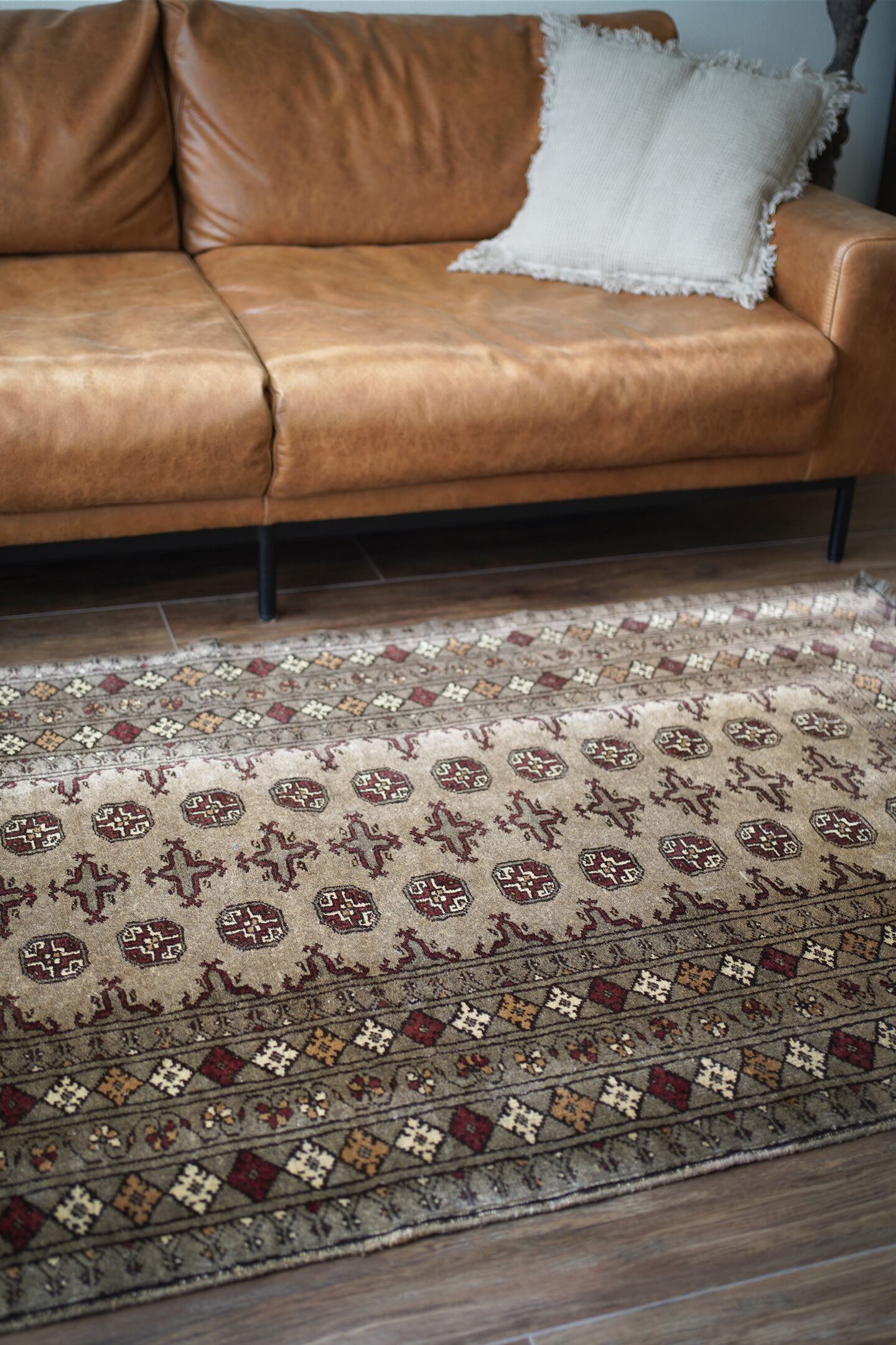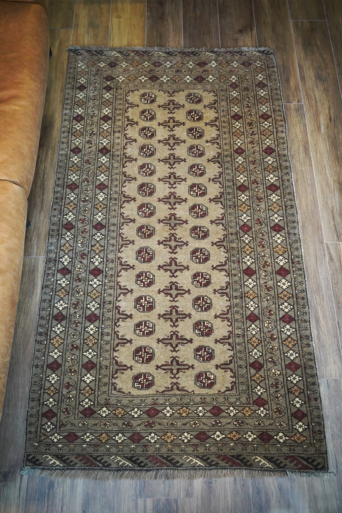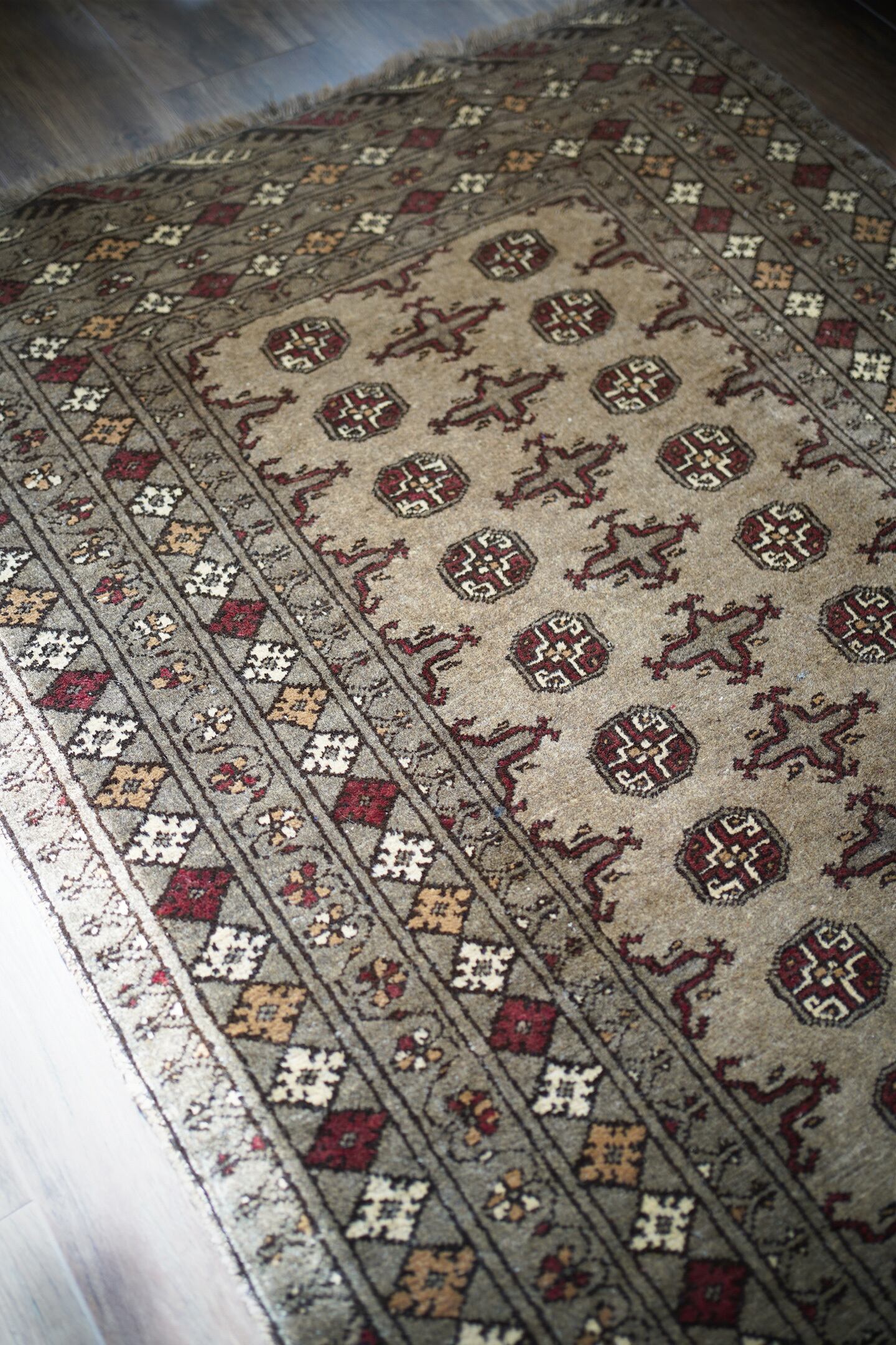 経年約60年〜70年のアフガニスタン産のトルクメンラグです。トルクメンといえば赤いラグが大半ですが、今回見つけたのはグレージュのような珍しいカラーリング。差し色にはオフホワイト、キャメル、えんじ色が使われており、癖のない色味でどんなお部屋にもスッと馴染んでくれそうな一枚です。表面はふわっとしっとり、滑らかな気持ちの良い肌触りをしており、厚みは8mmほど。トルクメン特有の目の詰まったパイルで、非常に重みもある堅牢な作りをしています。コンディションはパーフェクト。なかなか出会えないユニークな配色のトルクメン、ぜひお家のインテリアに取り入れてみてください。
