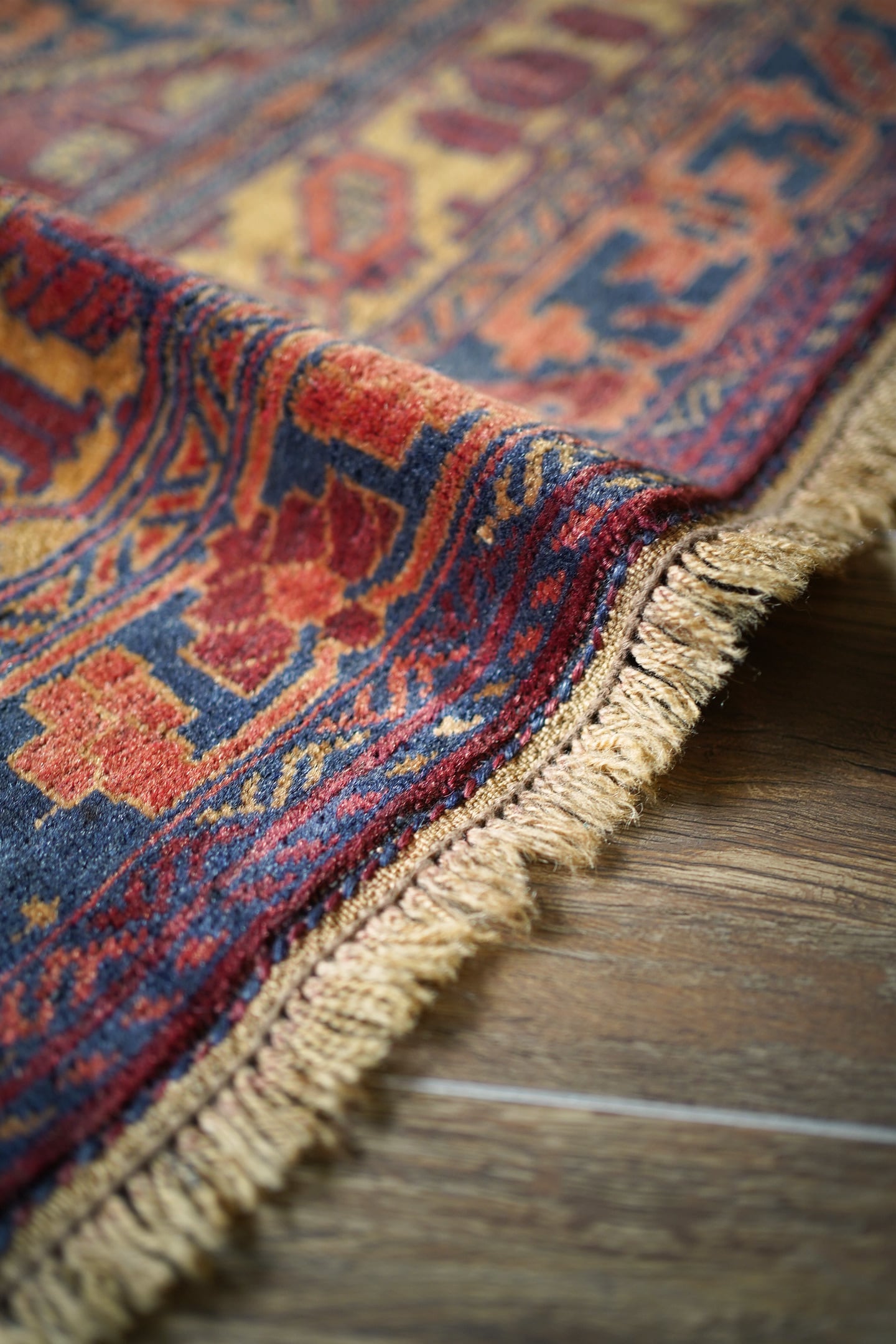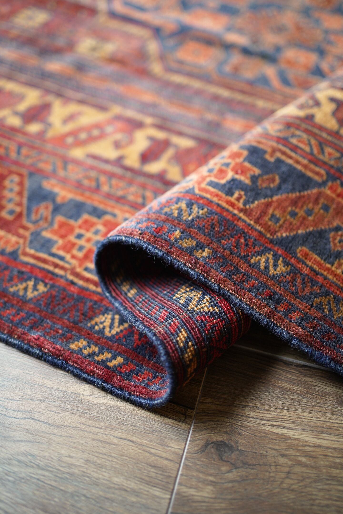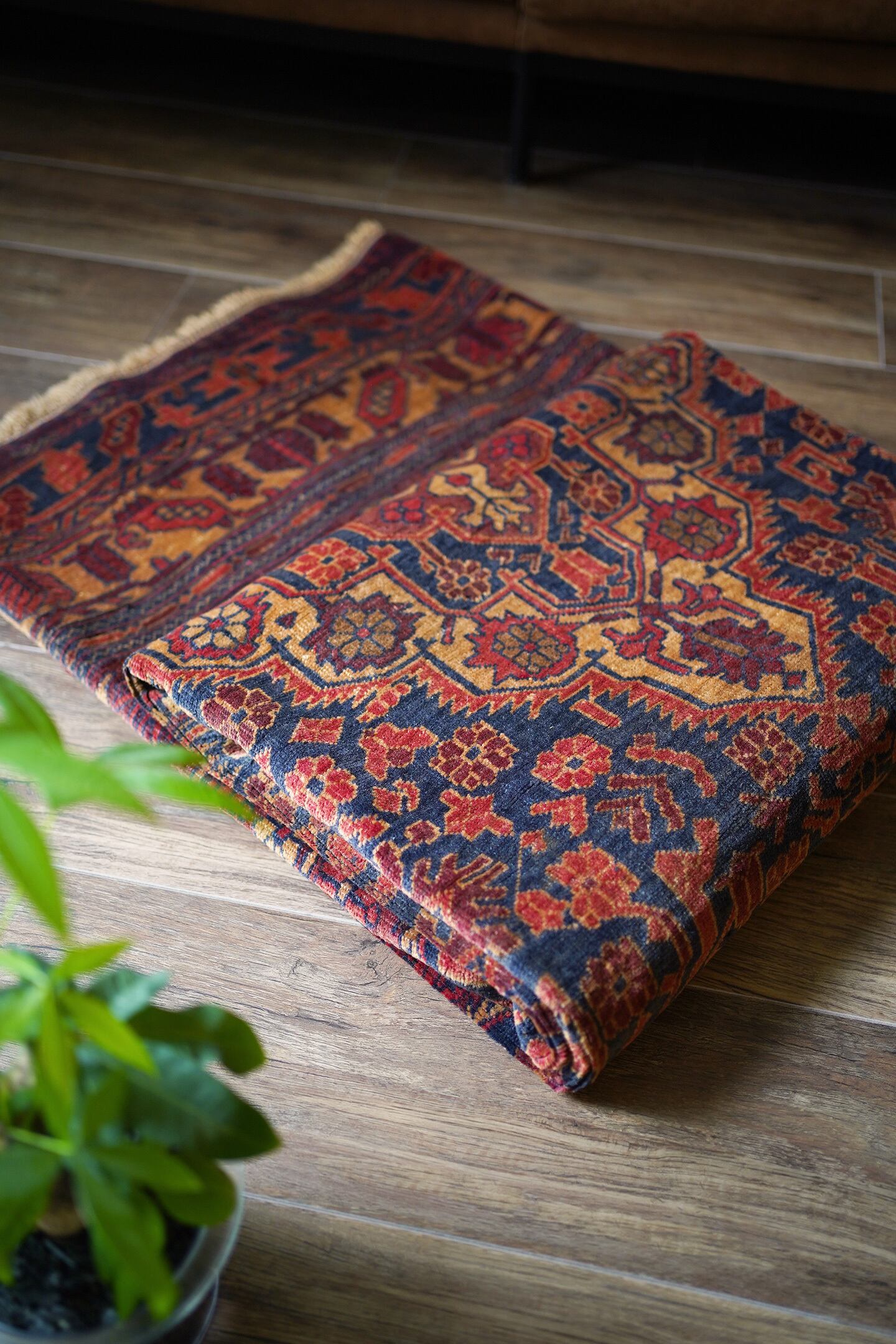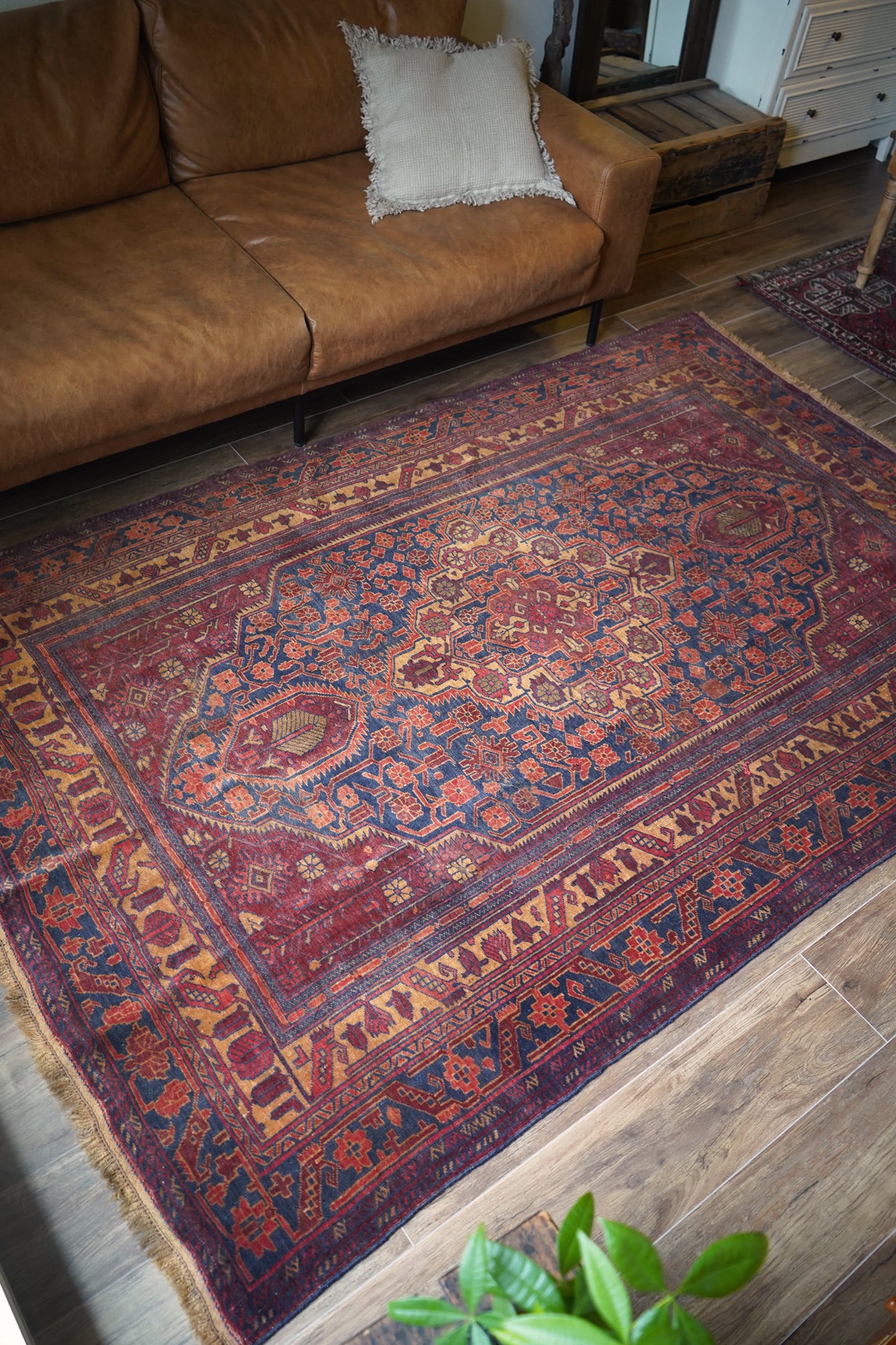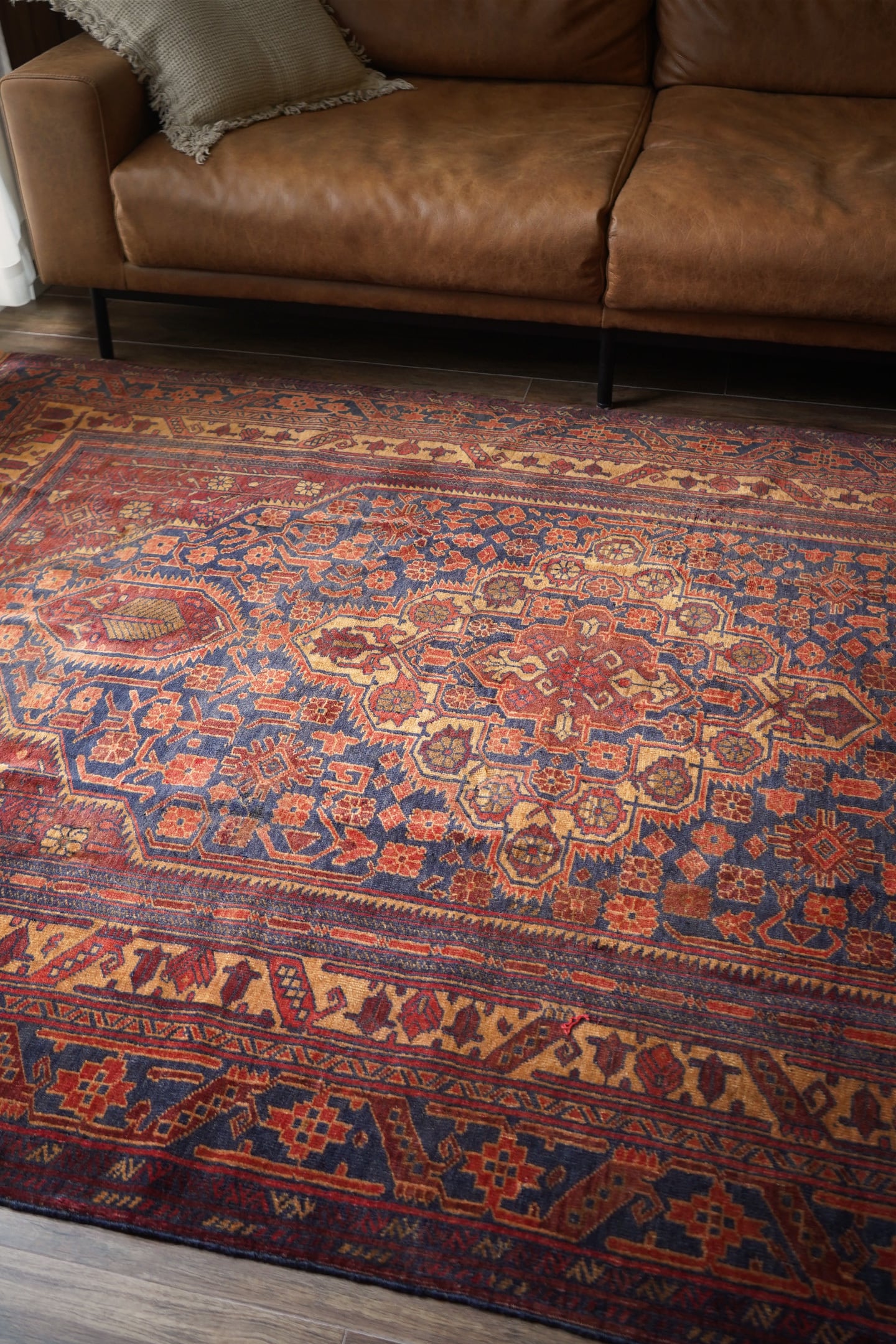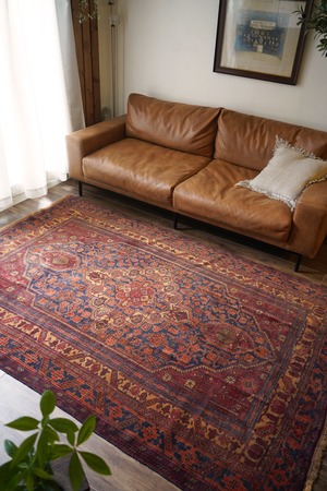 アフガニスタン北西部のカラエナウで織られた経年40年ほどのヴィンテージラグ。真ん中に大きなメダリオンを配した存在感のあるデザインでありながら、全体的にバランスの取れた落ち着いた色味なので、ご家庭にも取り入れやすく馴染みやすいラグかと思います。配色はネイビー、赤茶、朱色、キャメルなど。パイルにうっすらと艶もあり、一段とラグの美しさを感じさせます。パイルは低めですが、表面はサラッとしつつも、しっとり滑らかな毛並みを感じられる気持ちの良い肌触り。厚みは5mm程度です。また、裏面はコシのある質感で重量感もあるため、上を歩いてもズレる心配はありません。コンディションは言うことなしのパーフェクト。リビングのソファ前やダイニングテーブル下にも良さそうです。