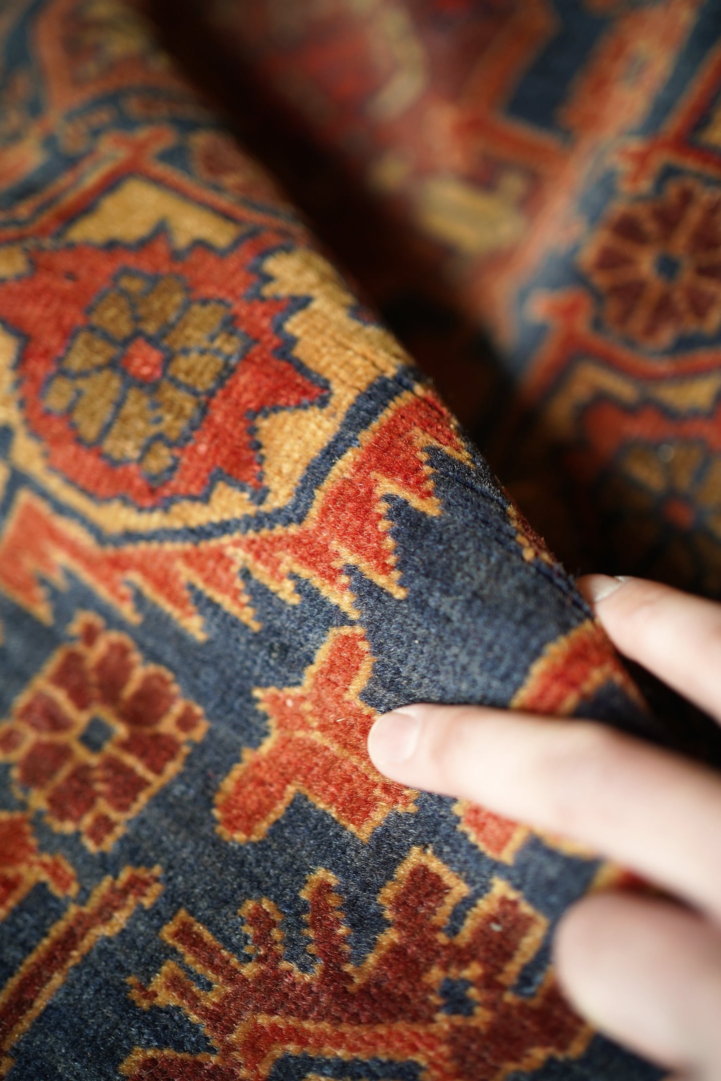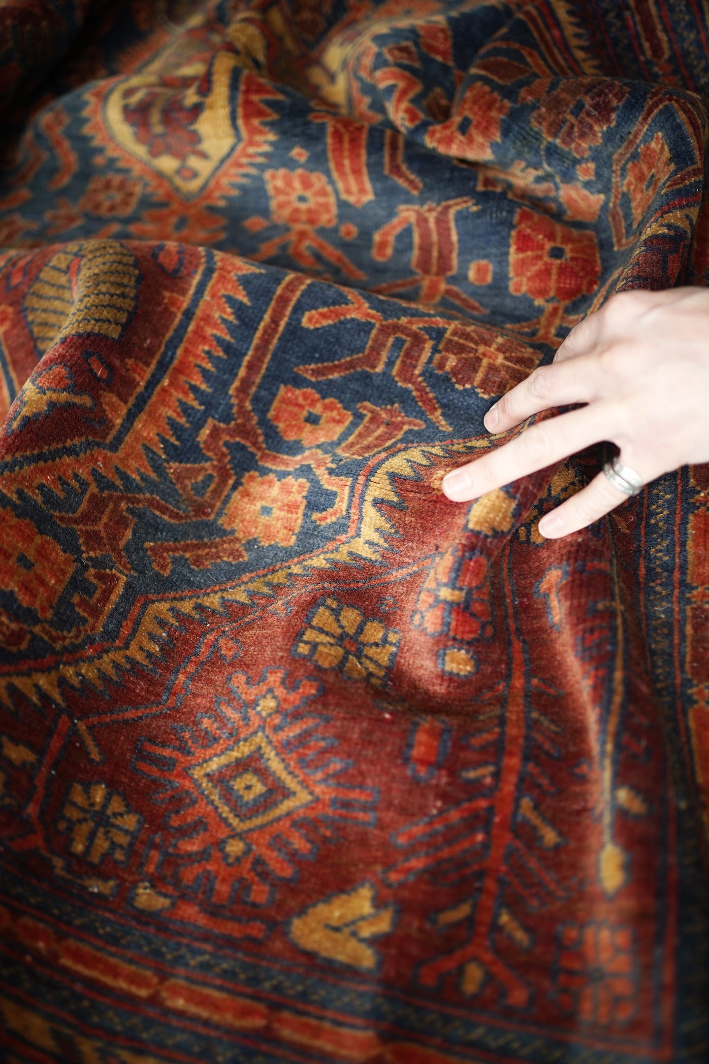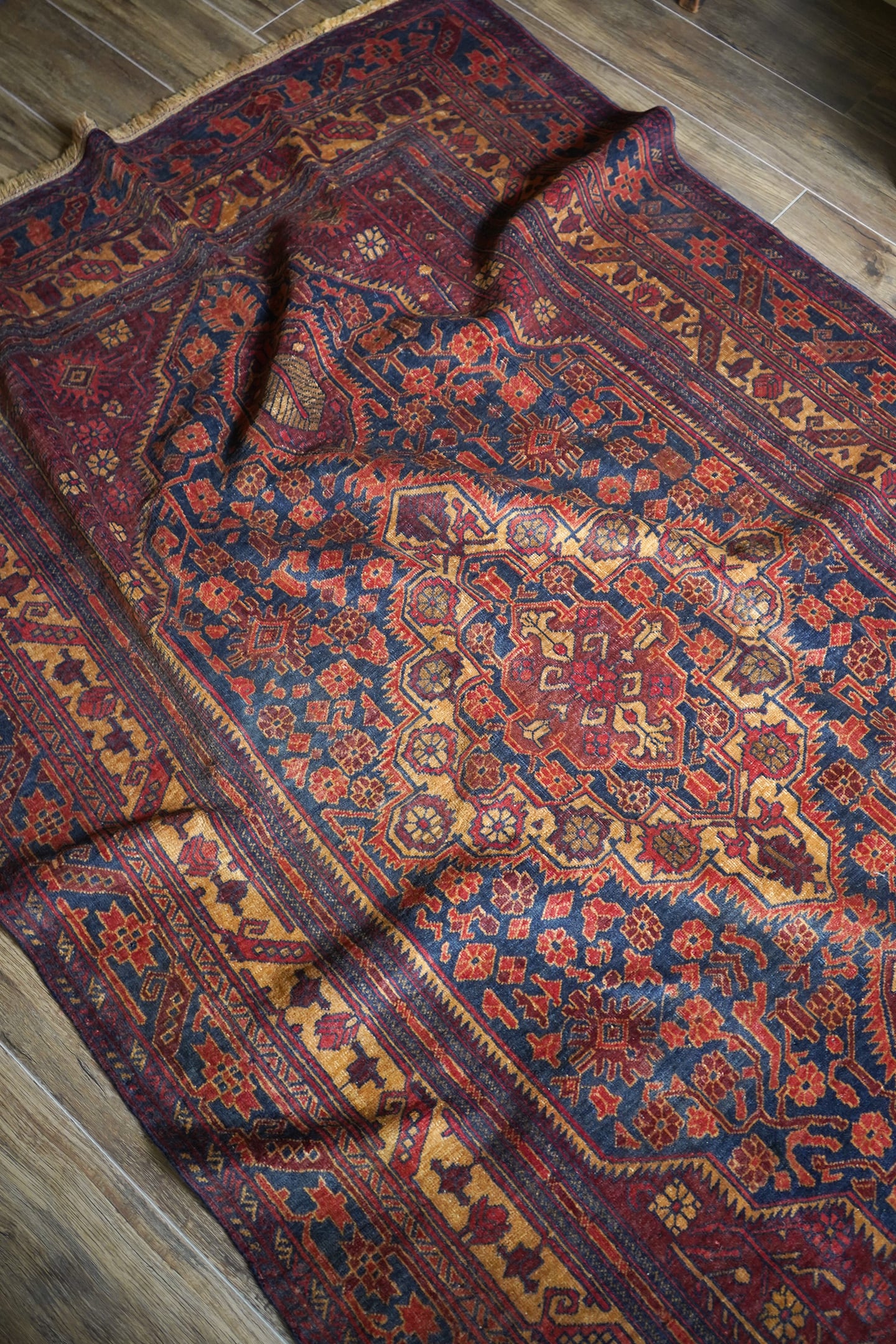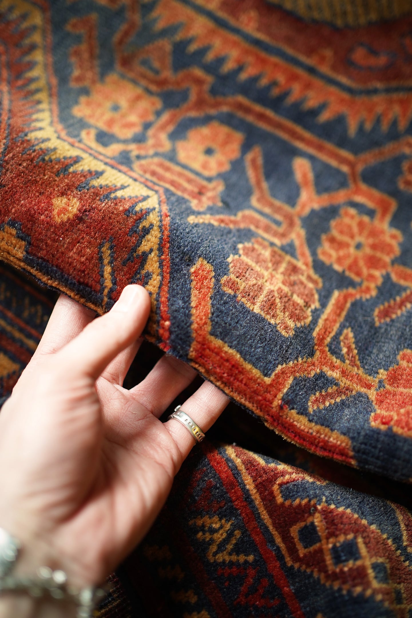 アフガニスタン北西部のカラエナウで織られた経年40年ほどのヴィンテージラグ。真ん中に大きなメダリオンを配した存在感のあるデザインでありながら、全体的にバランスの取れた落ち着いた色味なので、ご家庭にも取り入れやすく馴染みやすいラグかと思います。配色はネイビー、赤茶、朱色、キャメルなど。パイルにうっすらと艶もあり、一段とラグの美しさを感じさせます。パイルは低めですが、表面はサラッとしつつも、しっとり滑らかな毛並みを感じられる気持ちの良い肌触り。厚みは5mm程度です。また、裏面はコシのある質感で重量感もあるため、上を歩いてもズレる心配はありません。コンディションは言うことなしのパーフェクト。リビングのソファ前やダイニングテーブル下にも良さそうです。