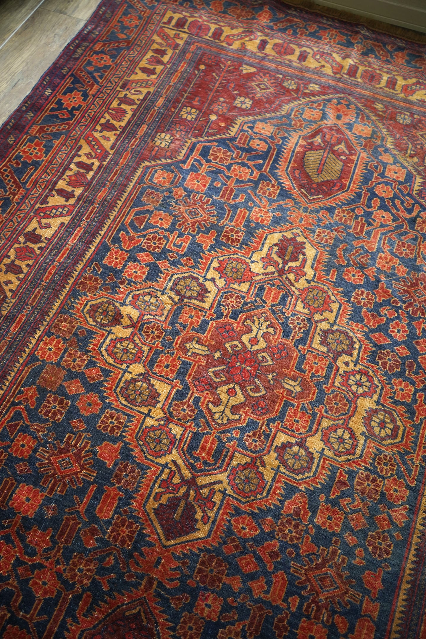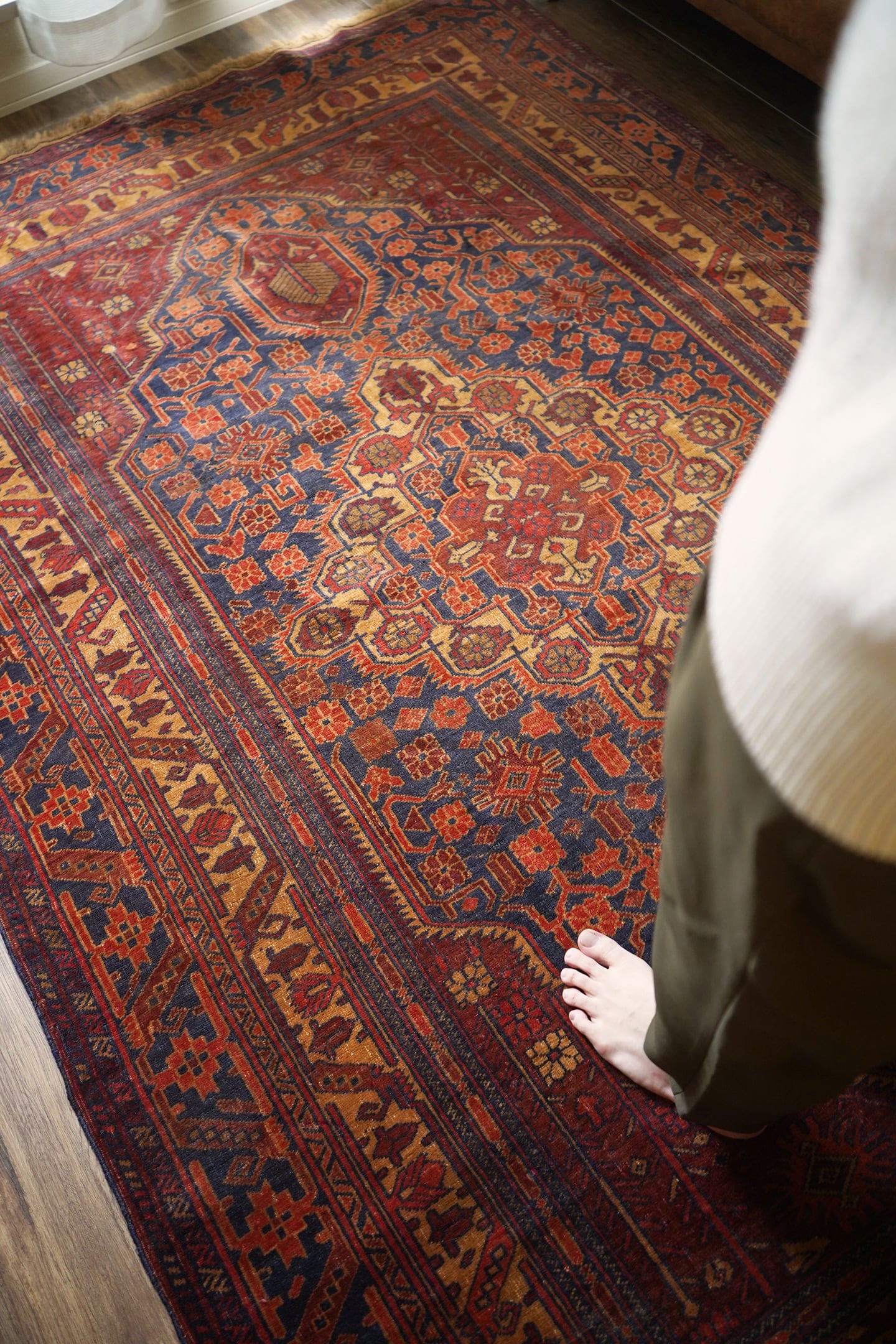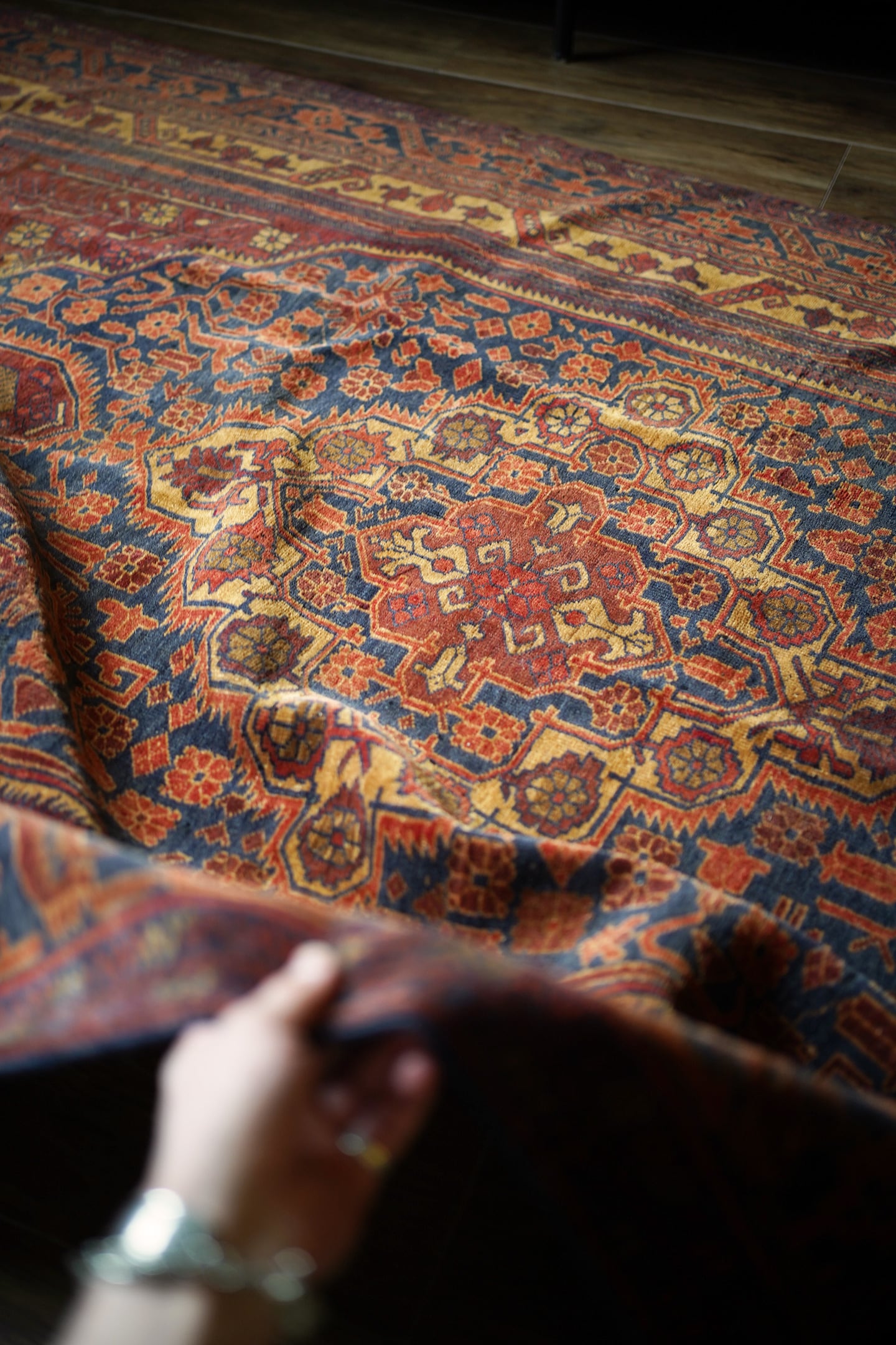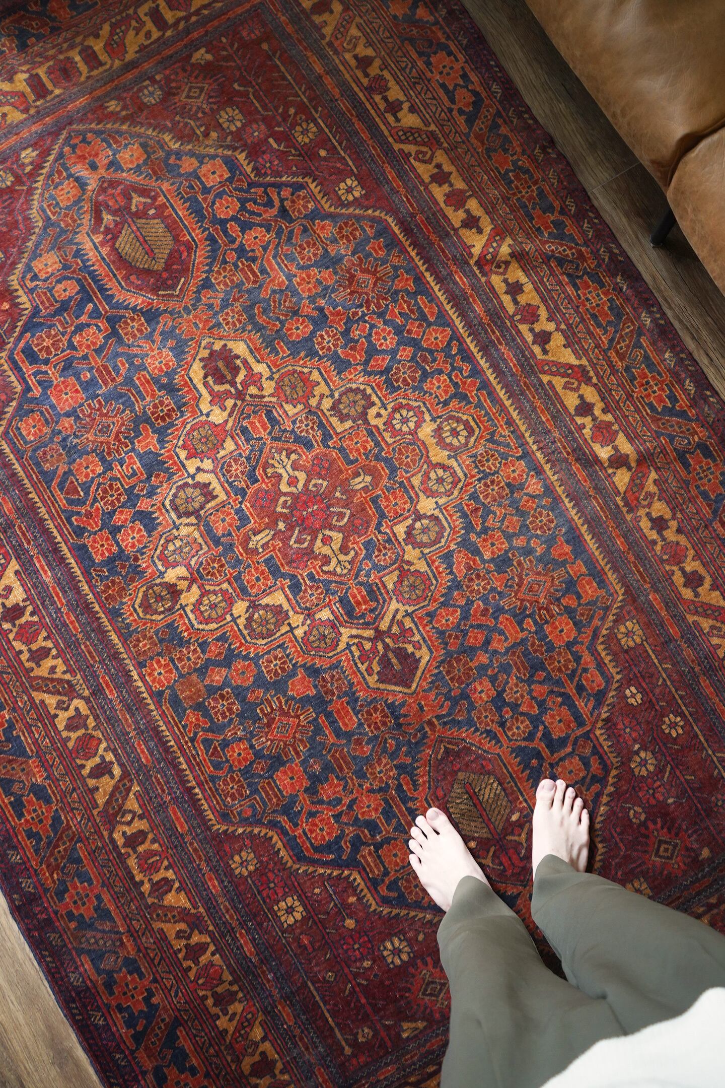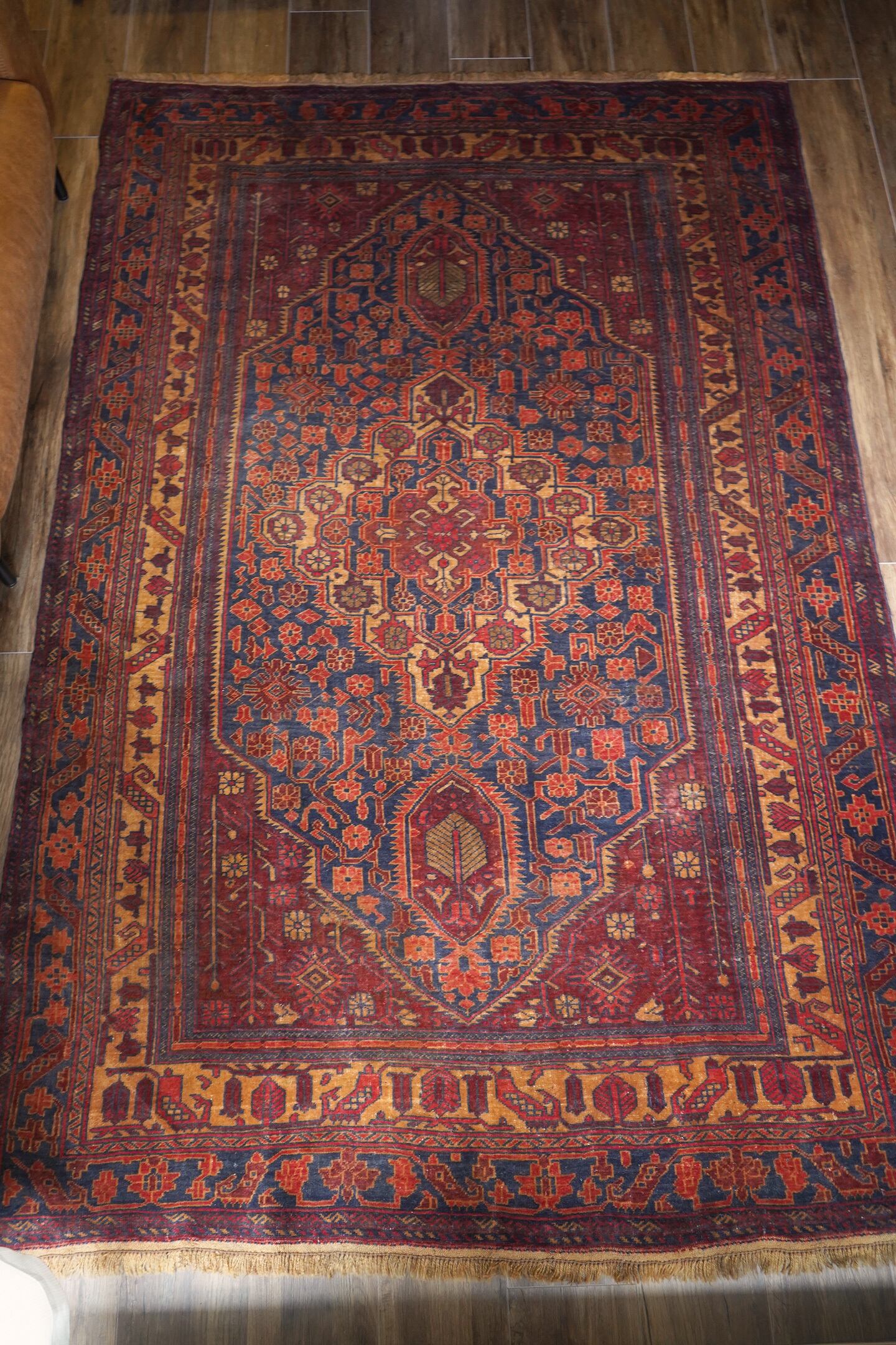 アフガニスタン北西部のカラエナウで織られた経年40年ほどのヴィンテージラグ。真ん中に大きなメダリオンを配した存在感のあるデザインでありながら、全体的にバランスの取れた落ち着いた色味なので、ご家庭にも取り入れやすく馴染みやすいラグかと思います。配色はネイビー、赤茶、朱色、キャメルなど。パイルにうっすらと艶もあり、一段とラグの美しさを感じさせます。パイルは低めですが、表面はサラッとしつつも、しっとり滑らかな毛並みを感じられる気持ちの良い肌触り。厚みは5mm程度です。また、裏面はコシのある質感で重量感もあるため、上を歩いてもズレる心配はありません。コンディションは言うことなしのパーフェクト。リビングのソファ前やダイニングテーブル下にも良さそうです。