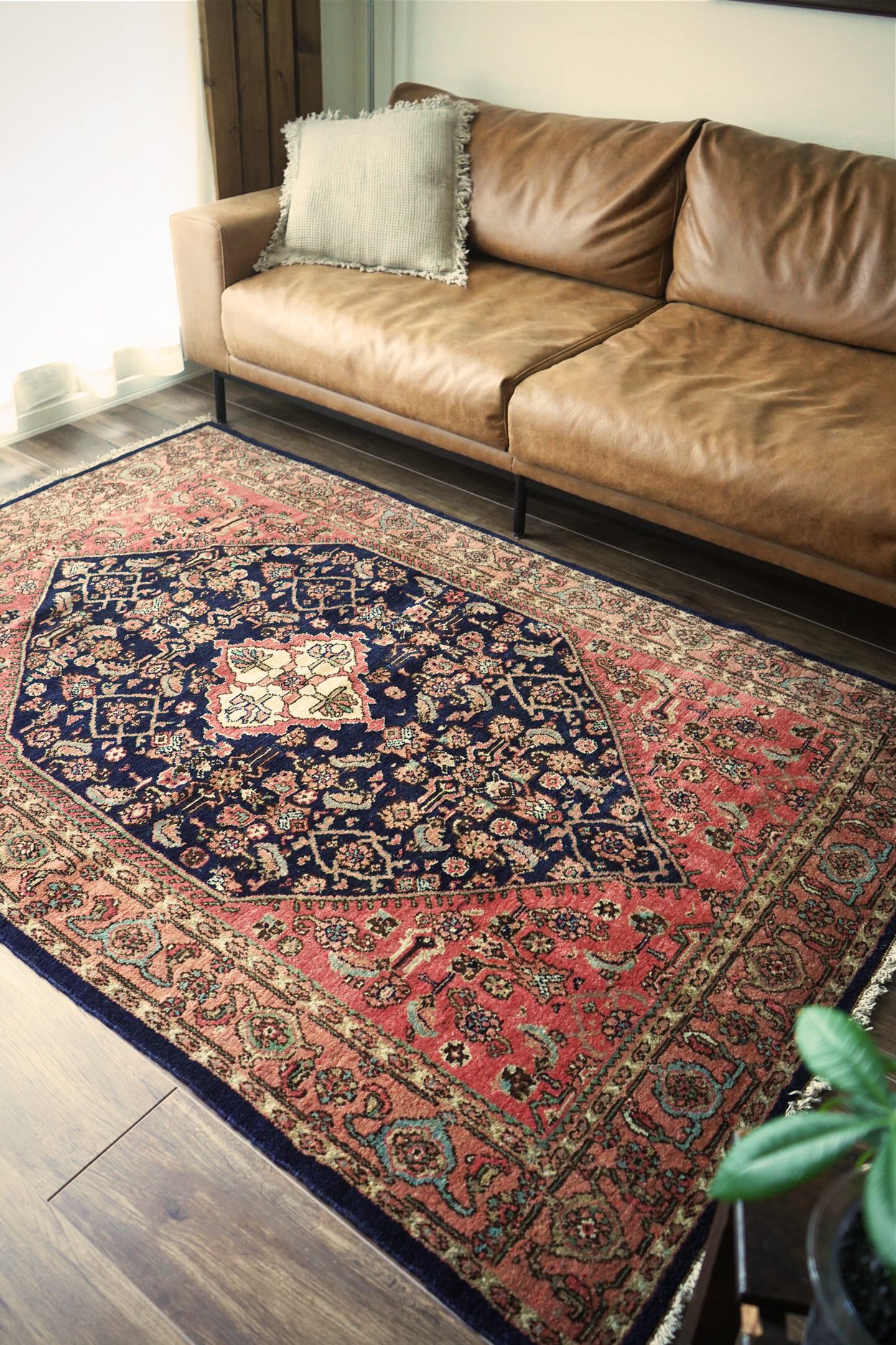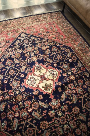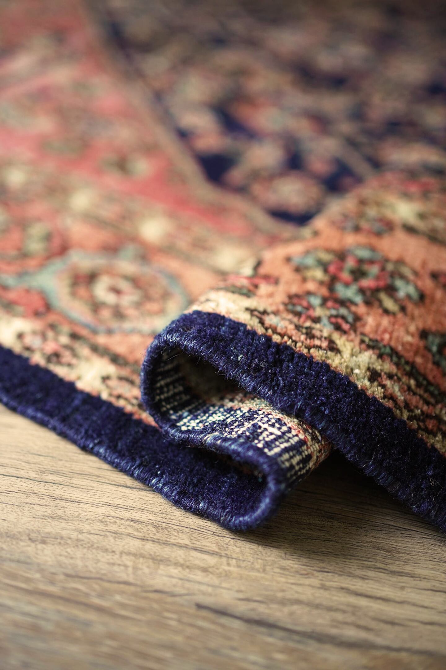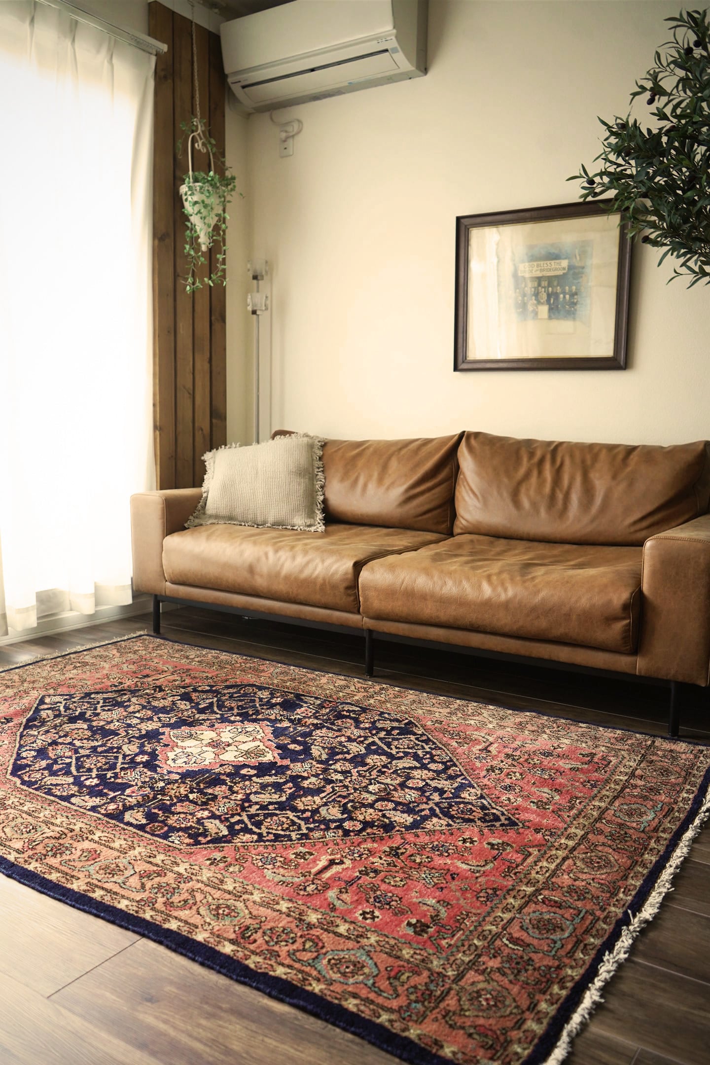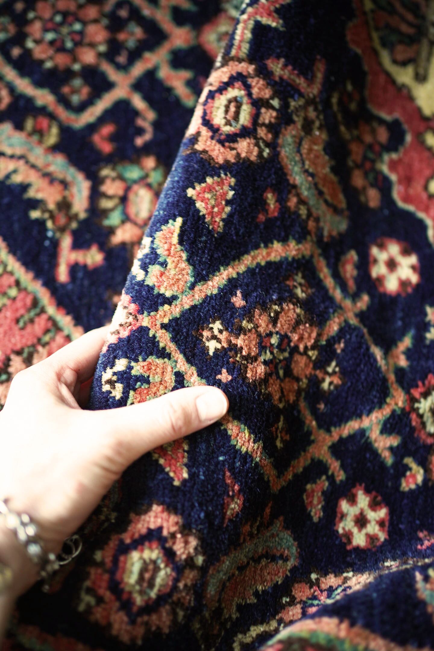 イラン西部地域に位置するマラーイェルで織られたヴィンテージラグ。"ヘラティ紋様"と呼ばれるアカンサス葉が菱形に組み合わさってできたモチーフが一面に織り込まれたデザインで、サーモンピンクと濃紺のメリハリのあるコントラストが非常に素敵な一枚。表面の毛並みはふわっと柔らかく、素足で乗ると非常に気持ち良い質感です。厚みは6mm〜7mmほど。コンディションは言うことなしのパーフェクト。リビングのソファ前などの寛げるスペースにオススメです。