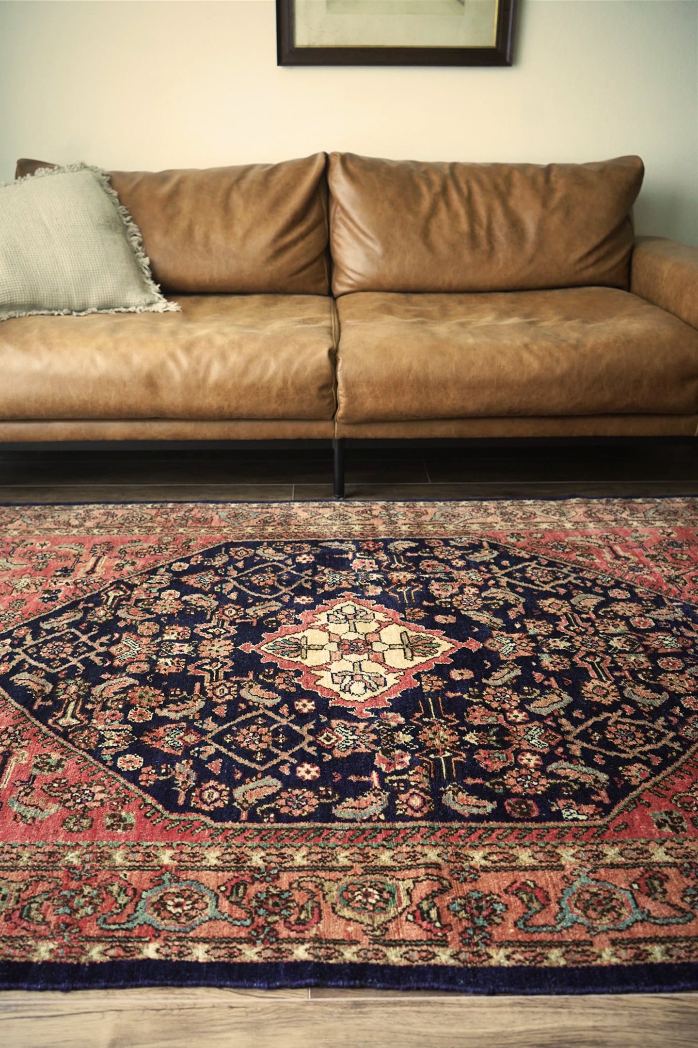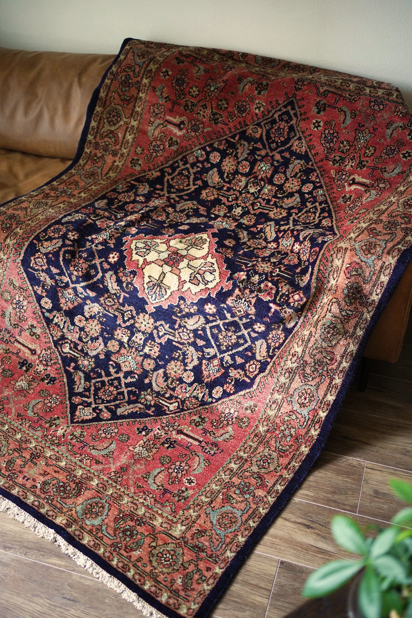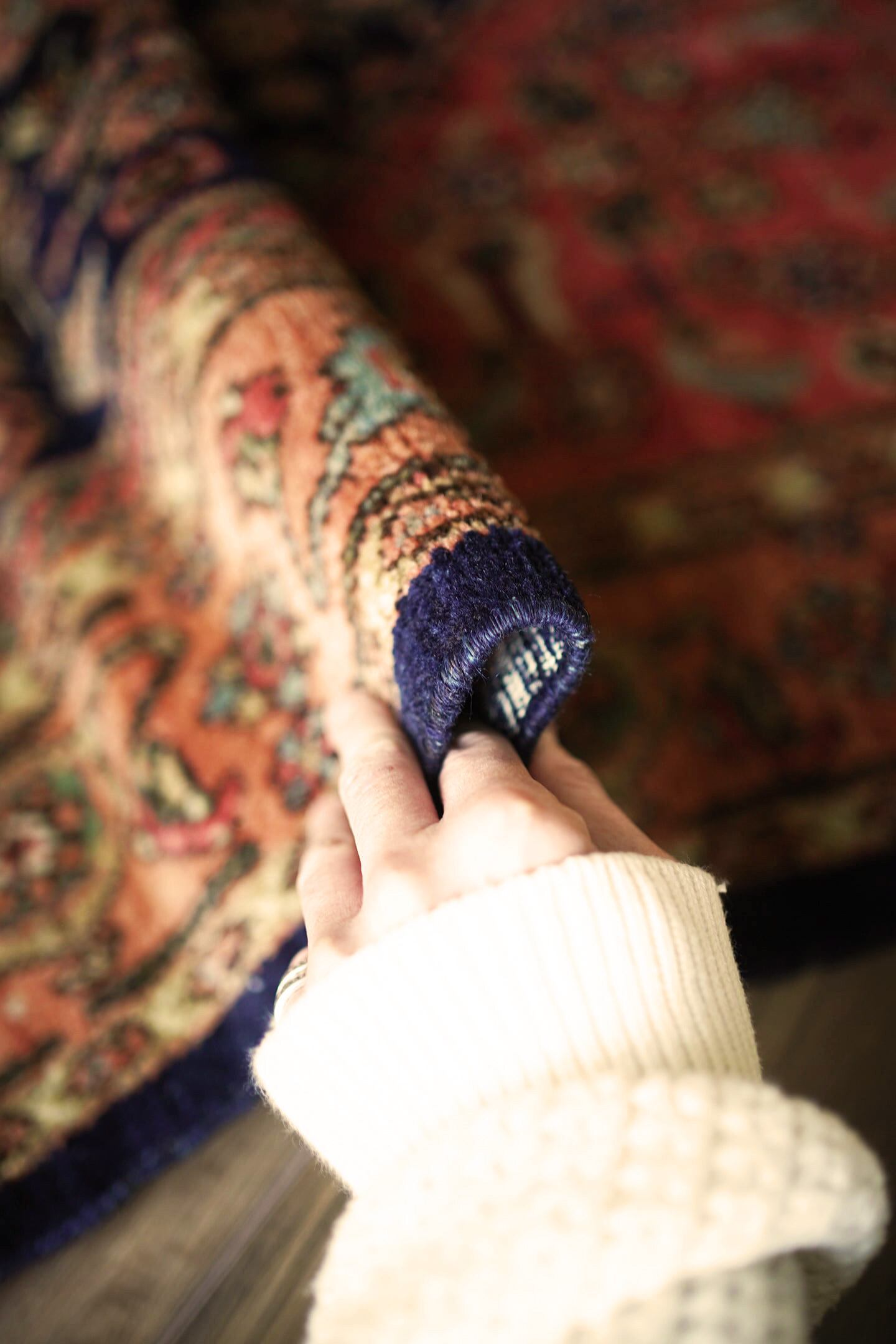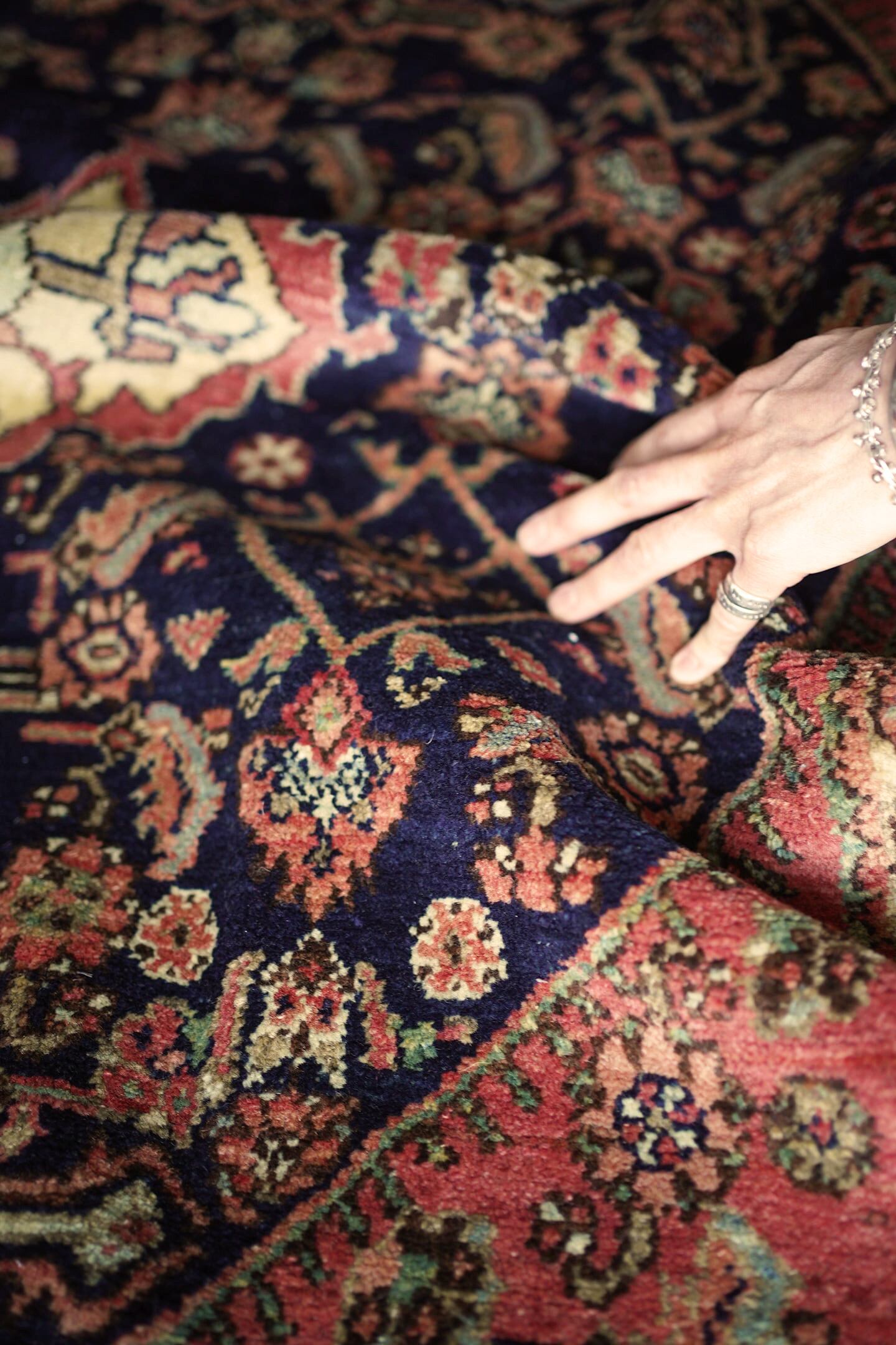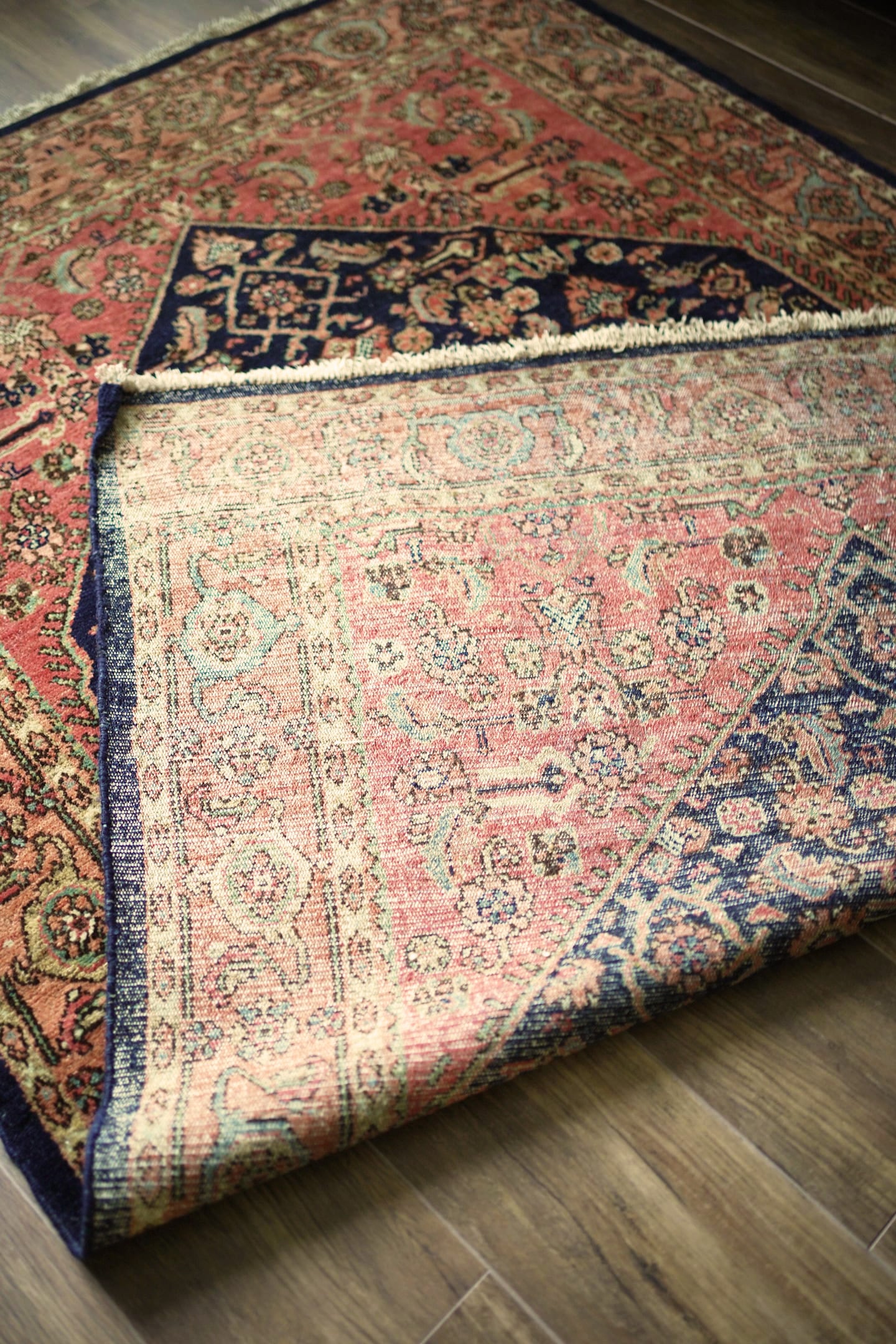 イラン西部地域に位置するマラーイェルで織られたヴィンテージラグ。"ヘラティ紋様"と呼ばれるアカンサス葉が菱形に組み合わさってできたモチーフが一面に織り込まれたデザインで、サーモンピンクと濃紺のメリハリのあるコントラストが非常に素敵な一枚。表面の毛並みはふわっと柔らかく、素足で乗ると非常に気持ち良い質感です。厚みは6mm〜7mmほど。コンディションは言うことなしのパーフェクト。リビングのソファ前などの寛げるスペースにオススメです。