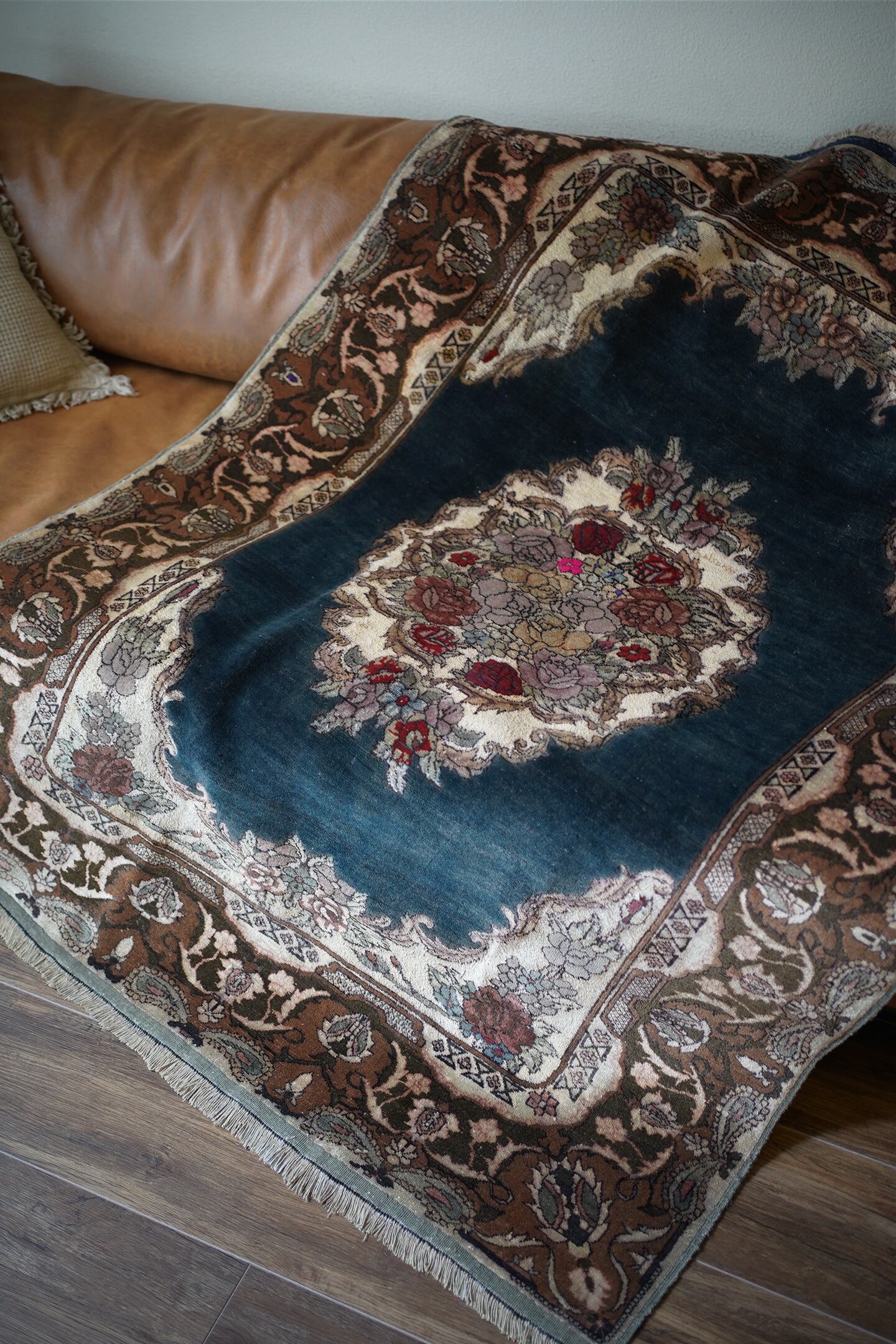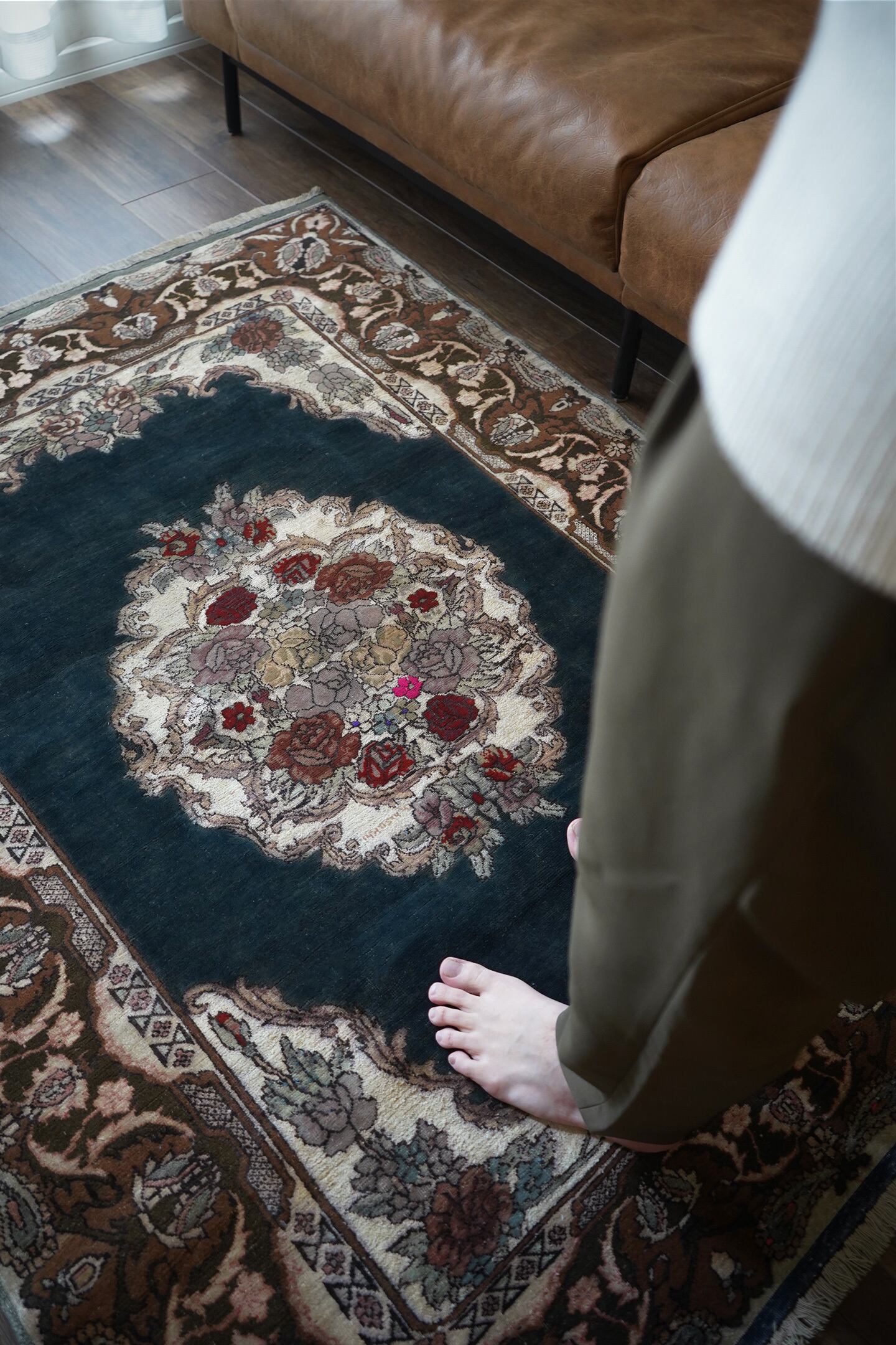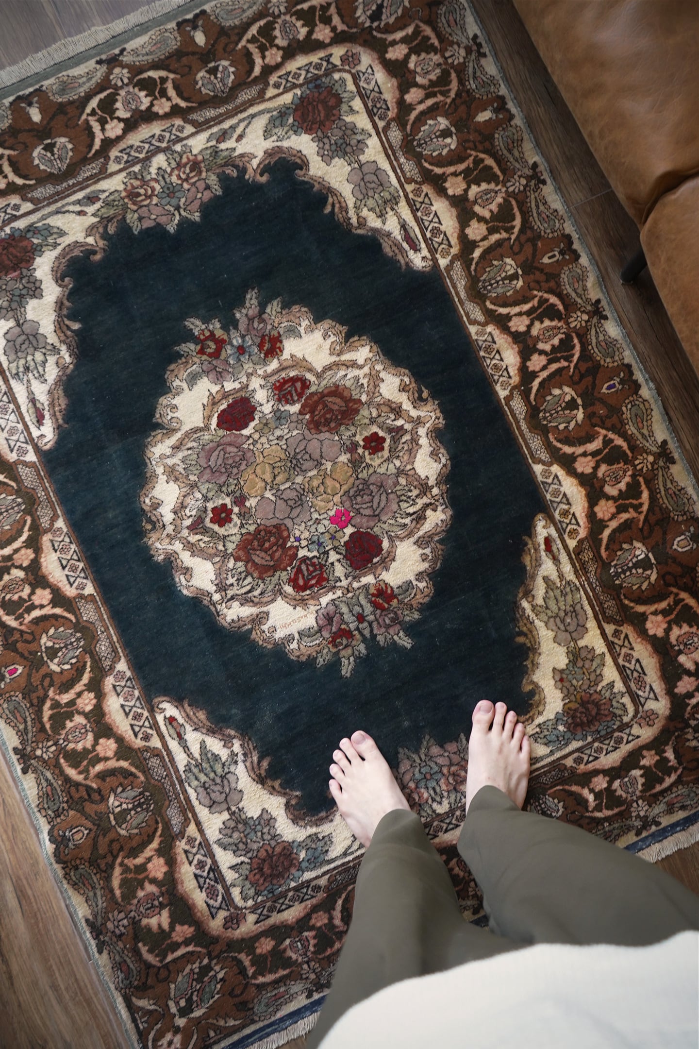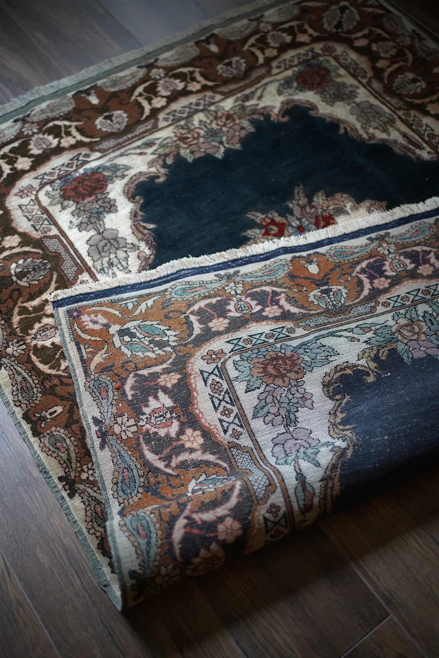 約40年〜50年前にアフガニスタンの首都カブールでクチ族によって織られたヴィンテージラグです。まるで絵画のような芸術的なタッチで織り込まれた花モチーフのデザインとセンスのある色使いに、一目見た瞬間に心奪われました。一部、蛍光色でピンクや紫色の化繊の素材が使われている箇所があり、その点も非常にユニークです。また中央近辺には織り手のサインが織り込まれているのも店主個人的に好きなポイント。中央は深いネイビーブルーの非常に魅力的な色合いをしており、その他オフホワイトやブラウン、グレーなどが使われた配色です。こちらのラグはベースはウールで、多くの部分でシルクの糸が使われています。表面はシルク特有のしっとりしつつ、サラッと滑らかな上質な肌触りで、厚みは4mm〜5mm程度です。目立ったダメージや補修跡もなく、良好なコンディション。店主のコレクションにしたいほど大好きな一枚です。あなたの宝物になりましたら嬉しく思います。
