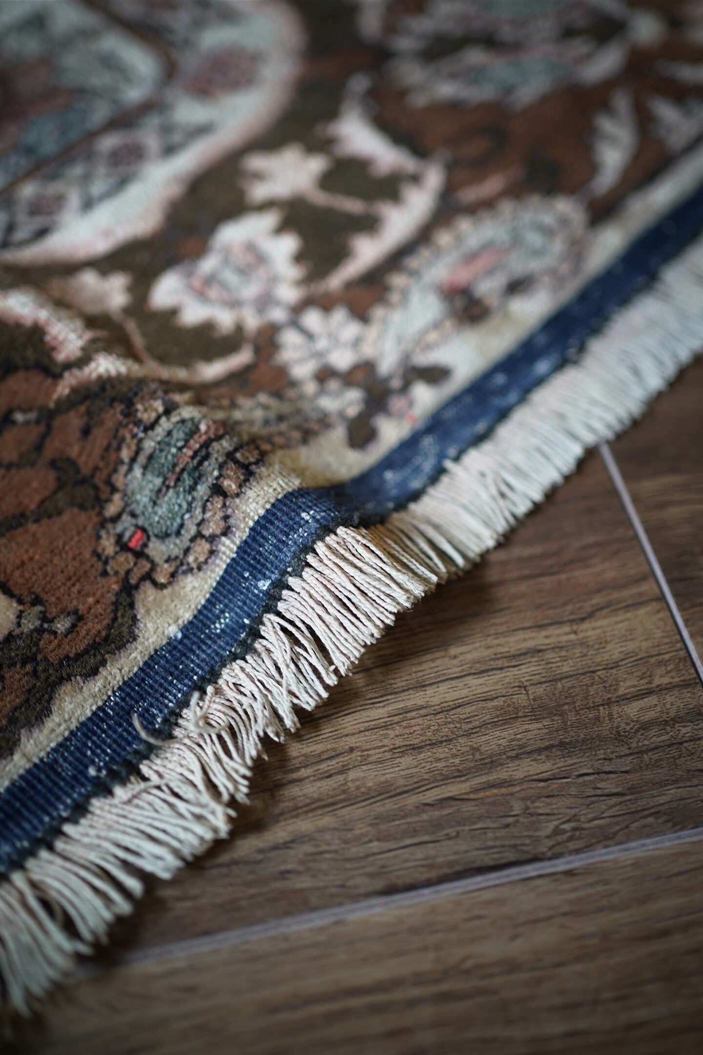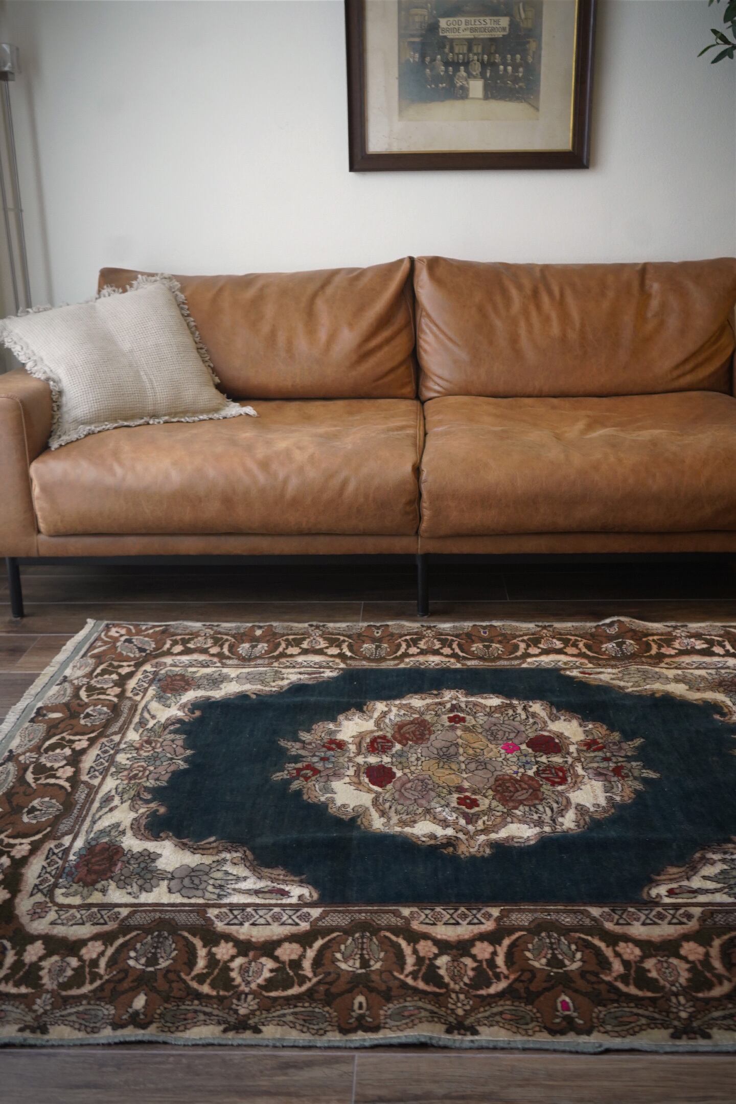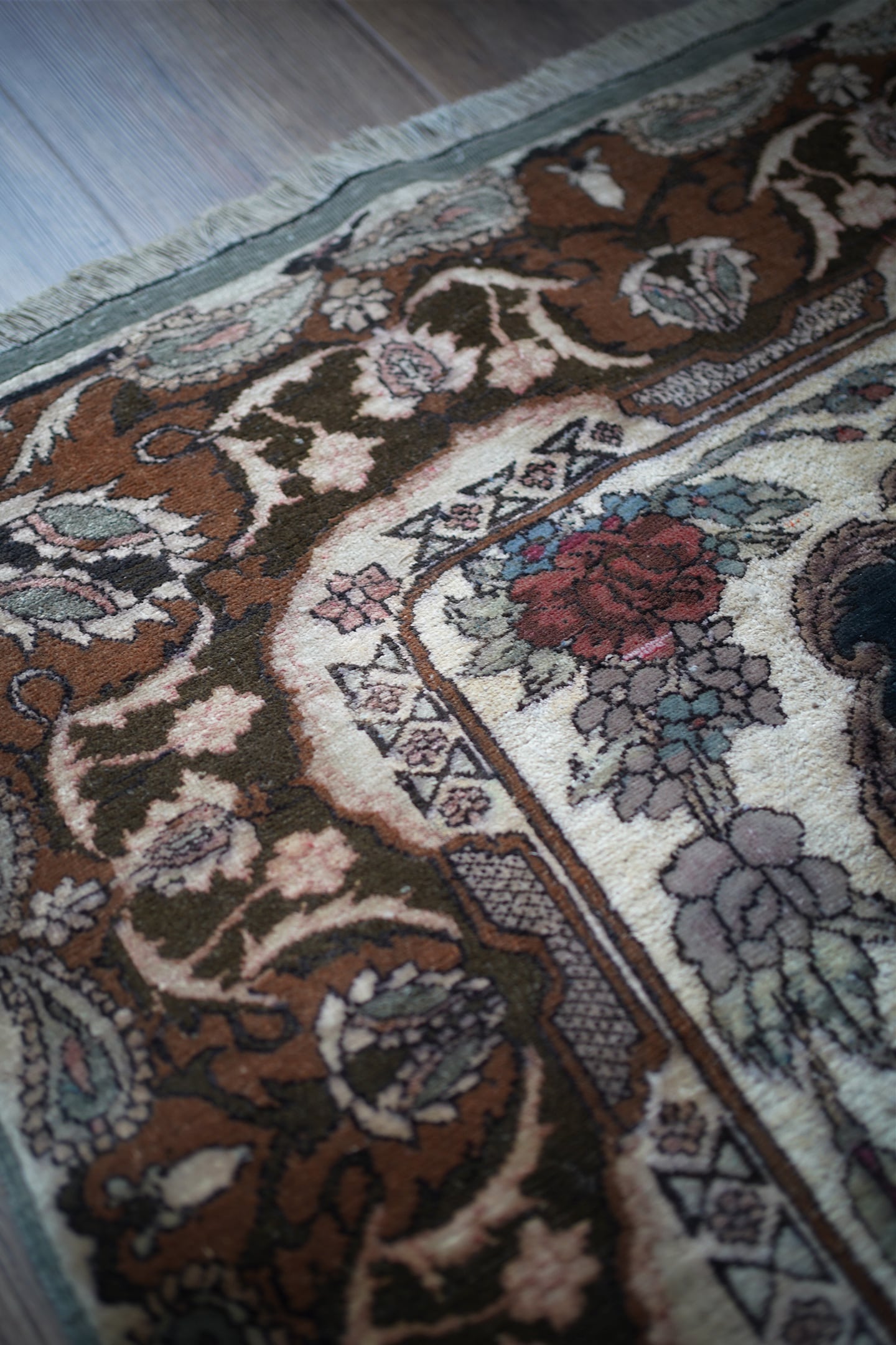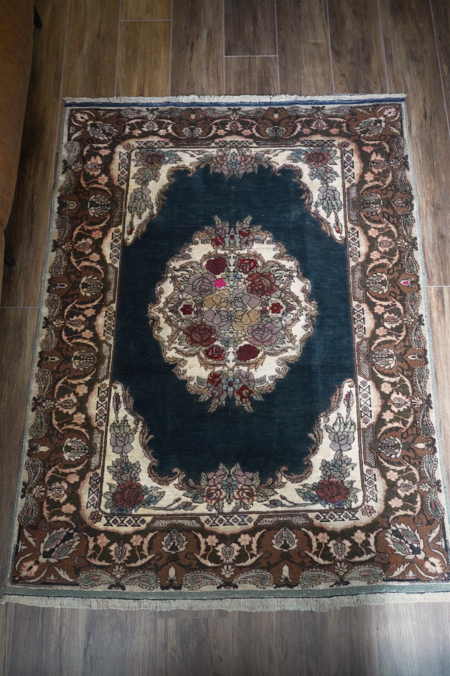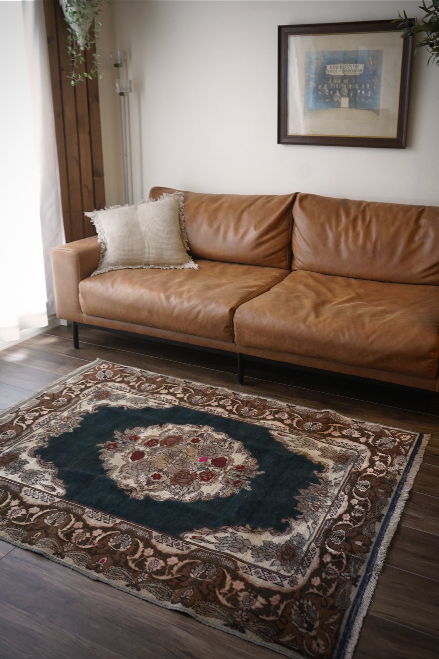 約40年〜50年前にアフガニスタンの首都カブールでクチ族によって織られたヴィンテージラグです。まるで絵画のような芸術的なタッチで織り込まれた花モチーフのデザインとセンスのある色使いに、一目見た瞬間に心奪われました。一部、蛍光色でピンクや紫色の化繊の素材が使われている箇所があり、その点も非常にユニークです。また中央近辺には織り手のサインが織り込まれているのも店主個人的に好きなポイント。中央は深いネイビーブルーの非常に魅力的な色合いをしており、その他オフホワイトやブラウン、グレーなどが使われた配色です。こちらのラグはベースはウールで、多くの部分でシルクの糸が使われています。表面はシルク特有のしっとりしつつ、サラッと滑らかな上質な肌触りで、厚みは4mm〜5mm程度です。目立ったダメージや補修跡もなく、良好なコンディション。店主のコレクションにしたいほど大好きな一枚です。あなたの宝物になりましたら嬉しく思います。