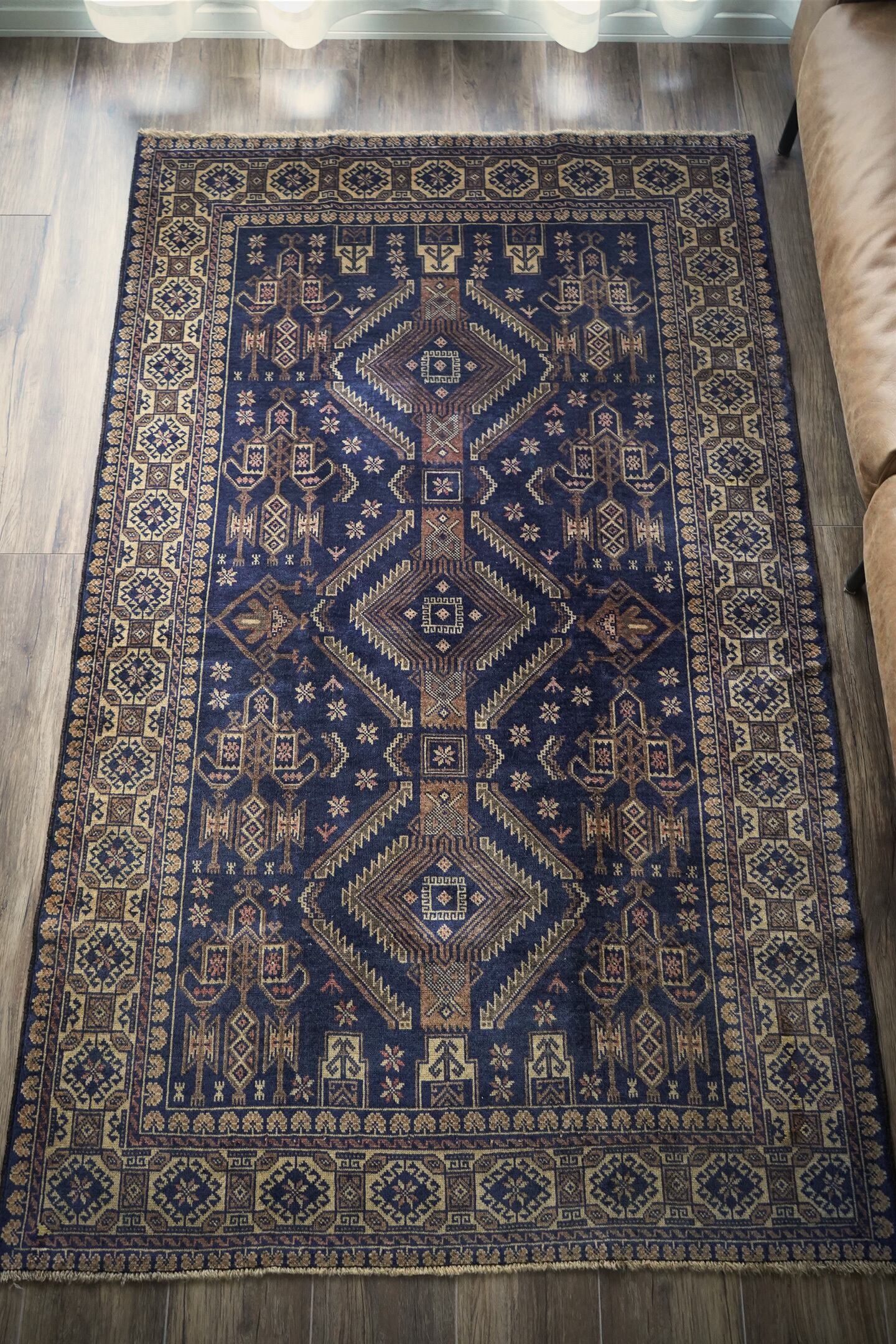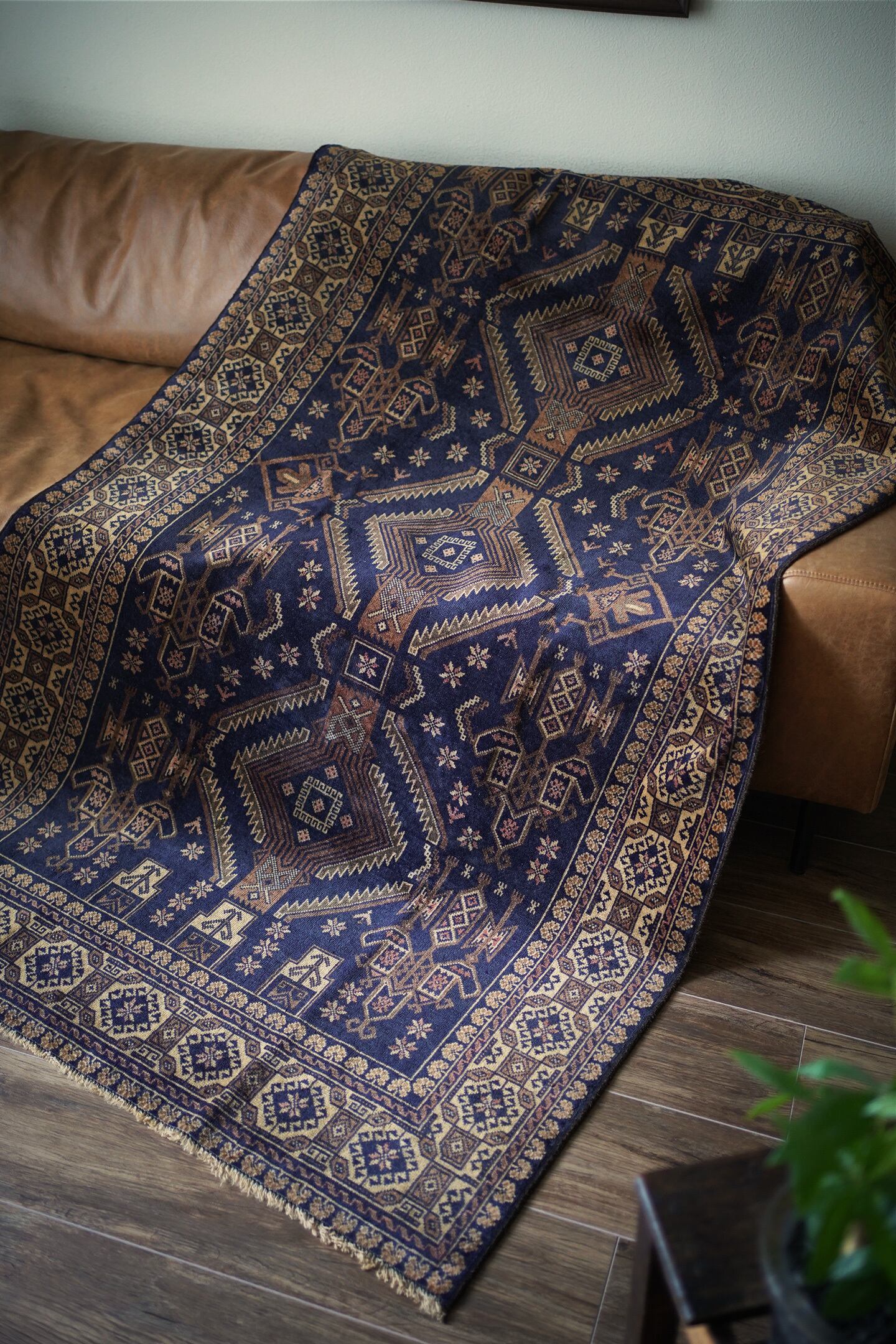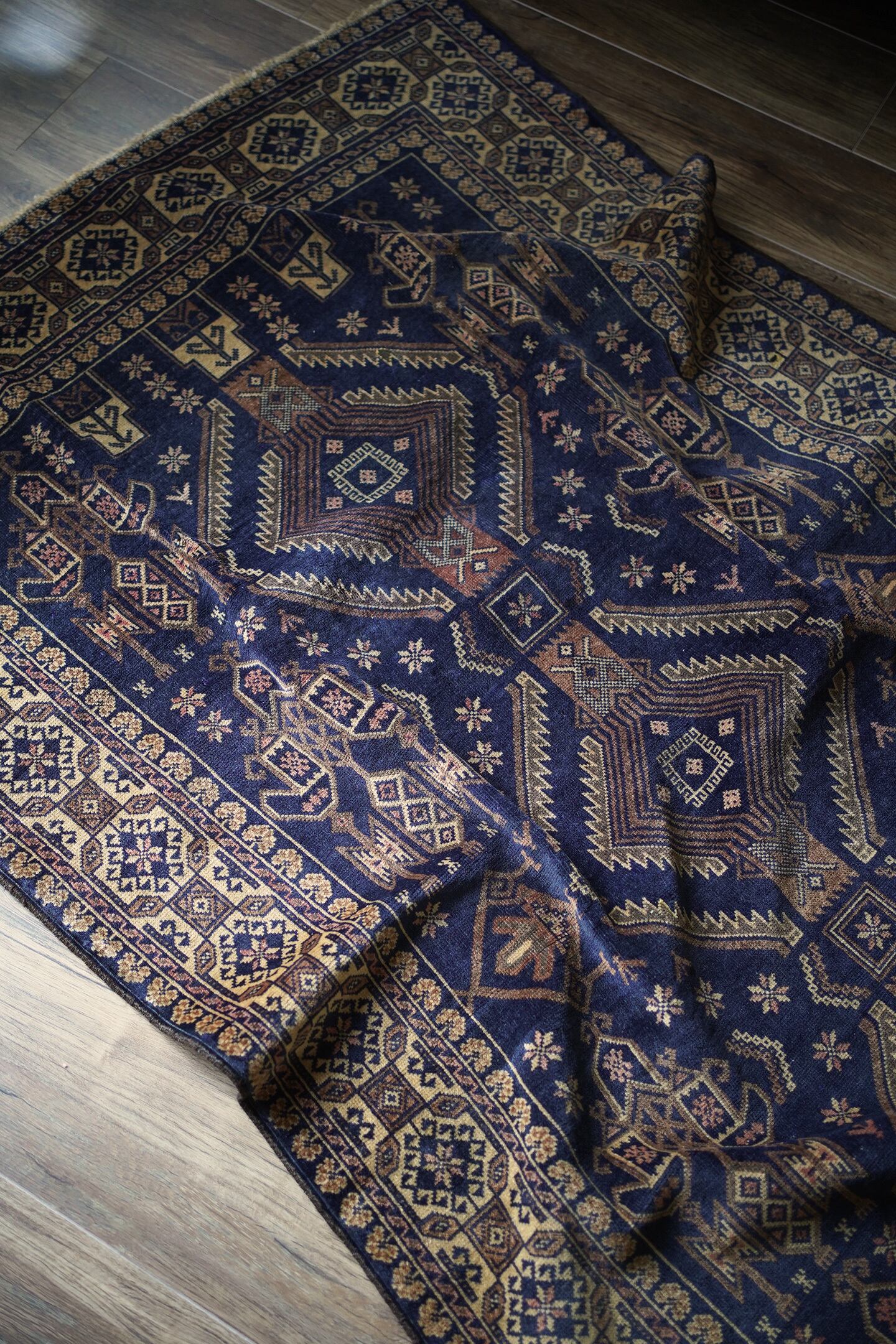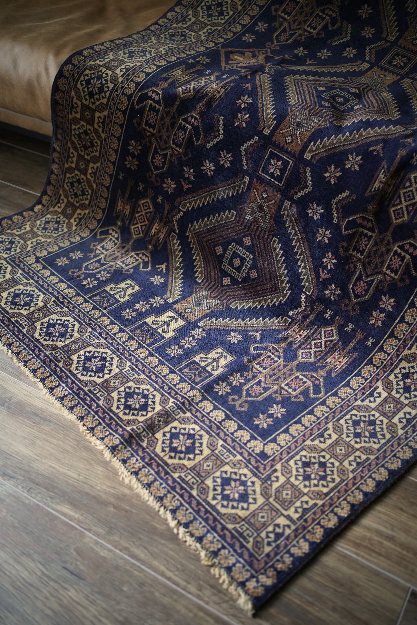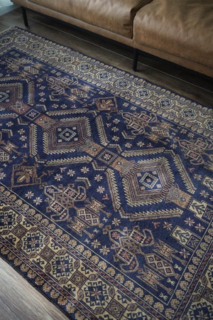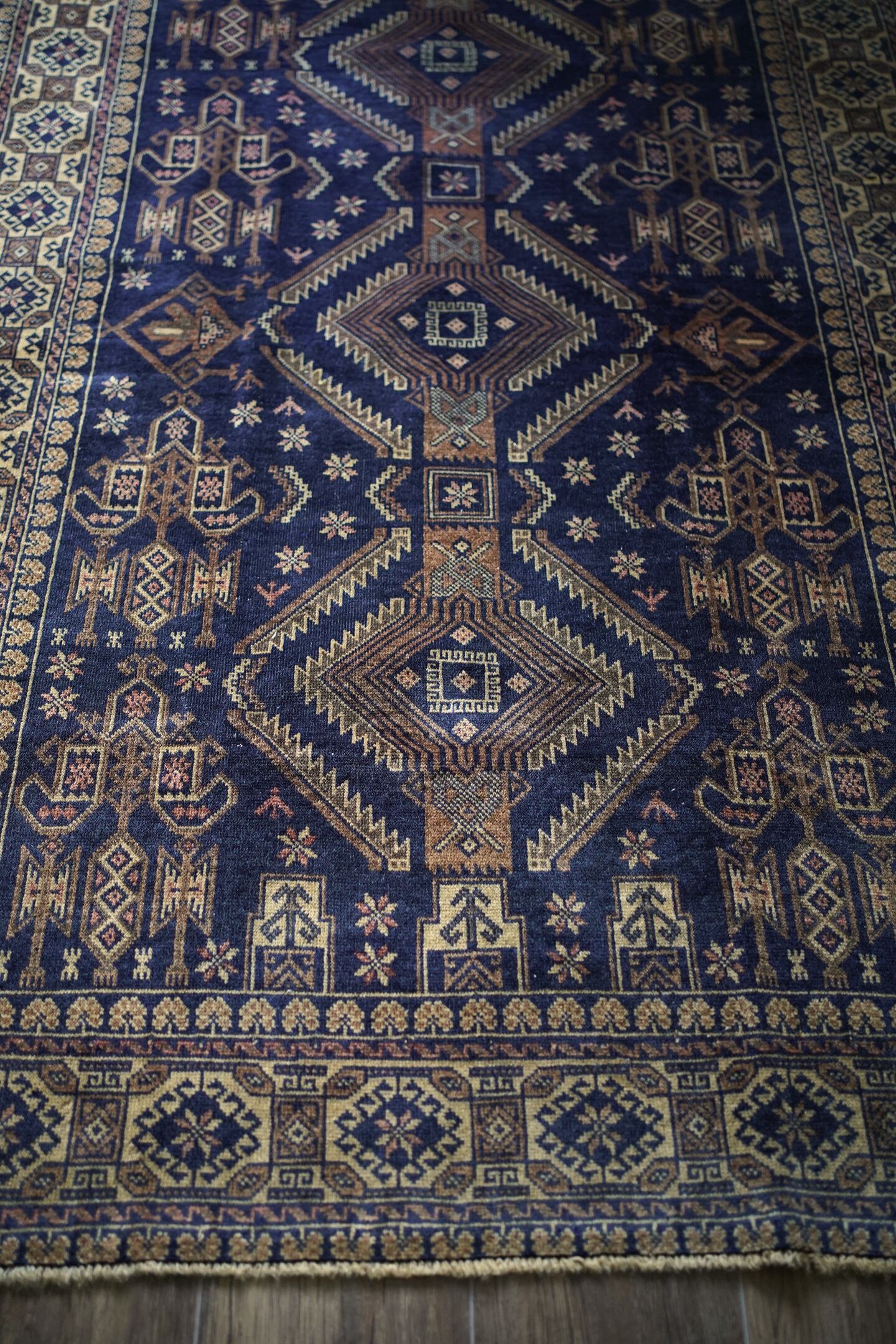 約60年前にバルーチ族によって織られたアフガニスタン産のヴィンテージラグ。色味のコントラストとバランスの取れた整ったデザインに一目惚れして仕入れを決めた一枚です。ネイビー、ブラウン、ベージュと癖のない配色で様々な木製家具とも相性が良く、お部屋のインテリアに取り入れやすいお色味。ボーダーに織り込まれた菱形を雄羊の角のような柄で囲われた紋様はドラゴンを表しているとも言われています。艶が素晴らしく、パイルに光が差し込むと美しい光沢を放ちます。表面はサラッとしっとり滑らかな肌触りで、毛並みは短いながらも、パイルの柔らかさを感じられる質感です。5mm程度の厚みで、統一感のある毛並みの長さが上質さを感じさせます。程よく重さもあるため、上を歩いてもズレる心配はなく、通年で快適にご使用いただける万能タイプです。目立ったダメージや補修跡もなく、良好なコンディション。ヴィンテージを感じさせる色合いと艶を持ち合わせた素晴らしいラグです。