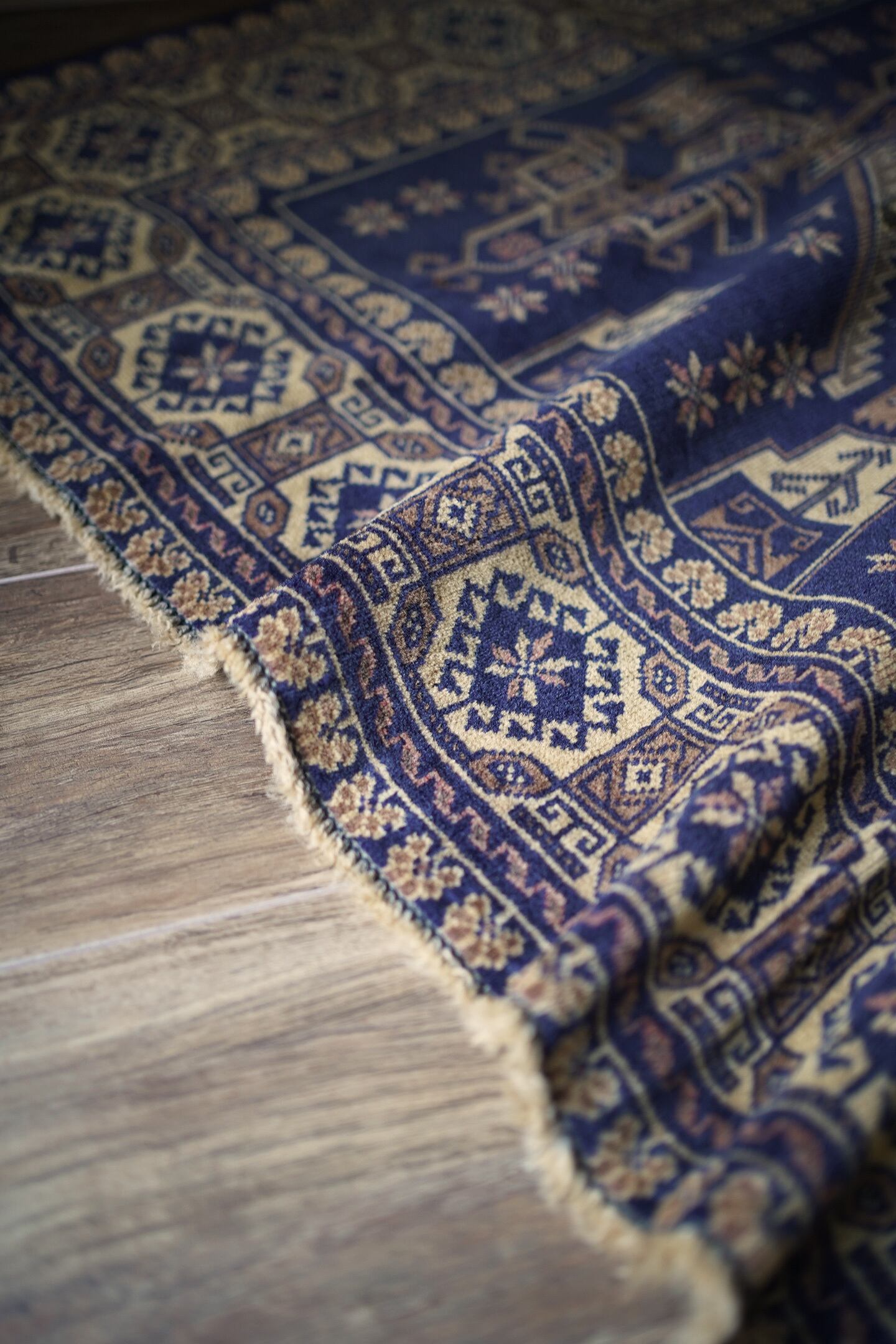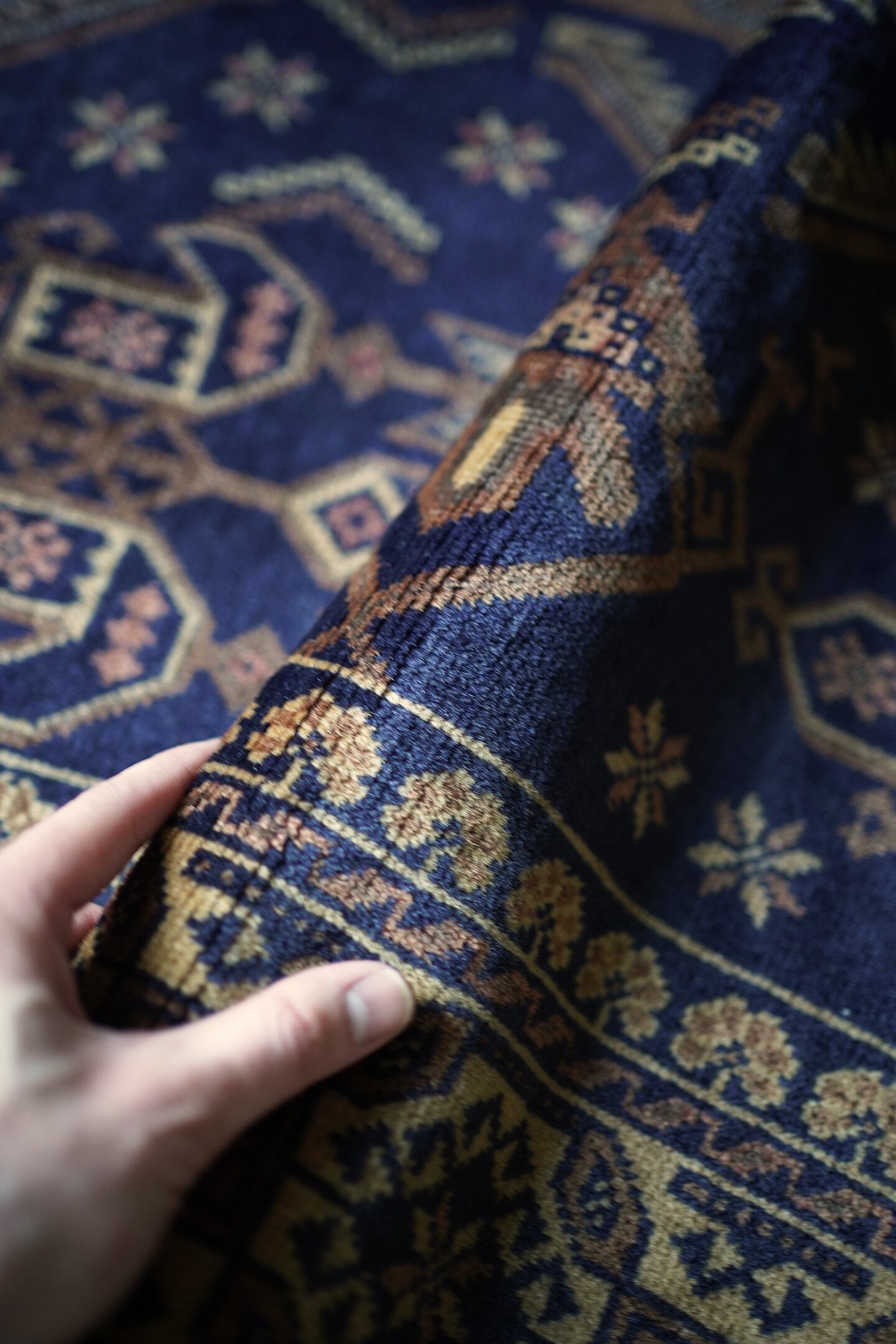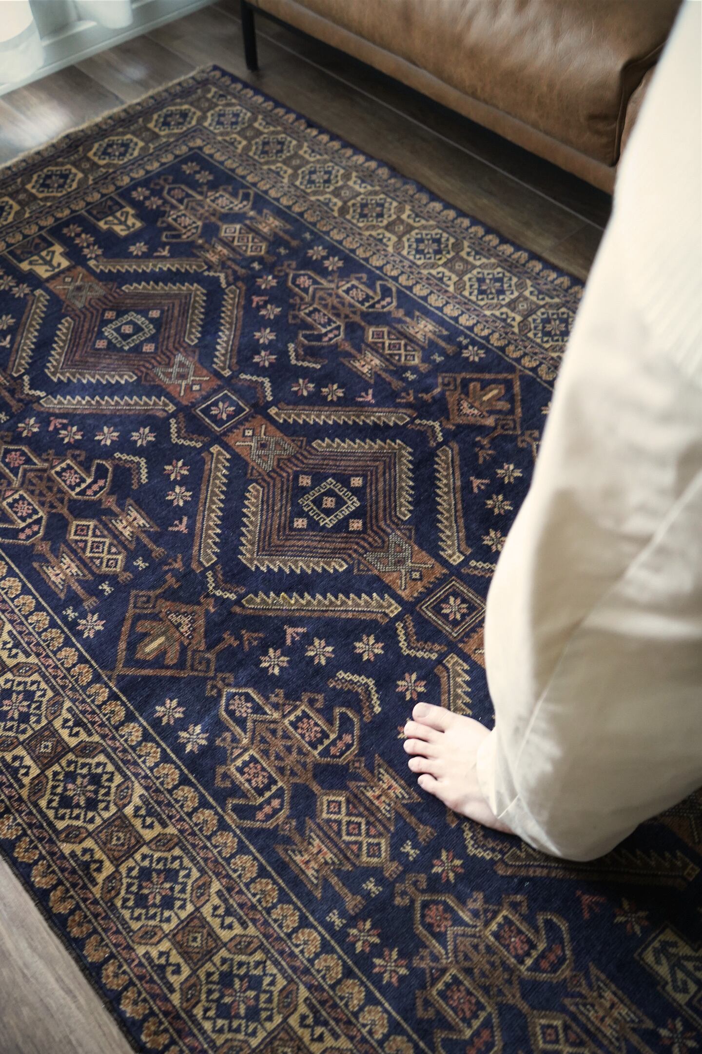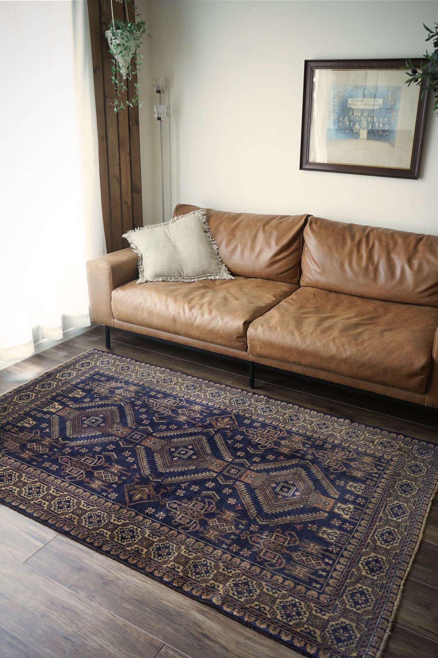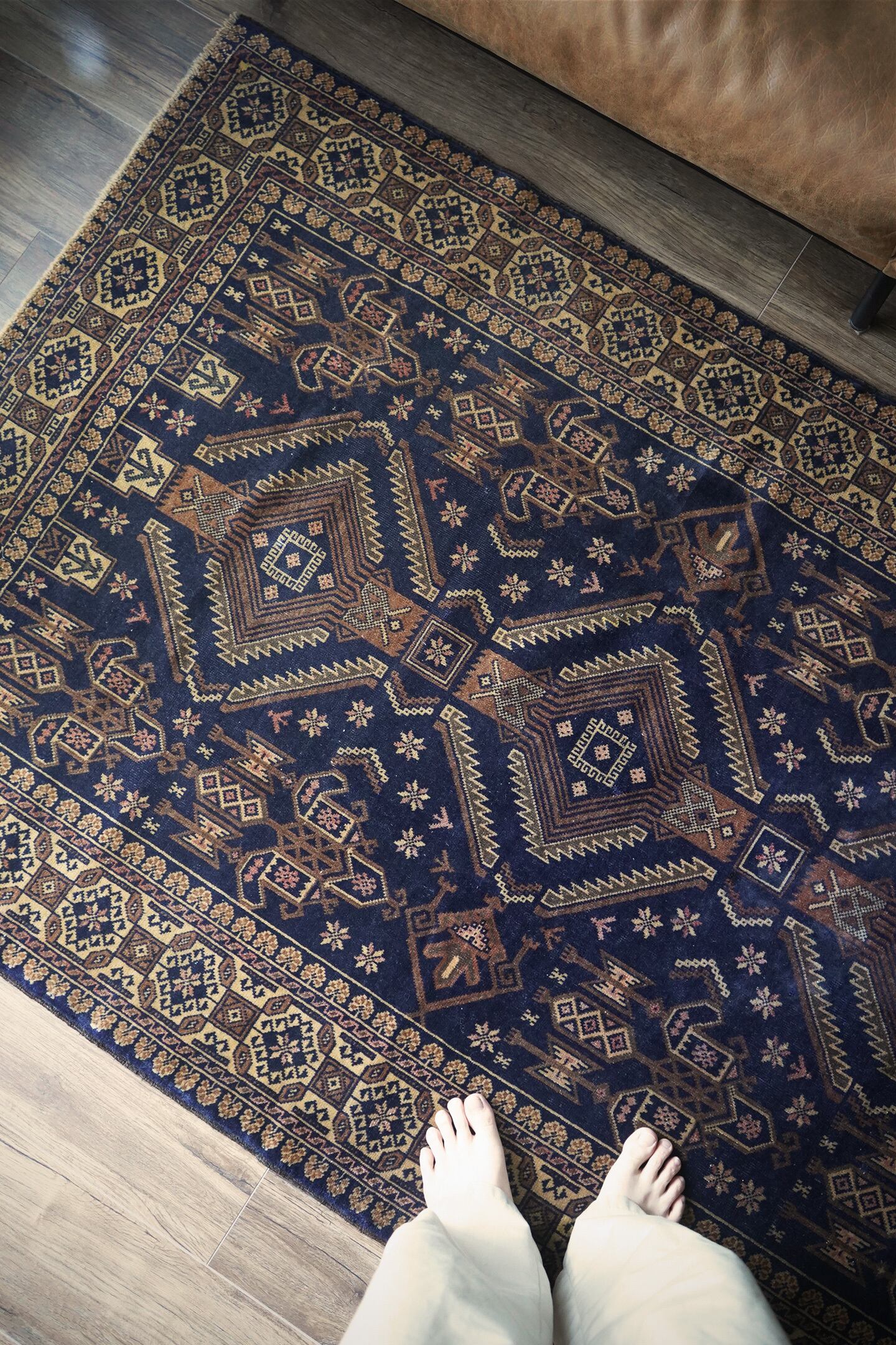 約60年前にバルーチ族によって織られたアフガニスタン産のヴィンテージラグ。色味のコントラストとバランスの取れた整ったデザインに一目惚れして仕入れを決めた一枚です。ネイビー、ブラウン、ベージュと癖のない配色で様々な木製家具とも相性が良く、お部屋のインテリアに取り入れやすいお色味。ボーダーに織り込まれた菱形を雄羊の角のような柄で囲われた紋様はドラゴンを表しているとも言われています。艶が素晴らしく、パイルに光が差し込むと美しい光沢を放ちます。表面はサラッとしっとり滑らかな肌触りで、毛並みは短いながらも、パイルの柔らかさを感じられる質感です。5mm程度の厚みで、統一感のある毛並みの長さが上質さを感じさせます。程よく重さもあるため、上を歩いてもズレる心配はなく、通年で快適にご使用いただける万能タイプです。目立ったダメージや補修跡もなく、良好なコンディション。ヴィンテージを感じさせる色合いと艶を持ち合わせた素晴らしいラグです。