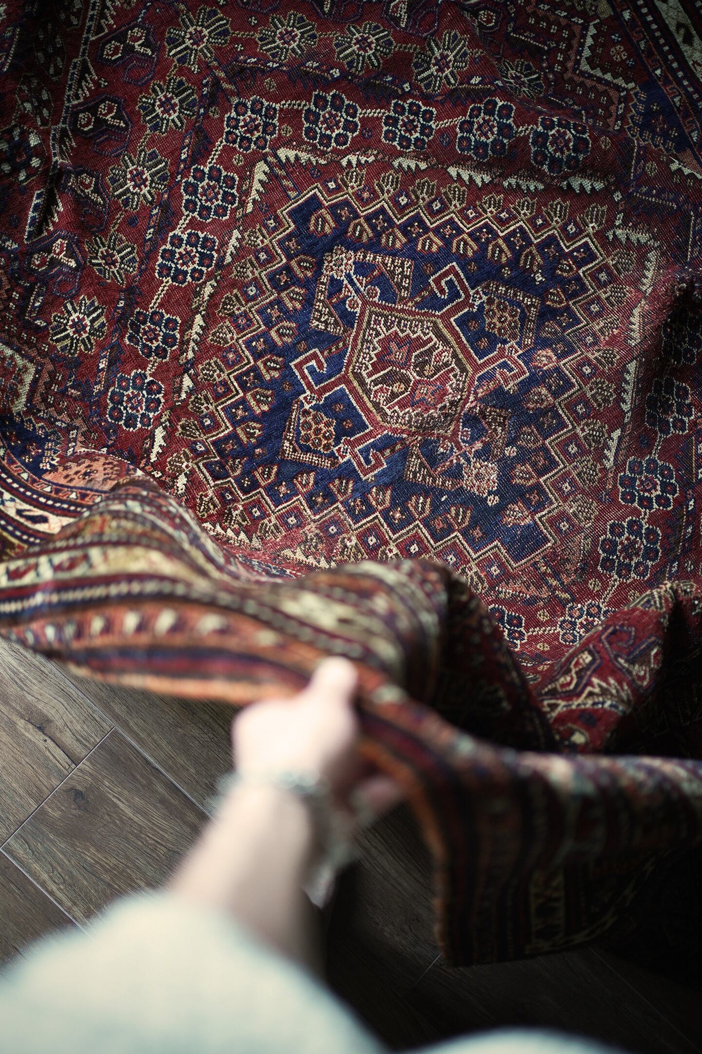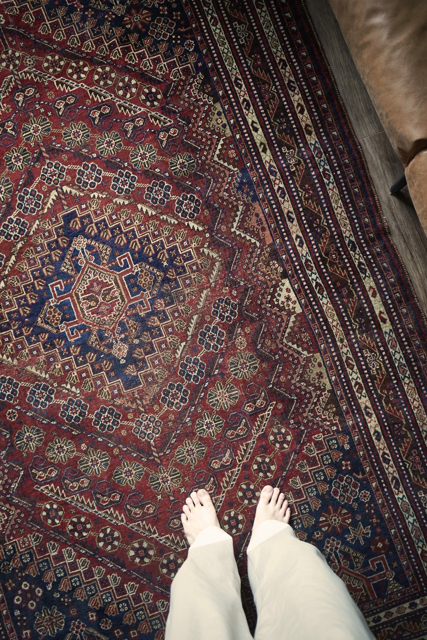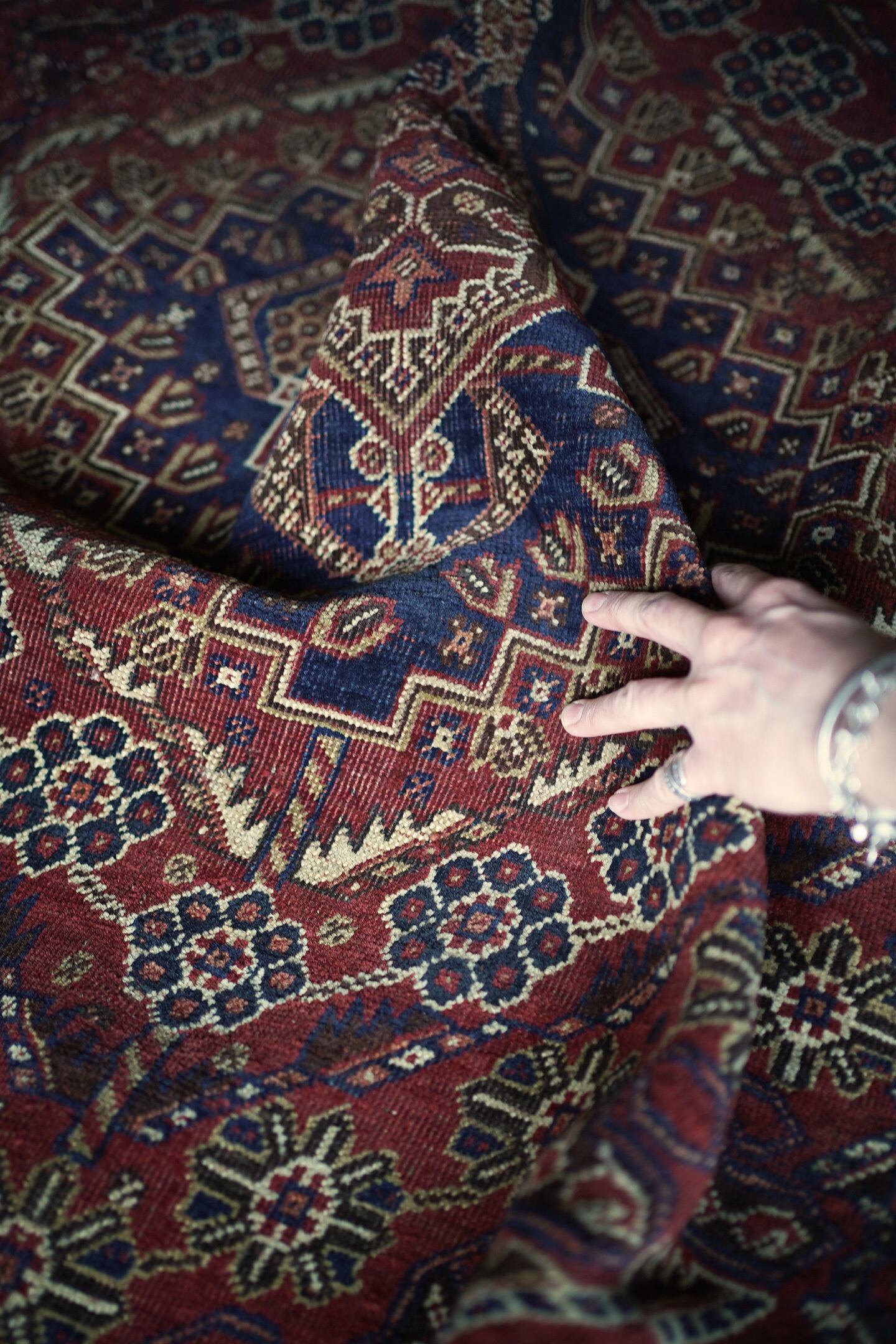 中央のメダリオンから波紋のように広がる美しいデザインはまさに圧巻の一言。花紋様やボテ紋様、魔除の意味を持つ狼の足跡などが芸術的な配列で織り込まれており、息を呑むほどの繊細な美しさに心が奪われます。