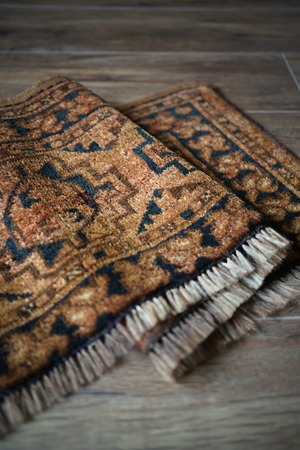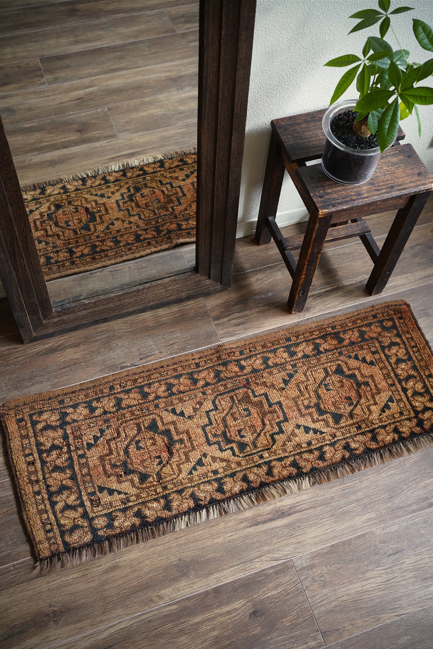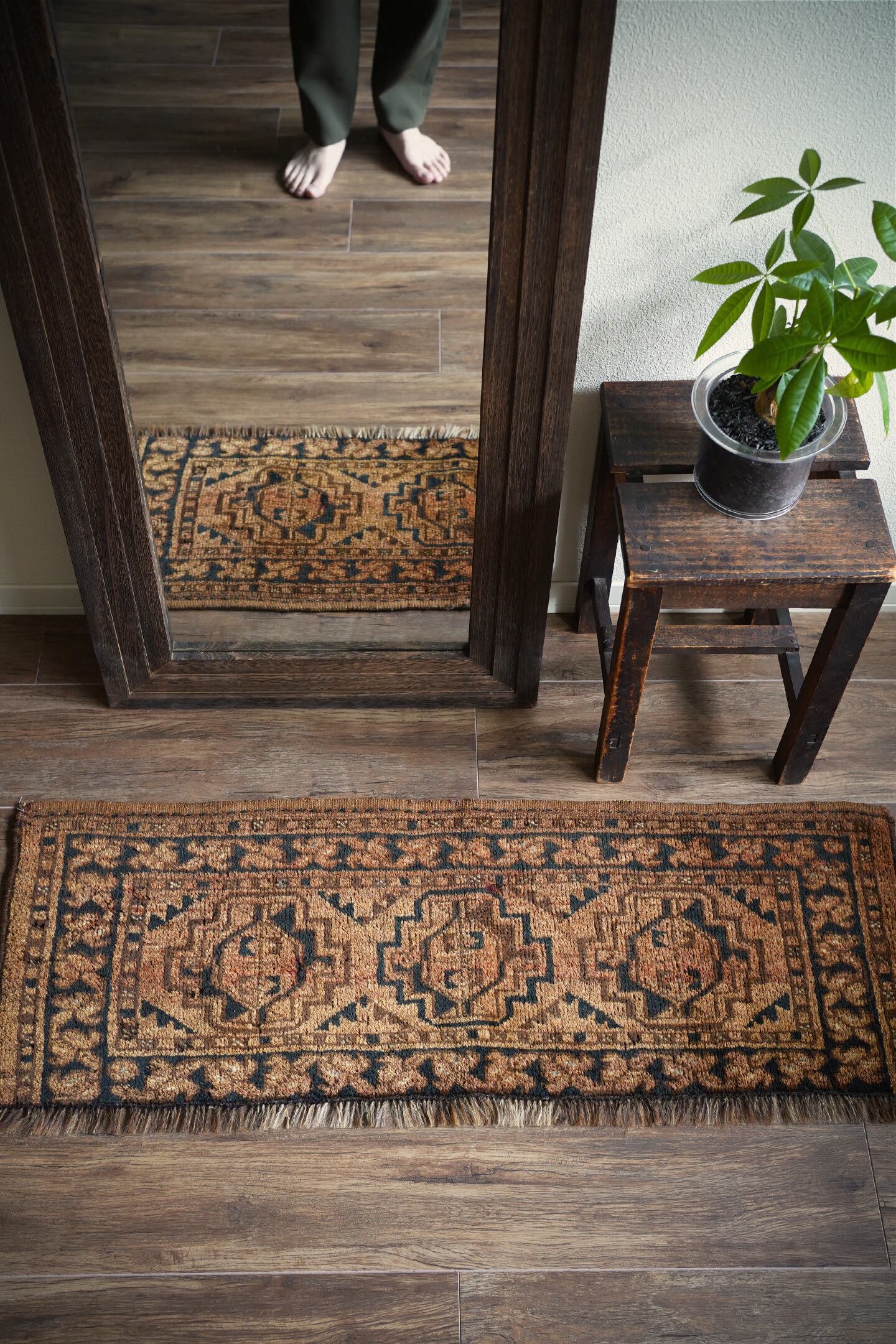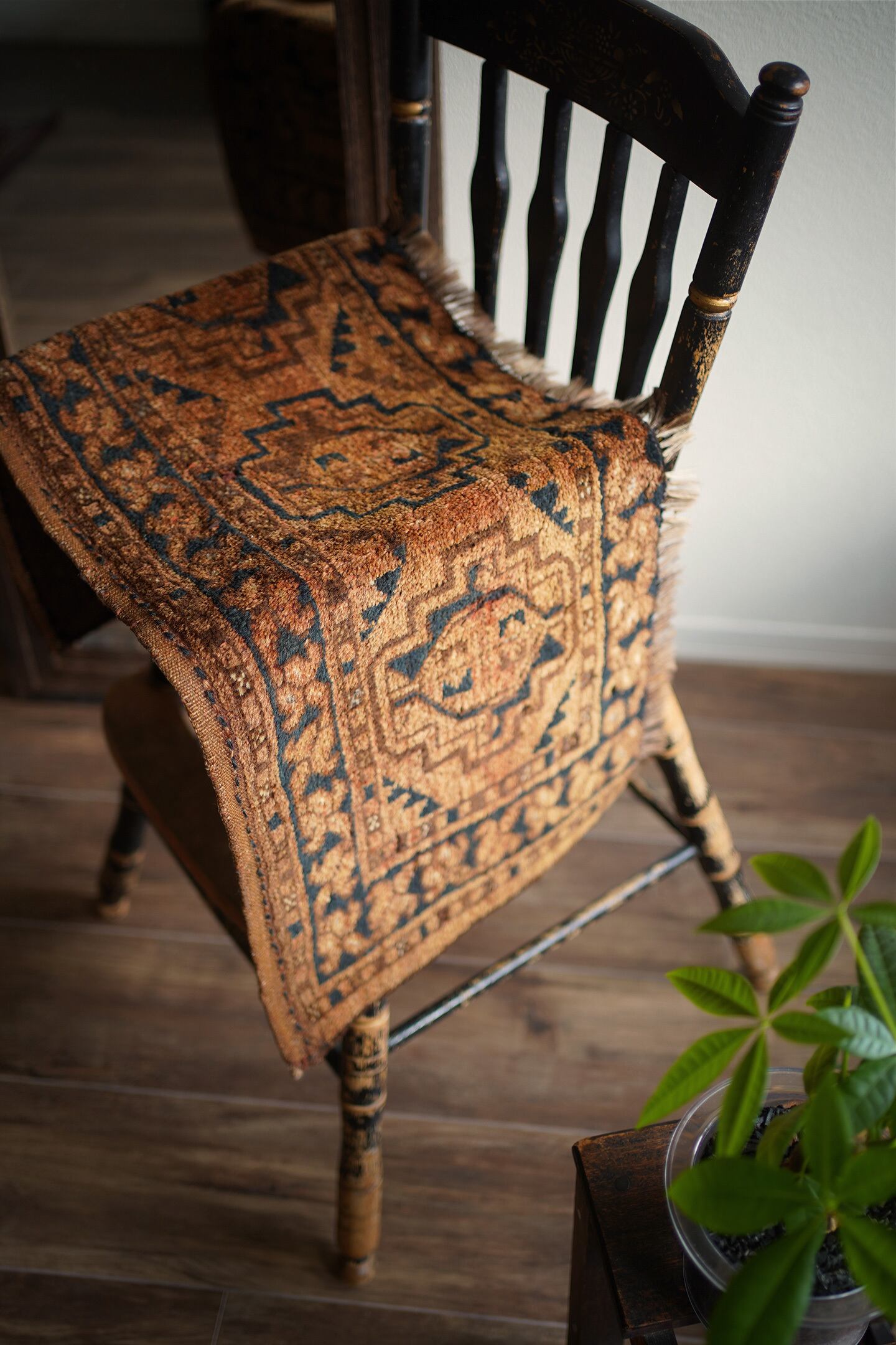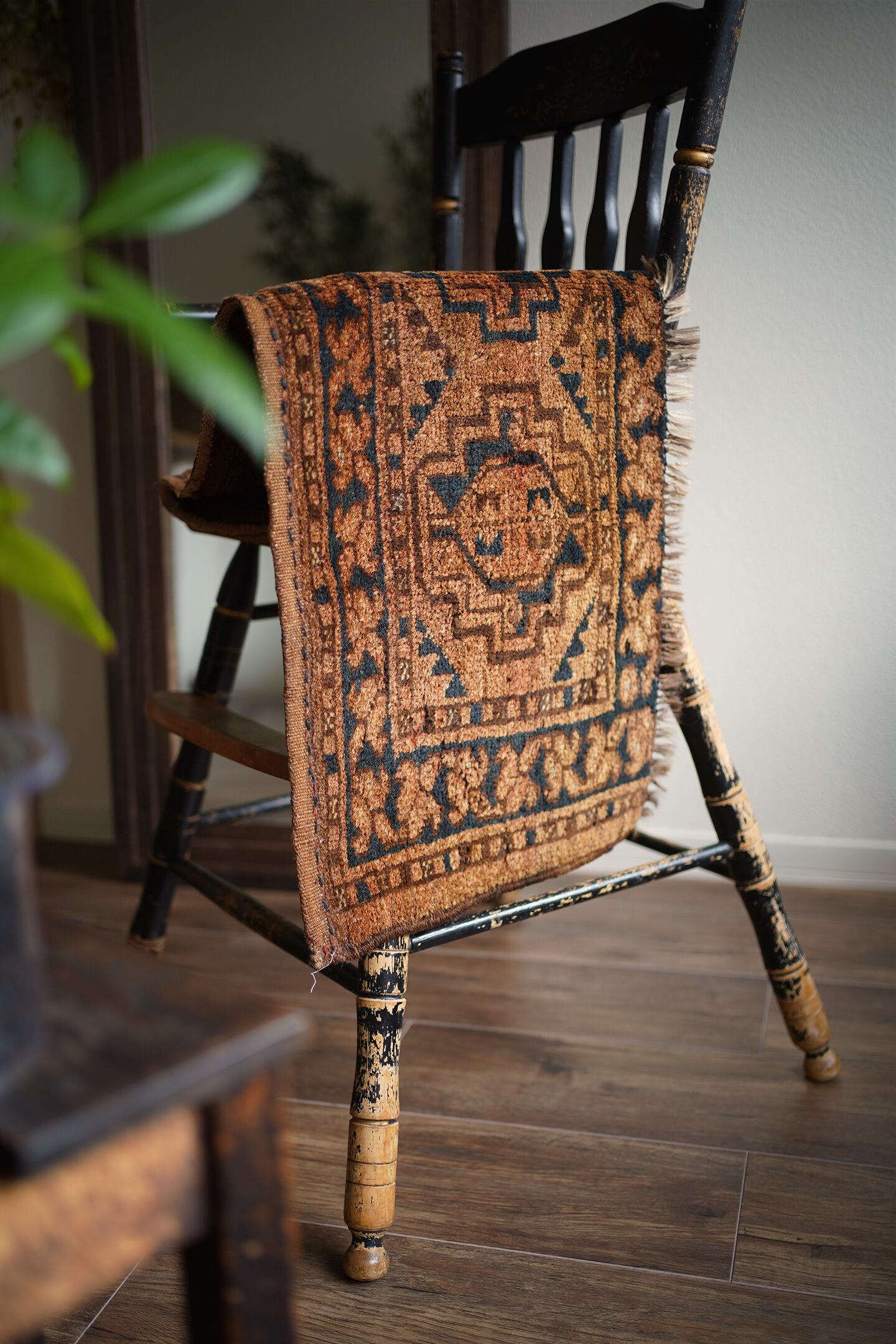 おおよそ80年前にトルクメン族によって織られたジャラーの装飾部分をカットして作成したラグです。ジャラーとは細長い絨毯の袋で嫁入り道具や衣装などを詰め込むトルクメン特有の毛織物。チュワルギュルの紋様が織り込まれたデザインで、渋めのブラウンカラーが魅力的です。表面はサラふわっとした肌触りで、厚みは7mm程度。アンティークを感じる風合いの一枚で、細い糸の抜けやパイルが一部薄くなっている箇所もありますが、目立った補修跡はありません。サイドボードの前などに敷いたりすると、とても素敵かと思います。