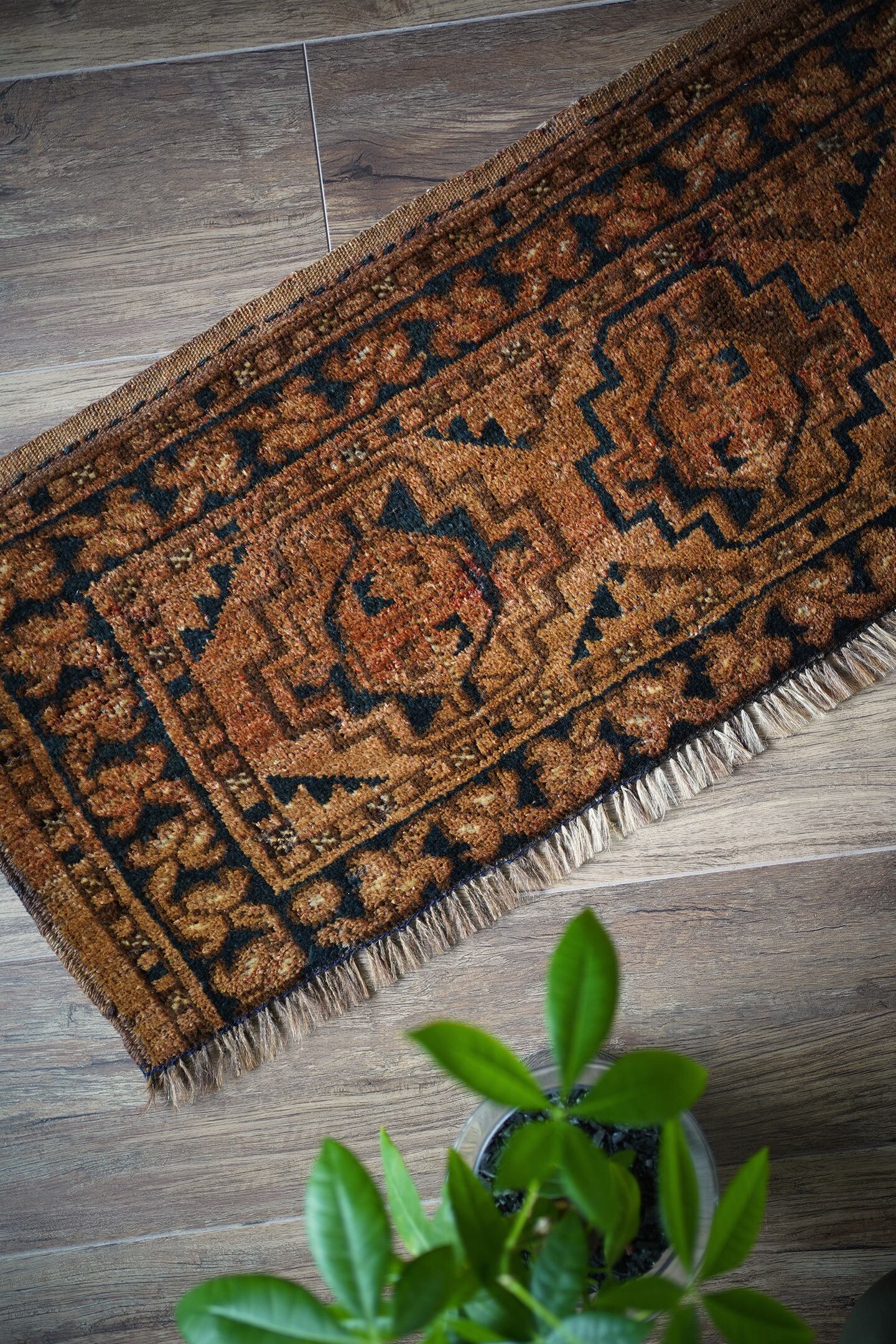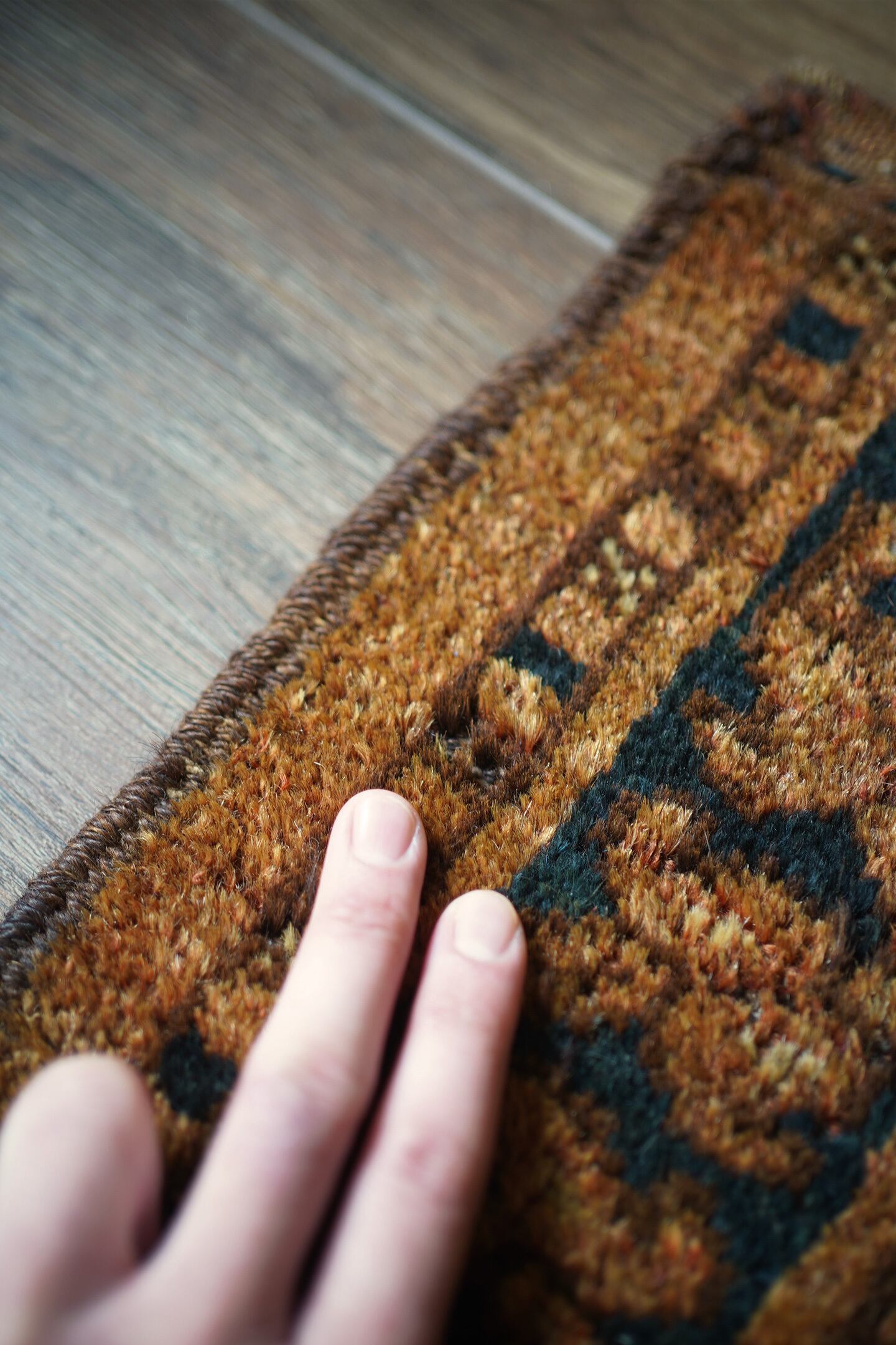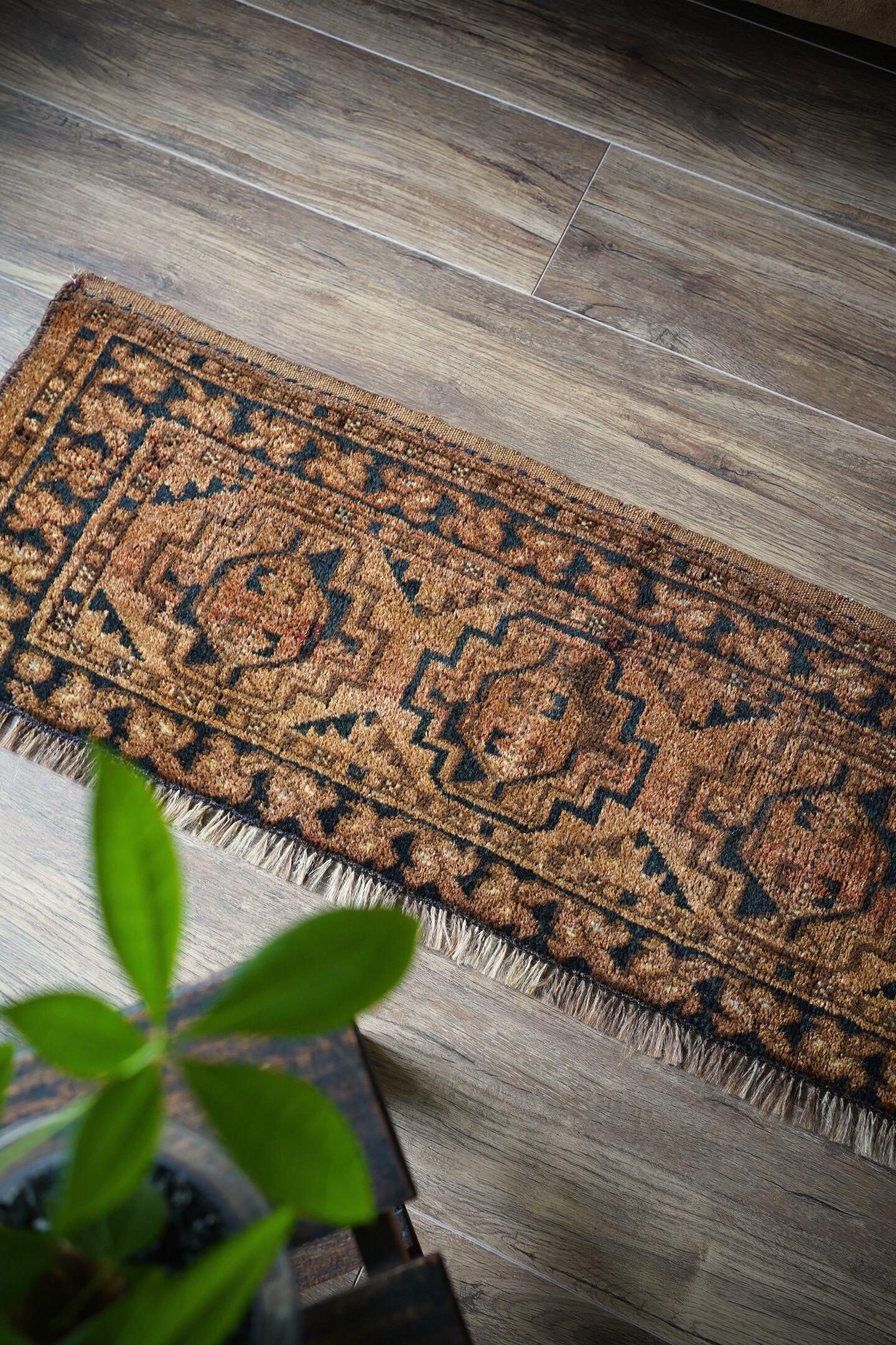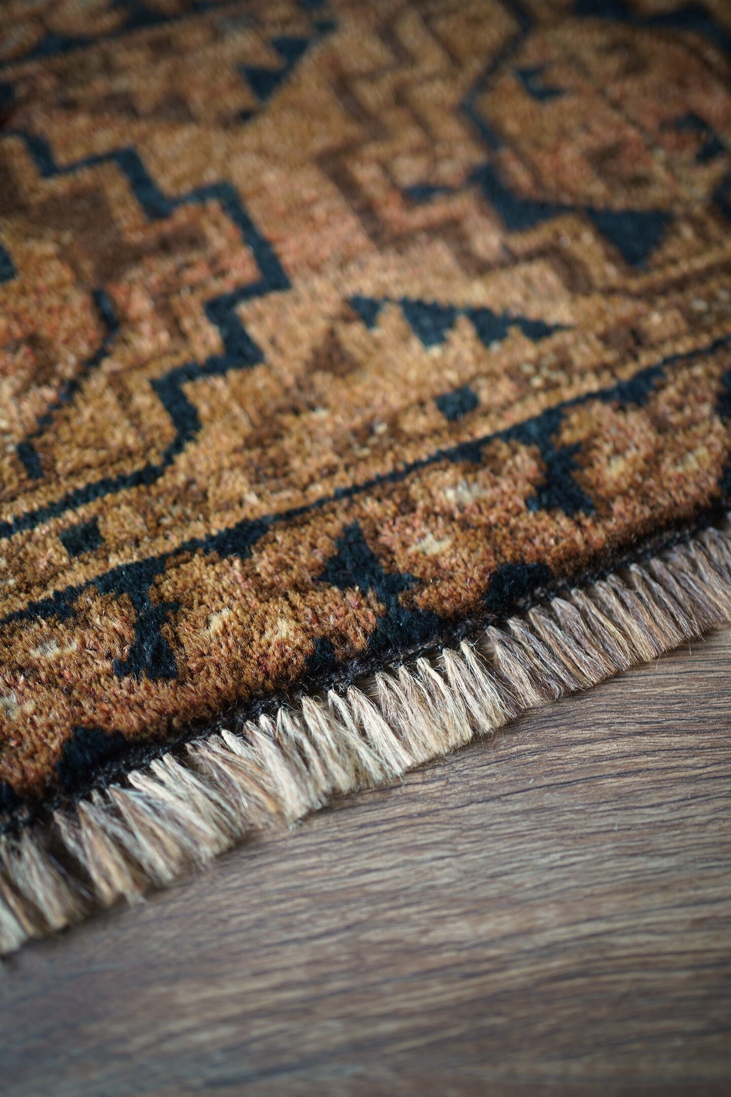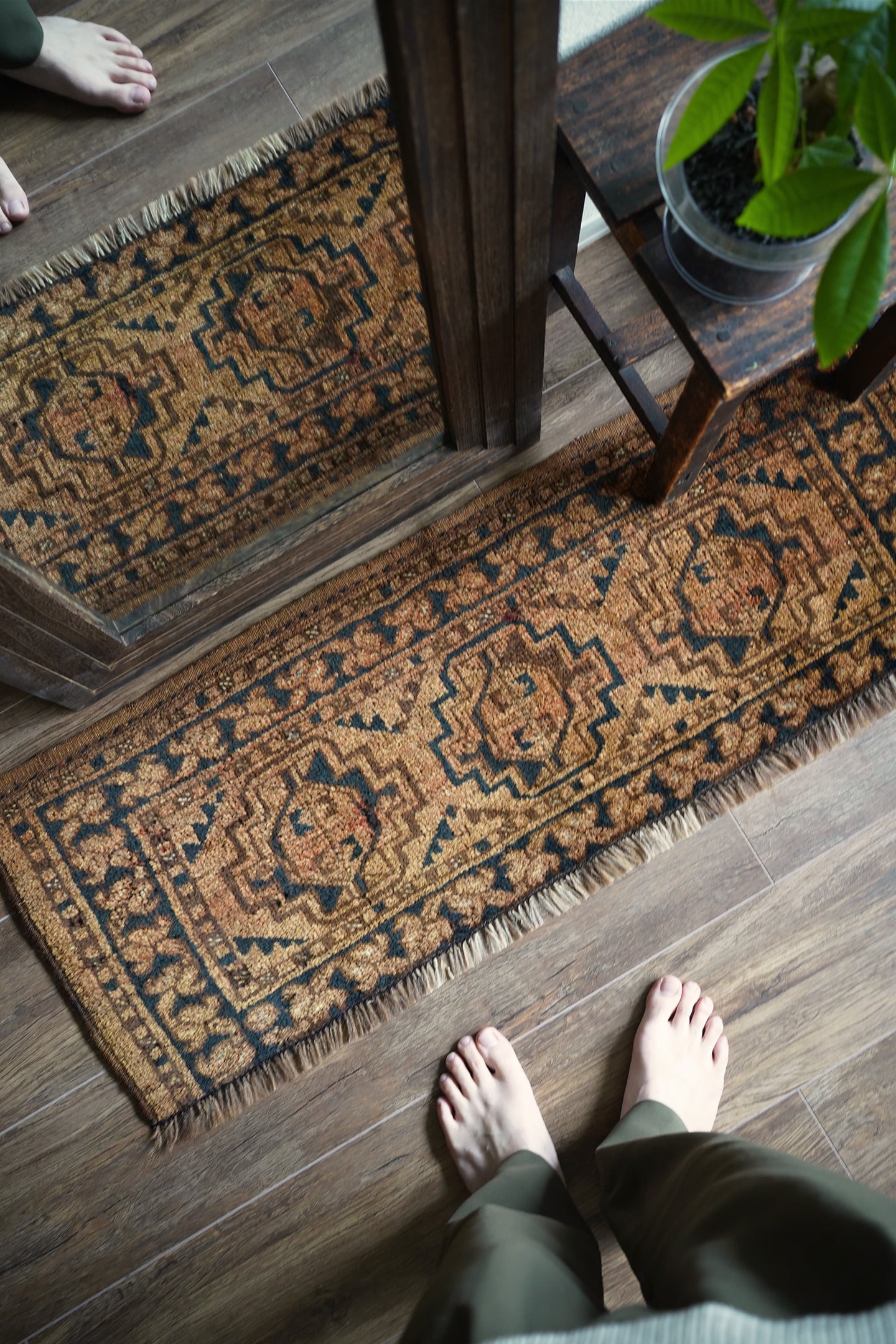 おおよそ80年前にトルクメン族によって織られたジャラーの装飾部分をカットして作成したラグです。ジャラーとは細長い絨毯の袋で嫁入り道具や衣装などを詰め込むトルクメン特有の毛織物。チュワルギュルの紋様が織り込まれたデザインで、渋めのブラウンカラーが魅力的です。表面はサラふわっとした肌触りで、厚みは7mm程度。アンティークを感じる風合いの一枚で、細い糸の抜けやパイルが一部薄くなっている箇所もありますが、目立った補修跡はありません。サイドボードの前などに敷いたりすると、とても素敵かと思います。