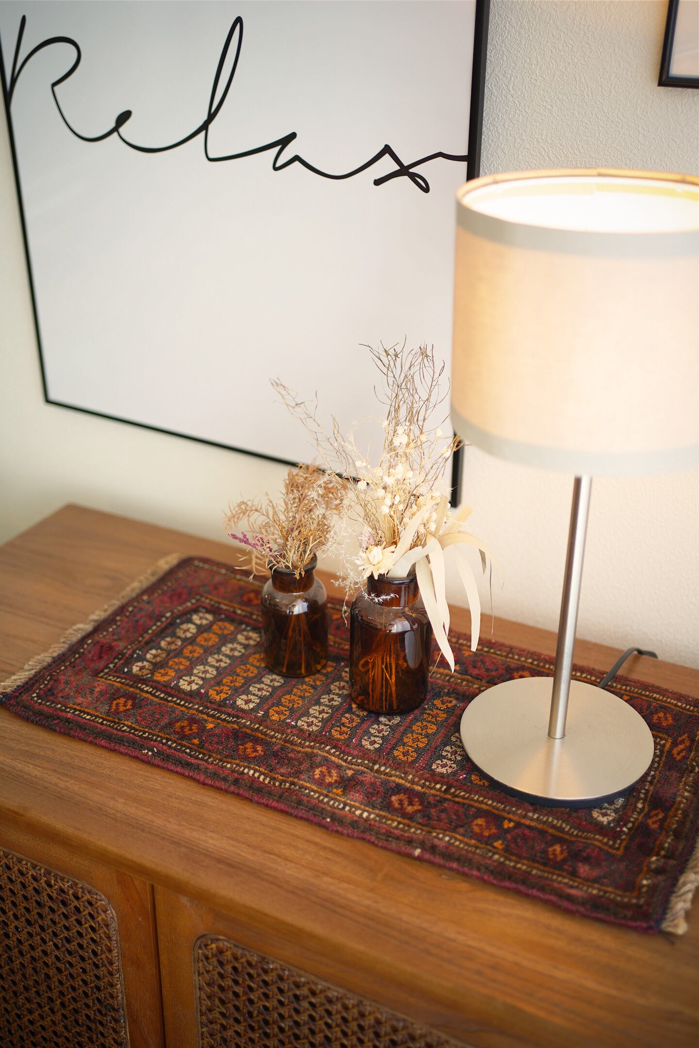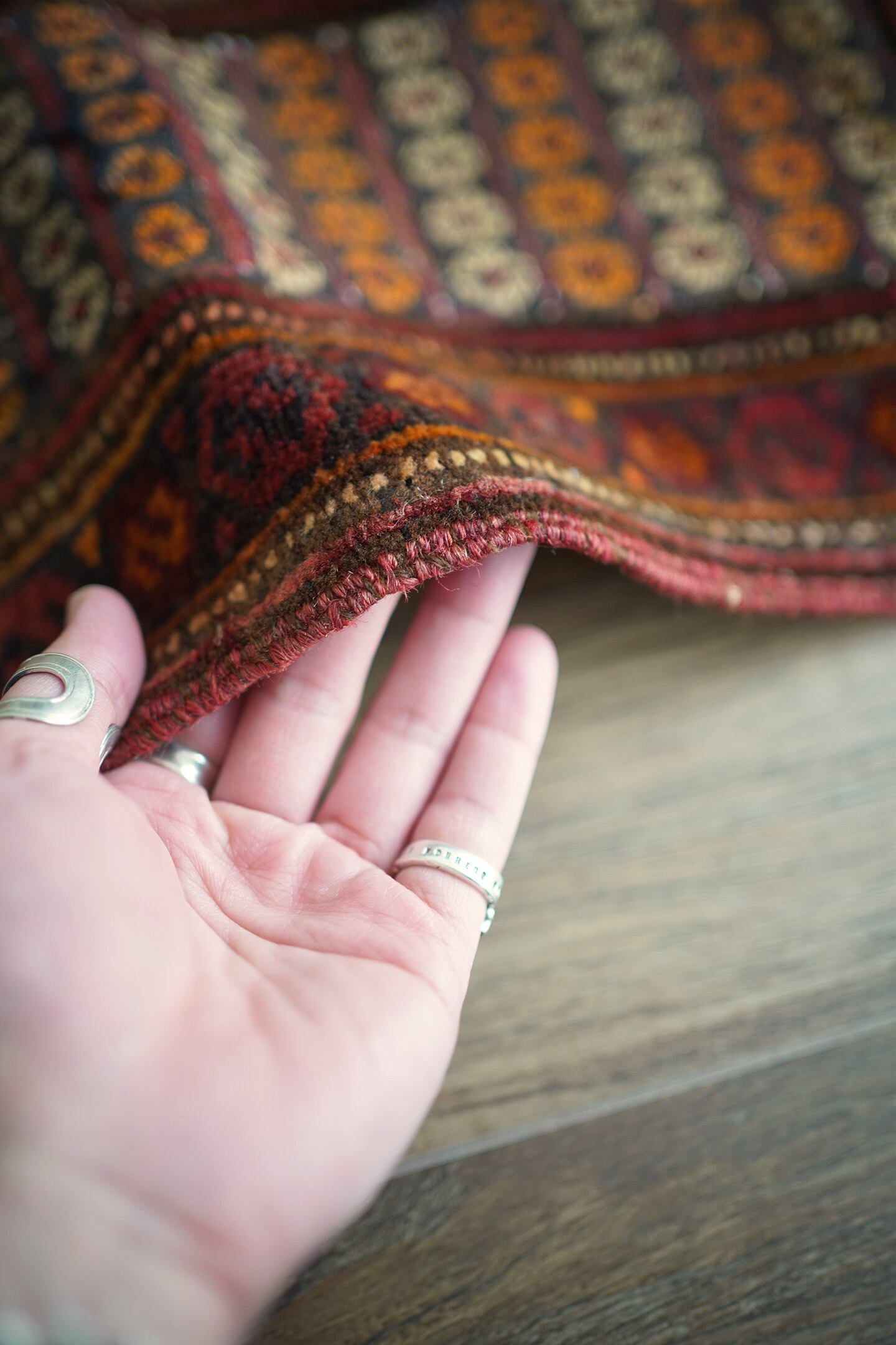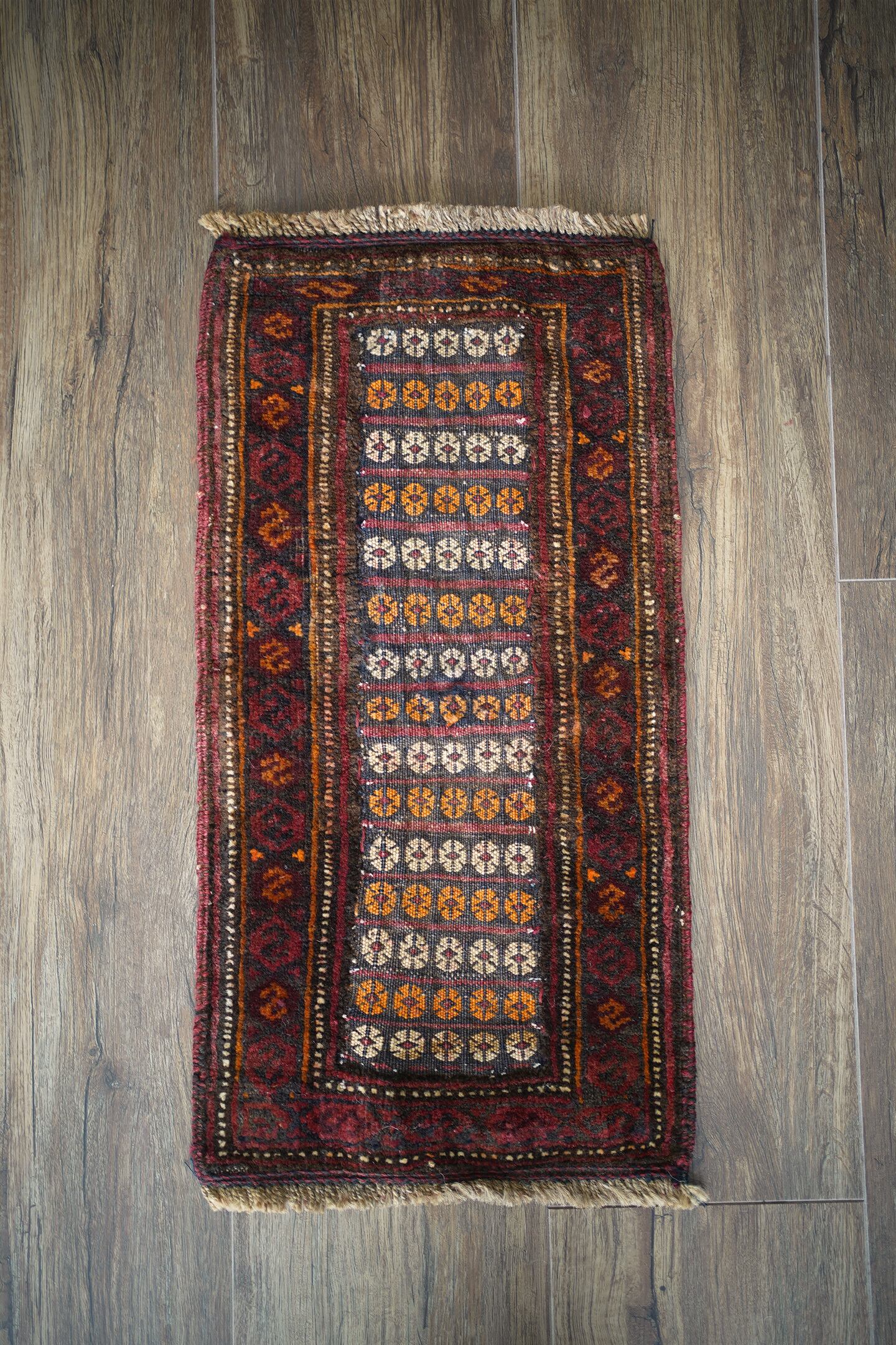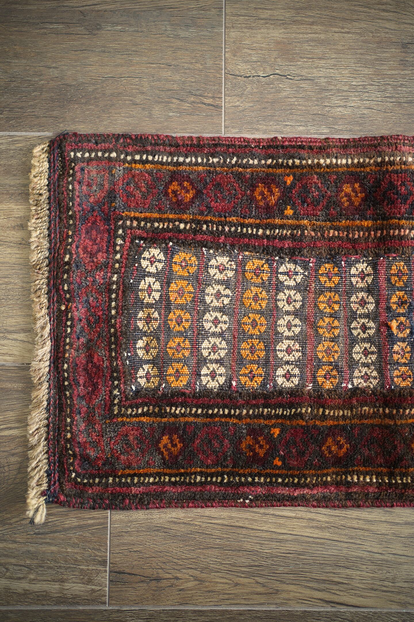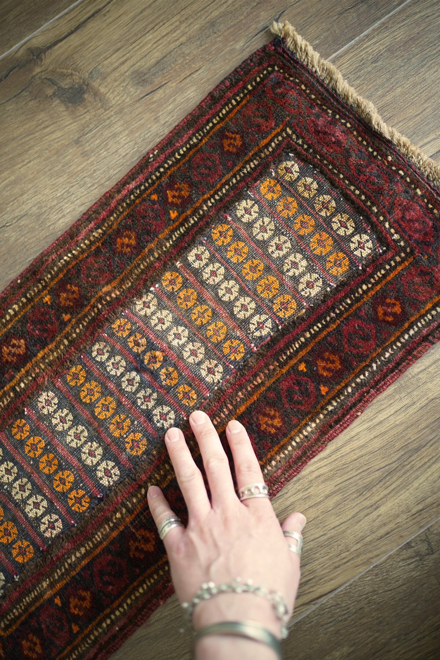 約40年ほど前にバルーチ族によって織られたスモールサイズのラグです。中央部分がキリムの作りになった珍しいタイプの一枚。色味はえんじ色、暗めの赤、オレンジ、ベージュ等が使われた落ち着いた配色なので、様々な家具とも相性が良く非常に使いやすいかと思います。厚みは5mm程度。キャビネットやシェルフ、オープンラックなどの棚の上に敷いて、小物を上に置いたりすると、とても素敵になりますよ♪