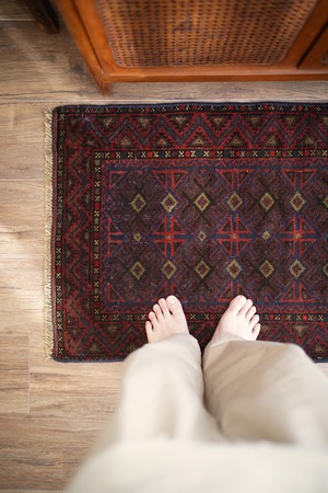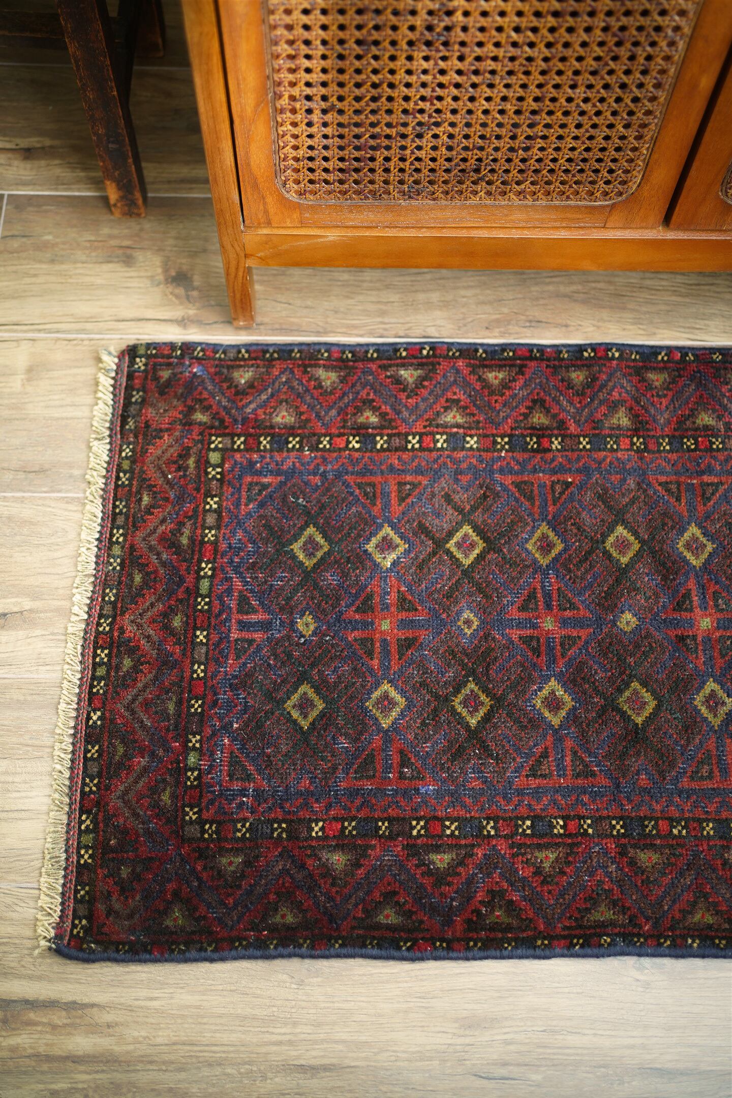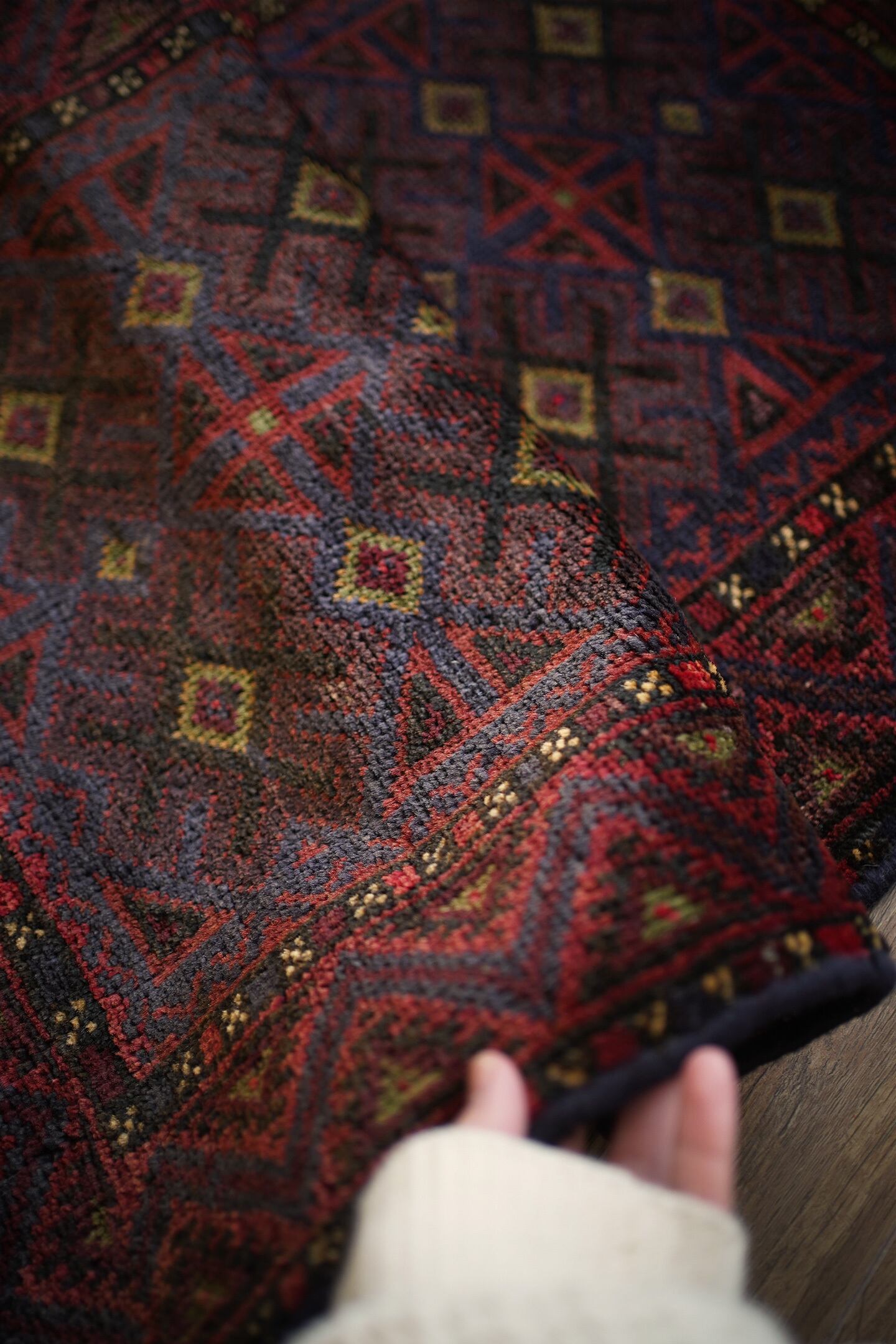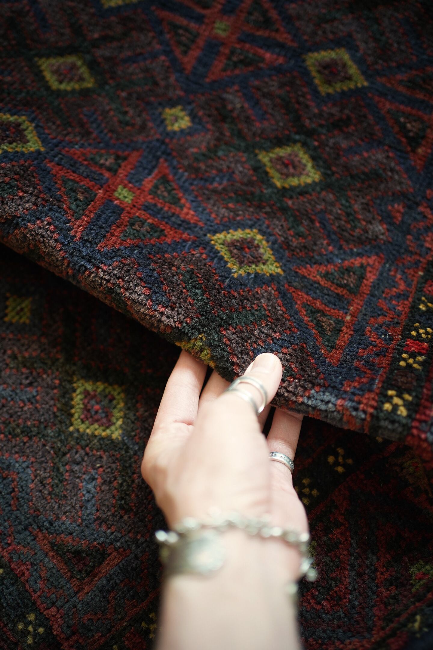 約50年ほど前にバルーチ族によって織られたヴィンテージラグ。暗めのラグで、配色には焦茶、暗い赤茶、濃紺、くすんだオリーブ色などが使われています(色の組み合わせにより全体的には暗い赤紫色のような色味に見えます)。パイル全体にうっすらと艶も見受けられ、シックかつ上品な雰囲気です。厚みは6mm程度で、表面はサラふわっと滑らかな肌触りをしています。コンディションはパーフェクト。キャビネットやラック下などにどうぞ♫
