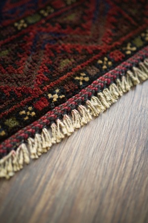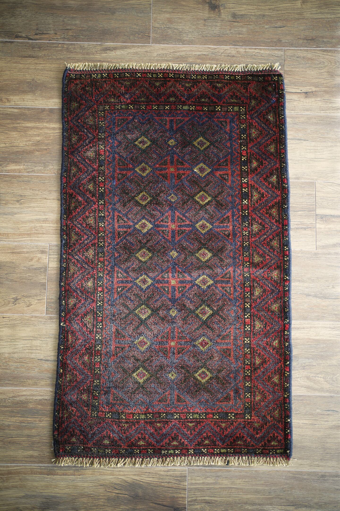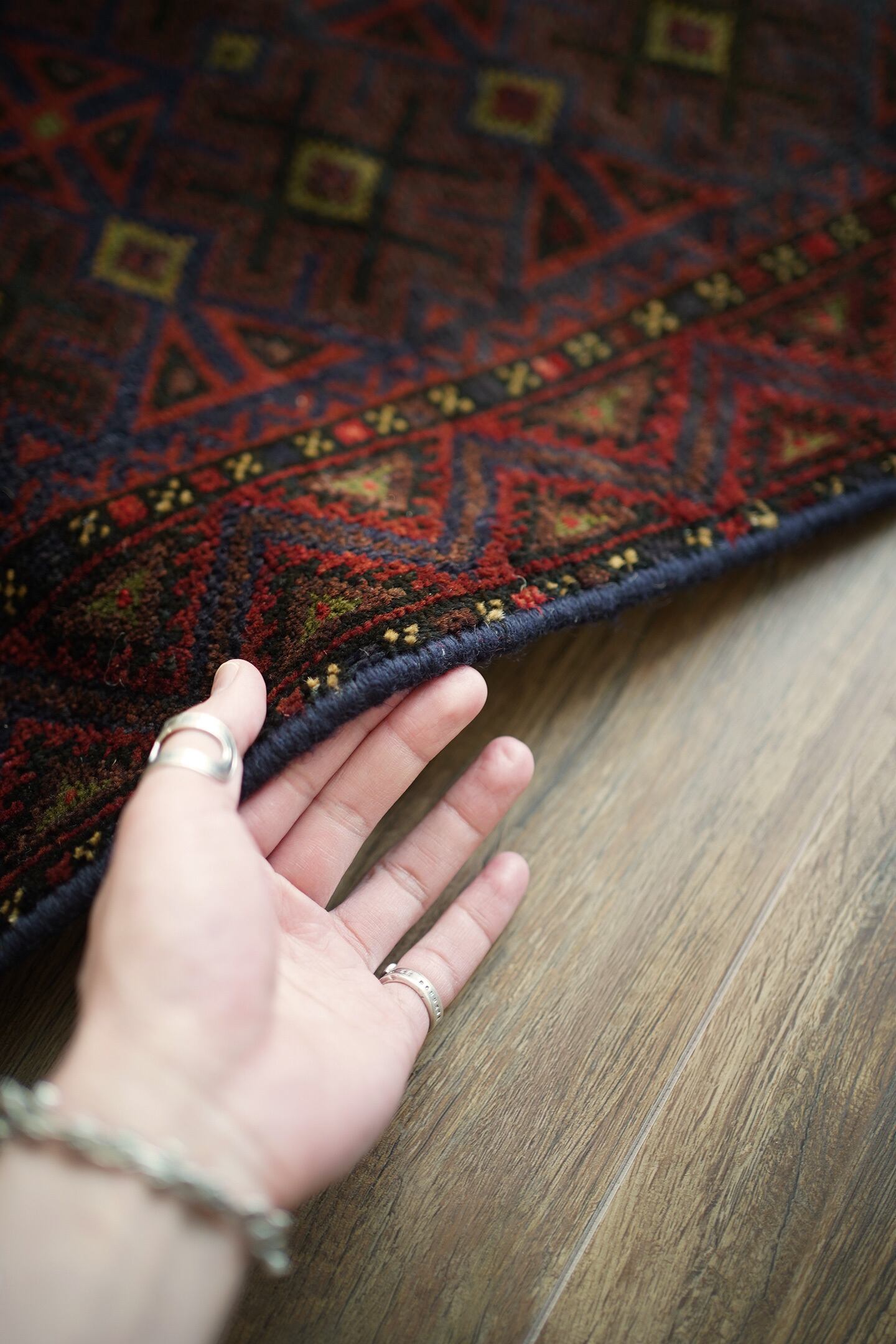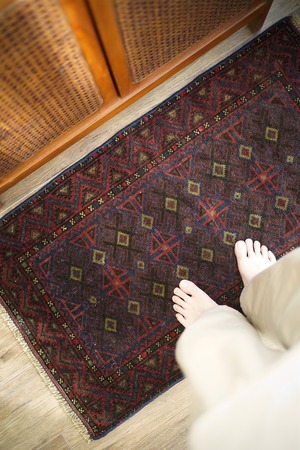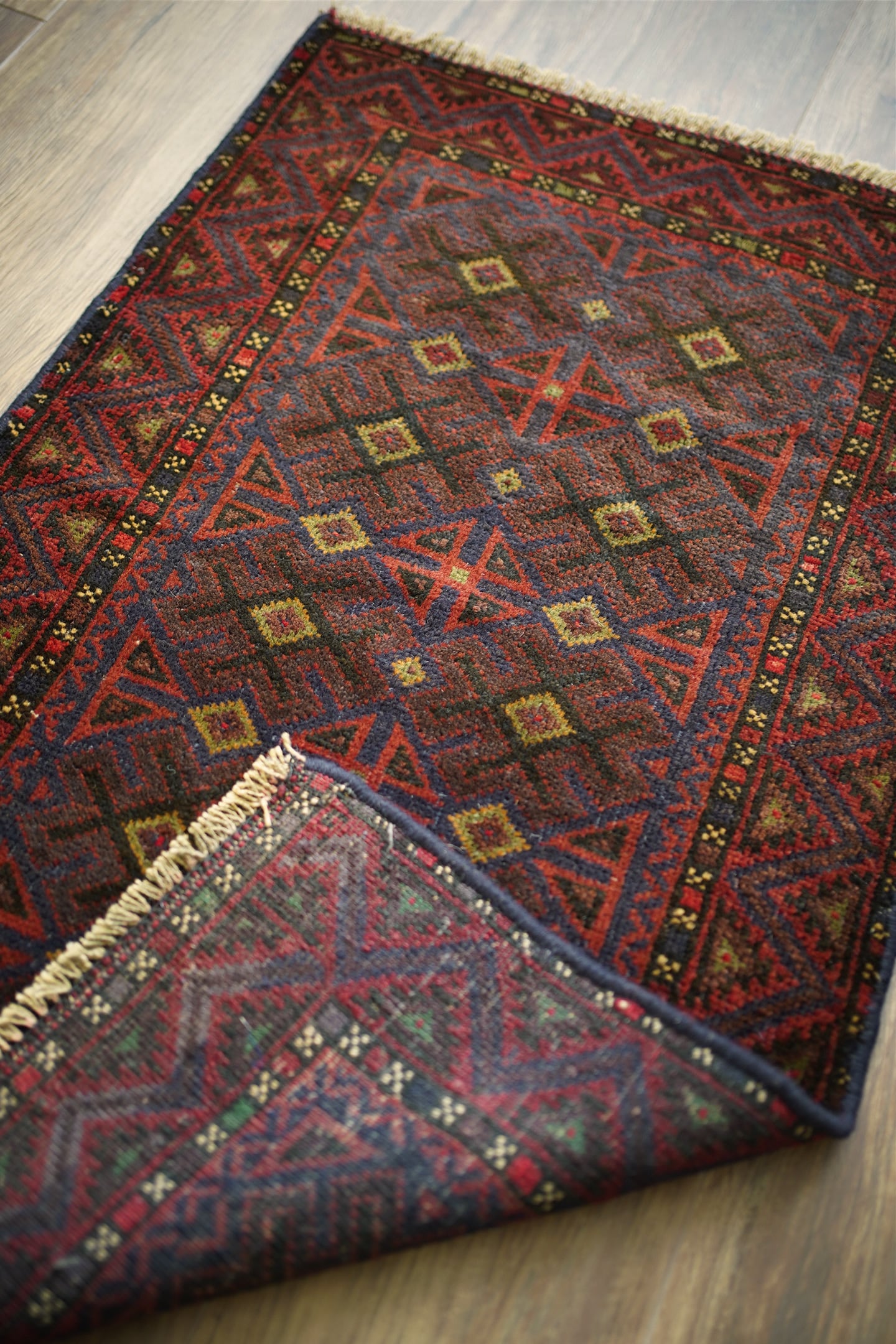 約50年ほど前にバルーチ族によって織られたヴィンテージラグ。暗めのラグで、配色には焦茶、暗い赤茶、濃紺、くすんだオリーブ色などが使われています(色の組み合わせにより全体的には暗い赤紫色のような色味に見えます)。パイル全体にうっすらと艶も見受けられ、シックかつ上品な雰囲気です。厚みは6mm程度で、表面はサラふわっと滑らかな肌触りをしています。コンディションはパーフェクト。キャビネットやラック下などにどうぞ♫