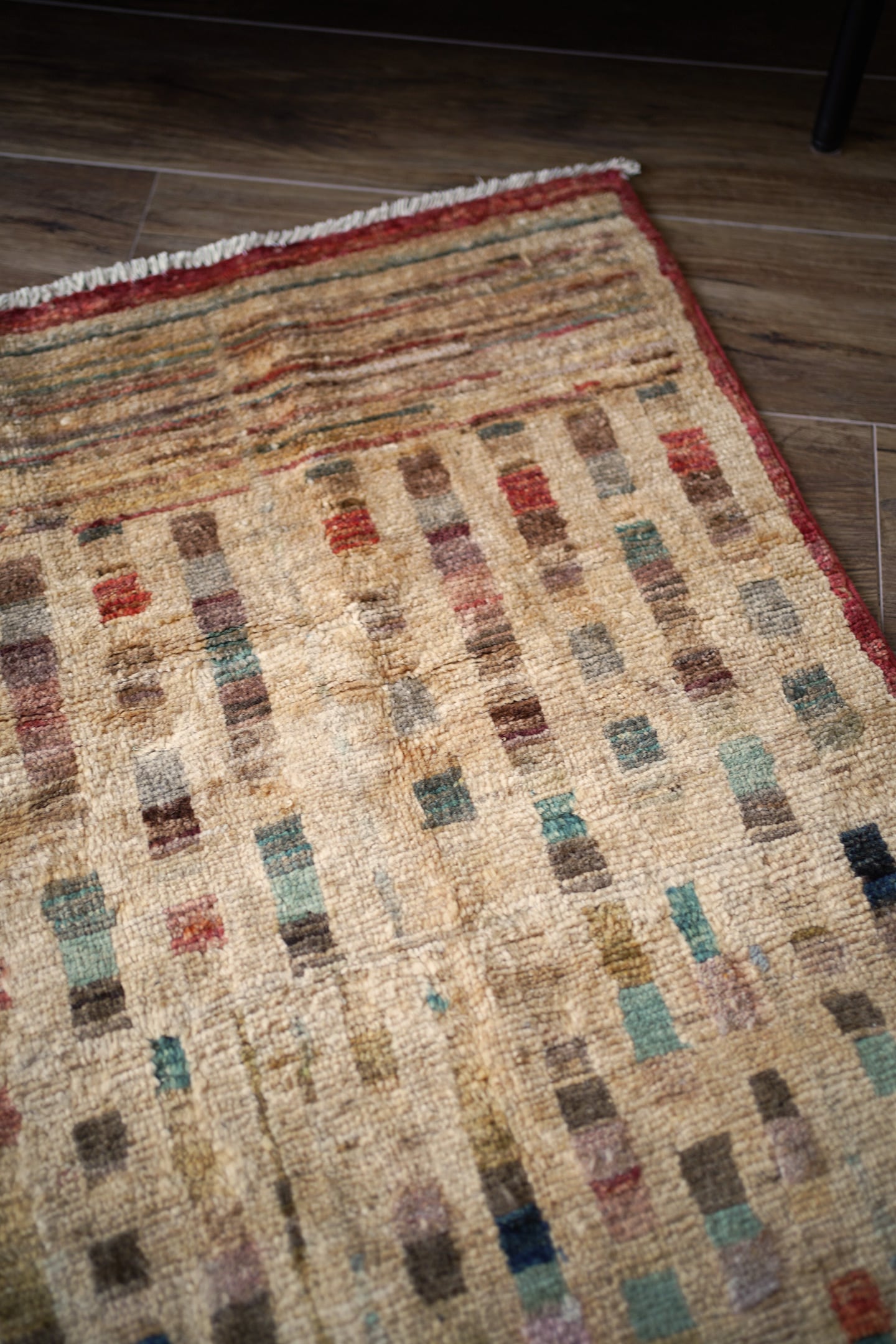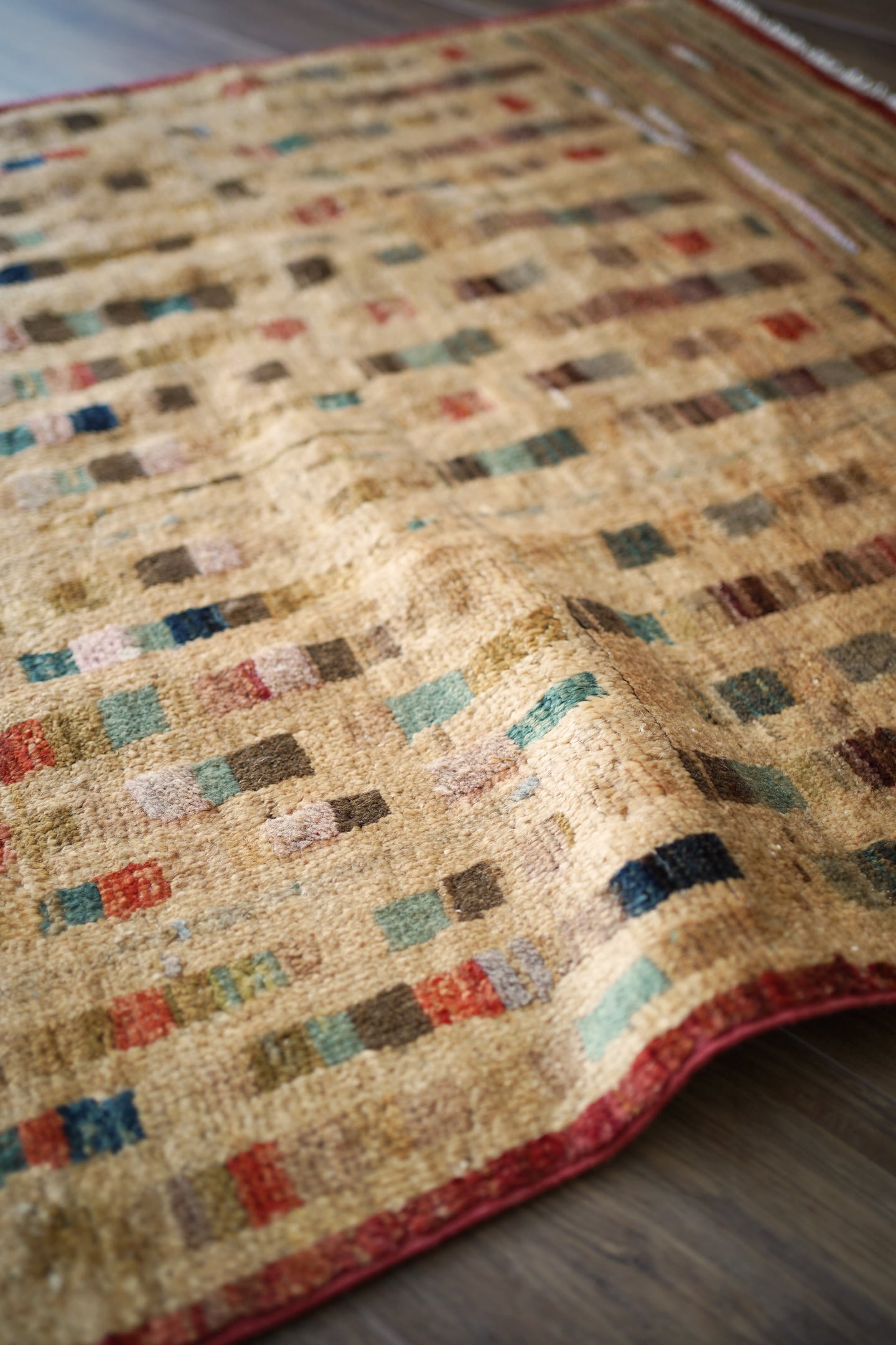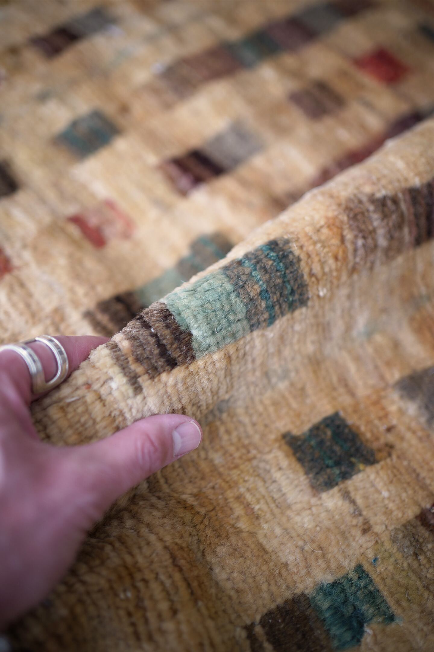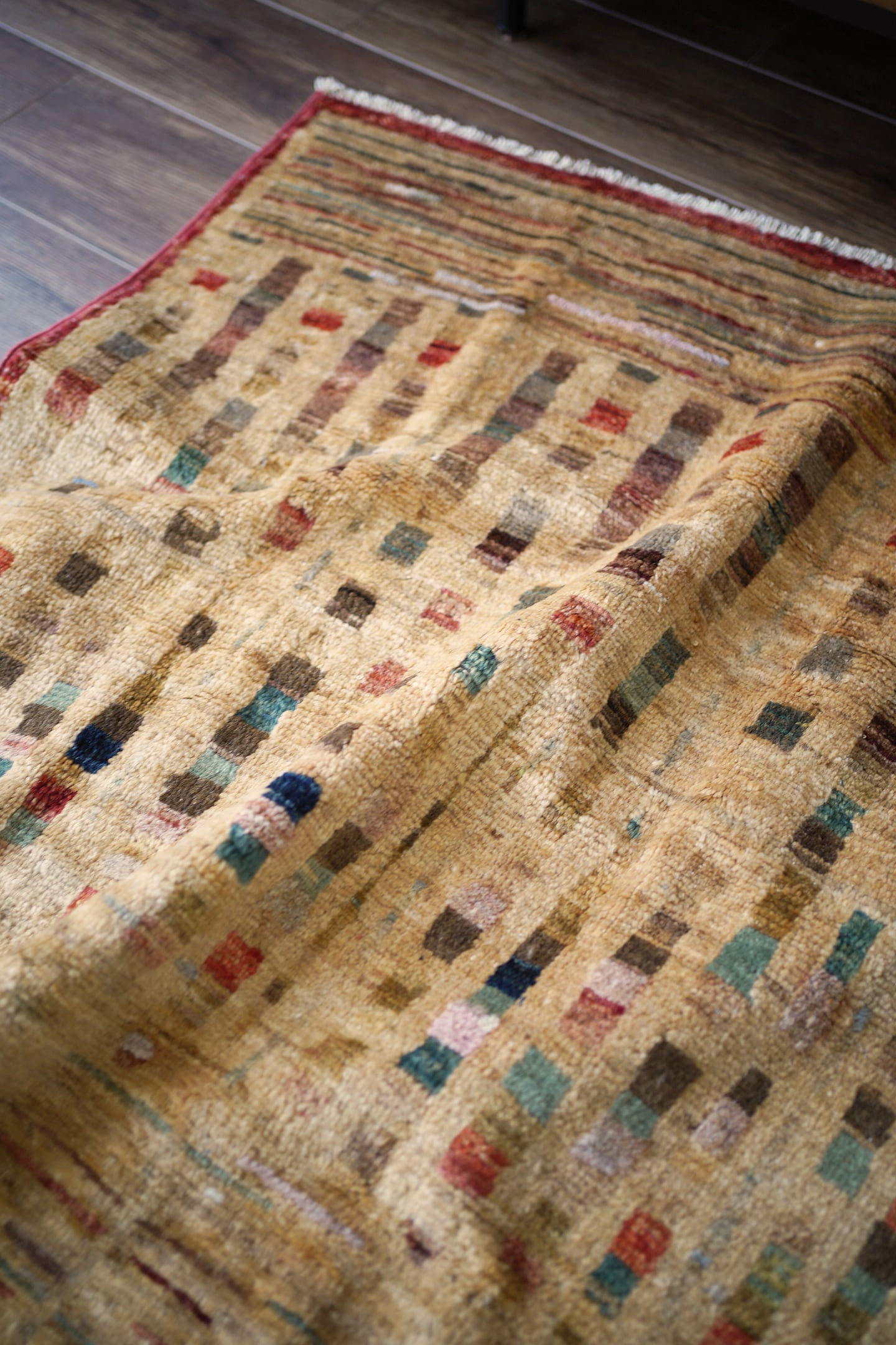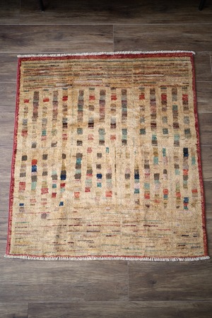 約40年ほど前に織られたアフガニスタン産のギャッベ。エメラルドグリーンやブラウンなどのカラフルな正方形の模様が織り込まれたデザインで、非常に可愛らしい雰囲気の一枚。パイル全体に光沢感のある艶があり、敷く角度や見る方向によって色の濃さが変わります。一方では白が強く見えるベージュ、もう一方ではオレンジみのあるベージュに見えたりと、様々な表情を見せてくれるところが面白いです。厚みは6mm程度で、表面はサラふわっとした質感のため通年で気持ちよく敷いていただけるかと思います。コンディションも大変良好。正方形に近いサイズ感で使い勝手も良いので、色んなスペースで活躍してくれますよ♫