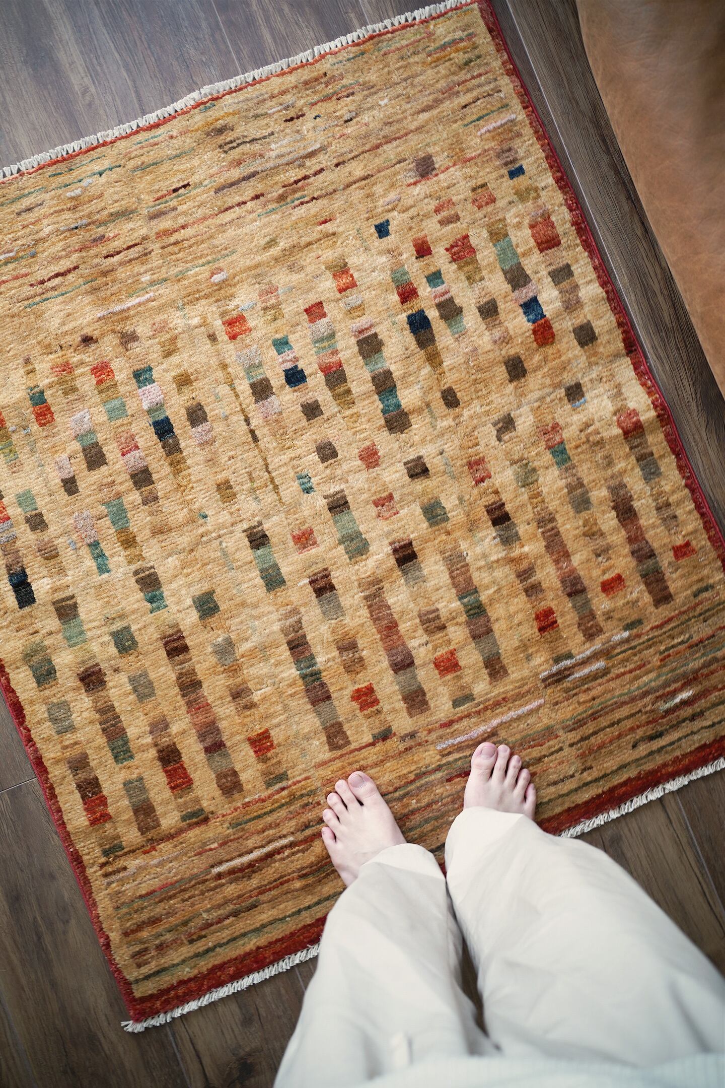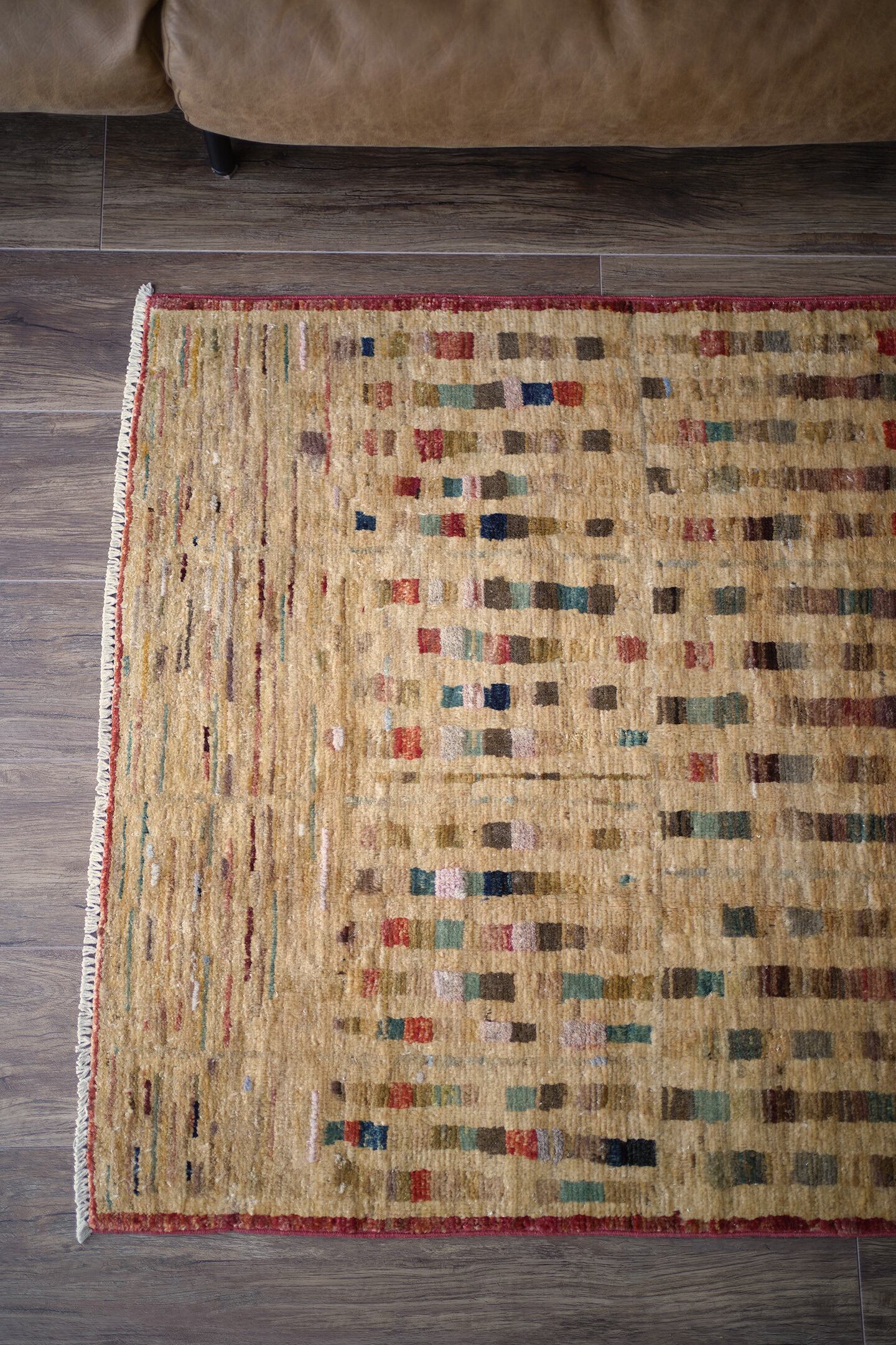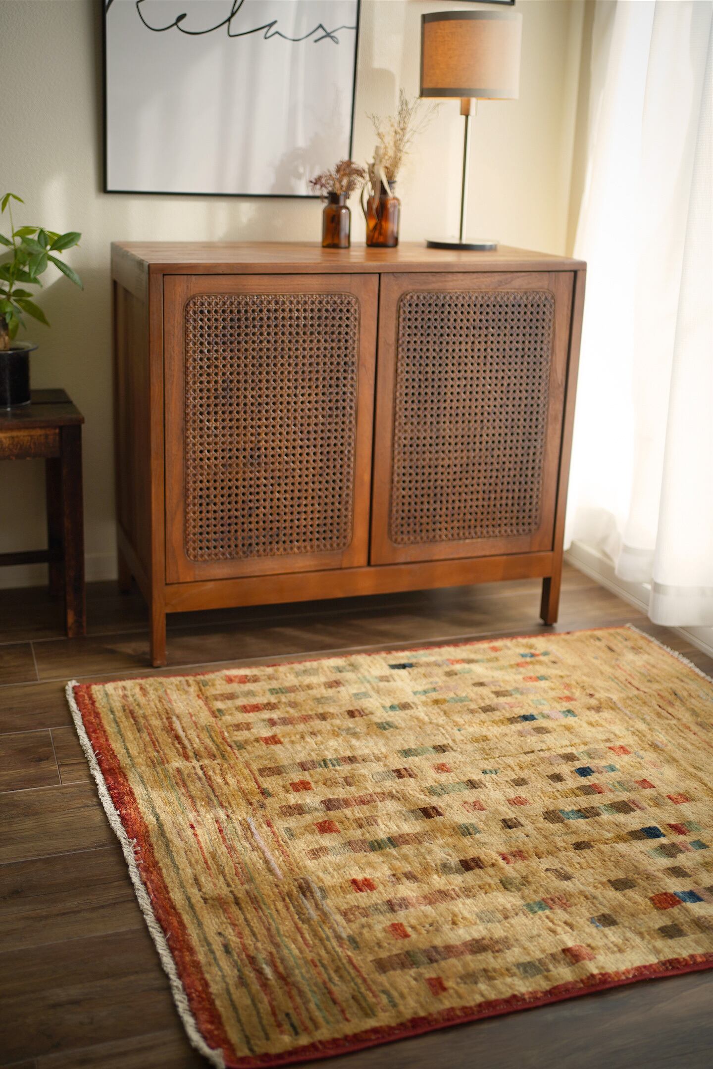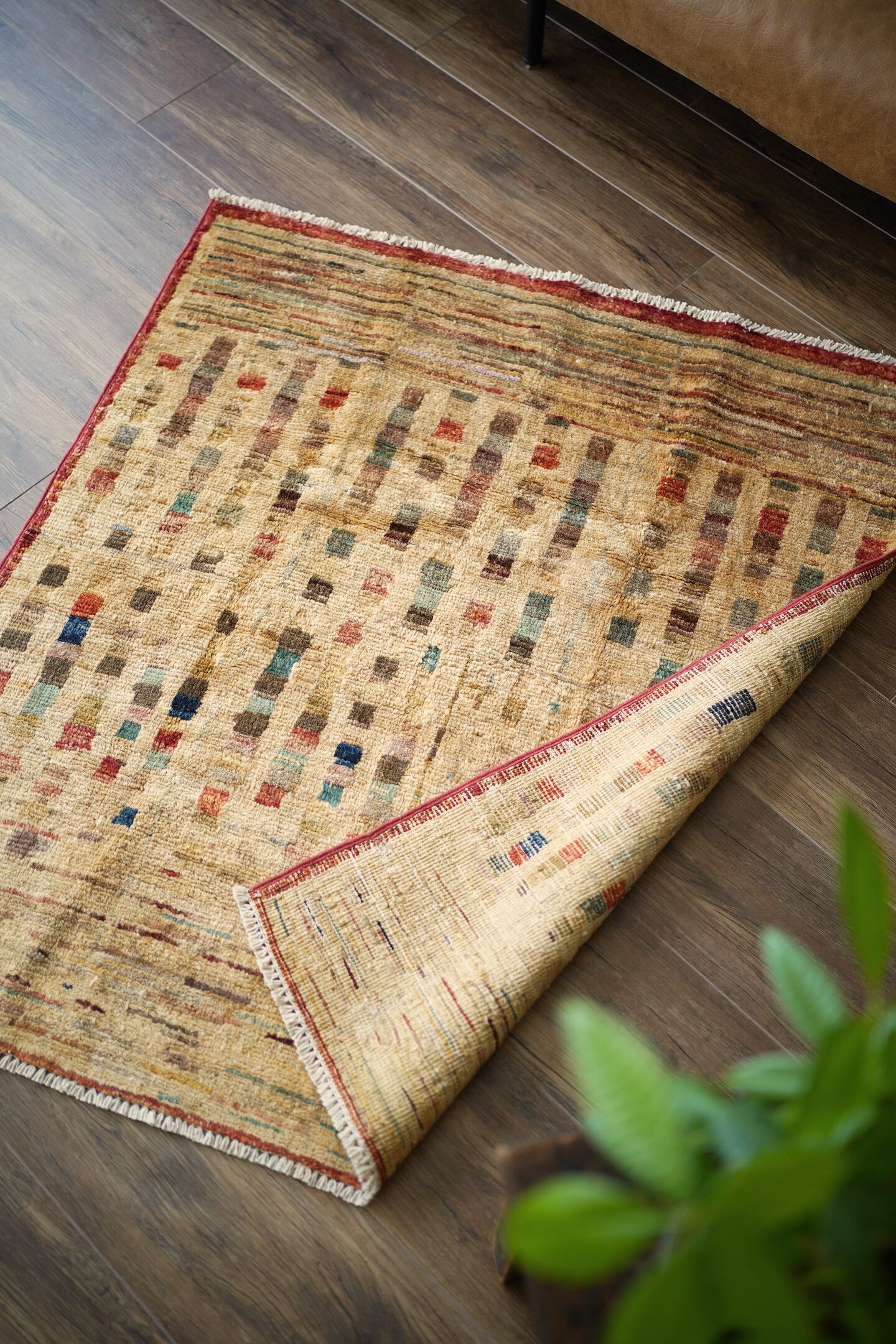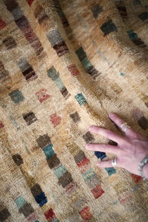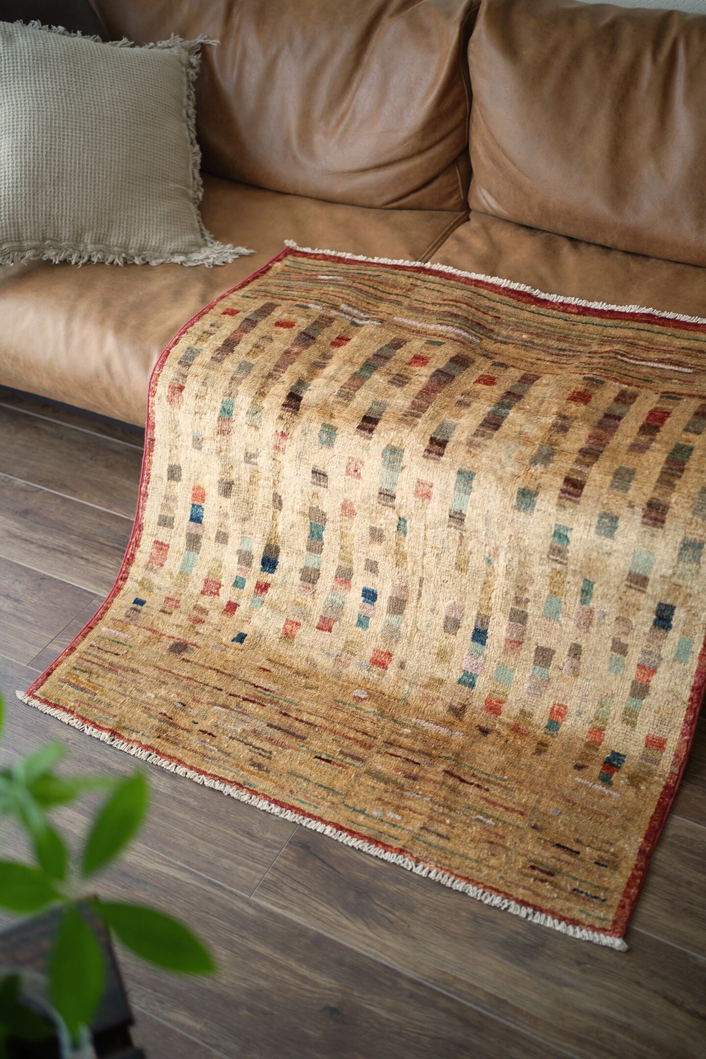 約40年ほど前に織られたアフガニスタン産のギャッベ。エメラルドグリーンやブラウンなどのカラフルな正方形の模様が織り込まれたデザインで、非常に可愛らしい雰囲気の一枚。パイル全体に光沢感のある艶があり、敷く角度や見る方向によって色の濃さが変わります。一方では白が強く見えるベージュ、もう一方ではオレンジみのあるベージュに見えたりと、様々な表情を見せてくれるところが面白いです。厚みは6mm程度で、表面はサラふわっとした質感のため通年で気持ちよく敷いていただけるかと思います。コンディションも大変良好。正方形に近いサイズ感で使い勝手も良いので、色んなスペースで活躍してくれますよ♫