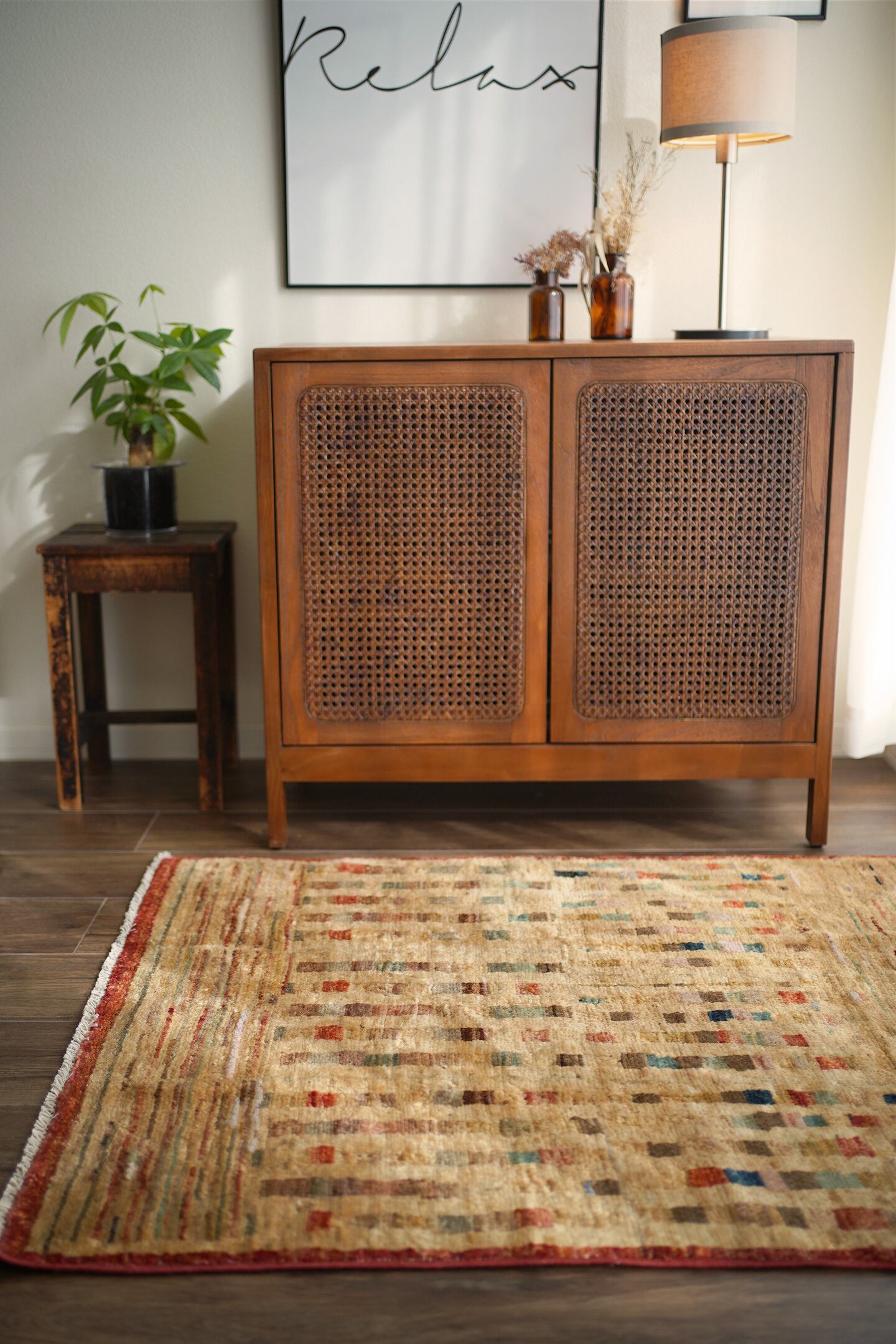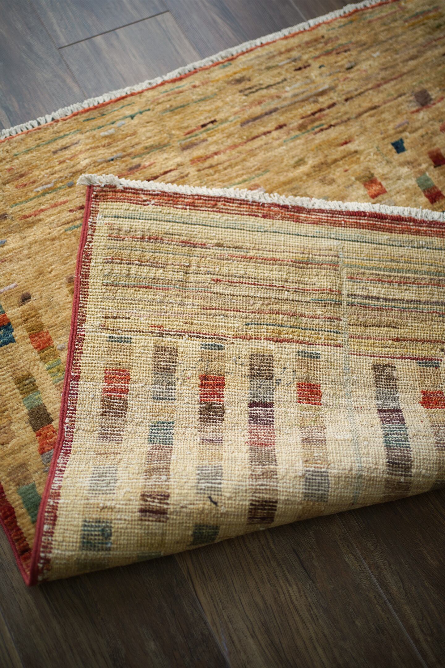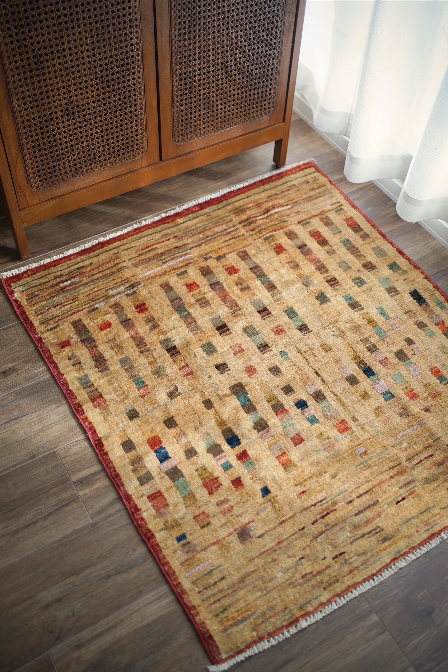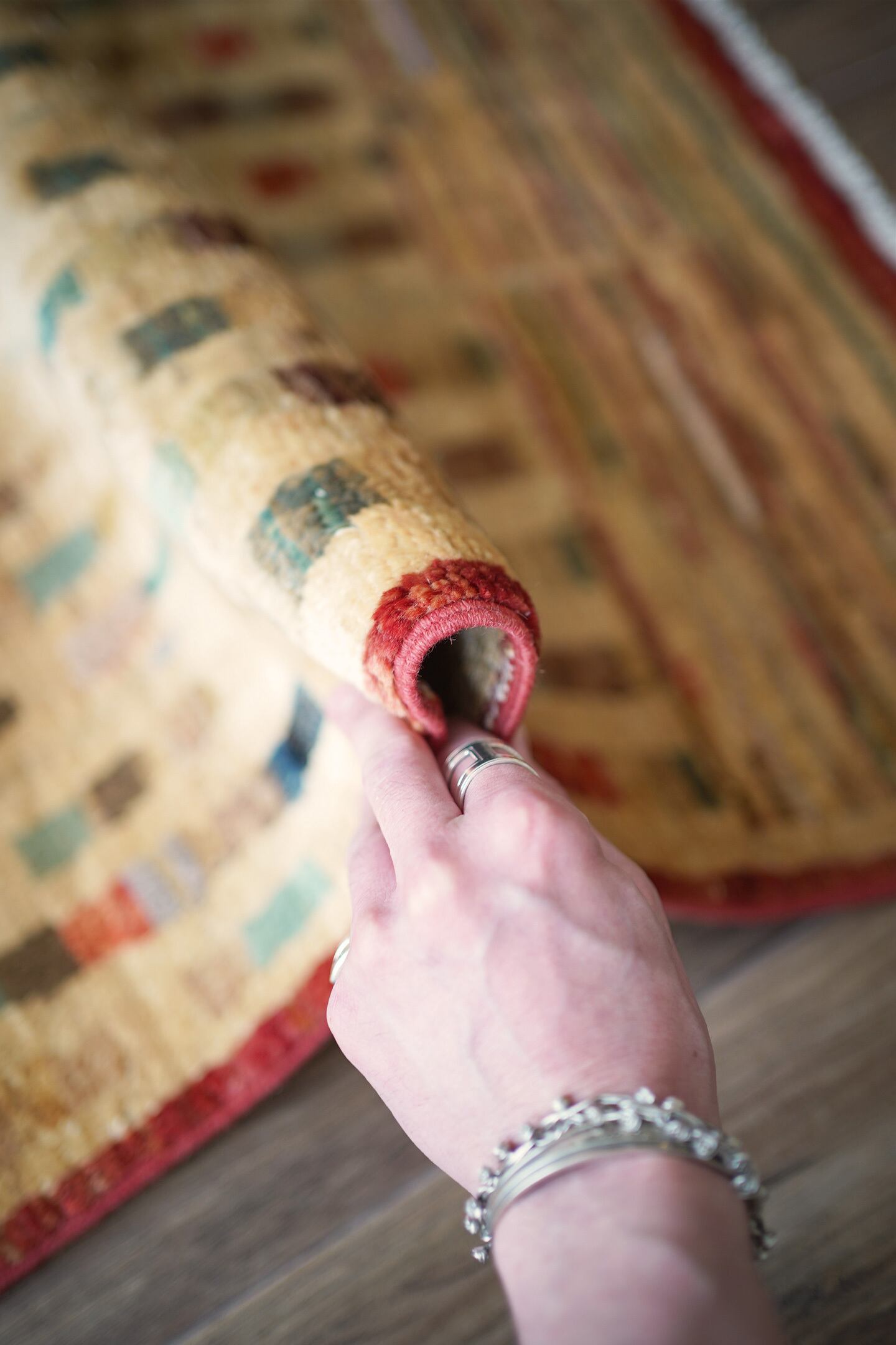 約40年ほど前に織られたアフガニスタン産のギャッベ。エメラルドグリーンやブラウンなどのカラフルな正方形の模様が織り込まれたデザインで、非常に可愛らしい雰囲気の一枚。パイル全体に光沢感のある艶があり、敷く角度や見る方向によって色の濃さが変わります。一方では白が強く見えるベージュ、もう一方ではオレンジみのあるベージュに見えたりと、様々な表情を見せてくれるところが面白いです。厚みは6mm程度で、表面はサラふわっとした質感のため通年で気持ちよく敷いていただけるかと思います。コンディションも大変良好。正方形に近いサイズ感で使い勝手も良いので、色んなスペースで活躍してくれますよ♫