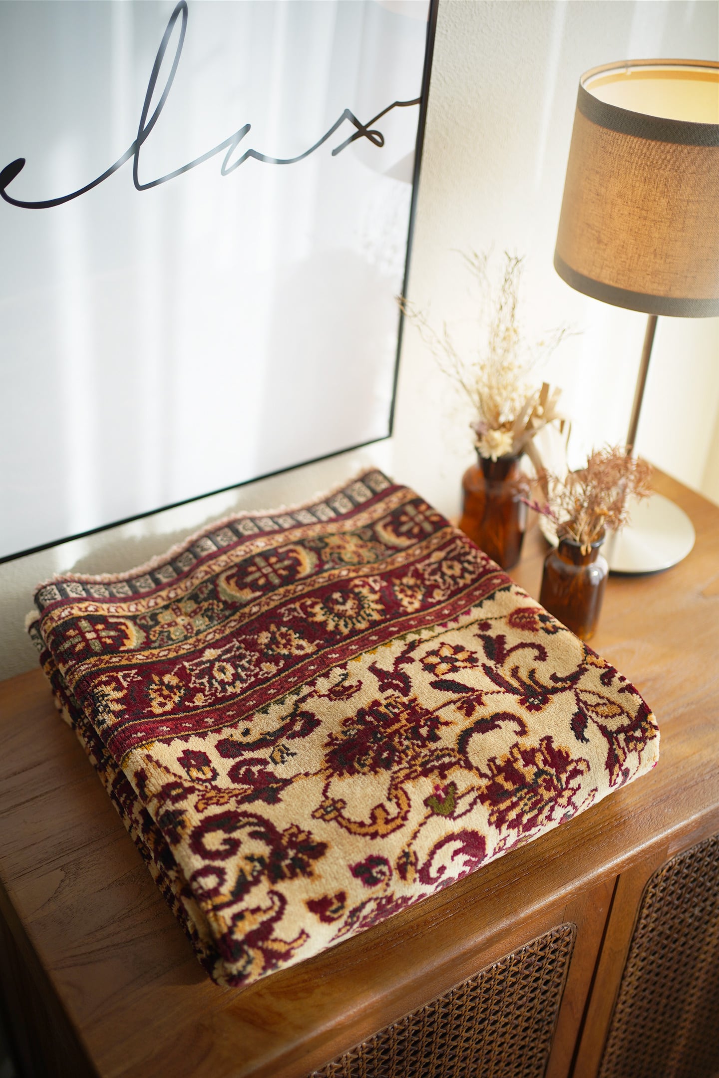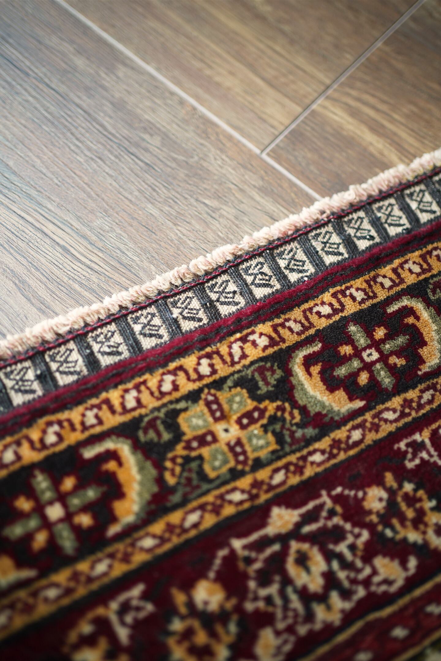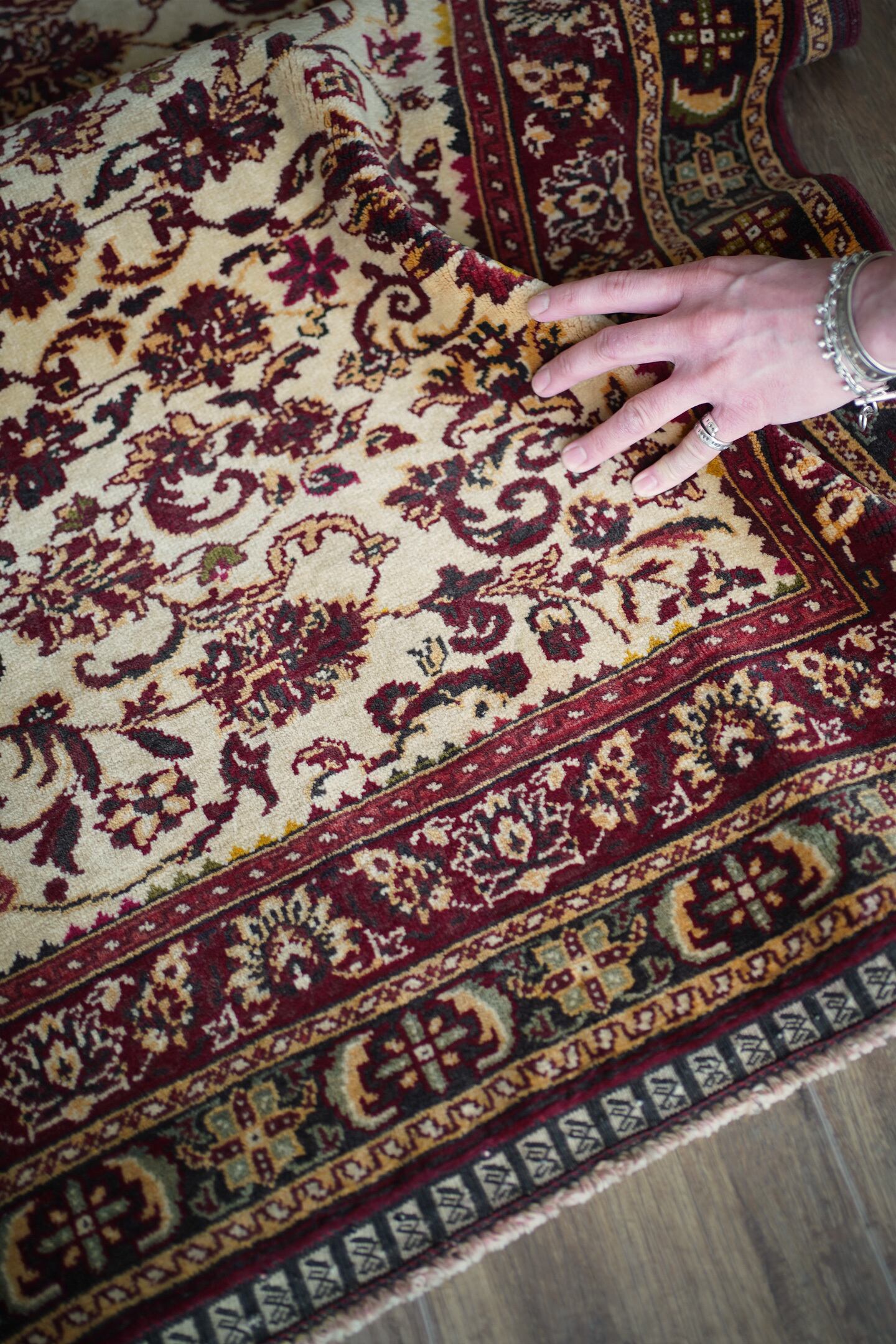 イランの″ Shams abad″という地域で織られたヴィンテージラグです。珍しい花柄デザインと深い赤紫とベージュを基調とした絶妙な配色に、一目見た瞬間心を射抜かれました。仕入れの際にたくさんのラグを見ていますが、このラグは群を抜いて心がときめいた一枚です。現地のセラーから「このラグはかなり高品質のラグだよ」と言われていたのですが、実物は予想を超える素晴らしさでした。表面の毛足は短めながらソフトウールでしっとりもっちり、肌触りも最高。厚みは6mm程度です。コンディションもパーフェクトで、すべてにおいて文句なし。手放すのが非常に惜しいほどの愛しい一枚。滅多に出会えない指折りのラグ、大切にしていただける方へ。