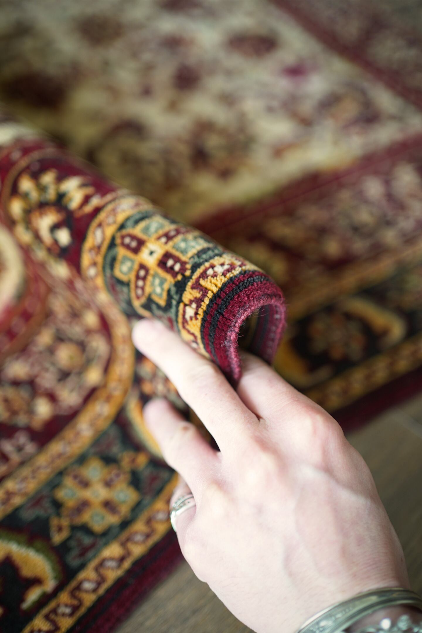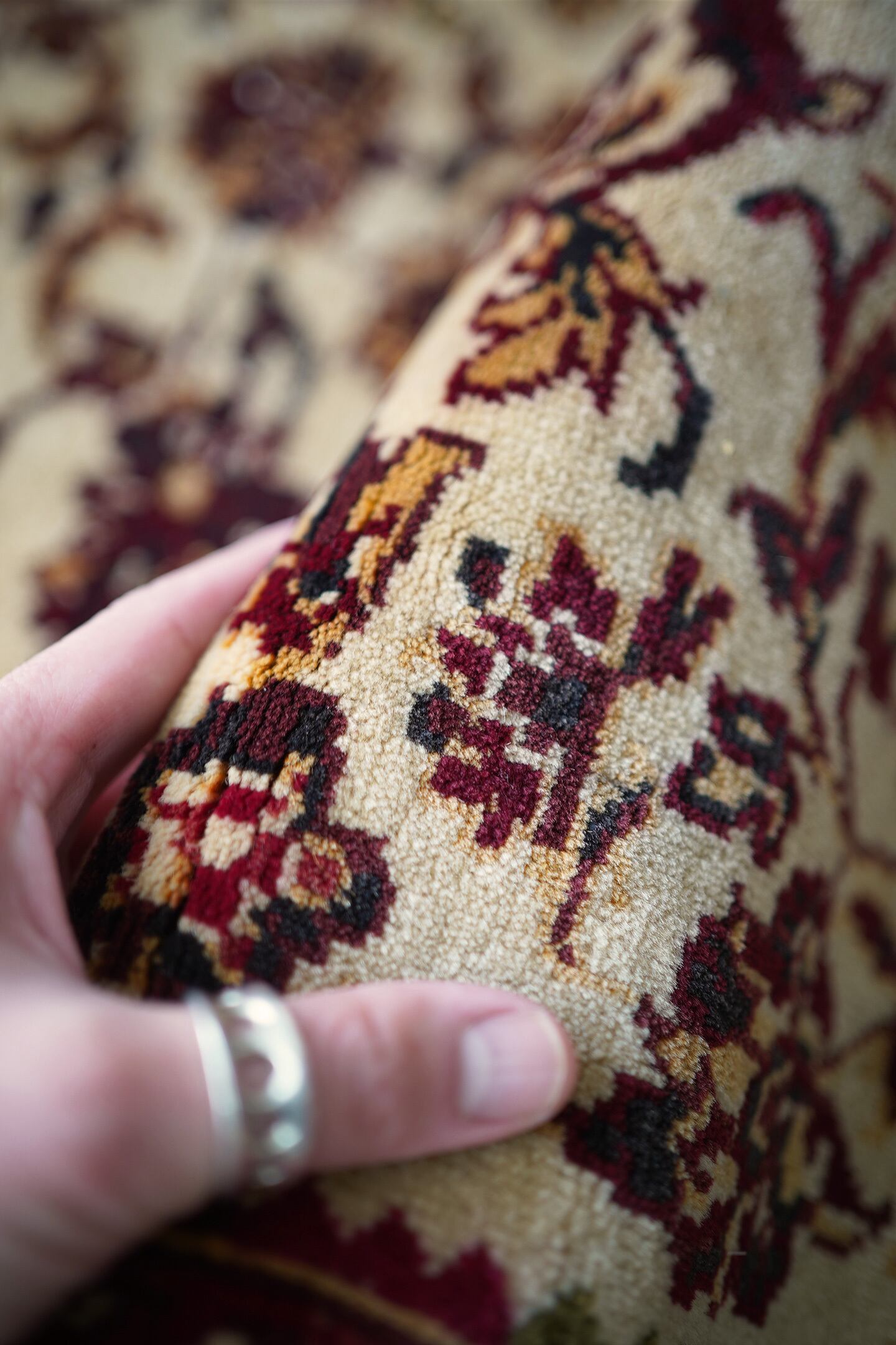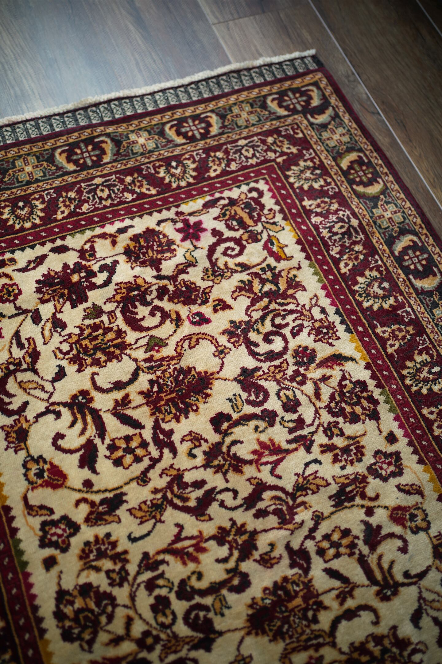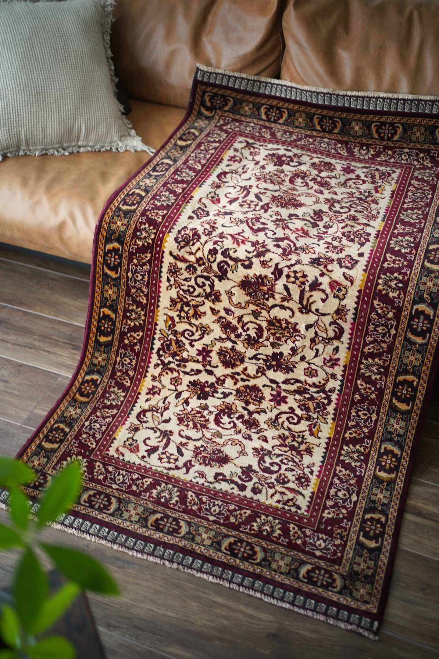 イランの″ Shams abad″という地域で織られたヴィンテージラグです。珍しい花柄デザインと深い赤紫とベージュを基調とした絶妙な配色に、一目見た瞬間心を射抜かれました。仕入れの際にたくさんのラグを見ていますが、このラグは群を抜いて心がときめいた一枚です。現地のセラーから「このラグはかなり高品質のラグだよ」と言われていたのですが、実物は予想を超える素晴らしさでした。表面の毛足は短めながらソフトウールでしっとりもっちり、肌触りも最高。厚みは6mm程度です。コンディションもパーフェクトで、すべてにおいて文句なし。手放すのが非常に惜しいほどの愛しい一枚。滅多に出会えない指折りのラグ、大切にしていただける方へ。
