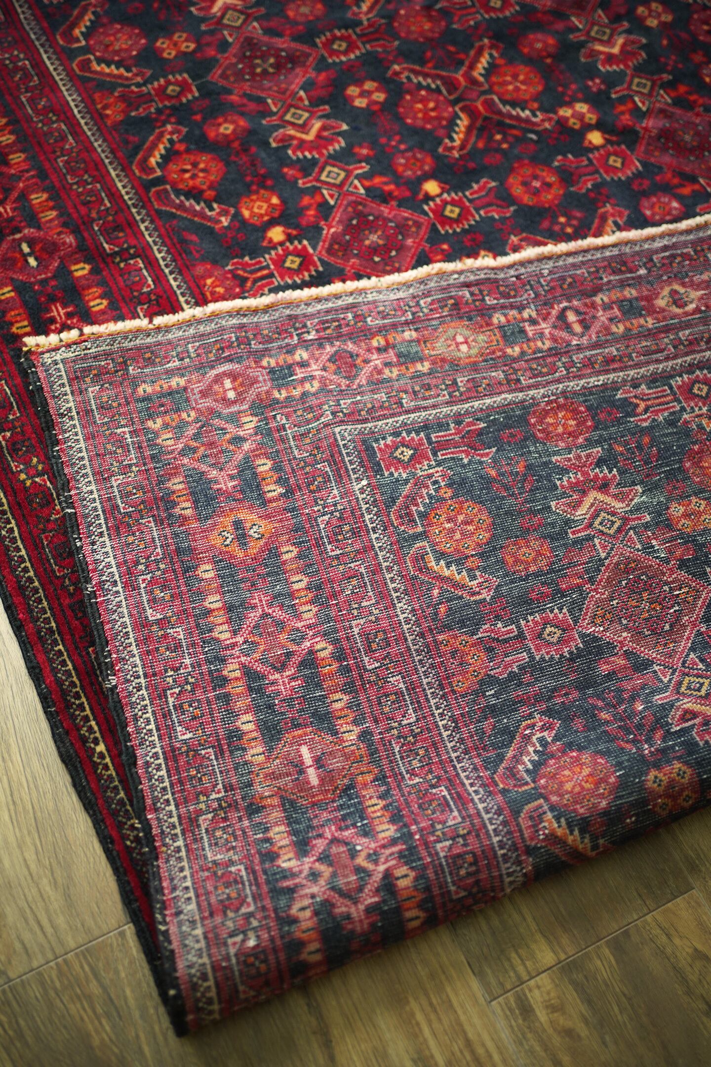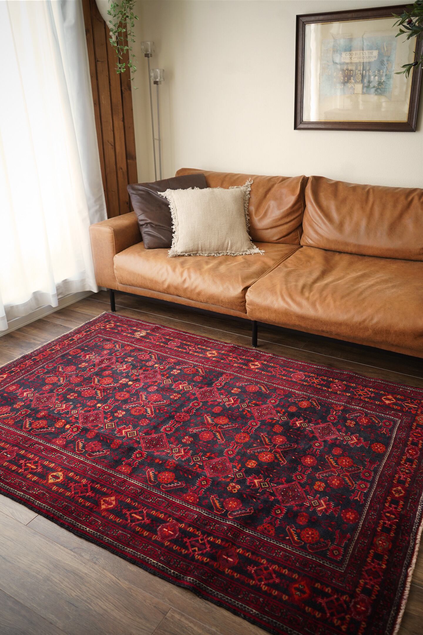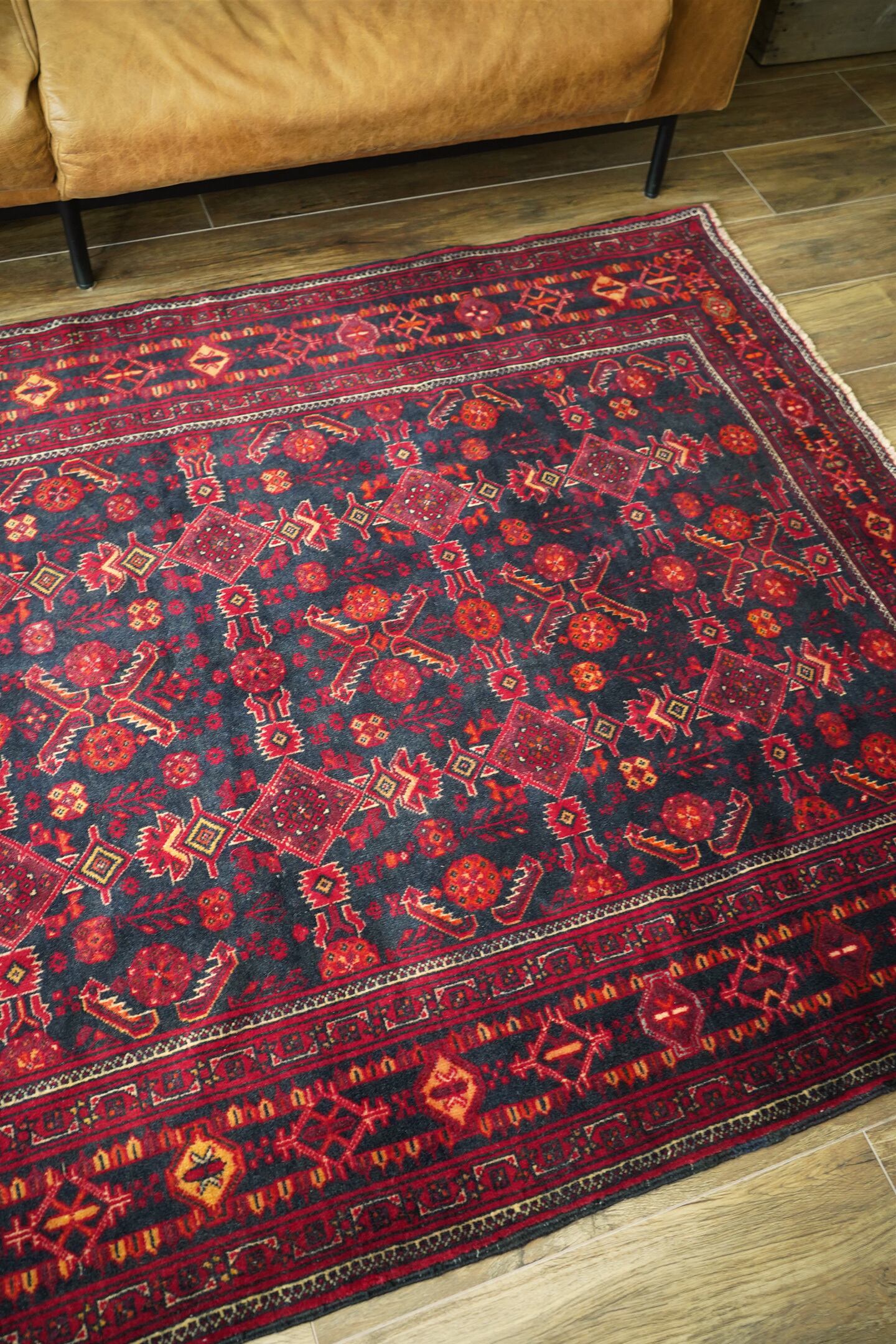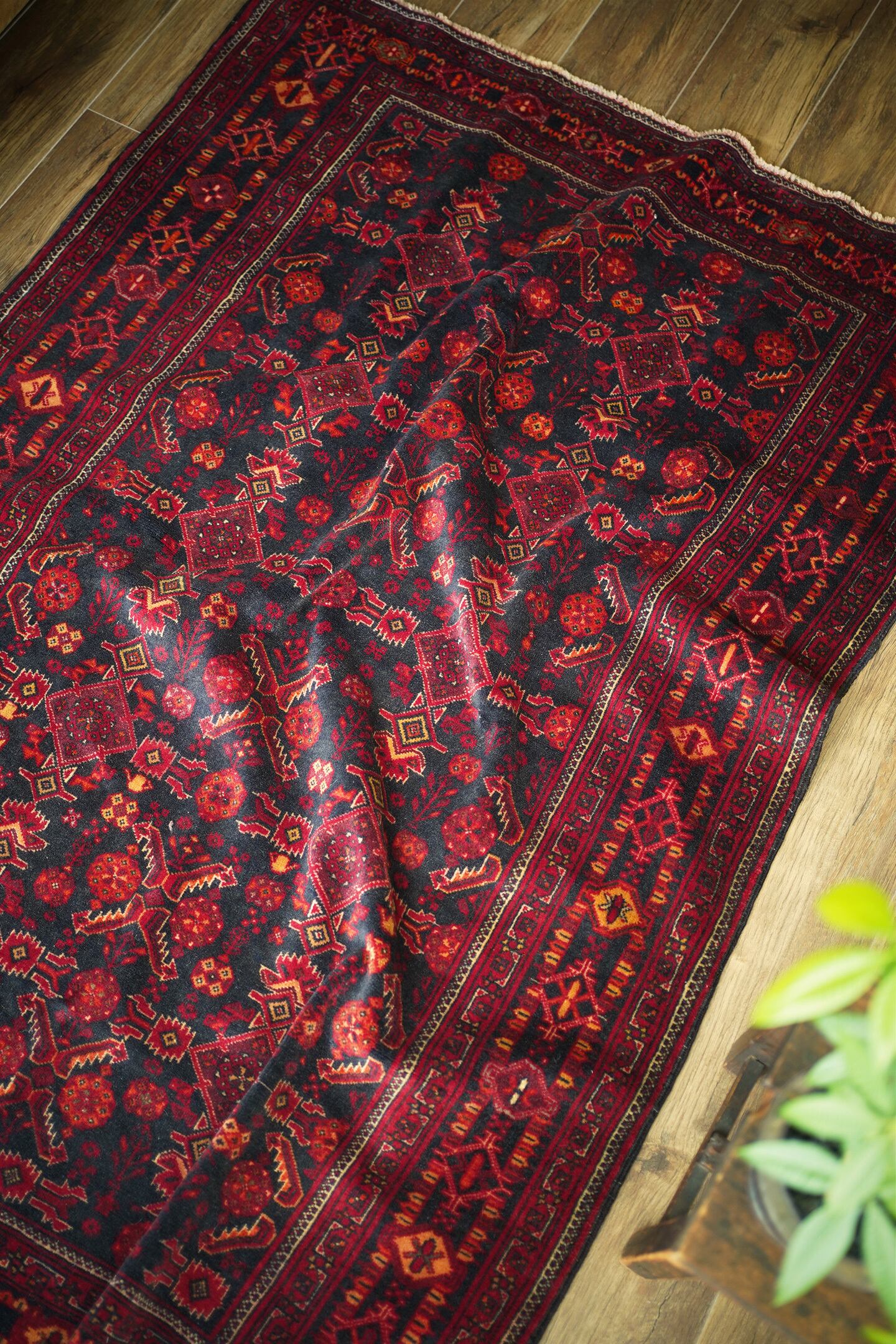 約50年前にイラン南東部のシスターン地方で織られたヴィンテージのバルーチラグ。深みのある赤と黒のシックでカッコいい配色、かつバランスの取れたデザインのため、ヴィンテージラグが初めての方にもお部屋に取り入れやすい一枚かと思います。厚みは5mm〜6mm程度。表面の毛並みは短めながら、ソフトウールでサラふわっとした柔らかい肌触りですので、通年で非常に気持ちよく敷いていただけます。状態も大変良好。リビングのソファ前やダイニングテーブル下、書斎や寝室などにどうぞ。