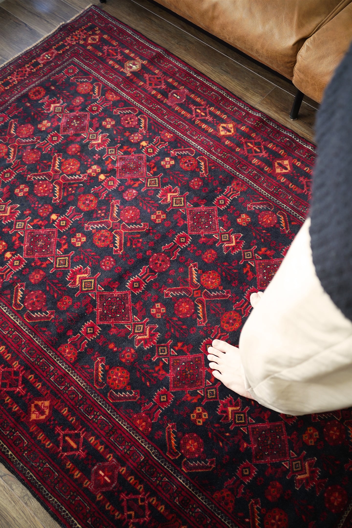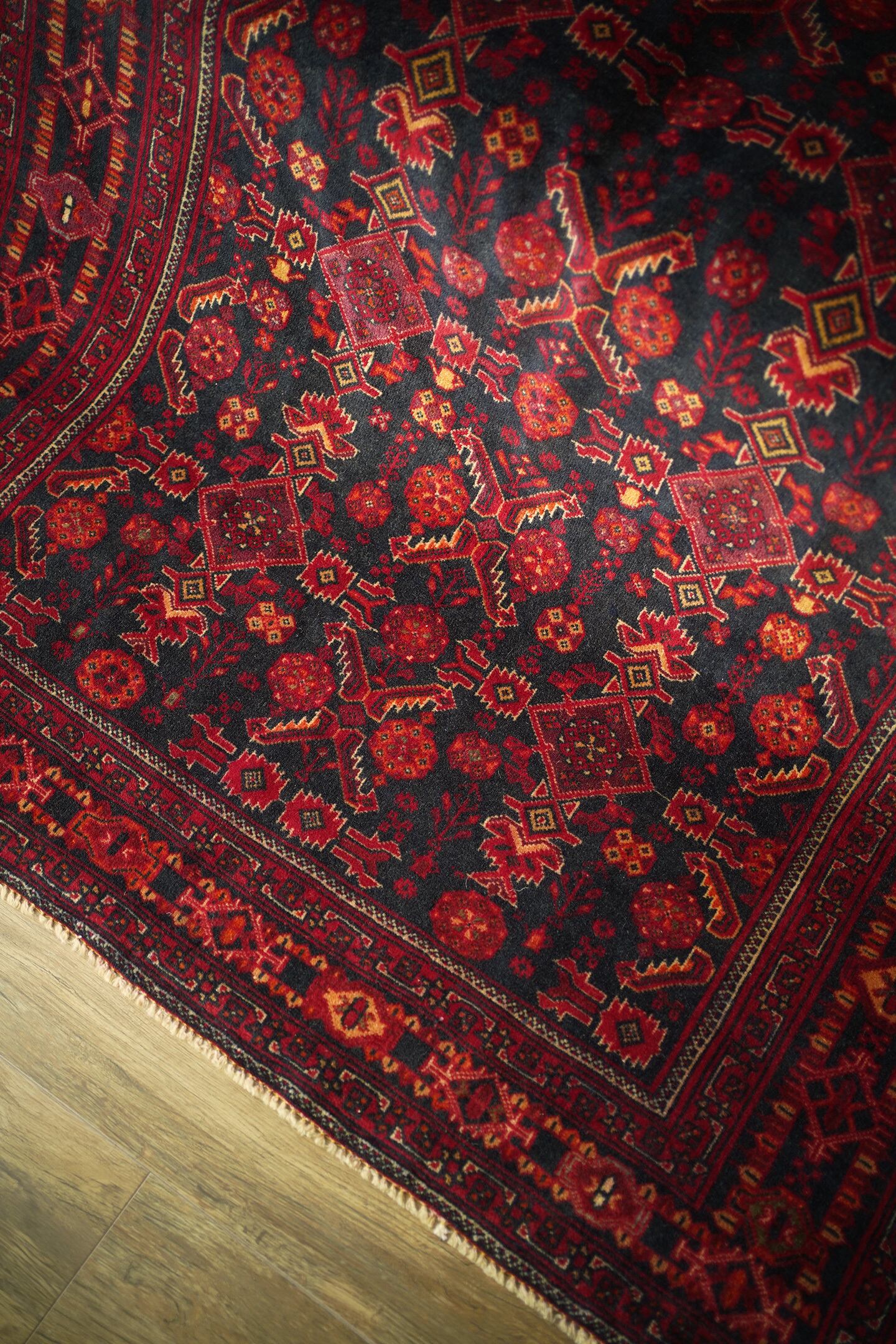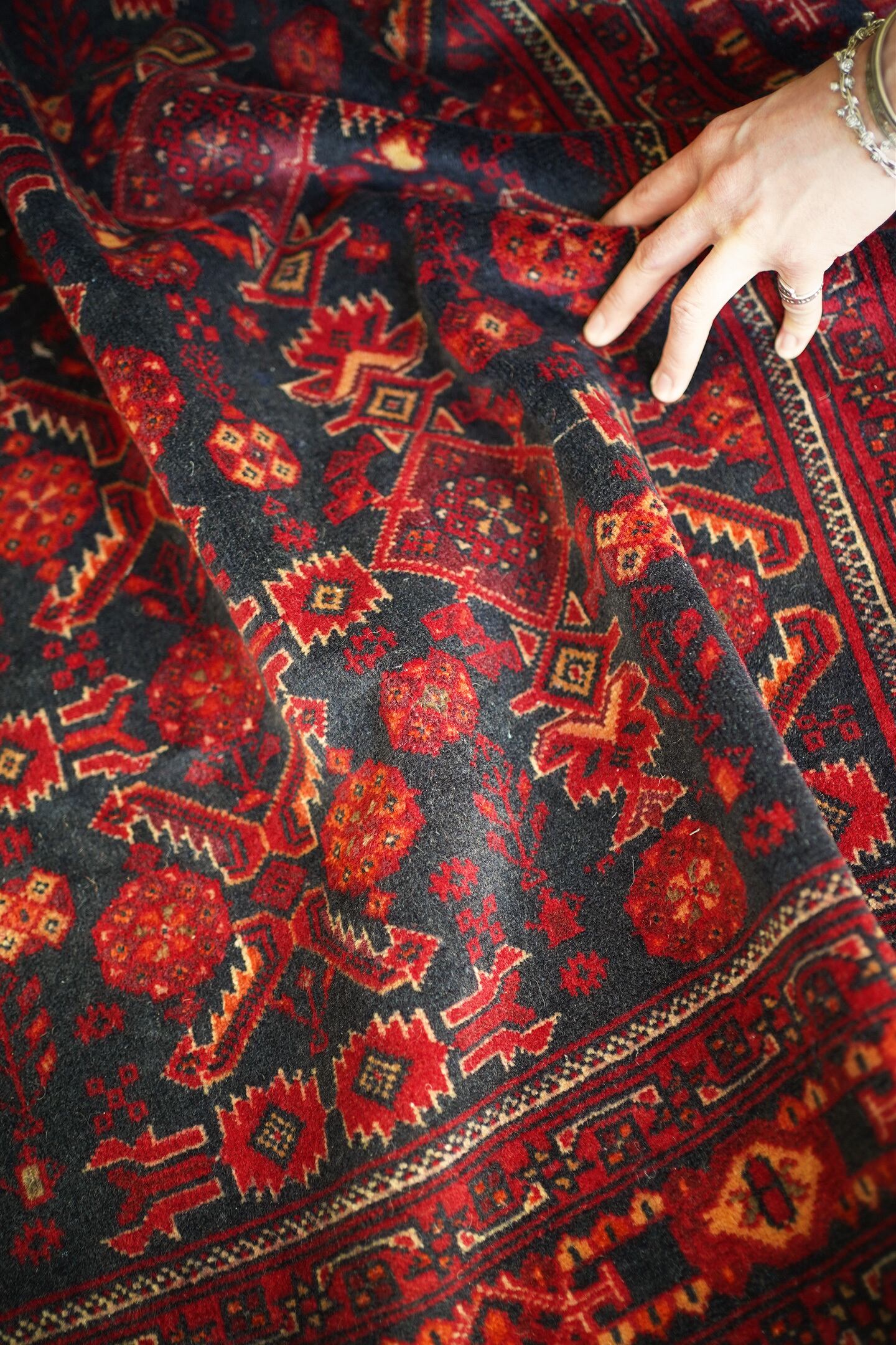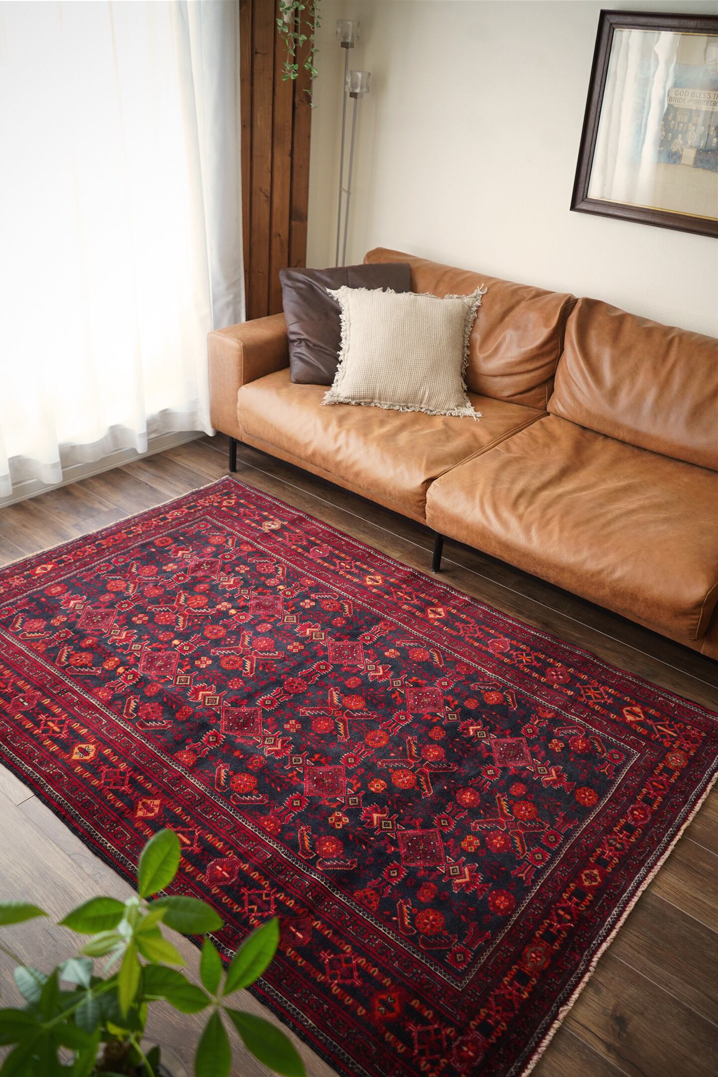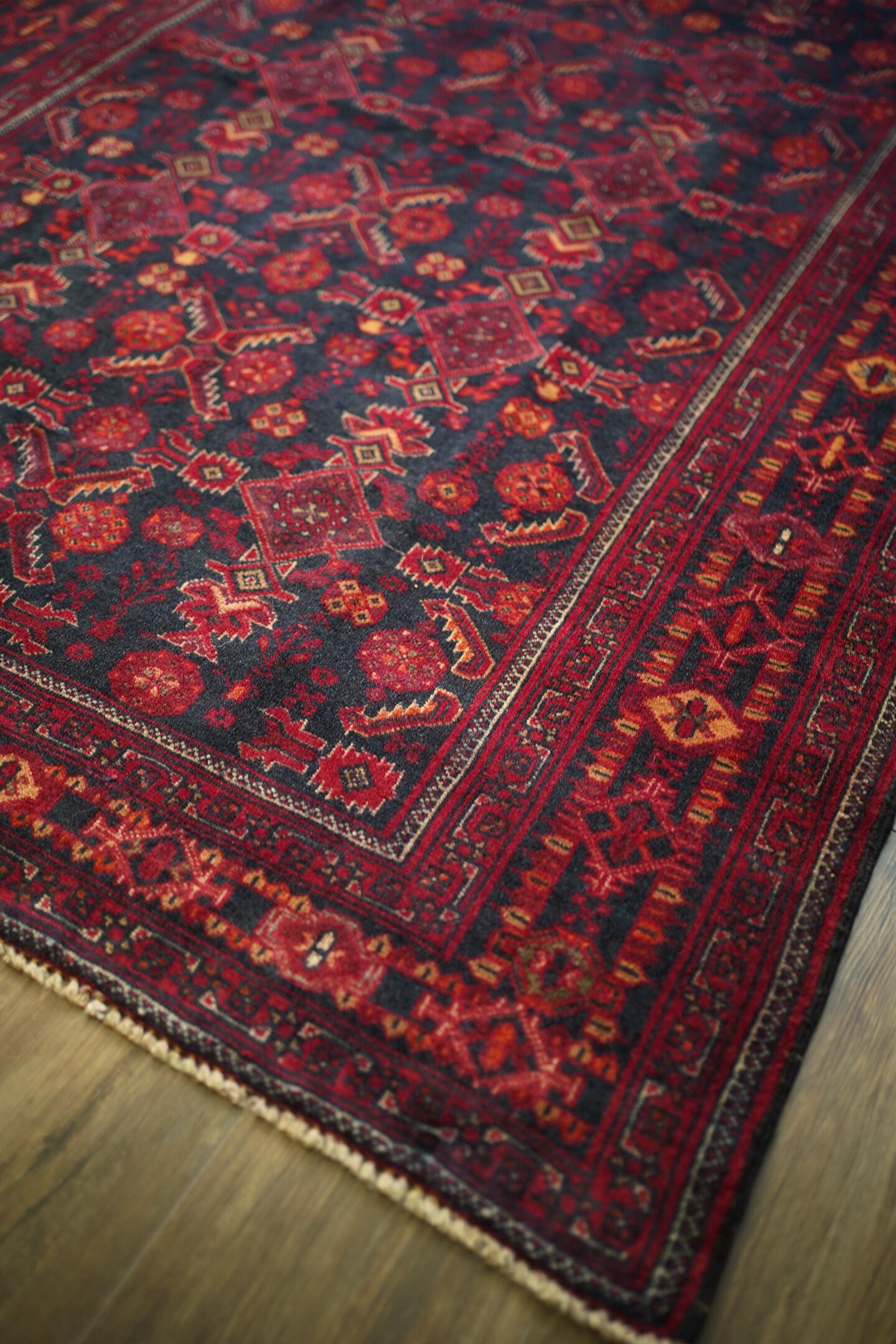 約50年前にイラン南東部のシスターン地方で織られたヴィンテージのバルーチラグ。深みのある赤と黒のシックでカッコいい配色、かつバランスの取れたデザインのため、ヴィンテージラグが初めての方にもお部屋に取り入れやすい一枚かと思います。厚みは5mm〜6mm程度。表面の毛並みは短めながら、ソフトウールでサラふわっとした柔らかい肌触りですので、通年で非常に気持ちよく敷いていただけます。状態も大変良好。リビングのソファ前やダイニングテーブル下、書斎や寝室などにどうぞ。
