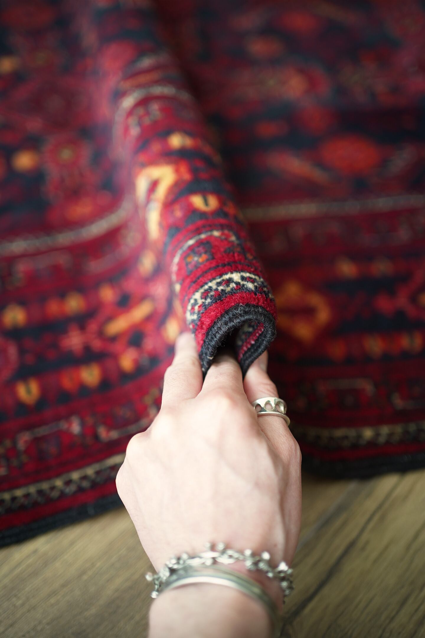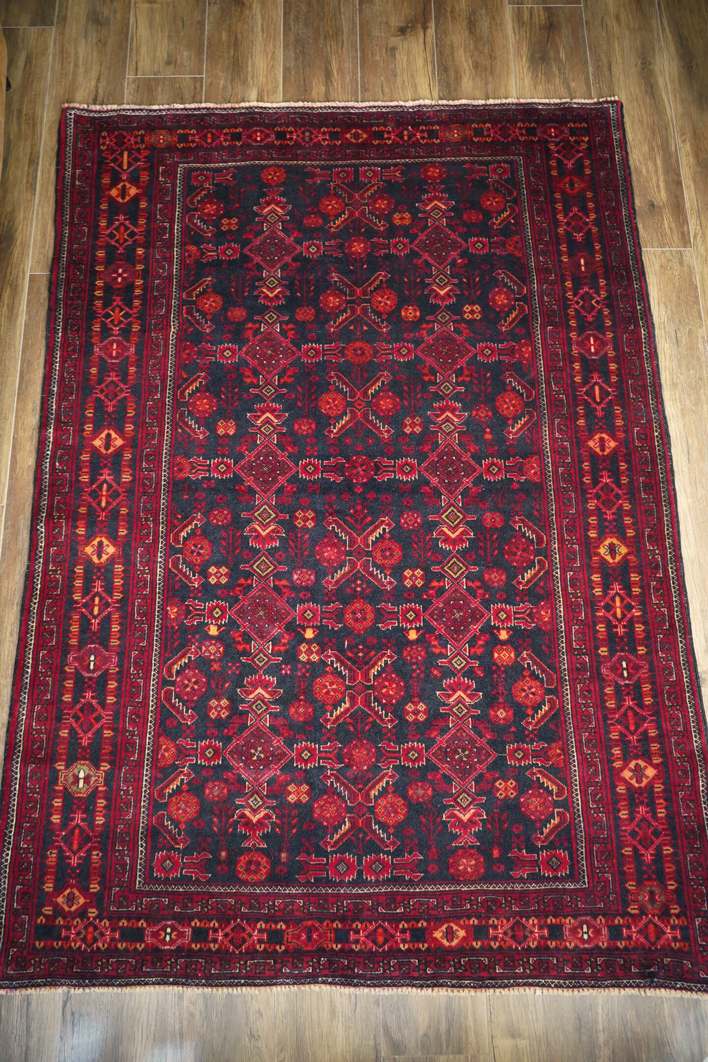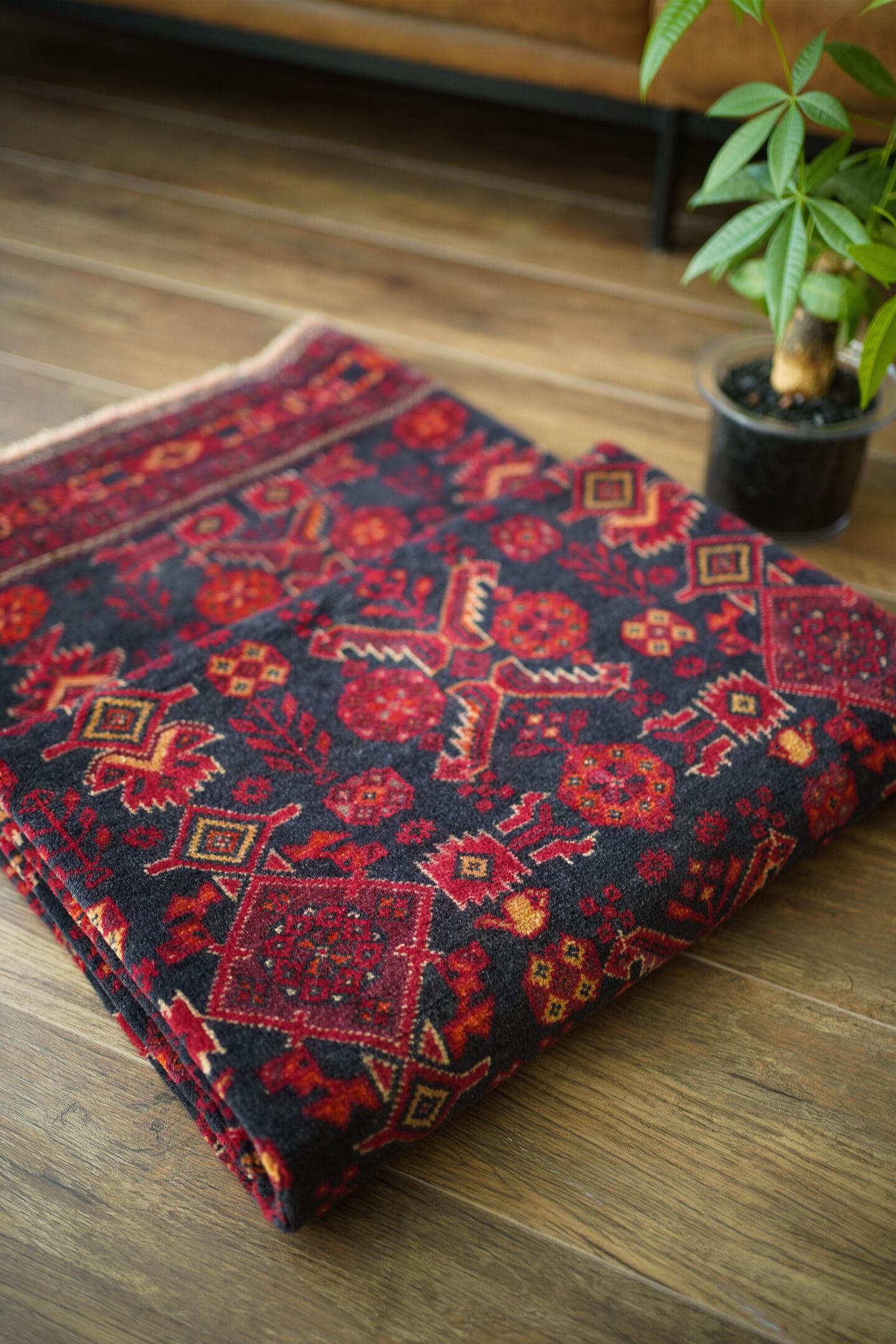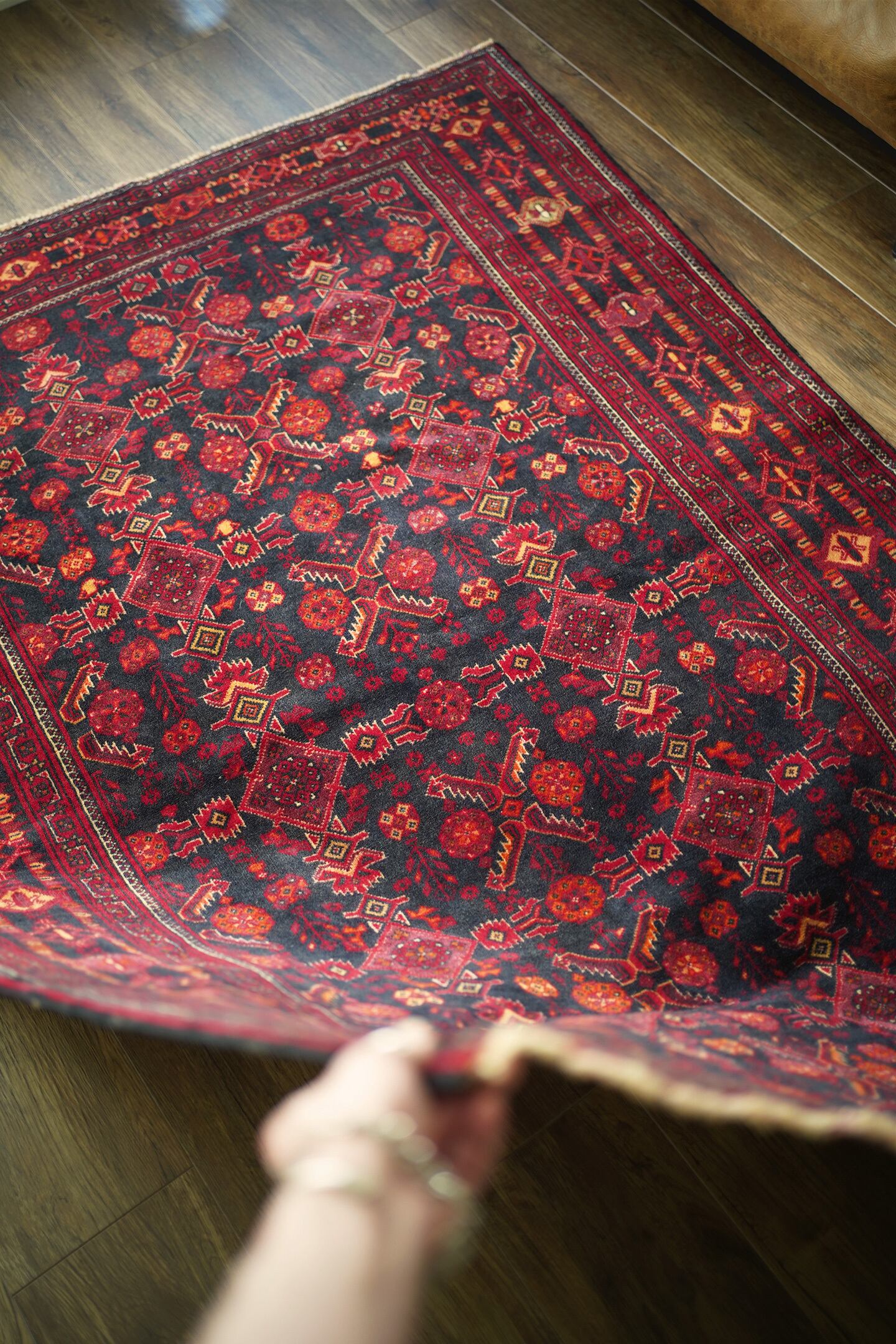 約50年前にイラン南東部のシスターン地方で織られたヴィンテージのバルーチラグ。深みのある赤と黒のシックでカッコいい配色、かつバランスの取れたデザインのため、ヴィンテージラグが初めての方にもお部屋に取り入れやすい一枚かと思います。厚みは5mm〜6mm程度。表面の毛並みは短めながら、ソフトウールでサラふわっとした柔らかい肌触りですので、通年で非常に気持ちよく敷いていただけます。状態も大変良好。リビングのソファ前やダイニングテーブル下、書斎や寝室などにどうぞ。