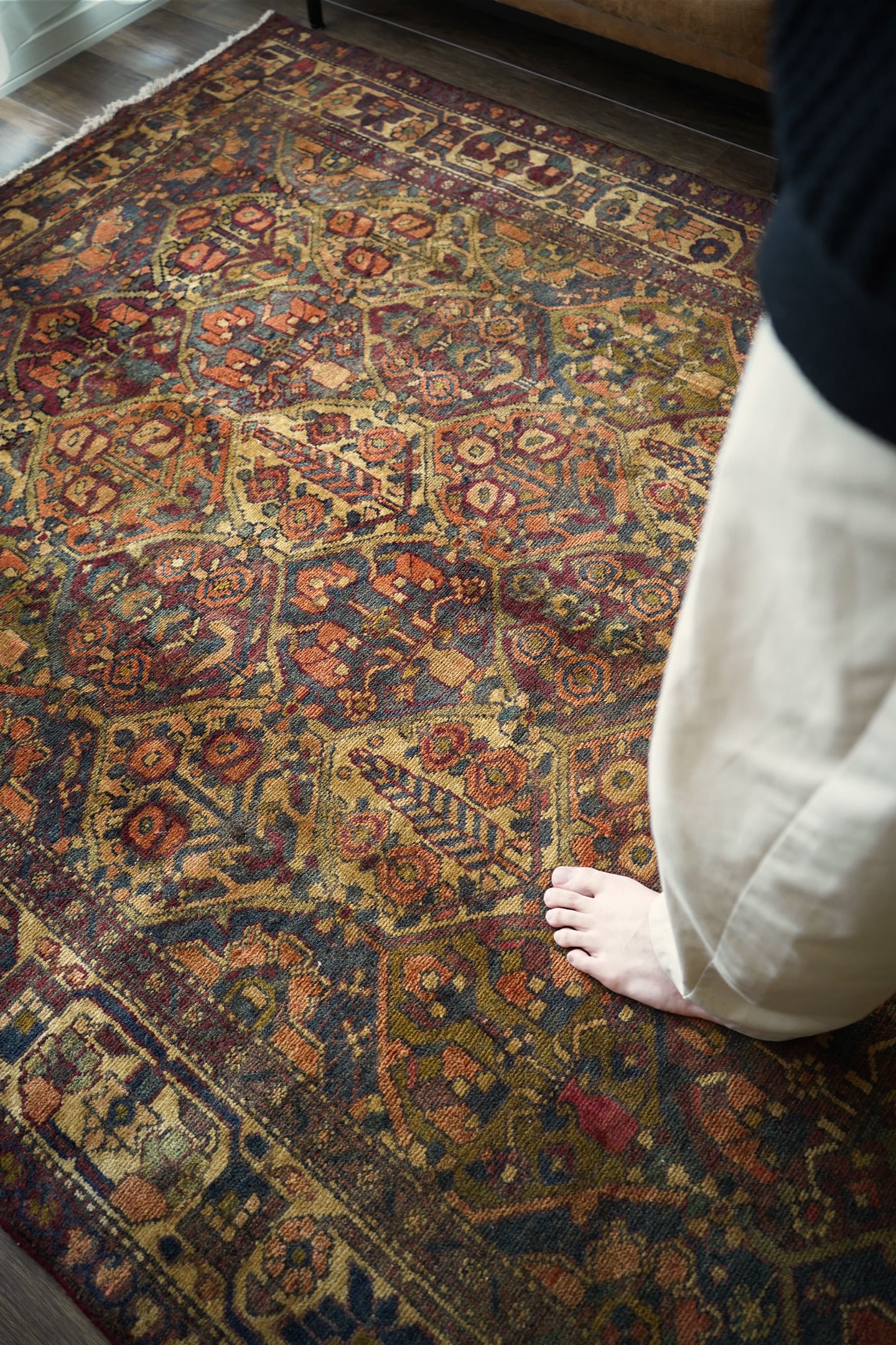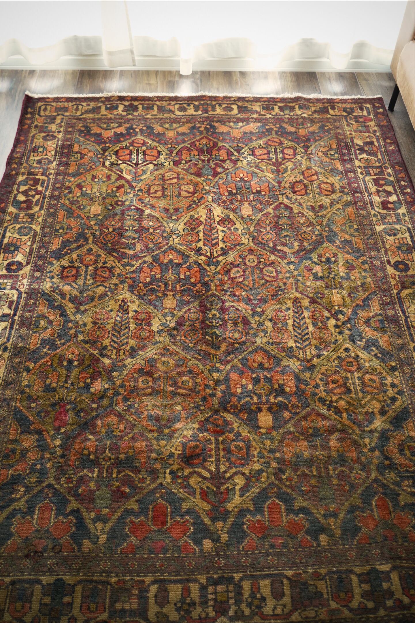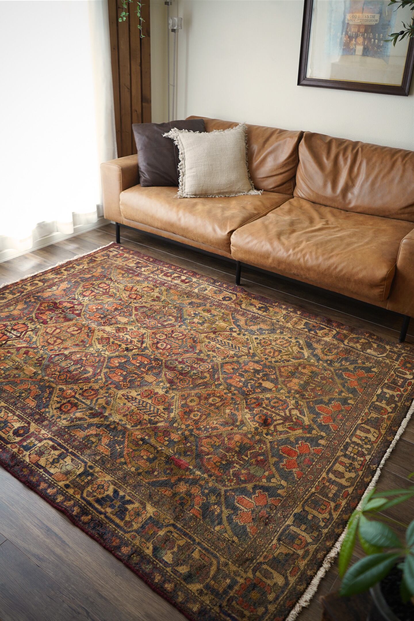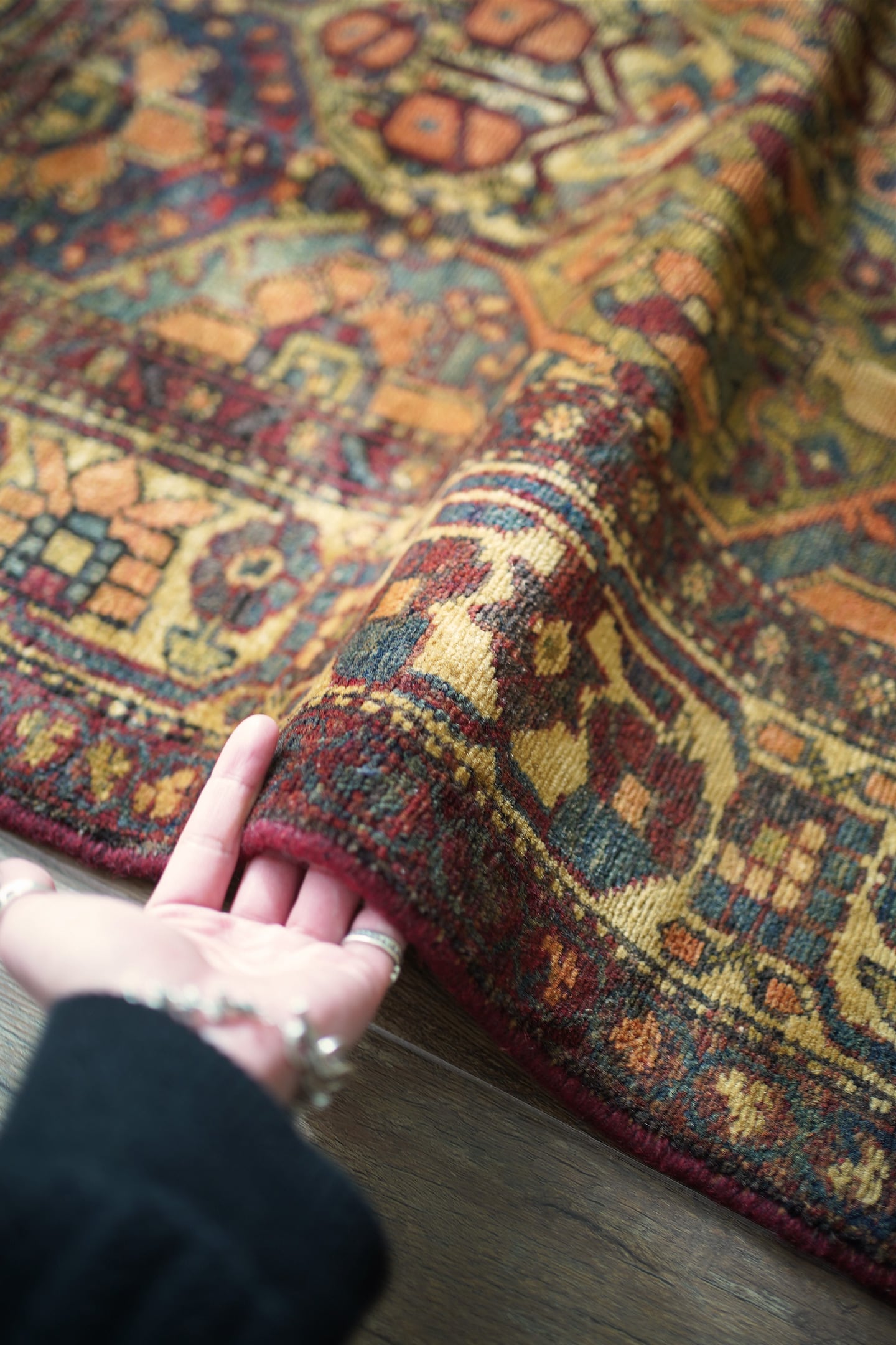 イラン西部、ザクロス山脈周辺の高原地域に住むバクティアリ族によって織られたラグです。"char mahal"と呼ばれる四季を意味するデザインで、様々な種類の美しい花の紋様が織り込まれています。上染めによって、黄味掛かった深みのあるブラウンカラーのような渋い色合いに調整しているため、お部屋に馴染みやすい配色となっています。またフレーム部分の赤紫色も店主の好きなポイント。厚みは7mm程度、表面のパイルはふわサラッとした肌触りで通年で気持ちよく敷いていただける質感です。状態も大変良好。リビングのソファ前やダイニングテーブル下、ベッドルームなどお好みのスペースに。