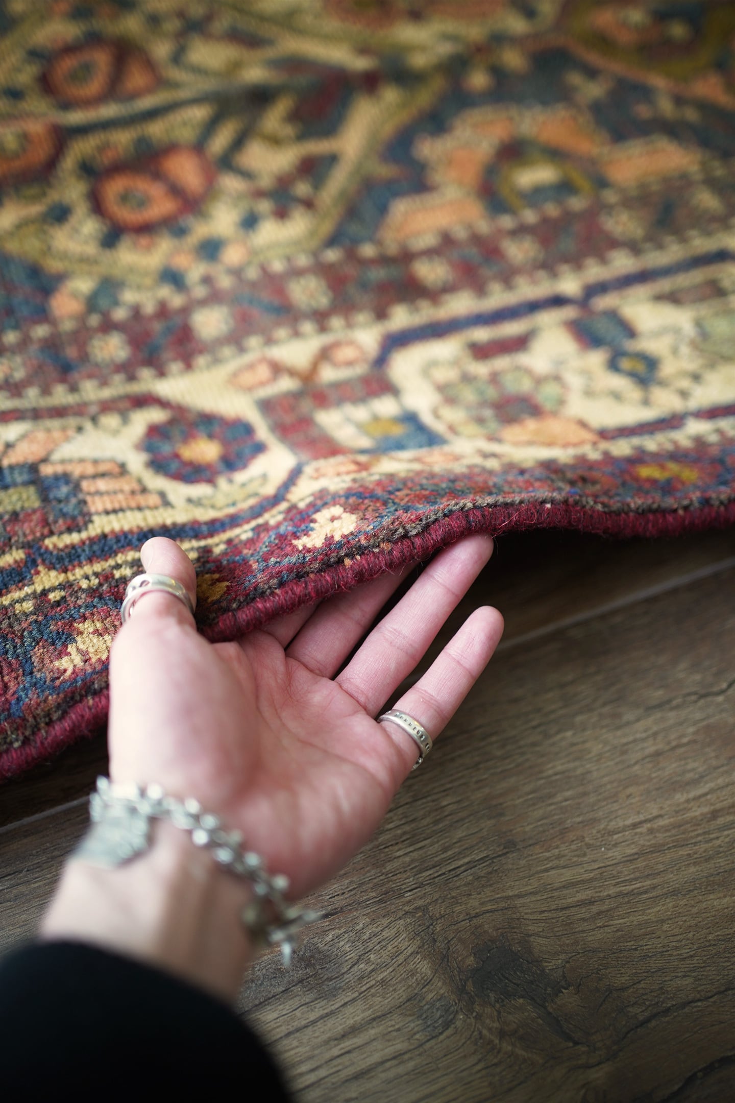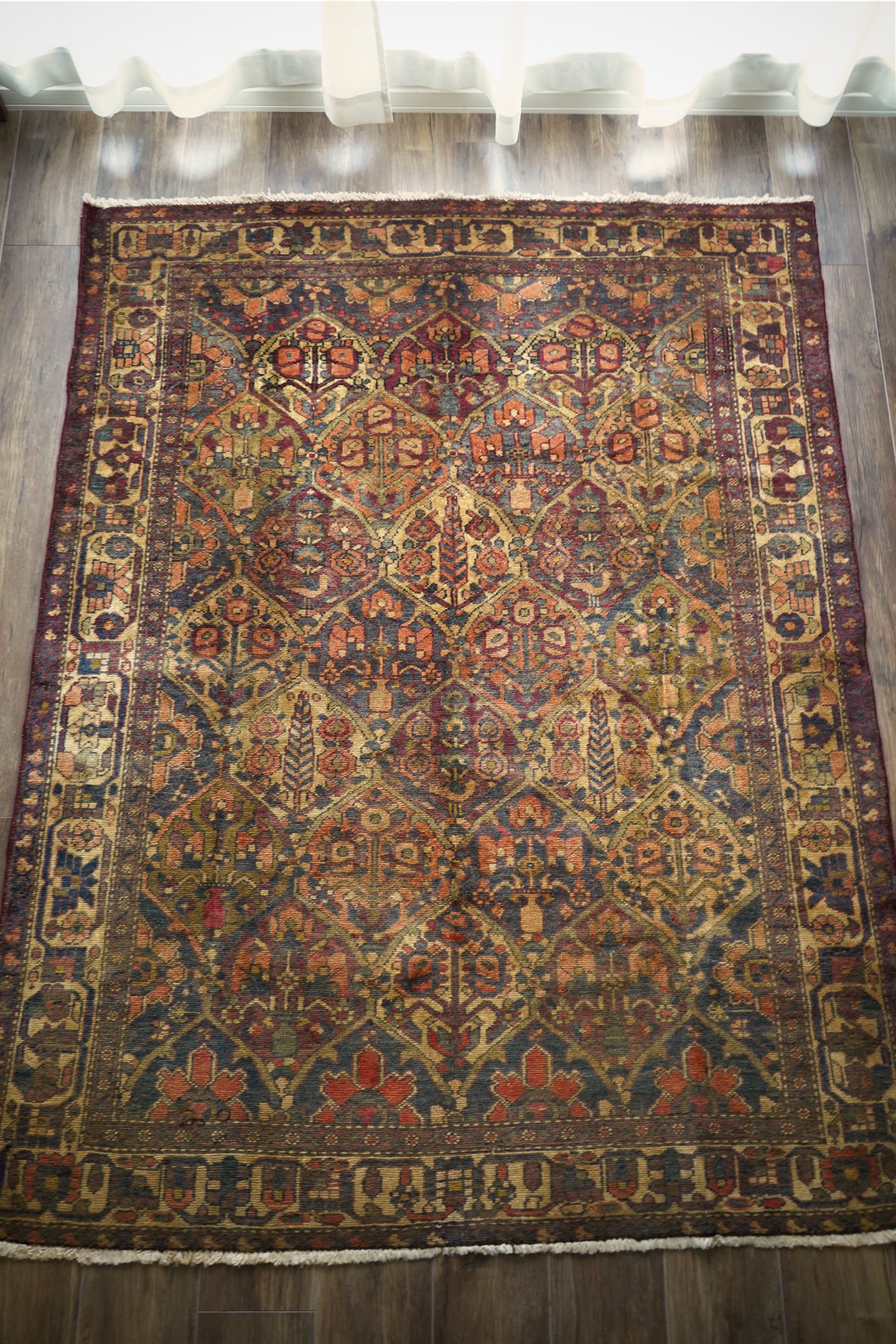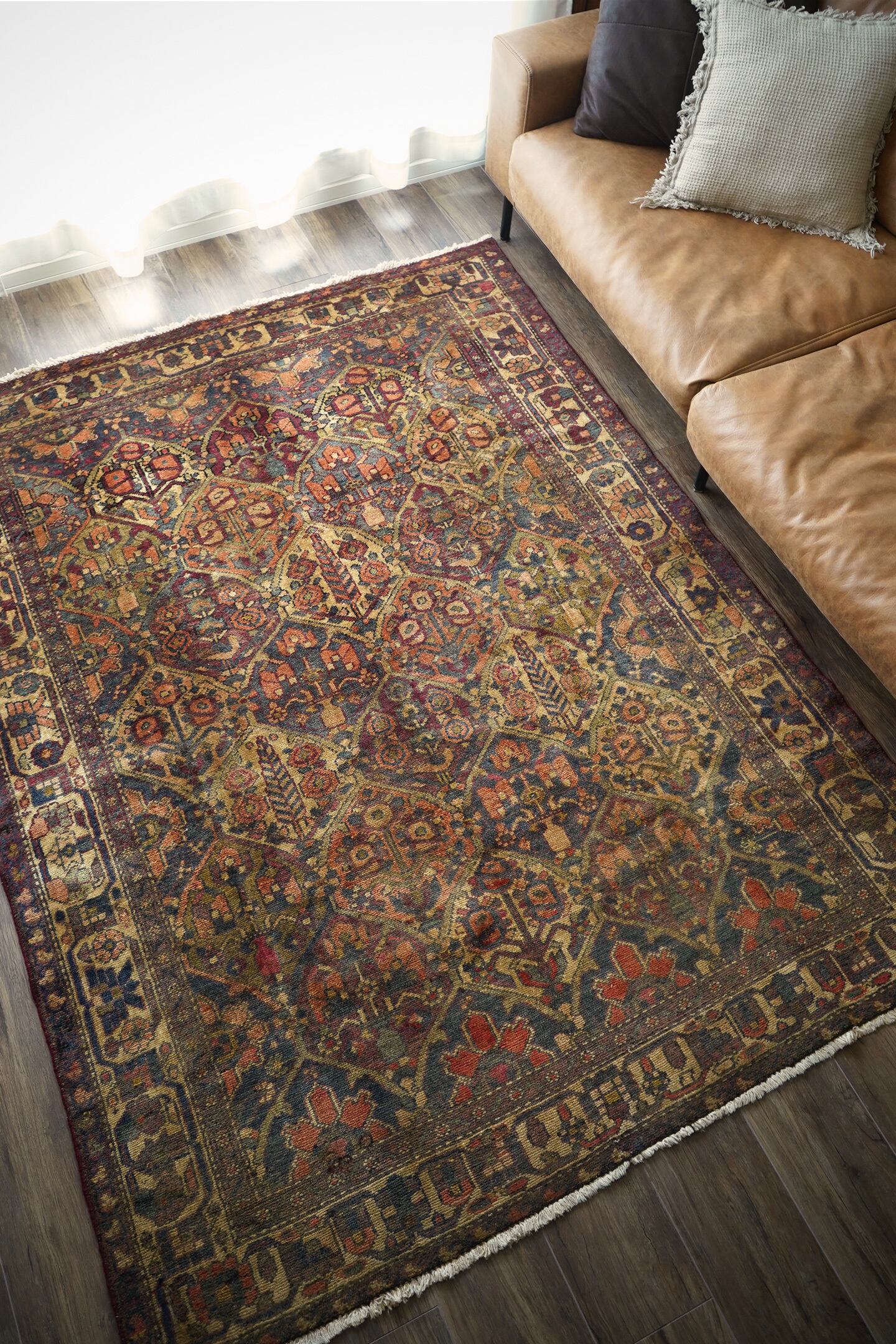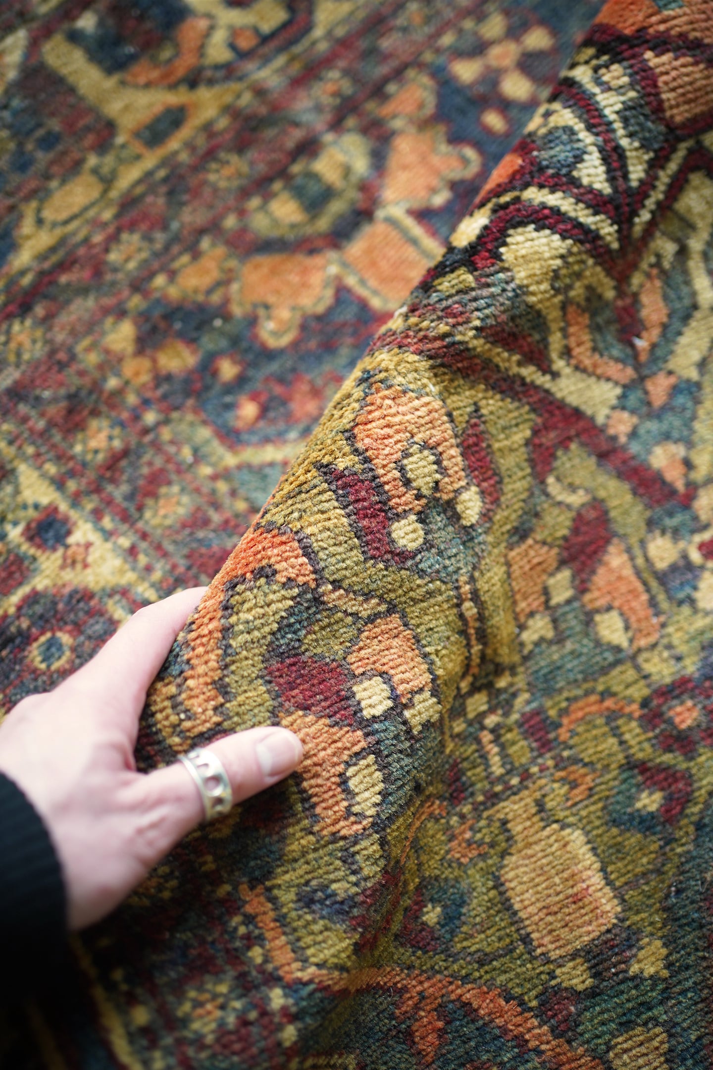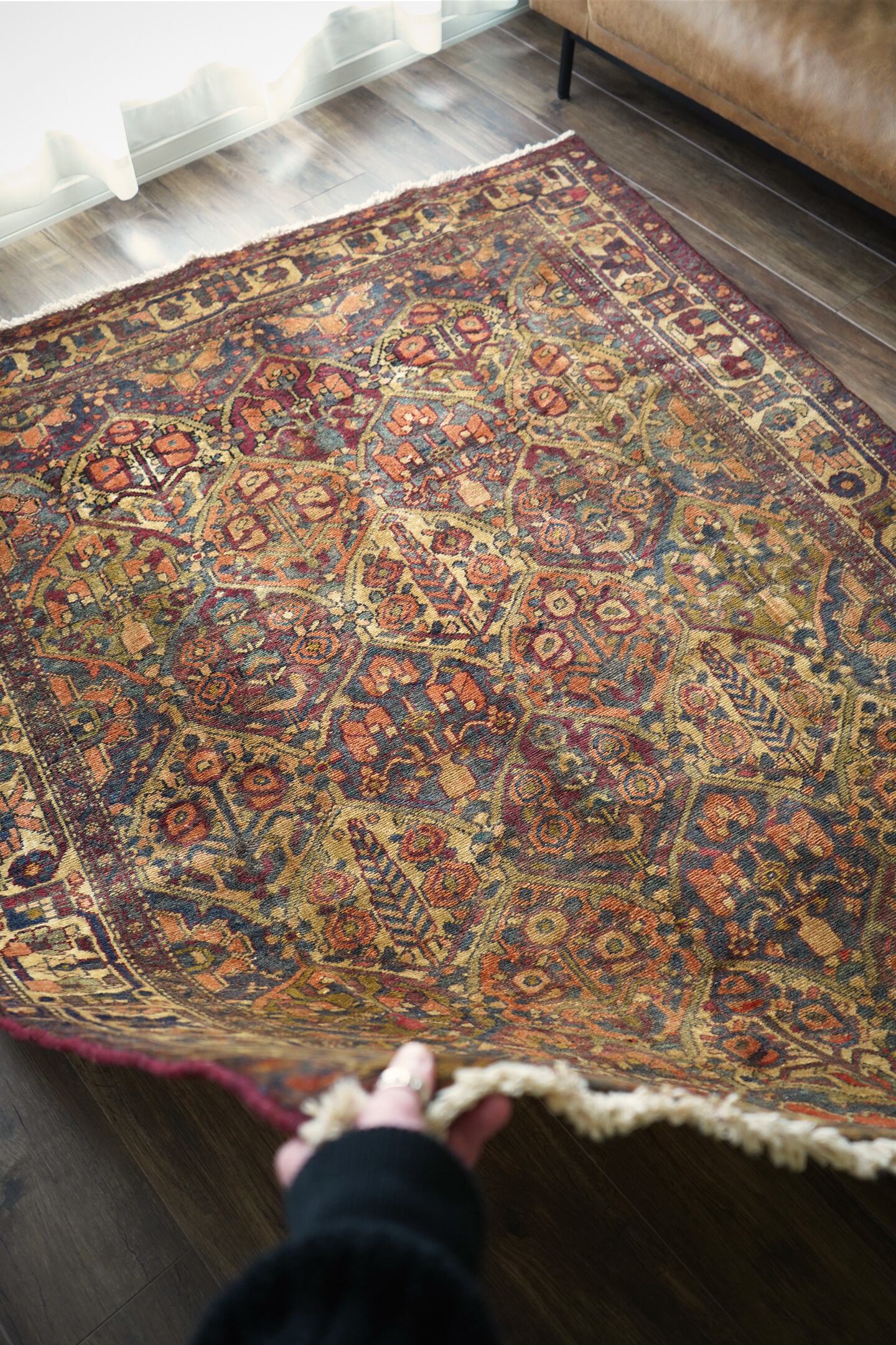 イラン西部、ザクロス山脈周辺の高原地域に住むバクティアリ族によって織られたラグです。"char mahal"と呼ばれる四季を意味するデザインで、様々な種類の美しい花の紋様が織り込まれています。上染めによって、黄味掛かった深みのあるブラウンカラーのような渋い色合いに調整しているため、お部屋に馴染みやすい配色となっています。またフレーム部分の赤紫色も店主の好きなポイント。厚みは7mm程度、表面のパイルはふわサラッとした肌触りで通年で気持ちよく敷いていただける質感です。状態も大変良好。リビングのソファ前やダイニングテーブル下、ベッドルームなどお好みのスペースに。