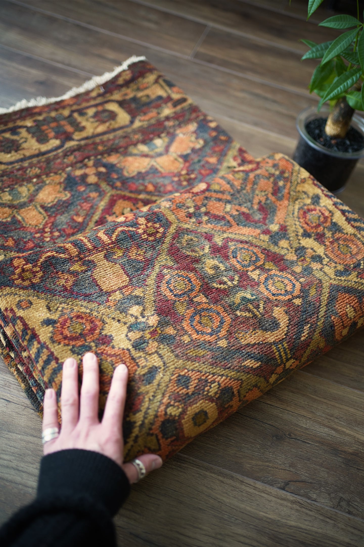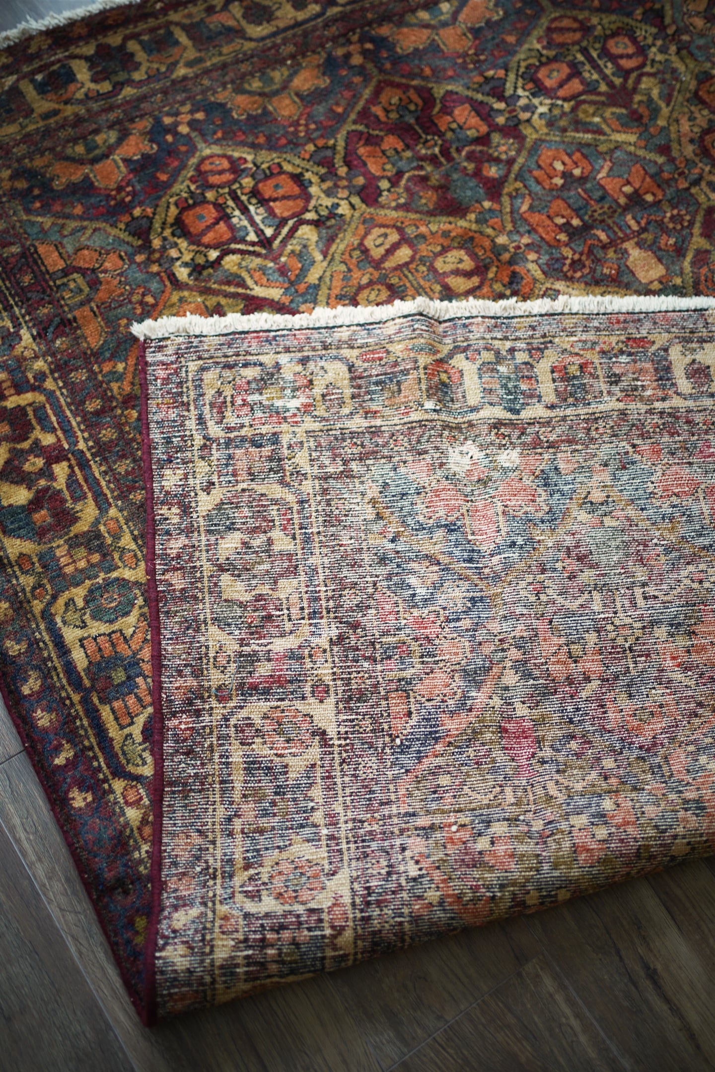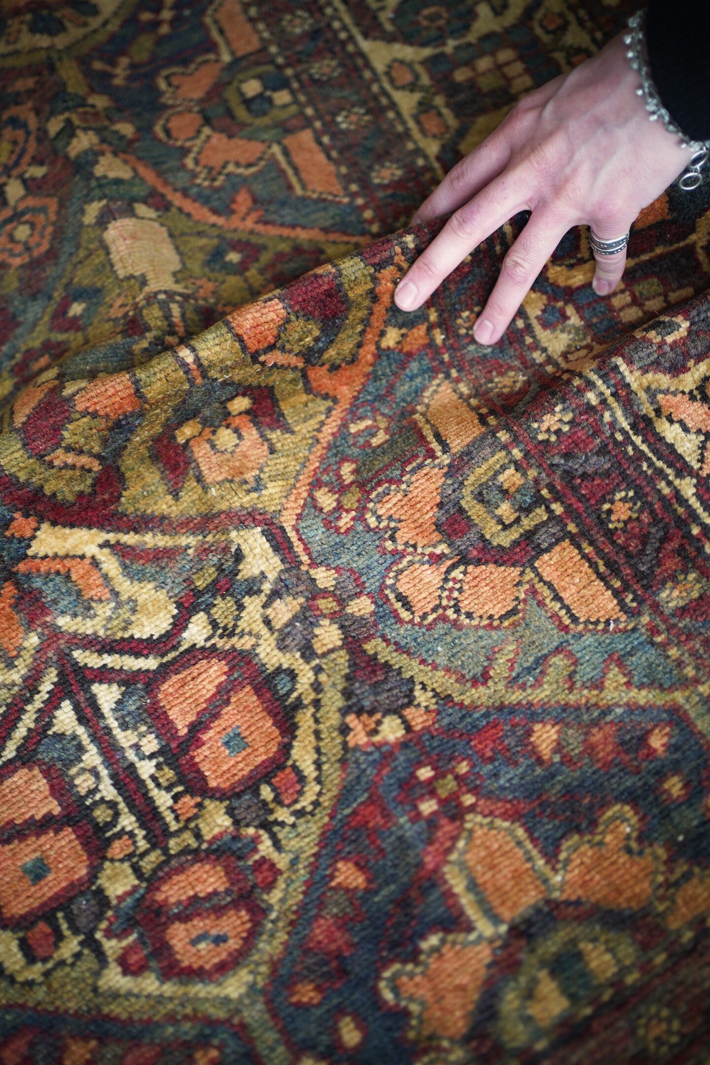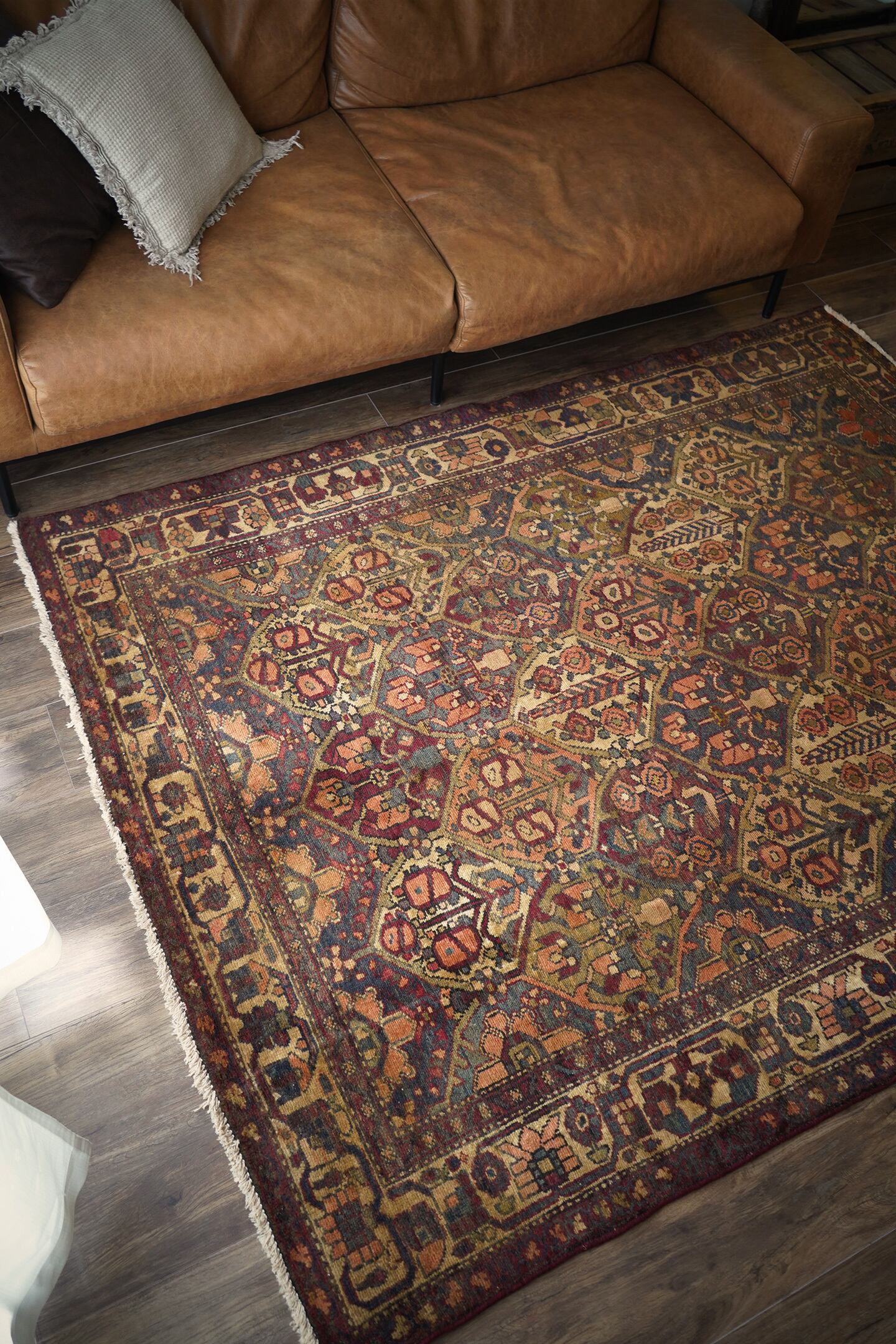 イラン西部、ザクロス山脈周辺の高原地域に住むバクティアリ族によって織られたラグです。"char mahal"と呼ばれる四季を意味するデザインで、様々な種類の美しい花の紋様が織り込まれています。上染めによって、黄味掛かった深みのあるブラウンカラーのような渋い色合いに調整しているため、お部屋に馴染みやすい配色となっています。またフレーム部分の赤紫色も店主の好きなポイント。厚みは7mm程度、表面のパイルはふわサラッとした肌触りで通年で気持ちよく敷いていただける質感です。状態も大変良好。リビングのソファ前やダイニングテーブル下、ベッドルームなどお好みのスペースに。