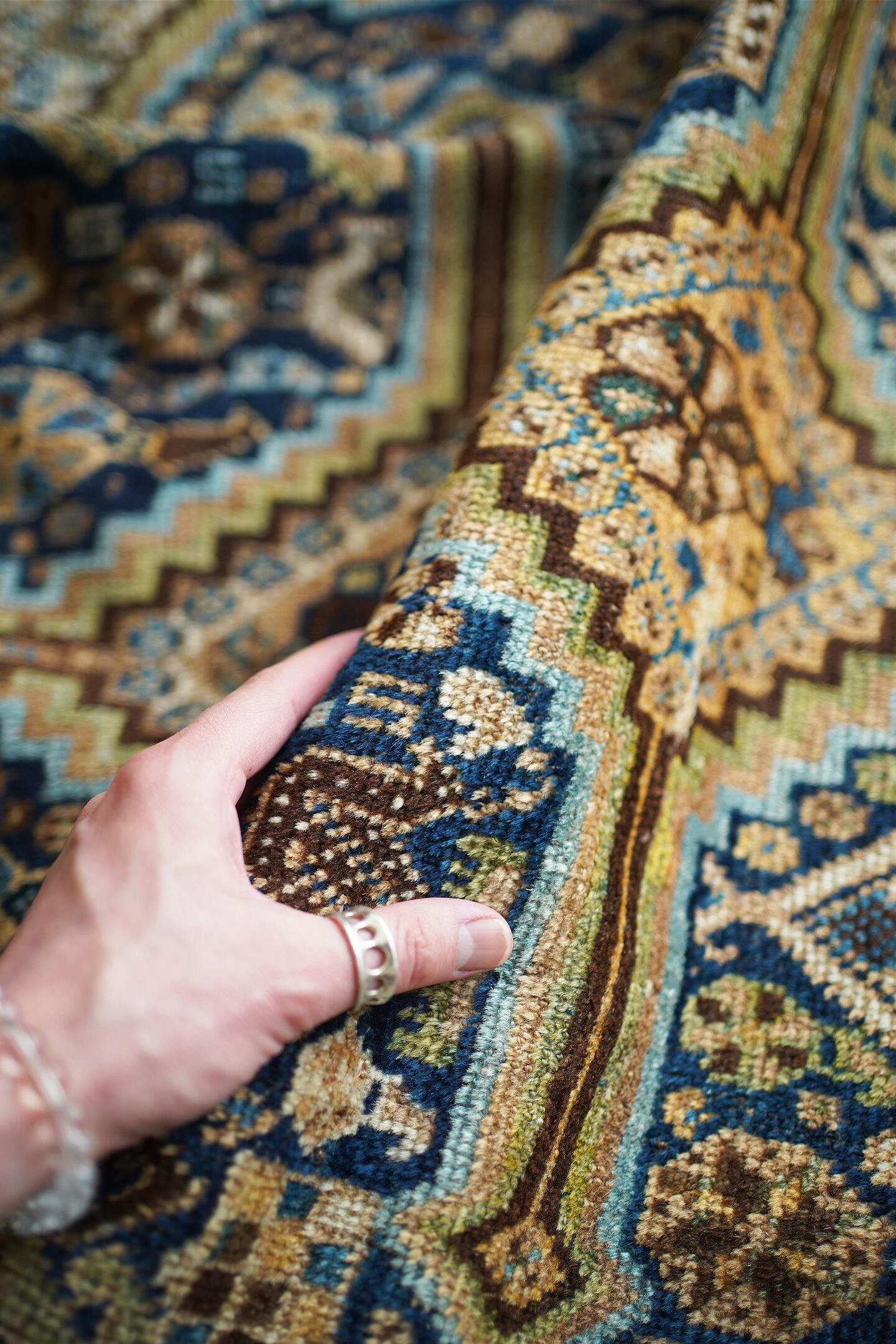 その他にもユルドゥズと呼ばれる幸運の象徴を意味する八角星、魔除を意味する"狼の足跡"や"狼の口(クルトアージュ)"、糸杉の紋様などが芸術的に織り込まれており、宝石箱のような美しさを醸し出しています。