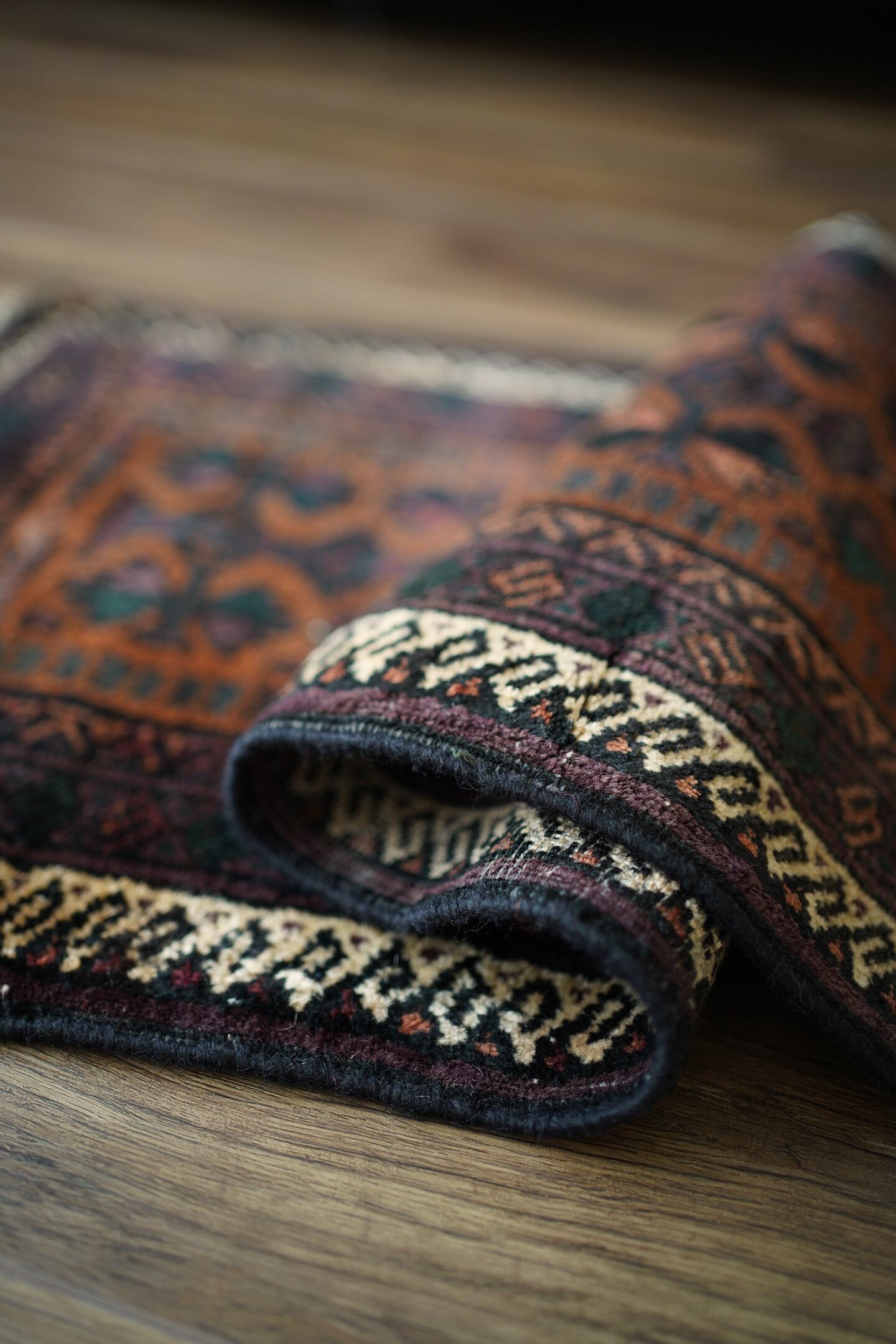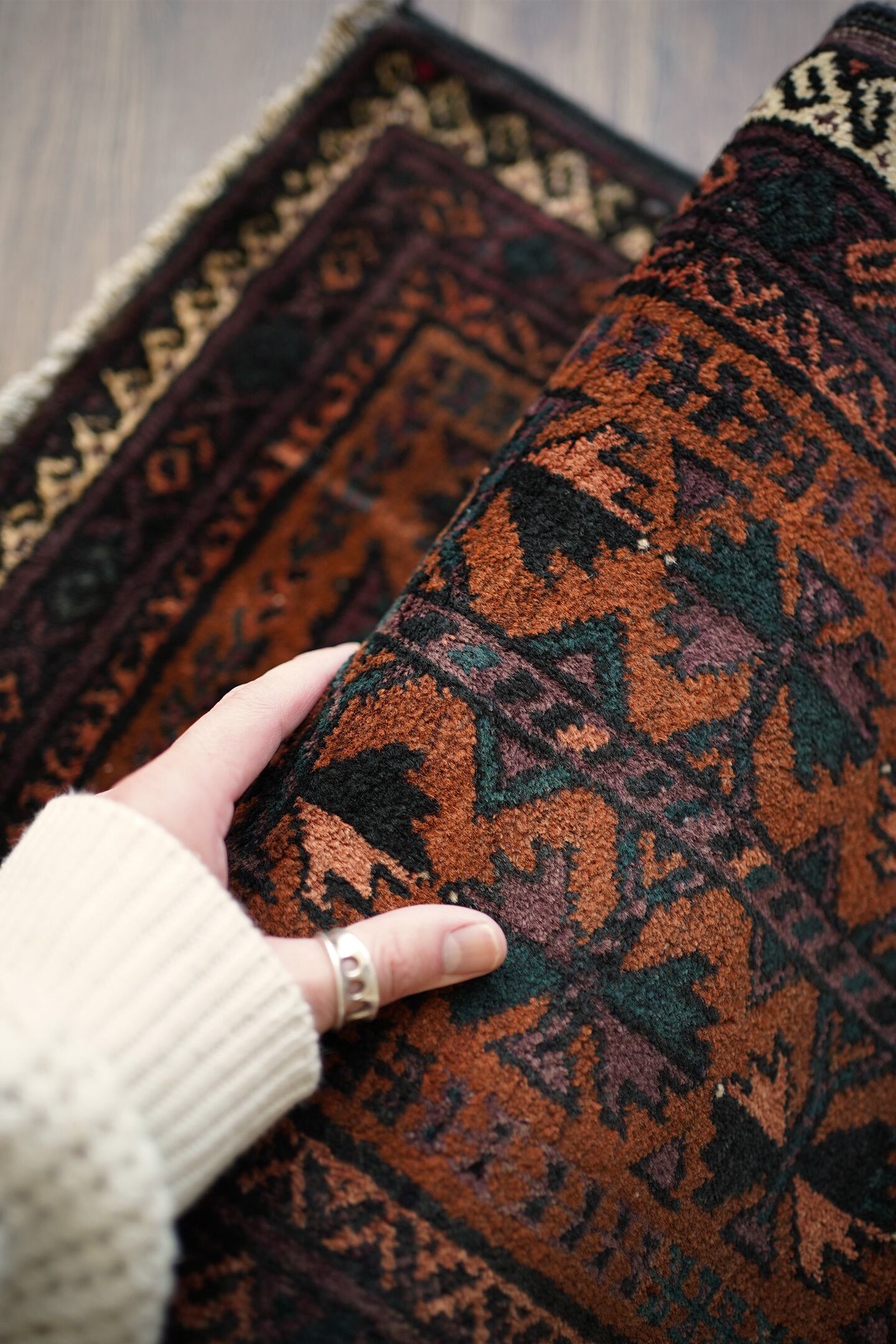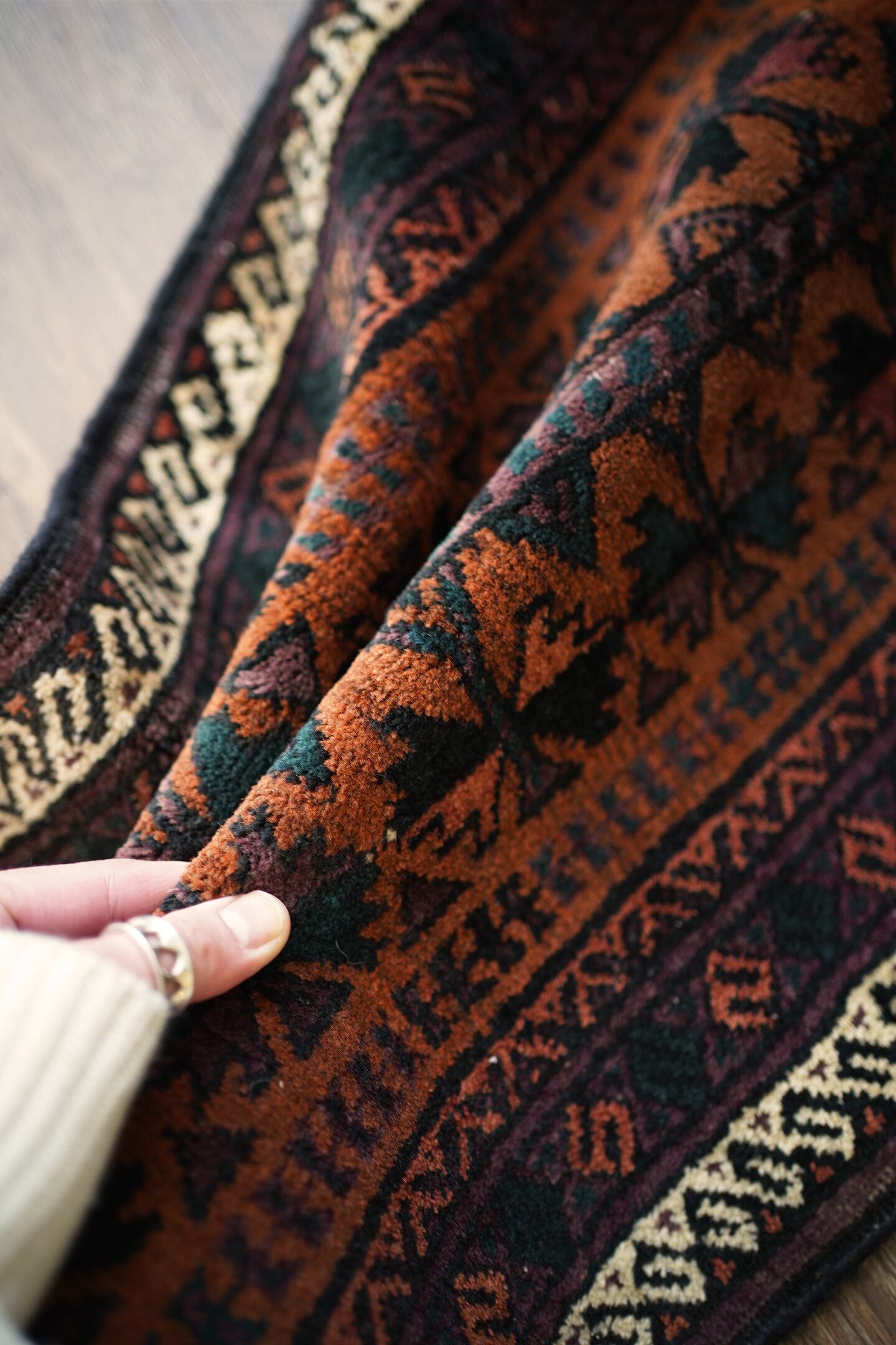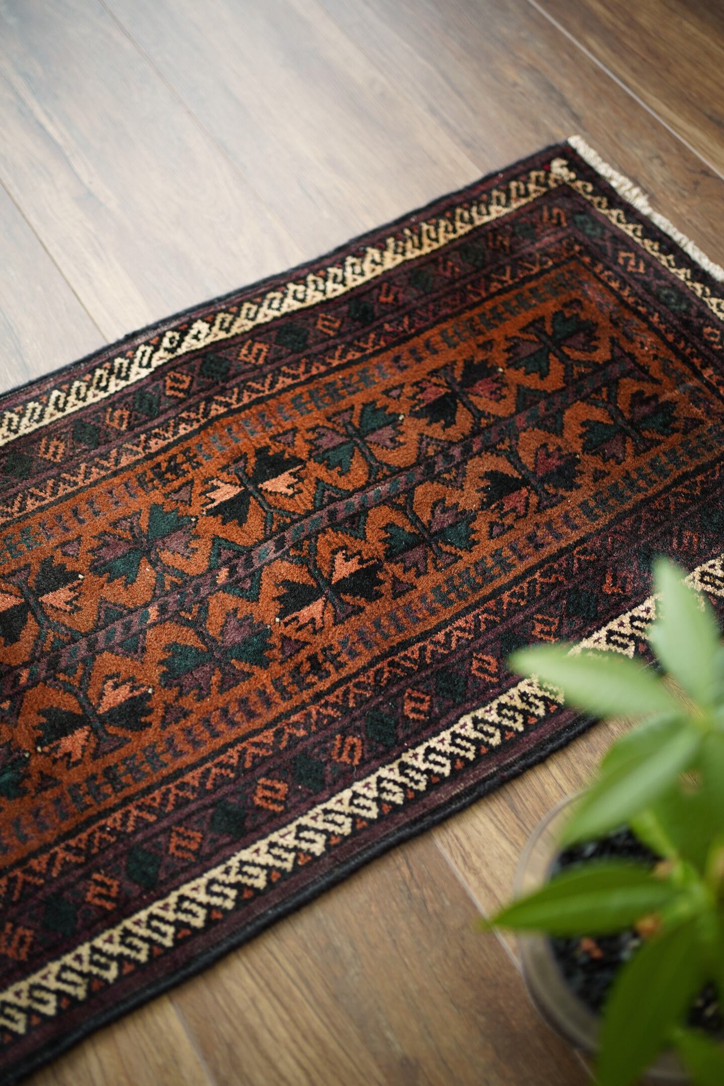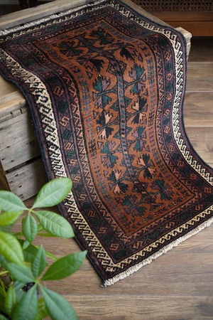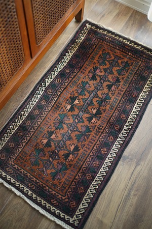 約90年前にイラン南東部のシスターン地方で織られたセミアンティークのバルーチラグ。"チナール"と呼ばれるポプラや楓のような形の葉っぱの紋様が織り込まれたデザインで、配色はブラウン・焦茶・オフホワイトをベースに、アクセントでダークグリーンが使われているところが素敵なポイントです。厚みは6mm〜7mmほどで、表面の毛並みはふわっと滑らかな肌触り。目立ったダメージなども見受けられず、状態も良好です。落ち着いた配色なのでスッとスペースに馴染んでくれるかと思います。