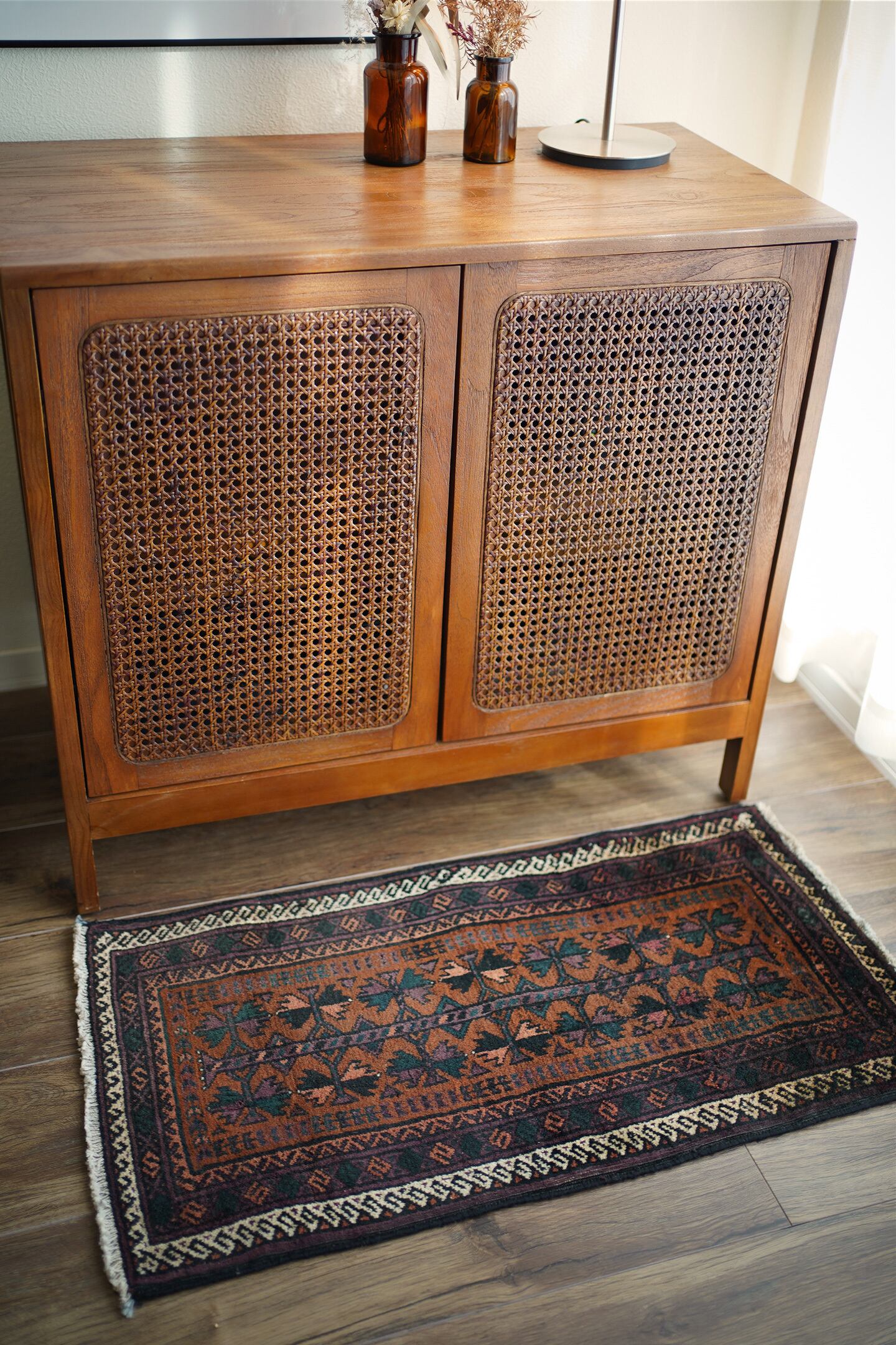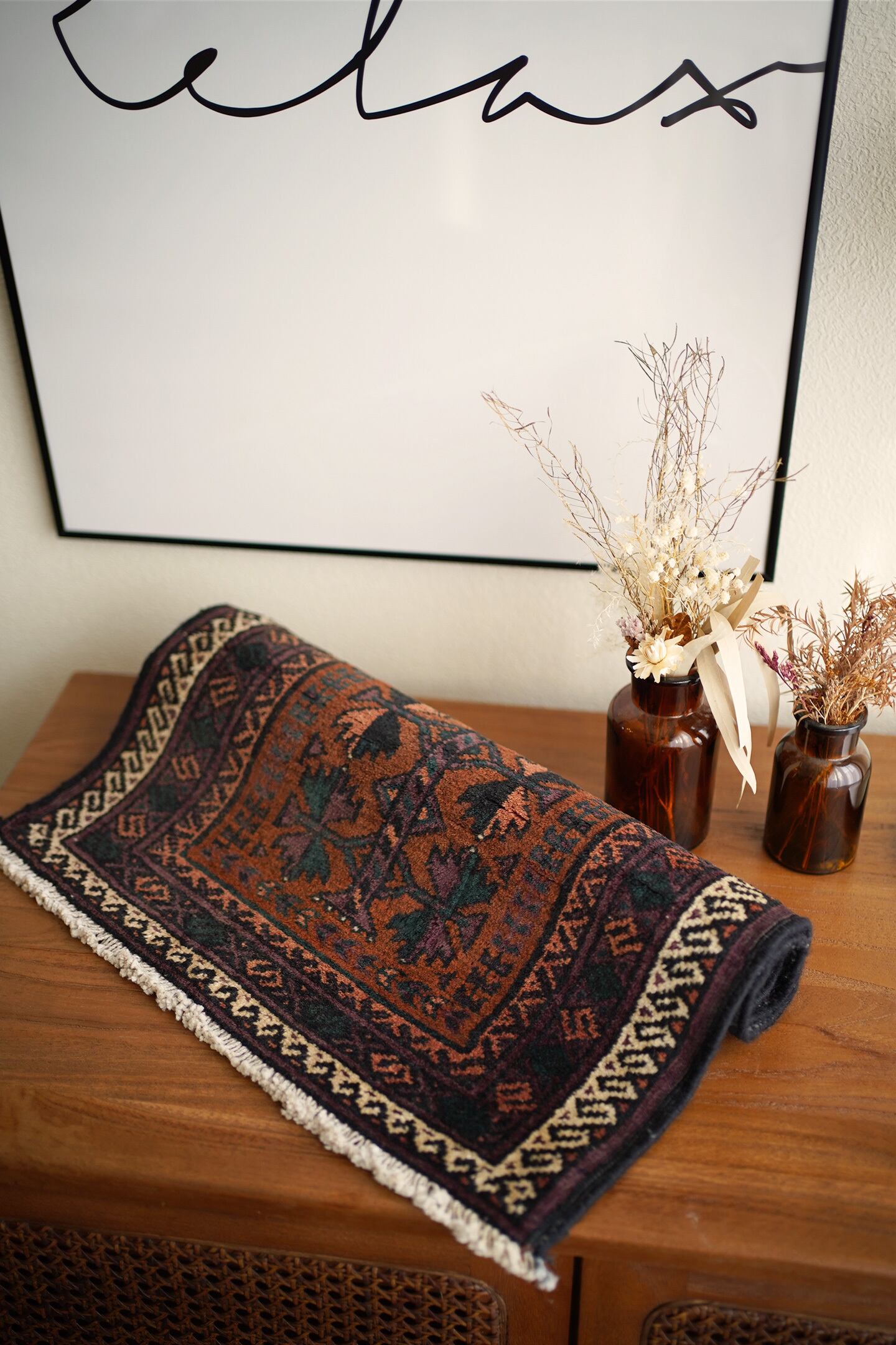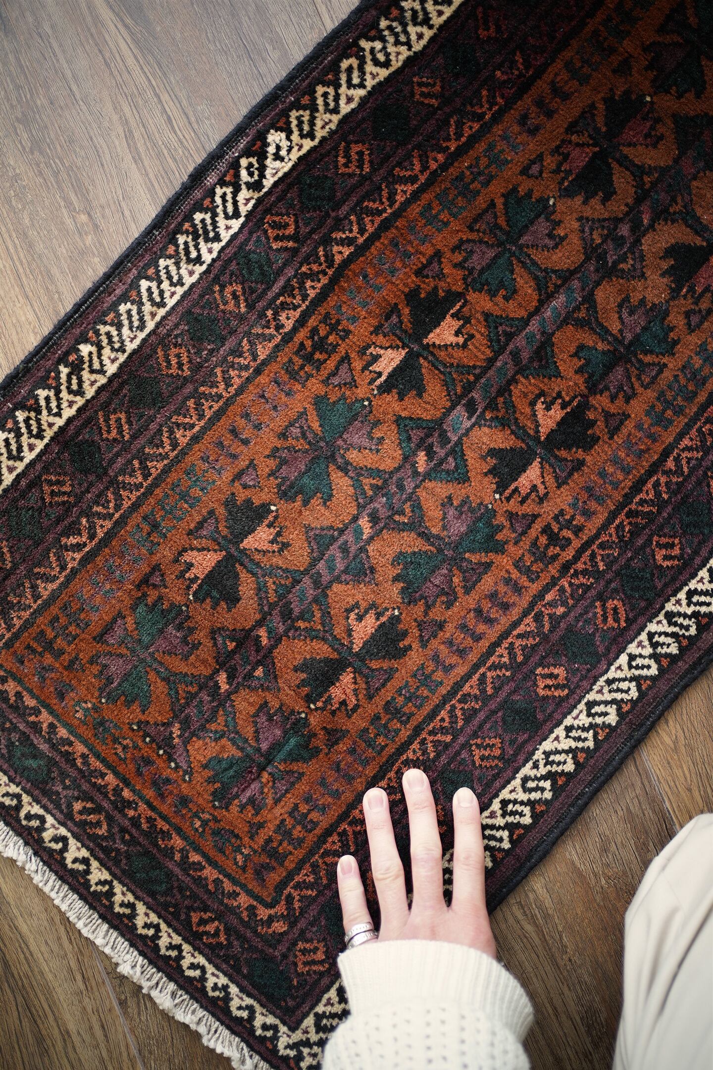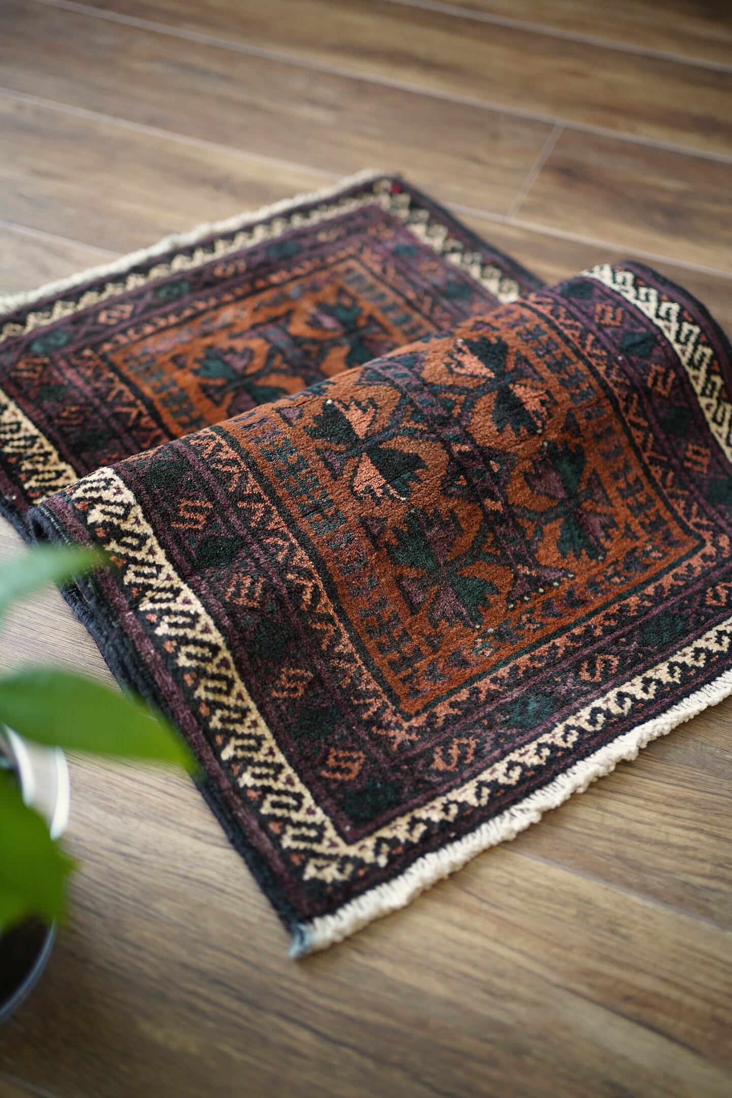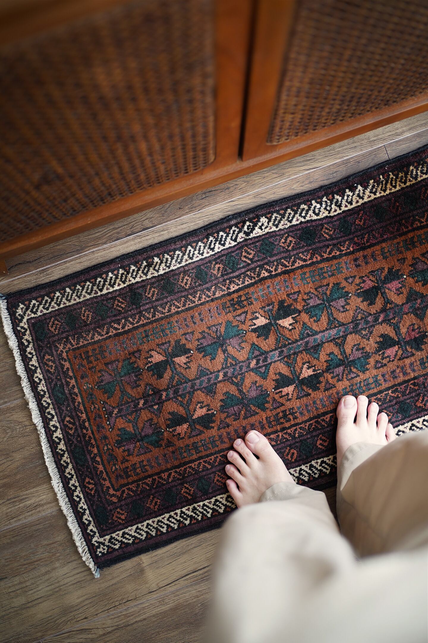 約90年前にイラン南東部のシスターン地方で織られたセミアンティークのバルーチラグ。"チナール"と呼ばれるポプラや楓のような形の葉っぱの紋様が織り込まれたデザインで、配色はブラウン・焦茶・オフホワイトをベースに、アクセントでダークグリーンが使われているところが素敵なポイントです。厚みは6mm〜7mmほどで、表面の毛並みはふわっと滑らかな肌触り。目立ったダメージなども見受けられず、状態も良好です。落ち着いた配色なのでスッとスペースに馴染んでくれるかと思います。