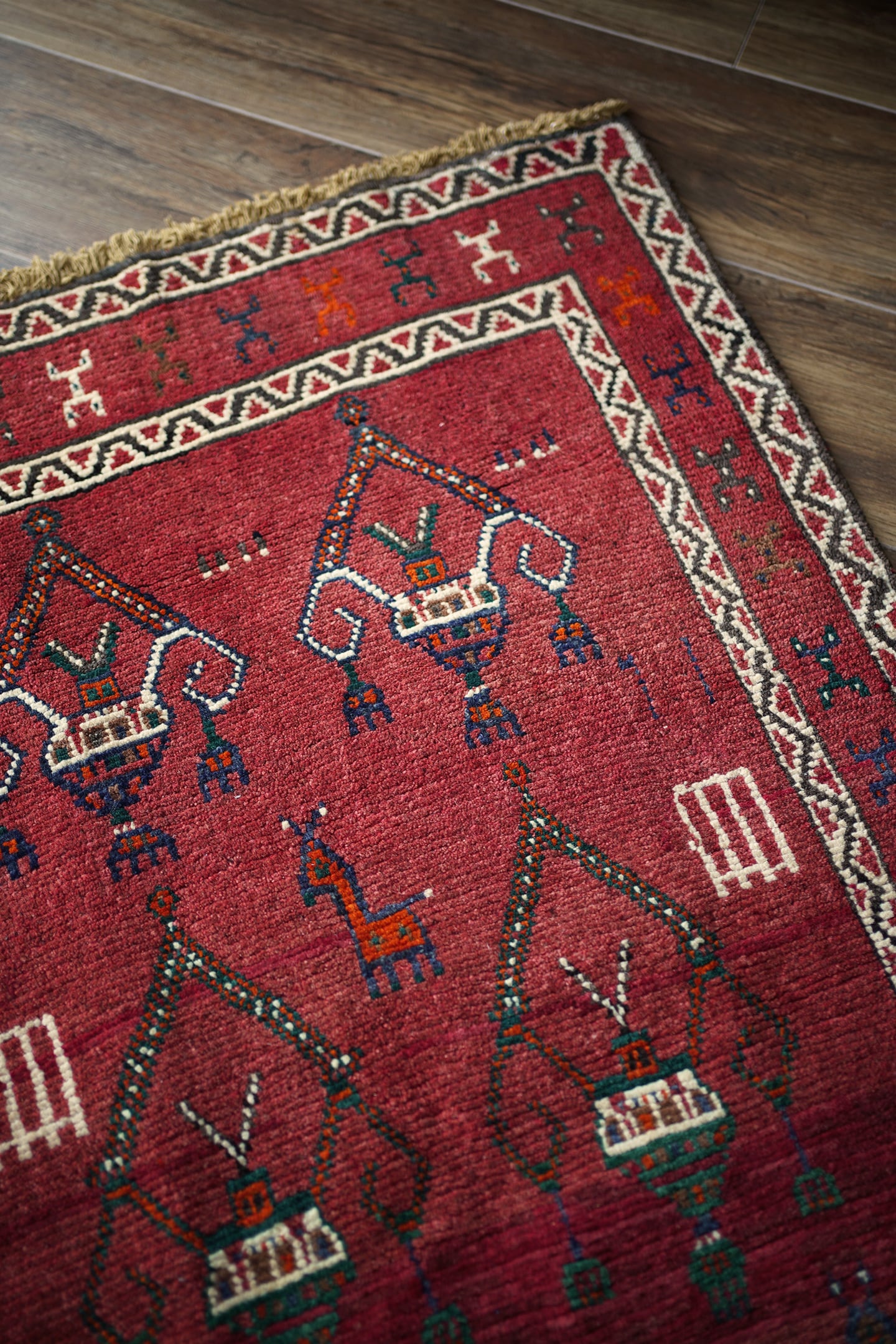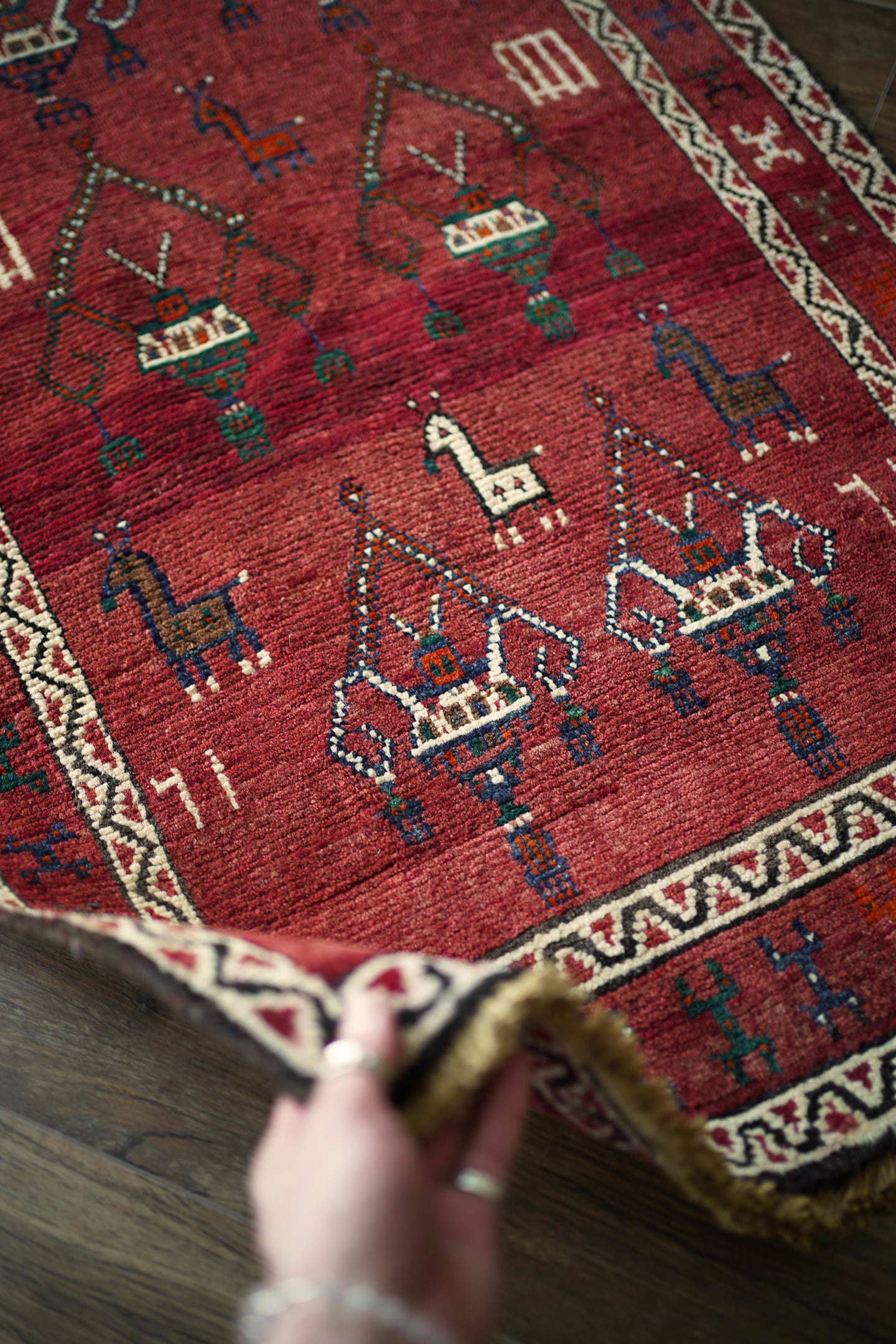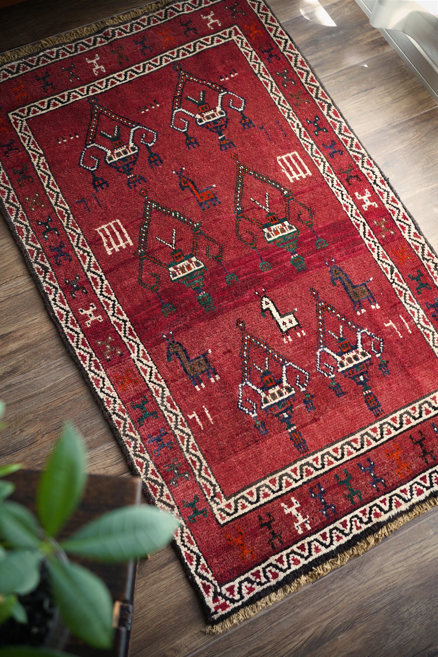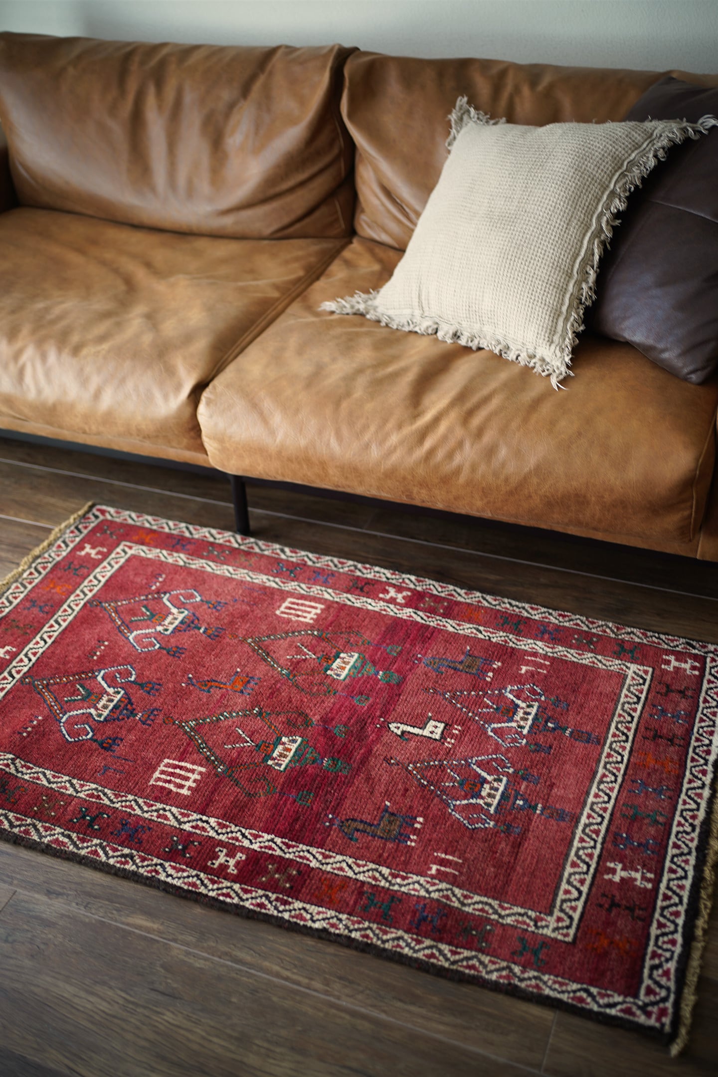 経年約60年のカシュガイラグ。鹿とシャンデリアのような紋様が織り込まれたデザインで、3匹の鹿は白い靴下を履いているような珍しいタイプでとっても可愛らしいです。落ち着いた赤がベースの配色なので、お部屋で目立ちすぎることなく馴染んでくれるかと思います。厚みは6mm程度で、表面はふわっと優しい肌触りをしています。手織り特有のゆがみが少々ございます(揺らぎのある愛らしさ・温かみが素敵です)。目立った補修跡やダメージもなく大変良好なコンディションです。なかなか出会えないタイプのカシュガイラグですので気になった方はどうぞお見逃しなく♫