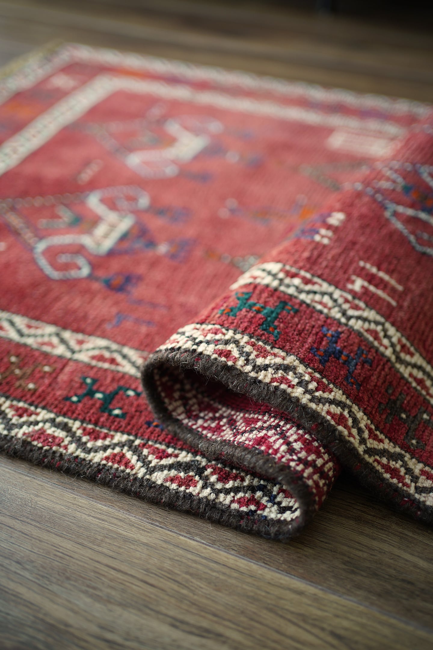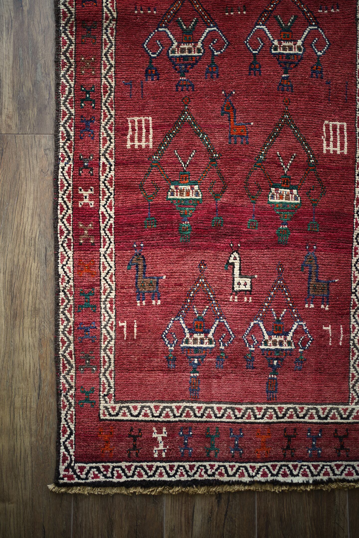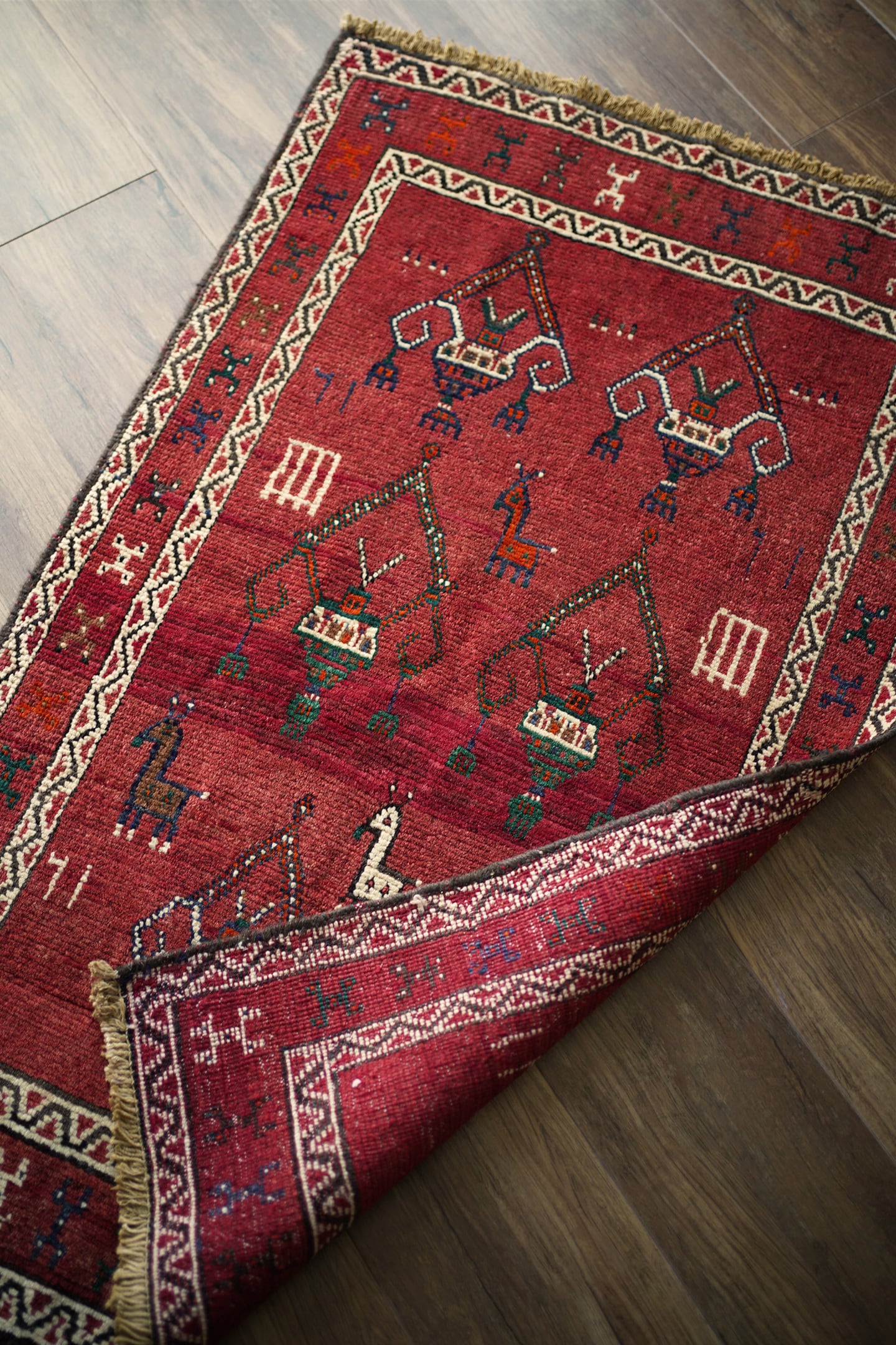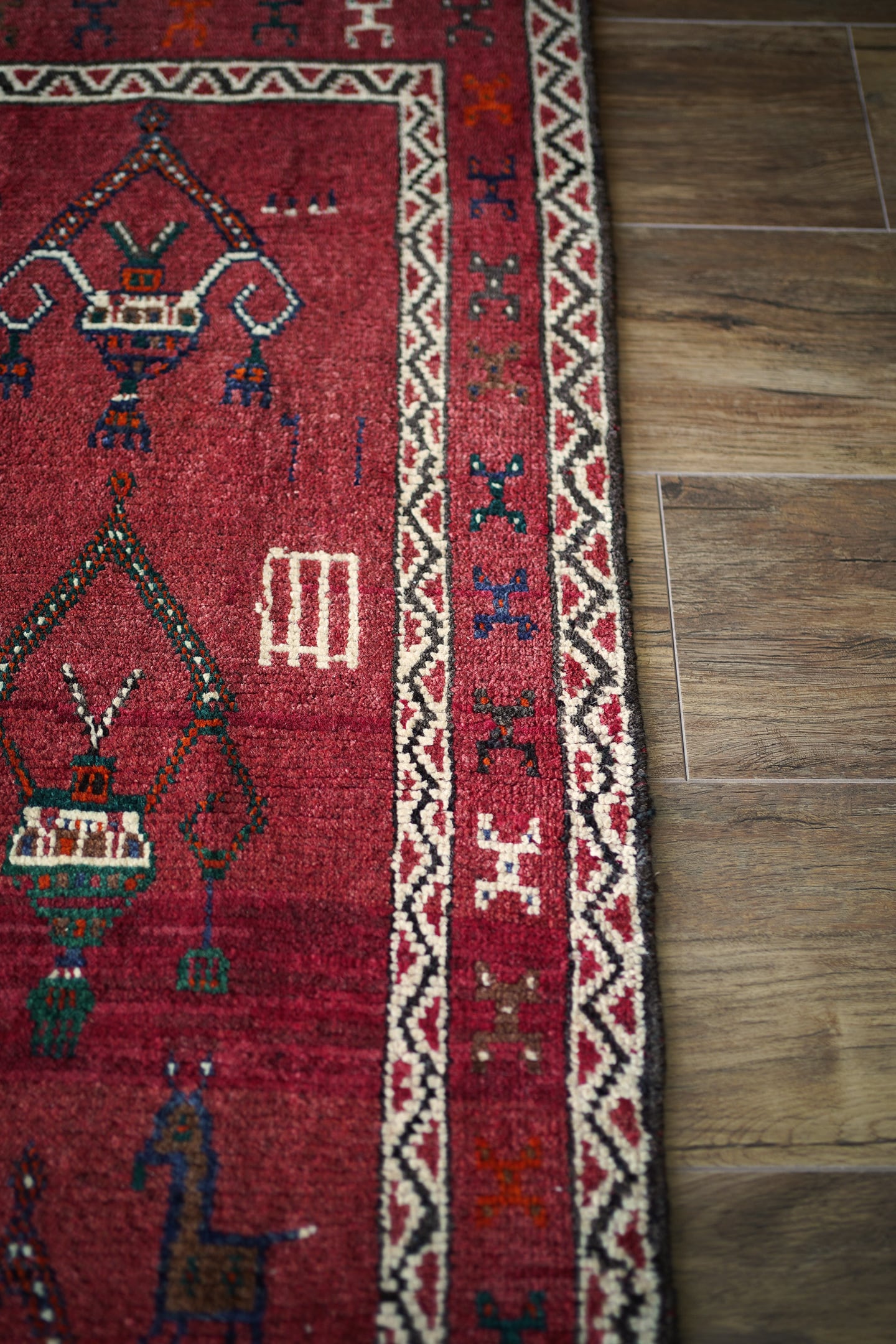 経年約60年のカシュガイラグ。鹿とシャンデリアのような紋様が織り込まれたデザインで、3匹の鹿は白い靴下を履いているような珍しいタイプでとっても可愛らしいです。落ち着いた赤がベースの配色なので、お部屋で目立ちすぎることなく馴染んでくれるかと思います。厚みは6mm程度で、表面はふわっと優しい肌触りをしています。手織り特有のゆがみが少々ございます(揺らぎのある愛らしさ・温かみが素敵です)。目立った補修跡やダメージもなく大変良好なコンディションです。なかなか出会えないタイプのカシュガイラグですので気になった方はどうぞお見逃しなく♫