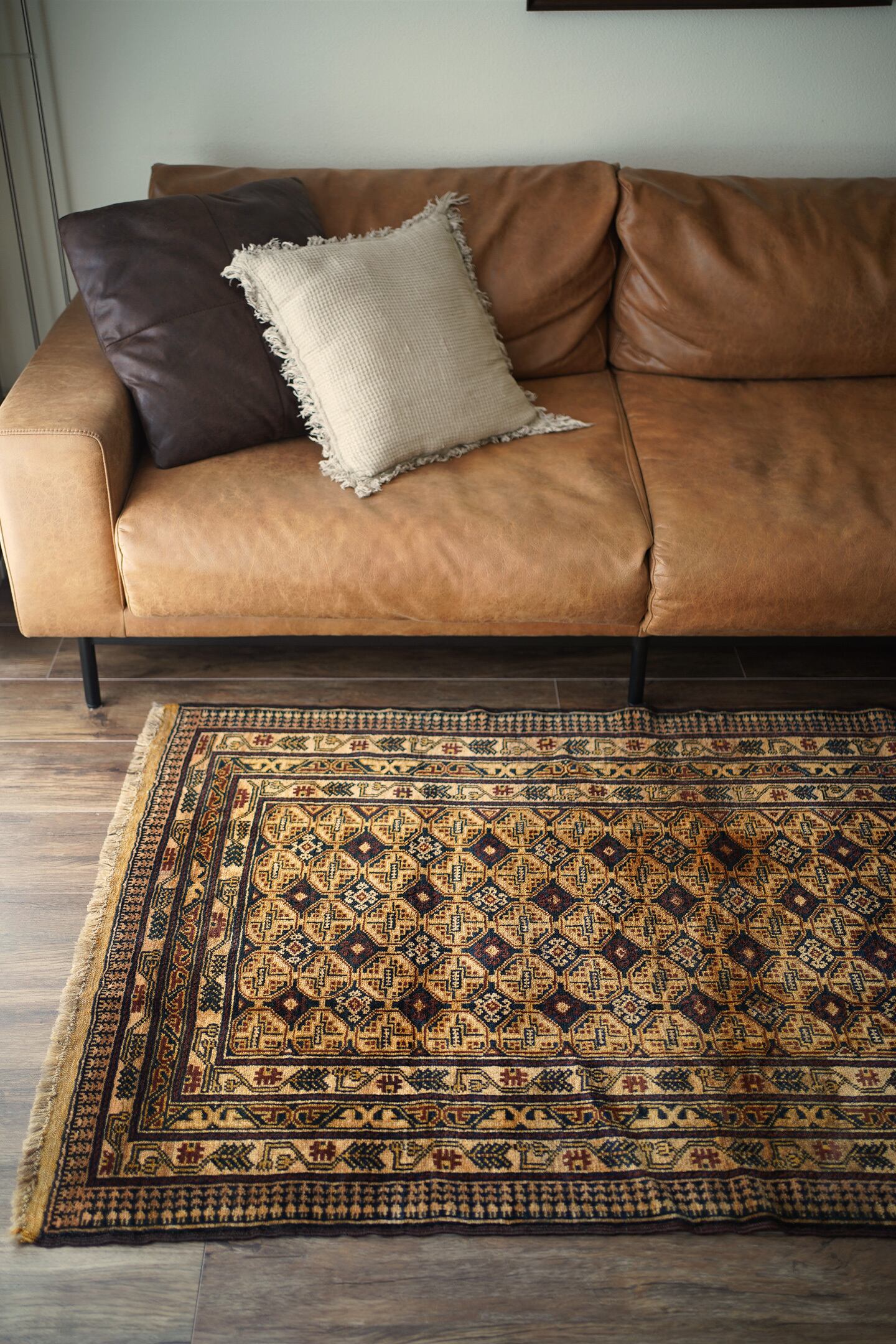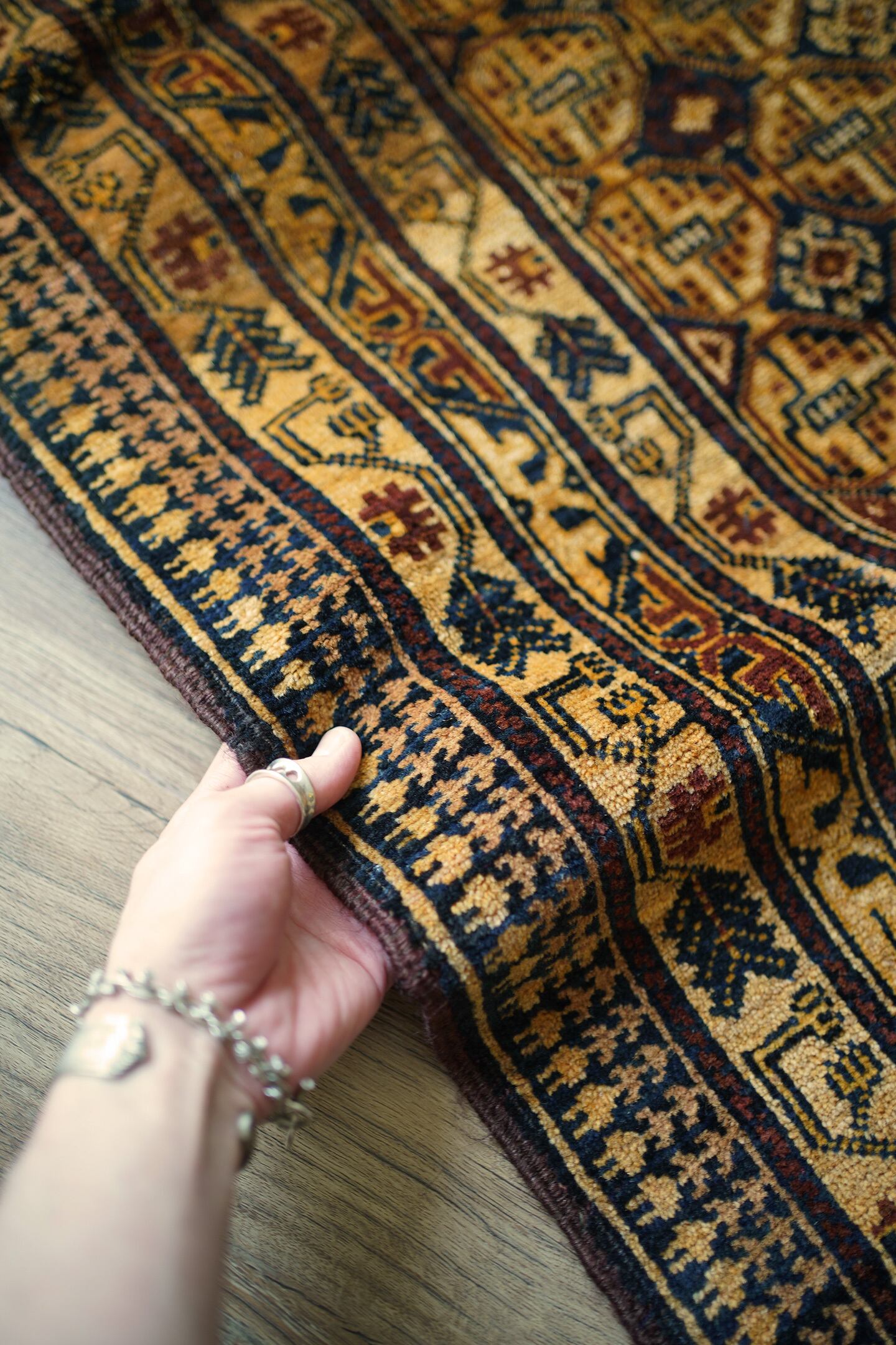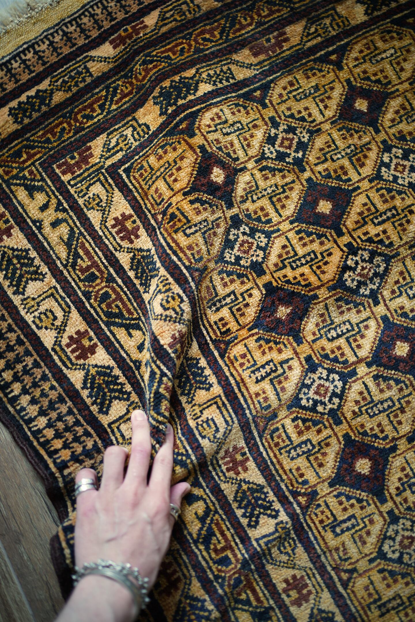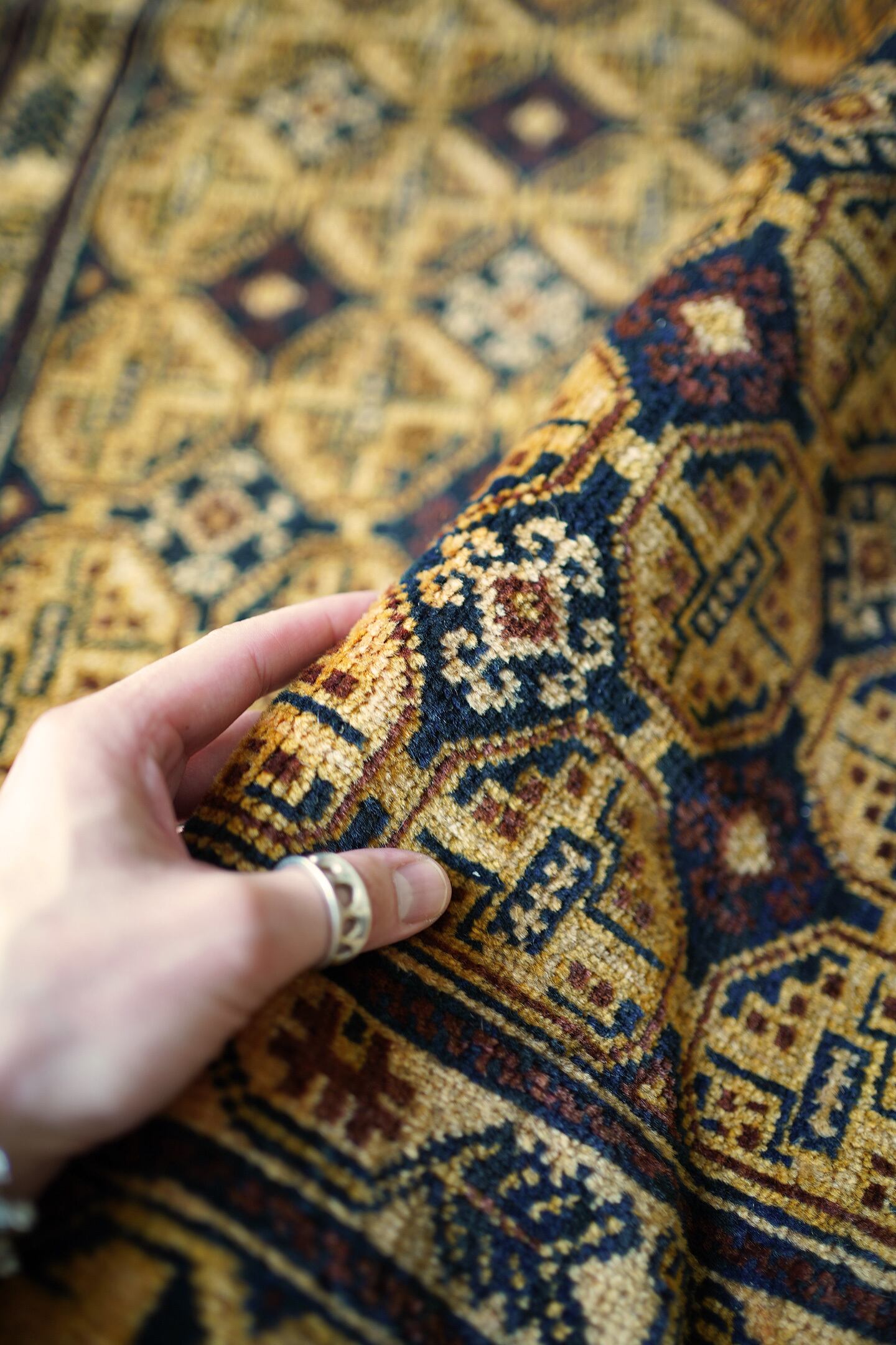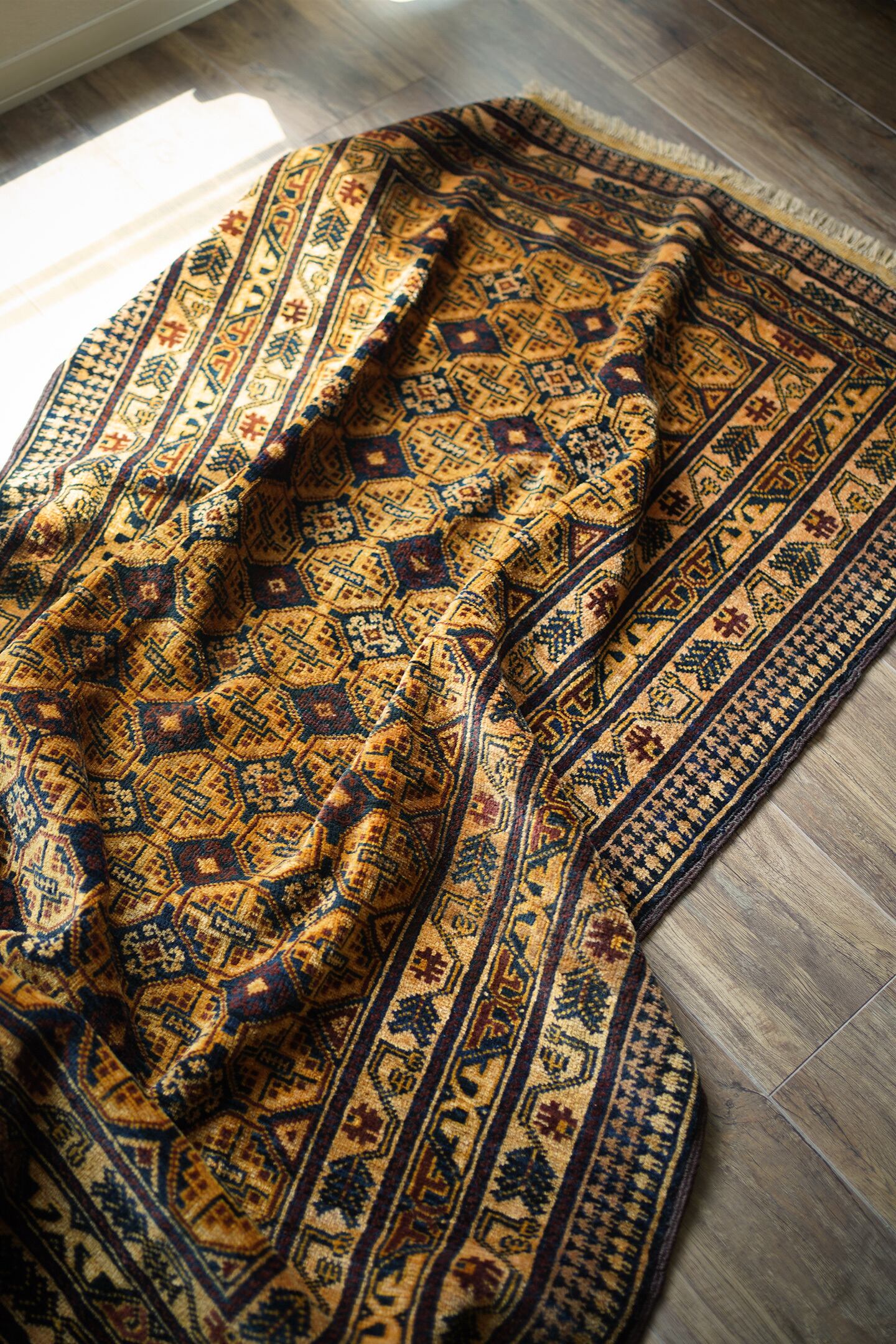 約40年〜50年ほど前にトルクメン族によって織られたアリホジャラグ。美しい配列の紋様デザインと素晴らしい色味に一目惚れして仕入れを決めた一枚です。ゴールドのような薄い黄色の色味に見えたり、深みのあるオレンジのような色味に見えたりと、色んな表情を見せてくれるところが魅力的です。ソフトウールで、ふわっと柔らかい気持ちの良い肌触りで、厚みは5mmほど。ダメージや補修した跡も見受けられず状態も大変良好です。お気に入りのスペースにどうぞ♫