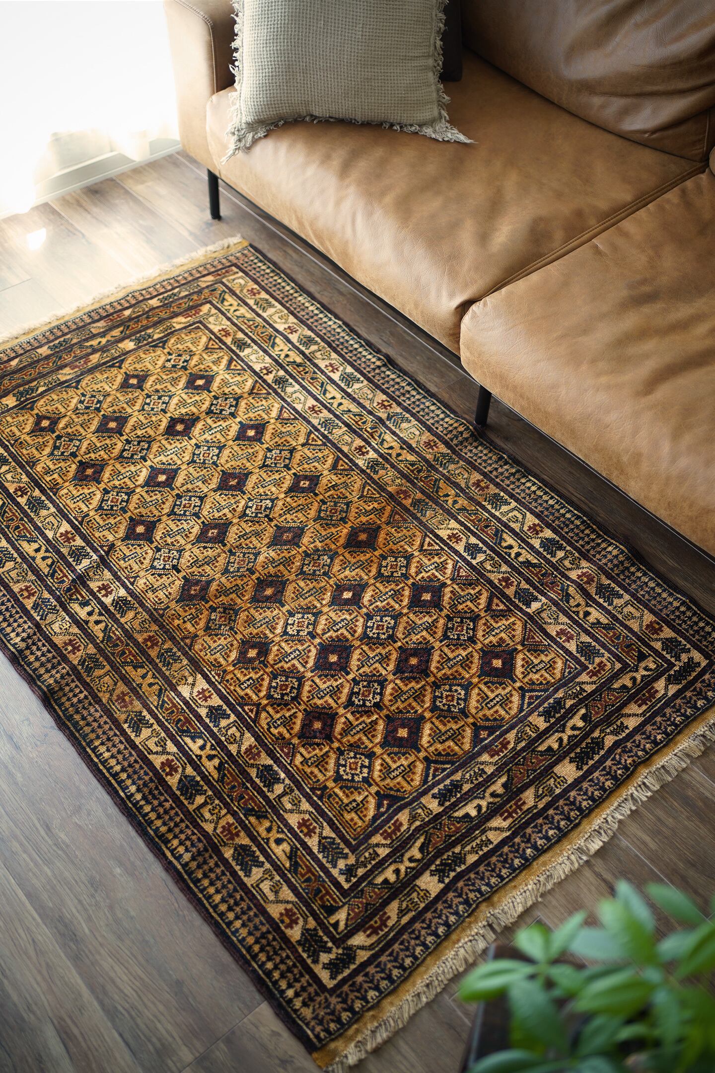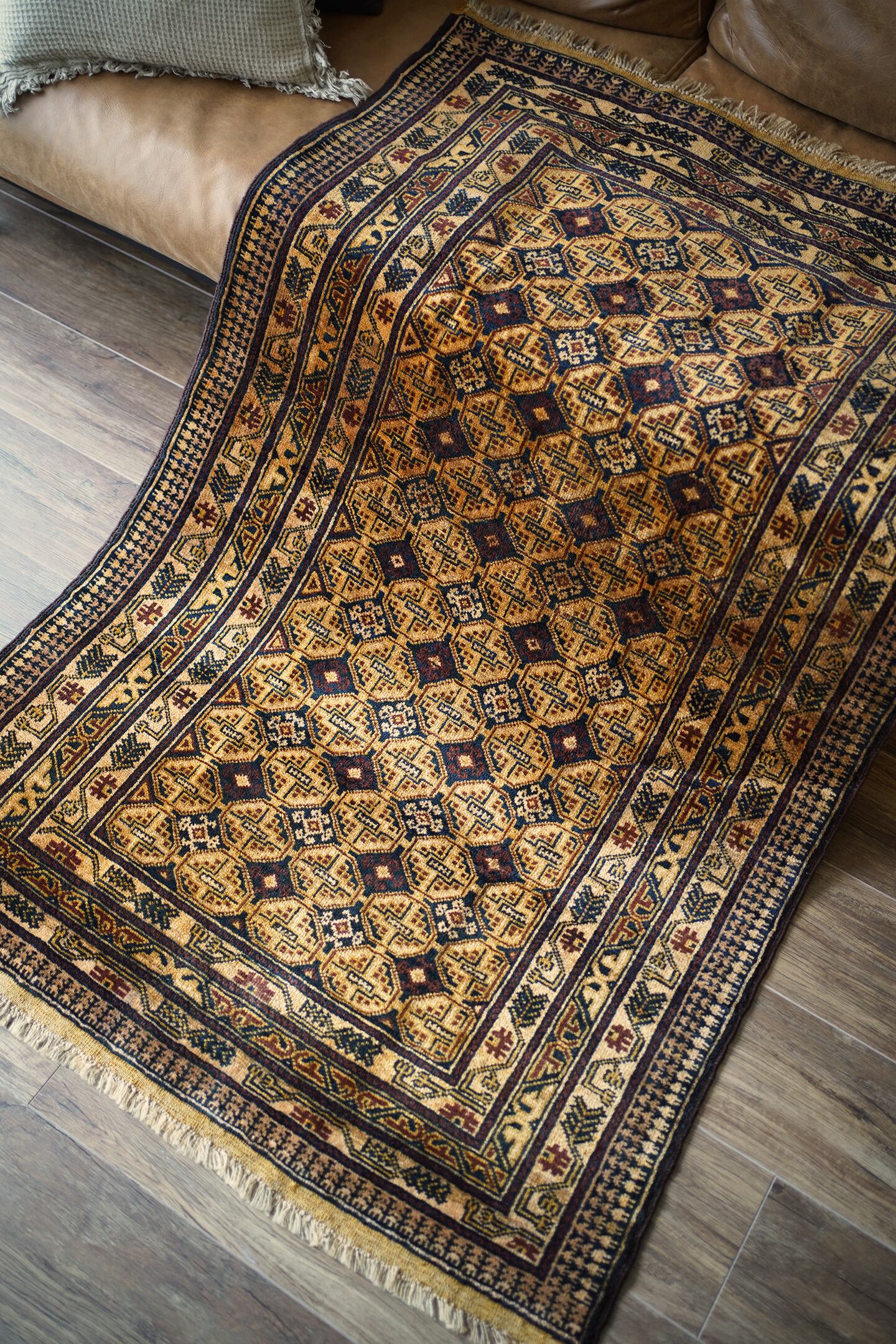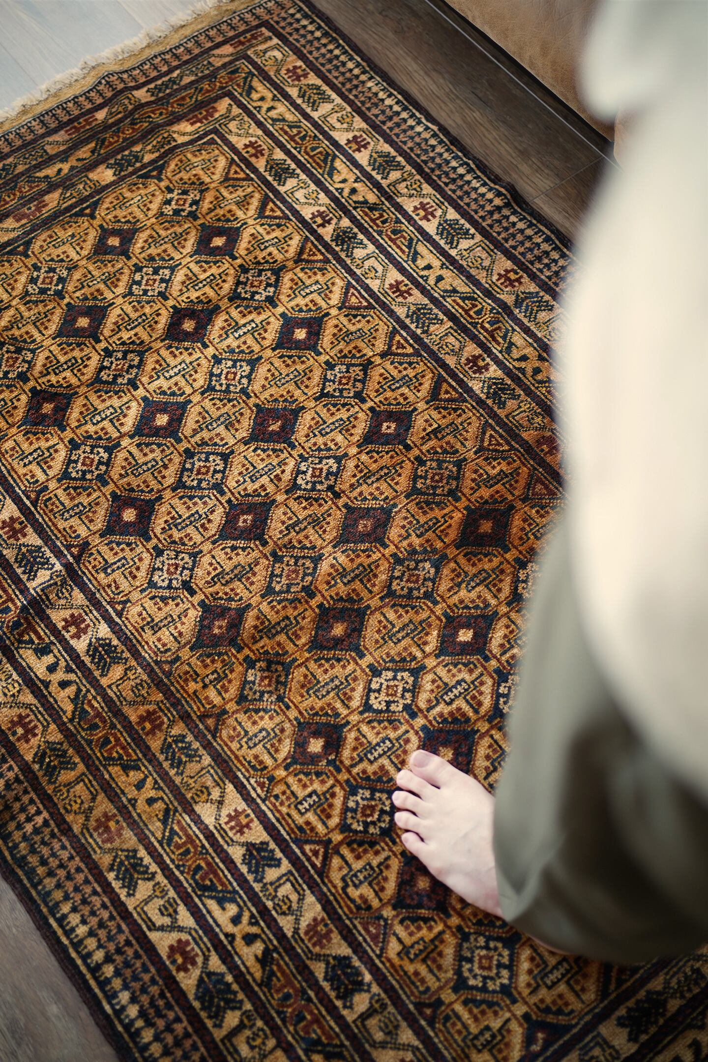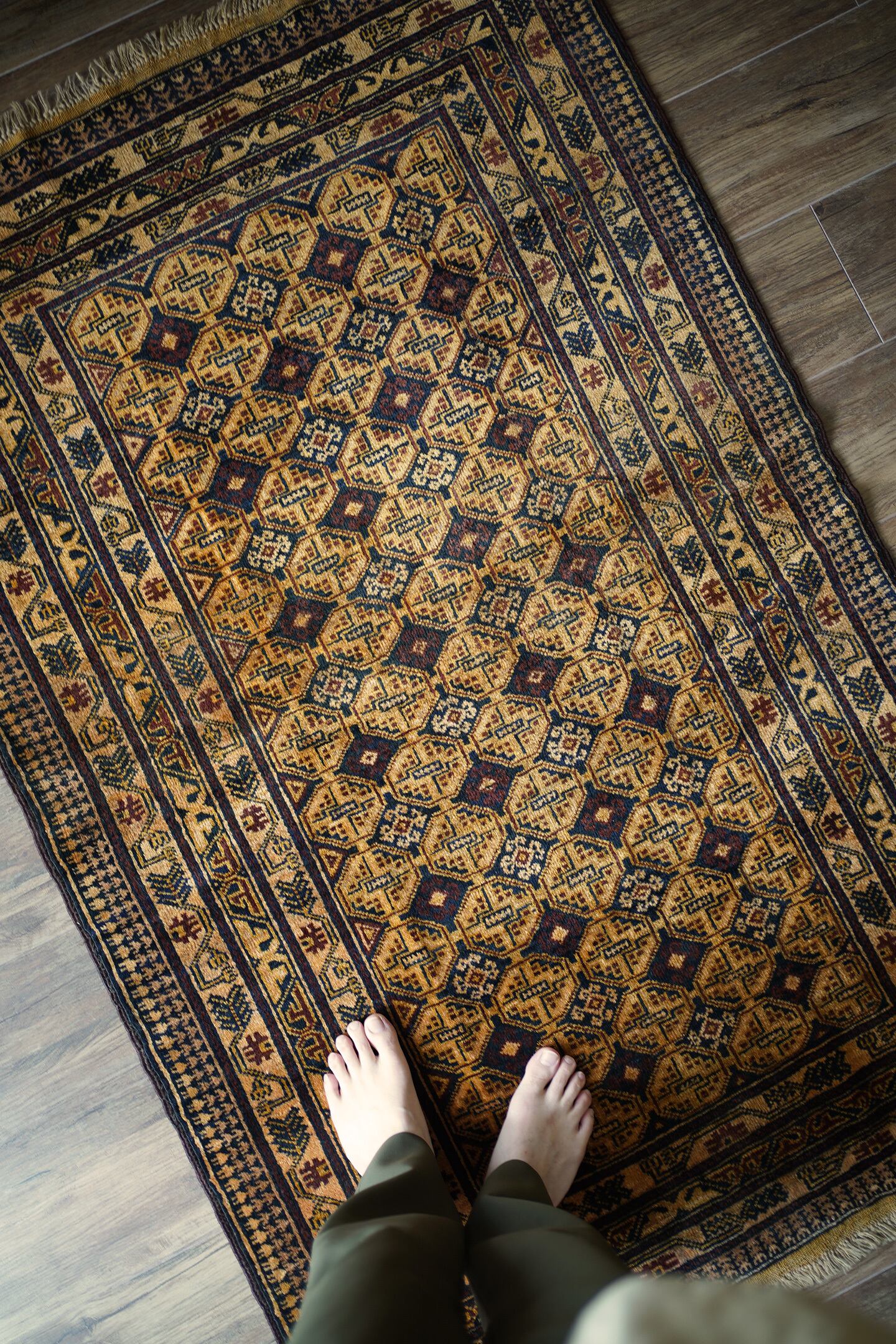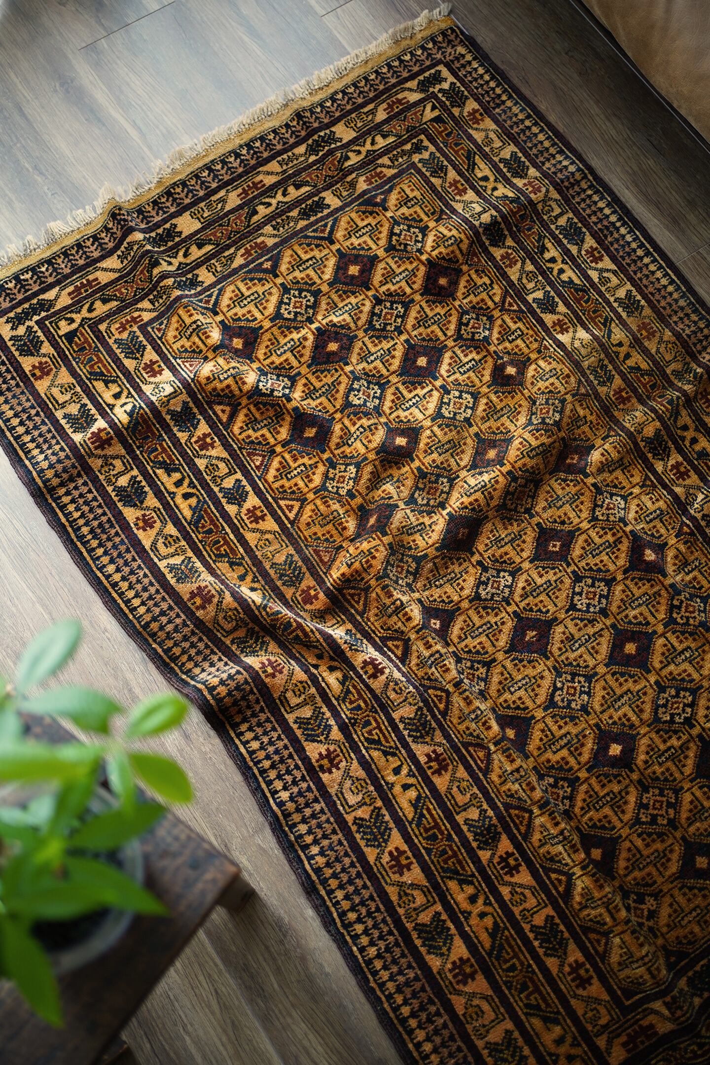 約40年〜50年ほど前にトルクメン族によって織られたアリホジャラグ。美しい配列の紋様デザインと素晴らしい色味に一目惚れして仕入れを決めた一枚です。ゴールドのような薄い黄色の色味に見えたり、深みのあるオレンジのような色味に見えたりと、色んな表情を見せてくれるところが魅力的です。ソフトウールで、ふわっと柔らかい気持ちの良い肌触りで、厚みは5mmほど。ダメージや補修した跡も見受けられず状態も大変良好です。お気に入りのスペースにどうぞ♫