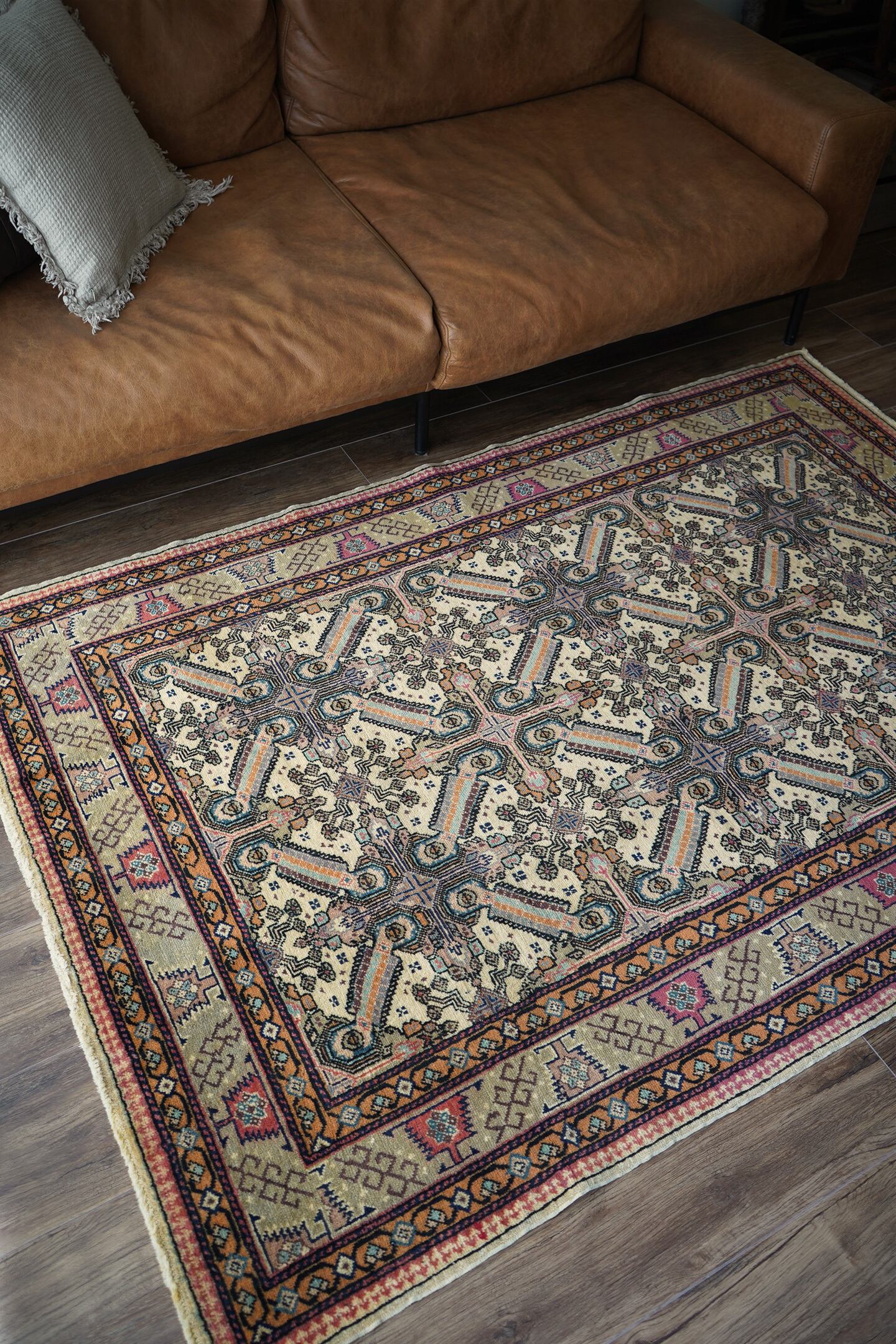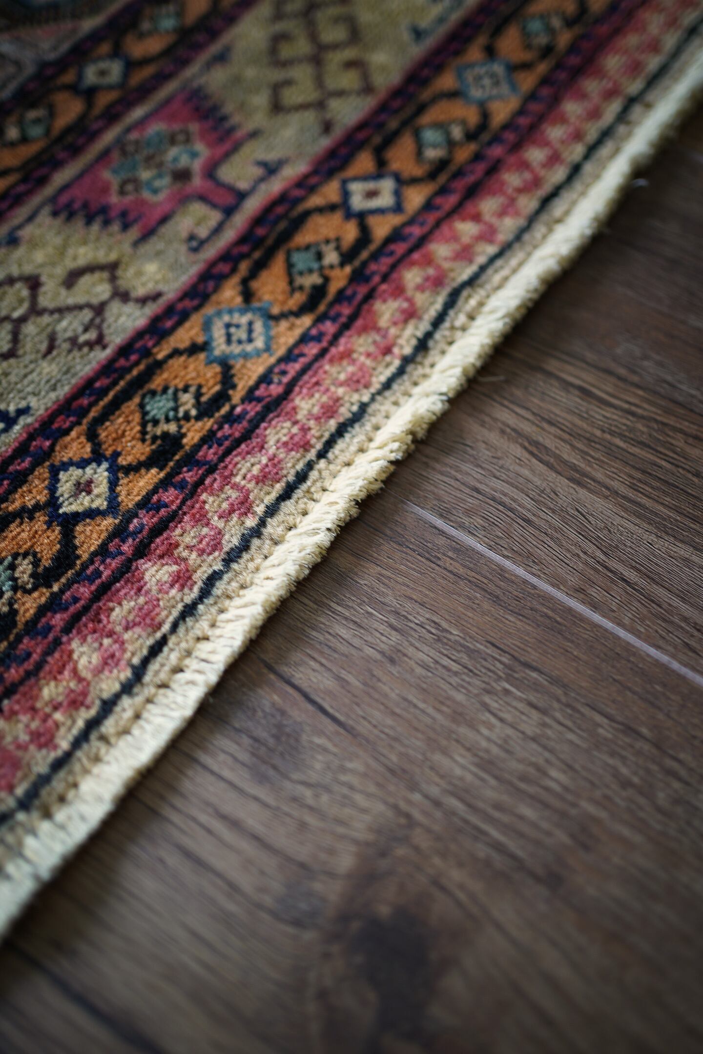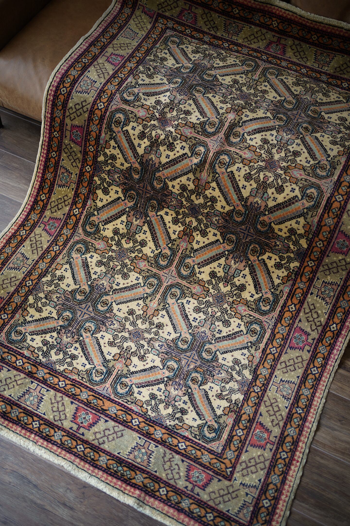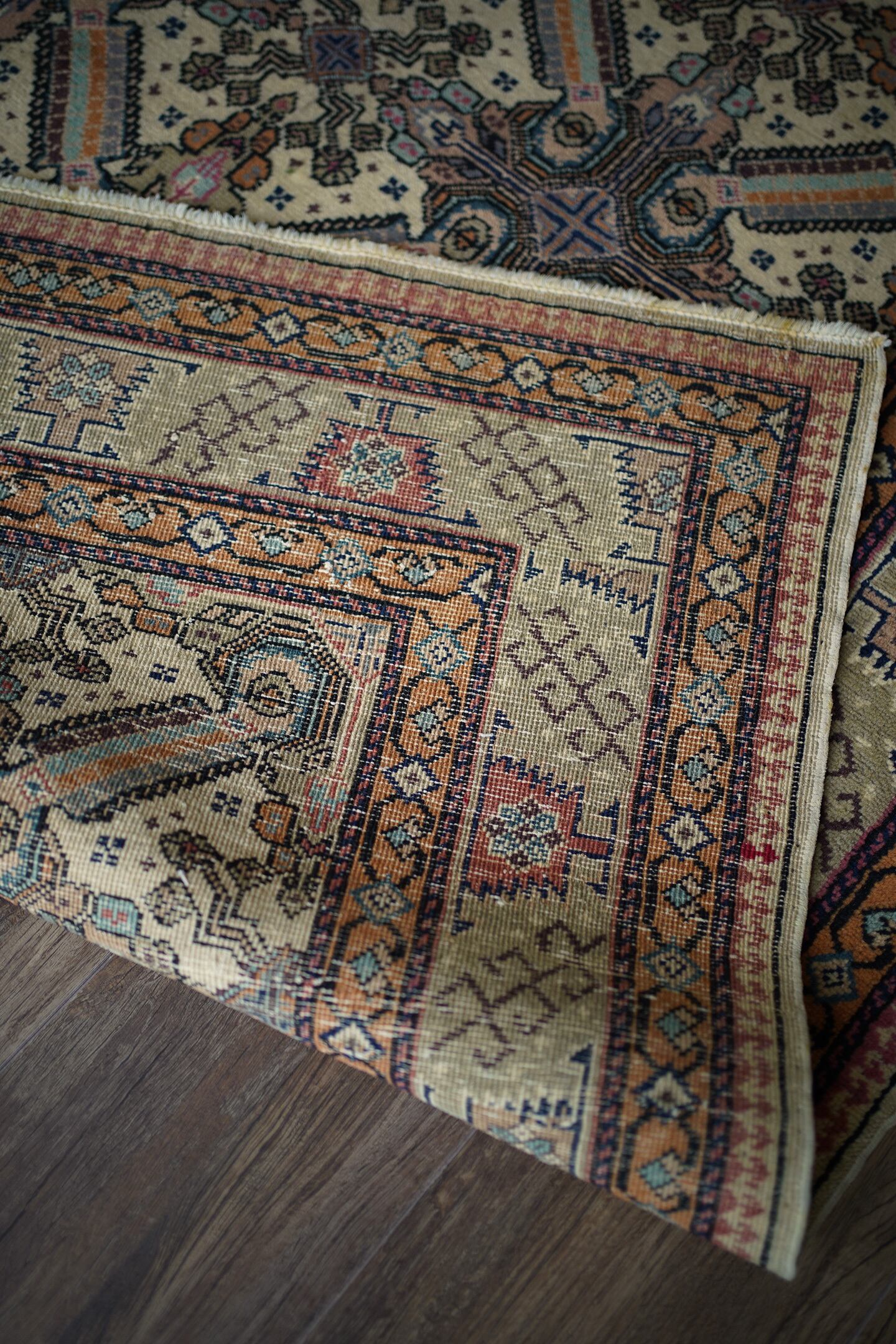 トルコの都市カイセリからほど近い村で織られた経年50年程のヴィンテージラグ。ベージュと薄いオリーブ色をベースにした落ち着いたカラーリングで、暗いエメラルドグリーン、薄いターコイズブルー、黄土色などがアクセントカラーで使われています。毛足は短めで、表面はサラッと滑らかな肌触り。厚みは5mm程度。ダメージや補修跡もなく、パーフェクトなコンディション。テーブルやデスクの下などにも良さそうです♫