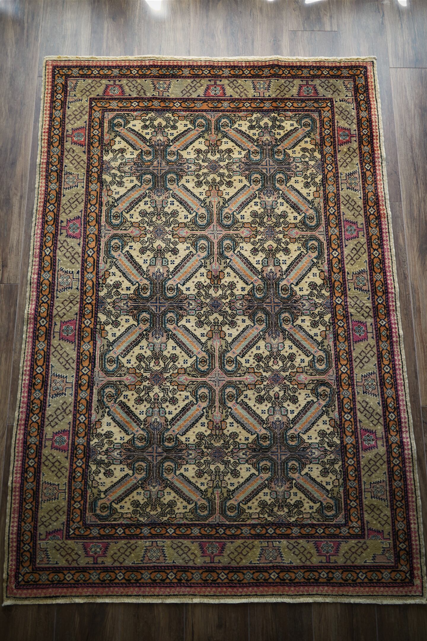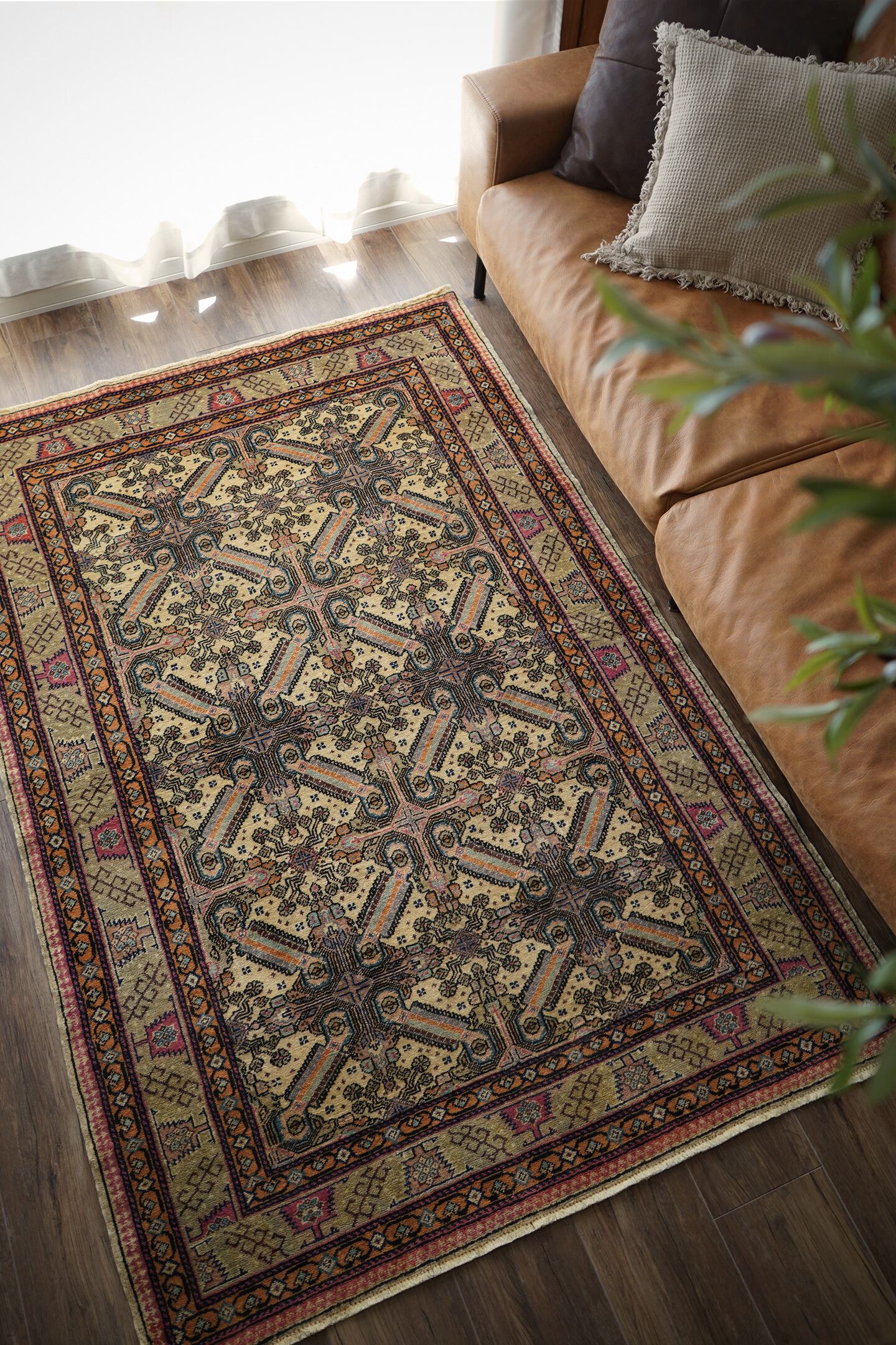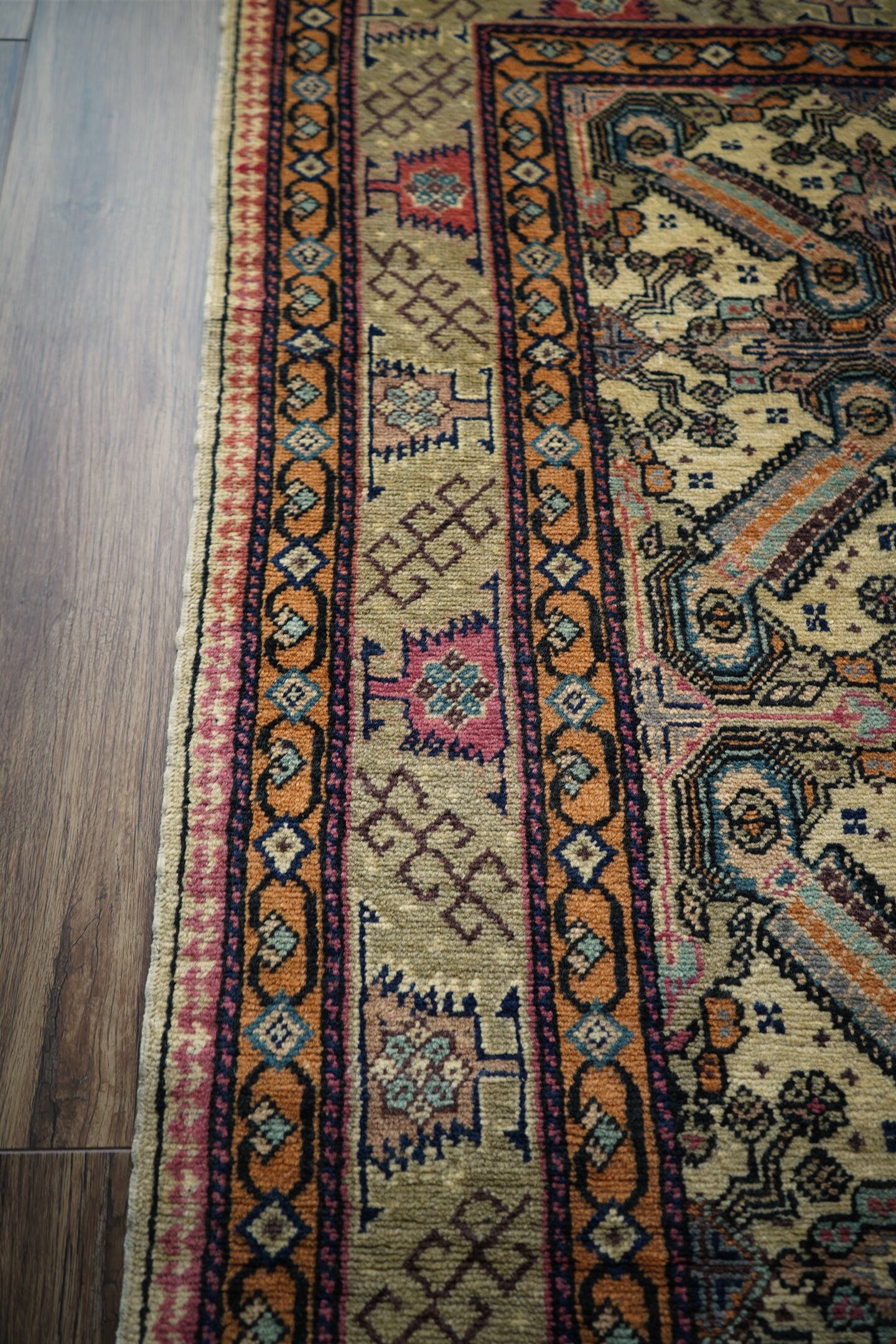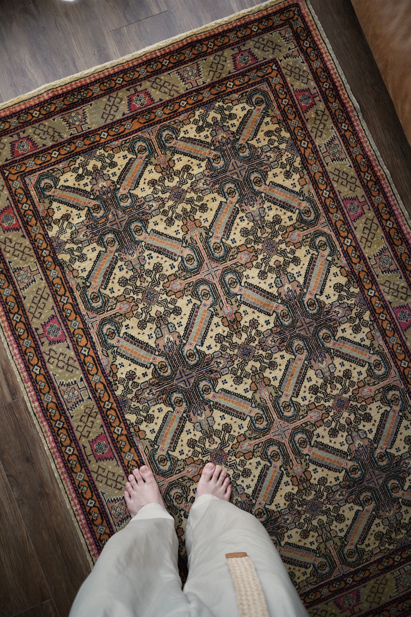 トルコの都市カイセリからほど近い村で織られた経年50年程のヴィンテージラグ。ベージュと薄いオリーブ色をベースにした落ち着いたカラーリングで、暗いエメラルドグリーン、薄いターコイズブルー、黄土色などがアクセントカラーで使われています。毛足は短めで、表面はサラッと滑らかな肌触り。厚みは5mm程度。ダメージや補修跡もなく、パーフェクトなコンディション。テーブルやデスクの下などにも良さそうです♫